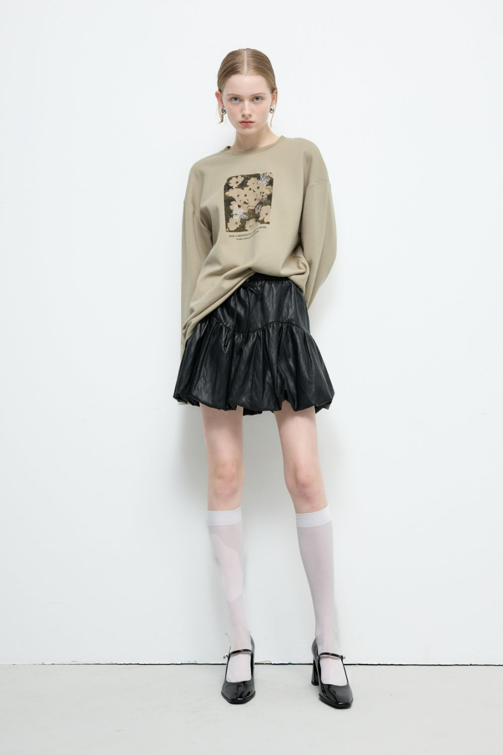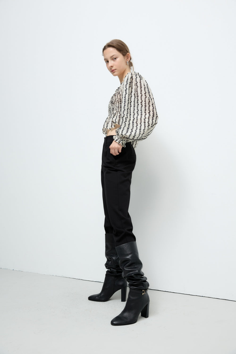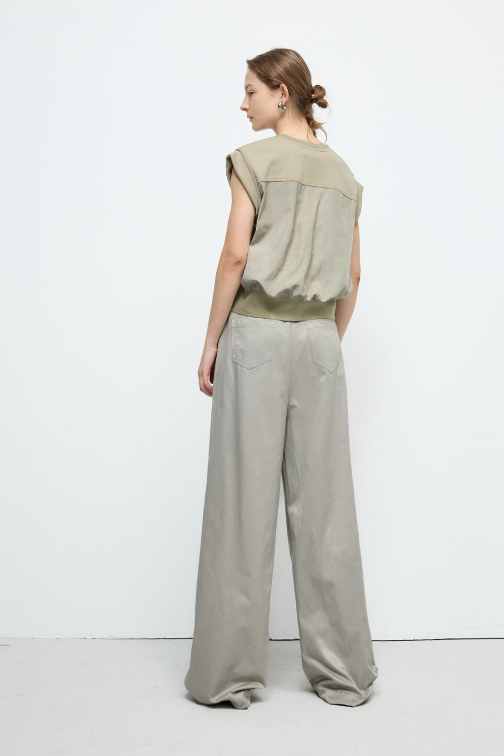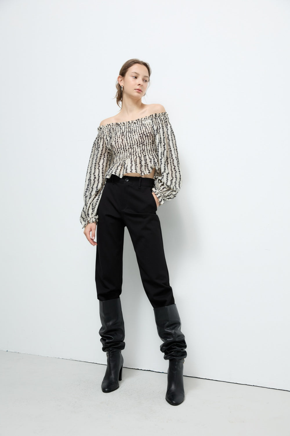 不規則下襬彈性圓領上衣-杏