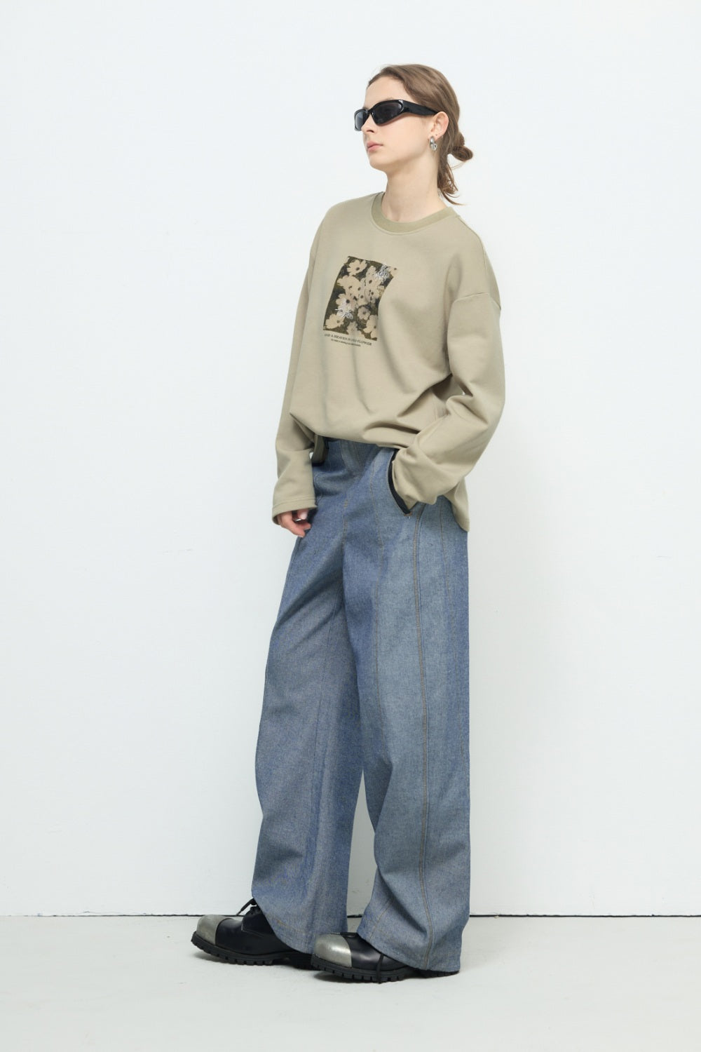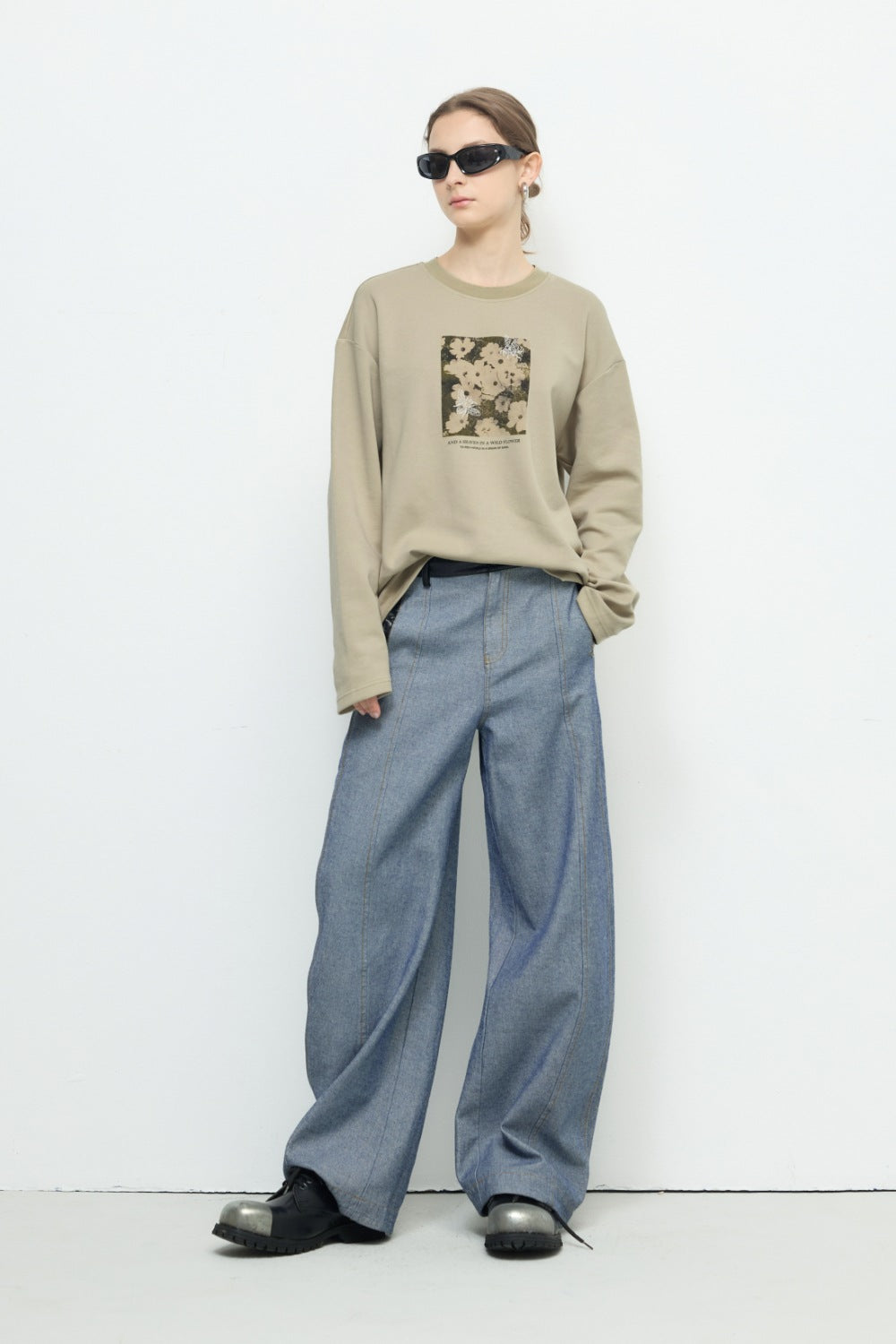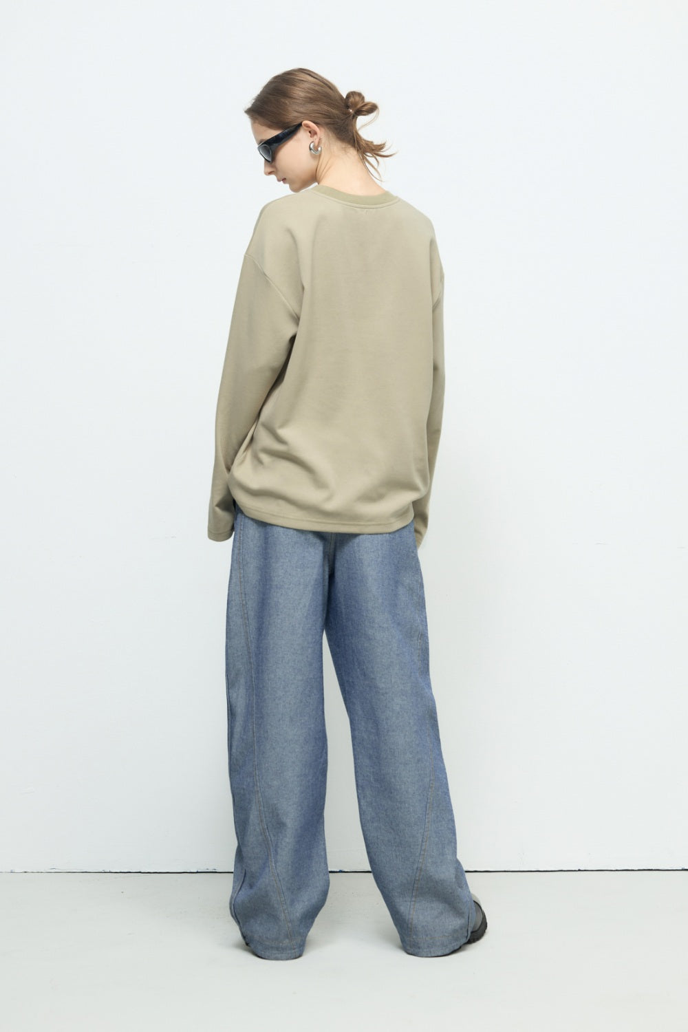 不規則下襬彈性圓領上衣-藍色