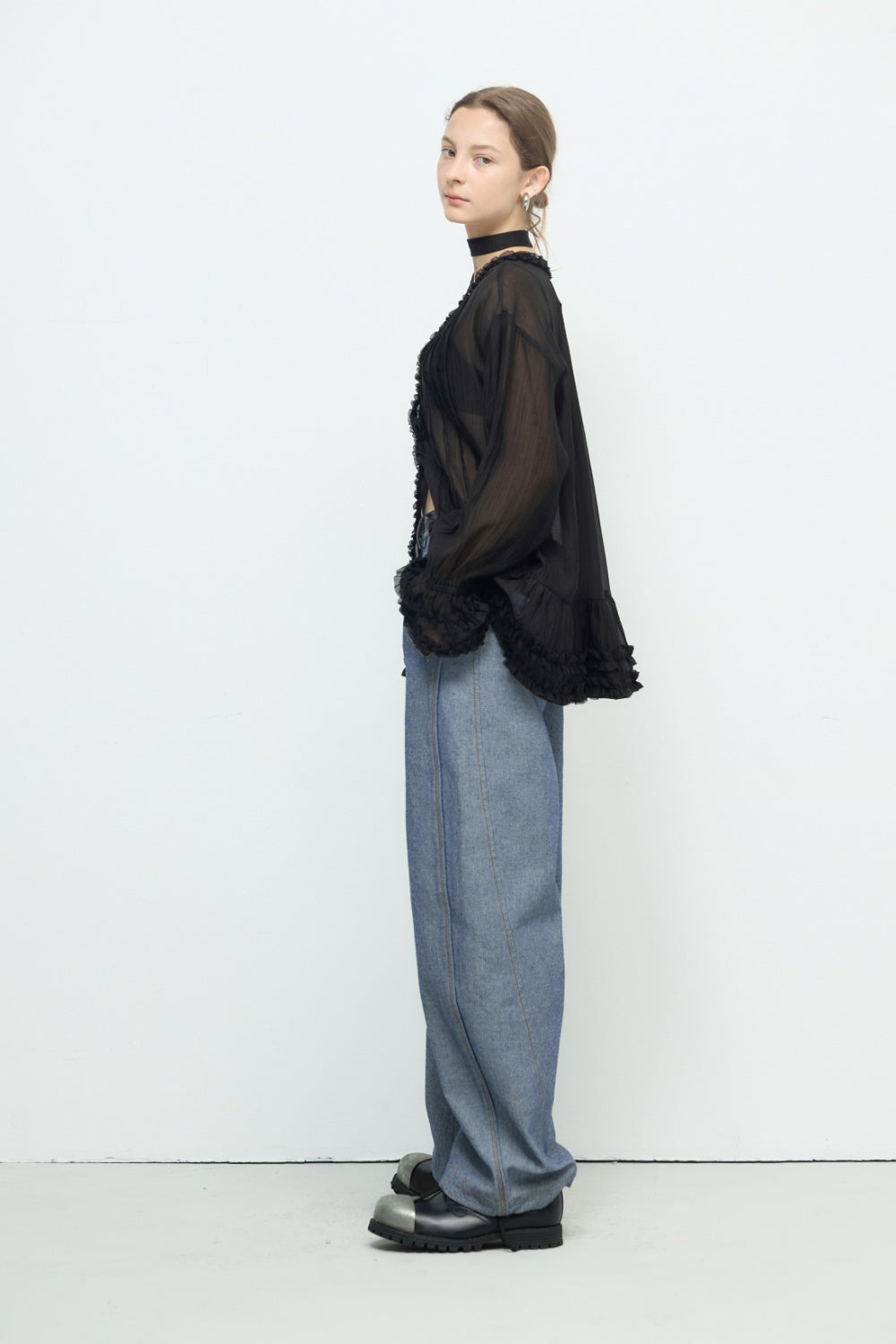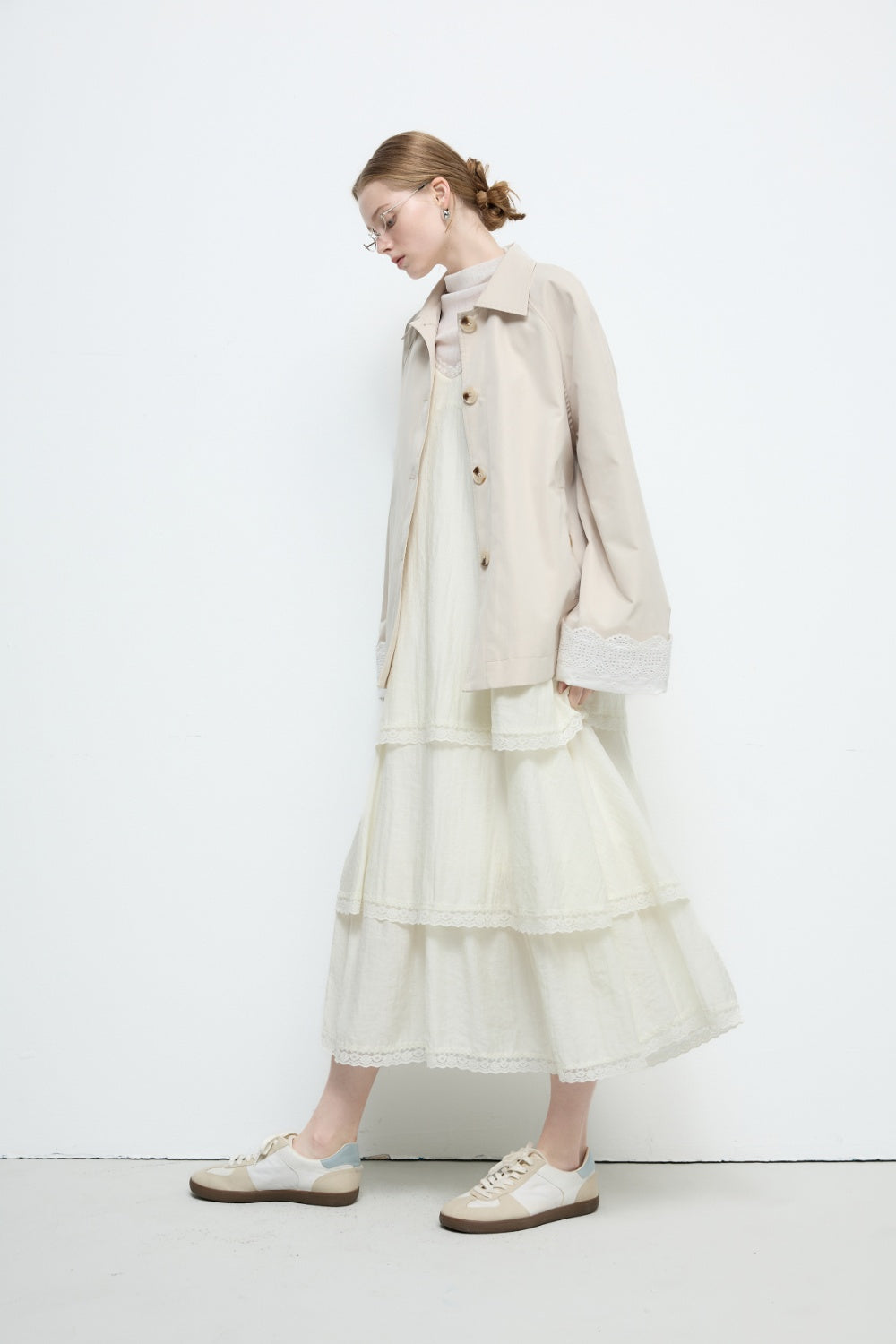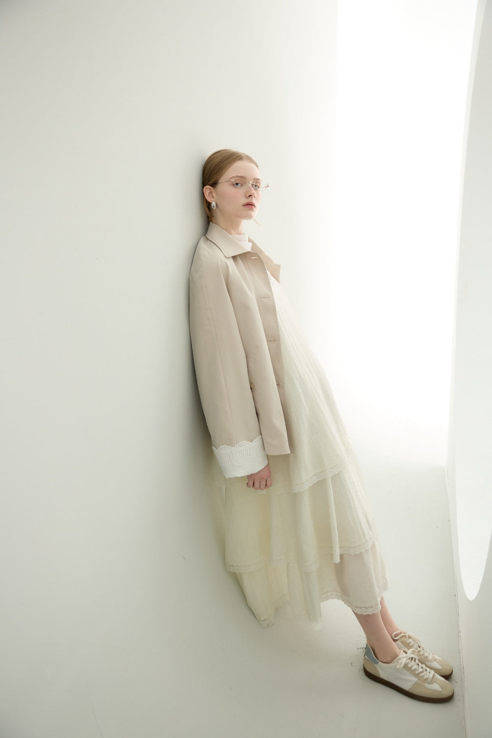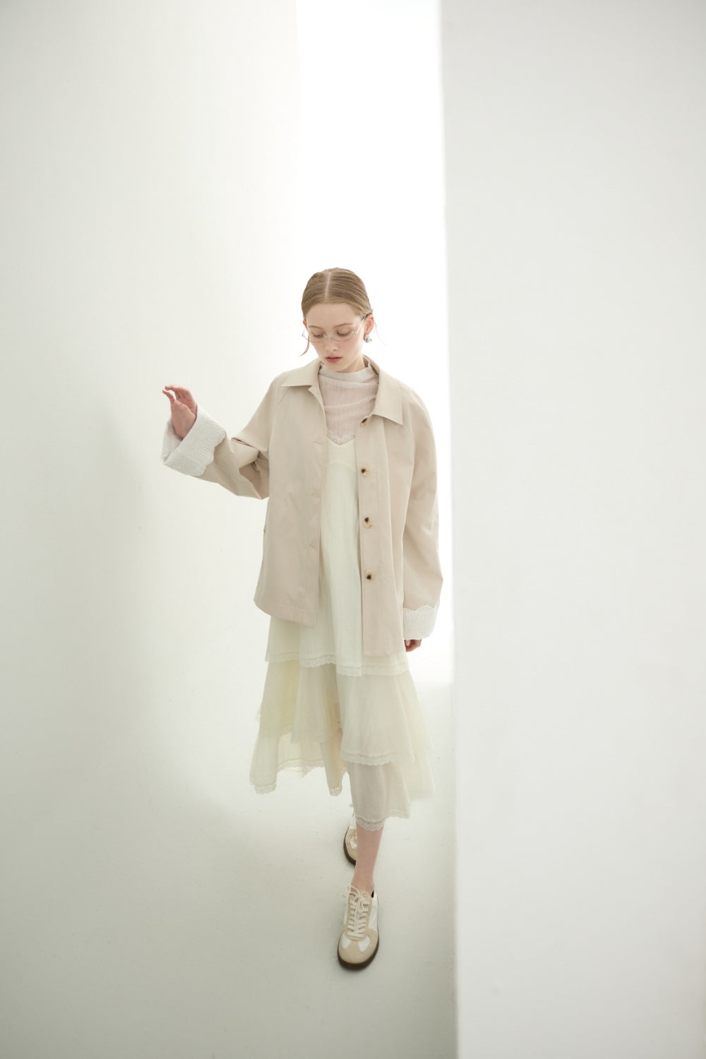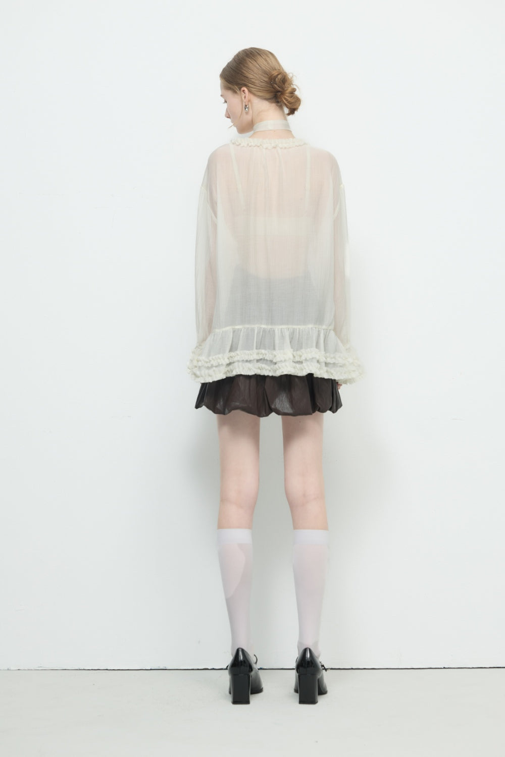 V領車褶線荷葉造型排釦上衣(附綁帶)-米