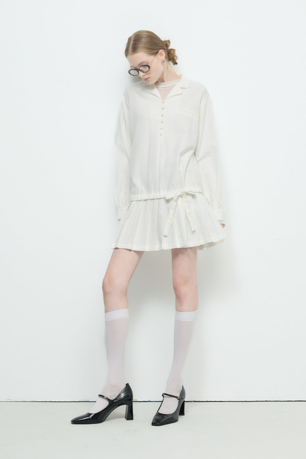 翻領抽繩百褶短洋裝-白