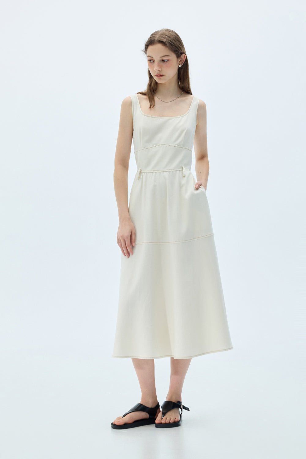 配色車線收腰無袖長洋裝-米