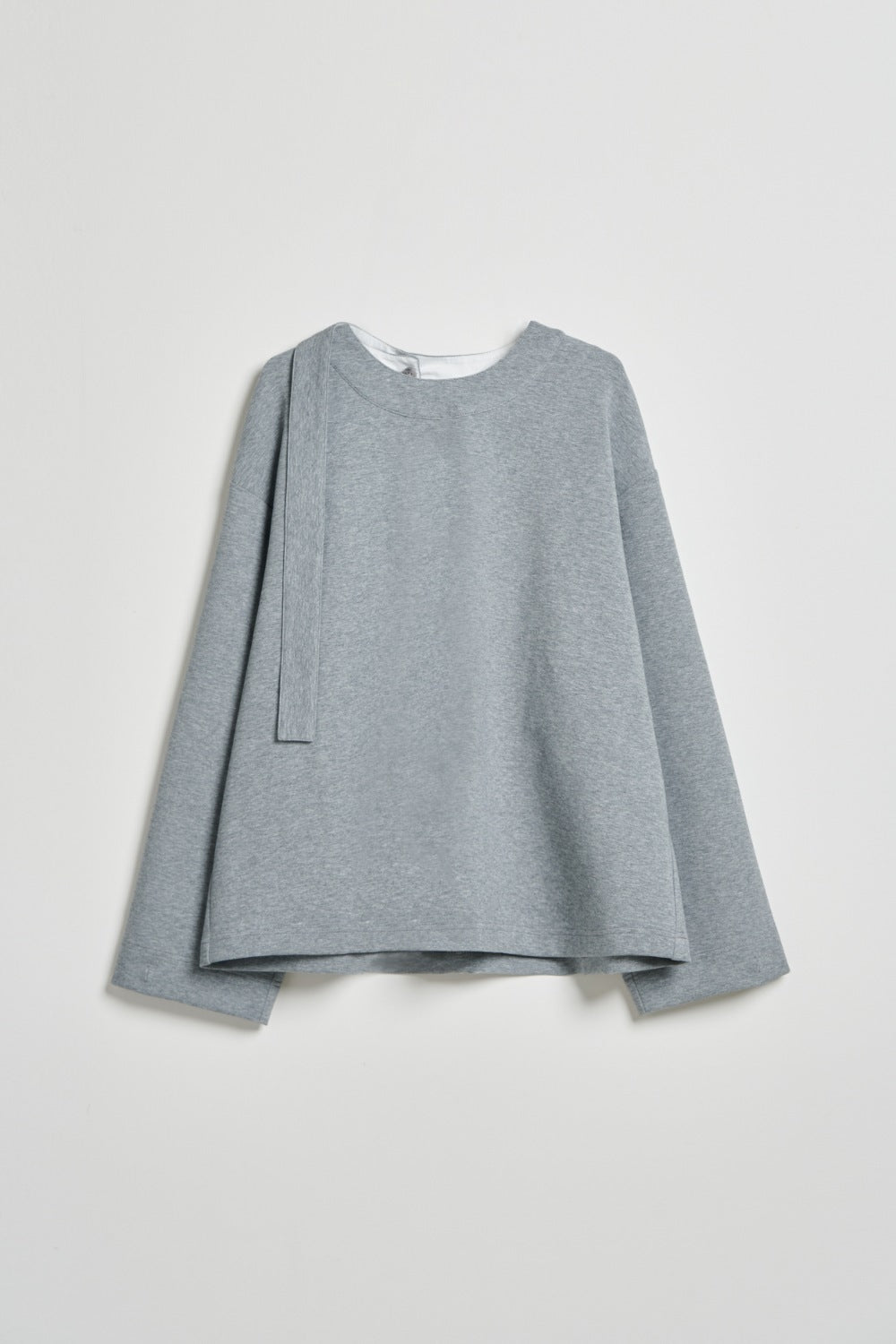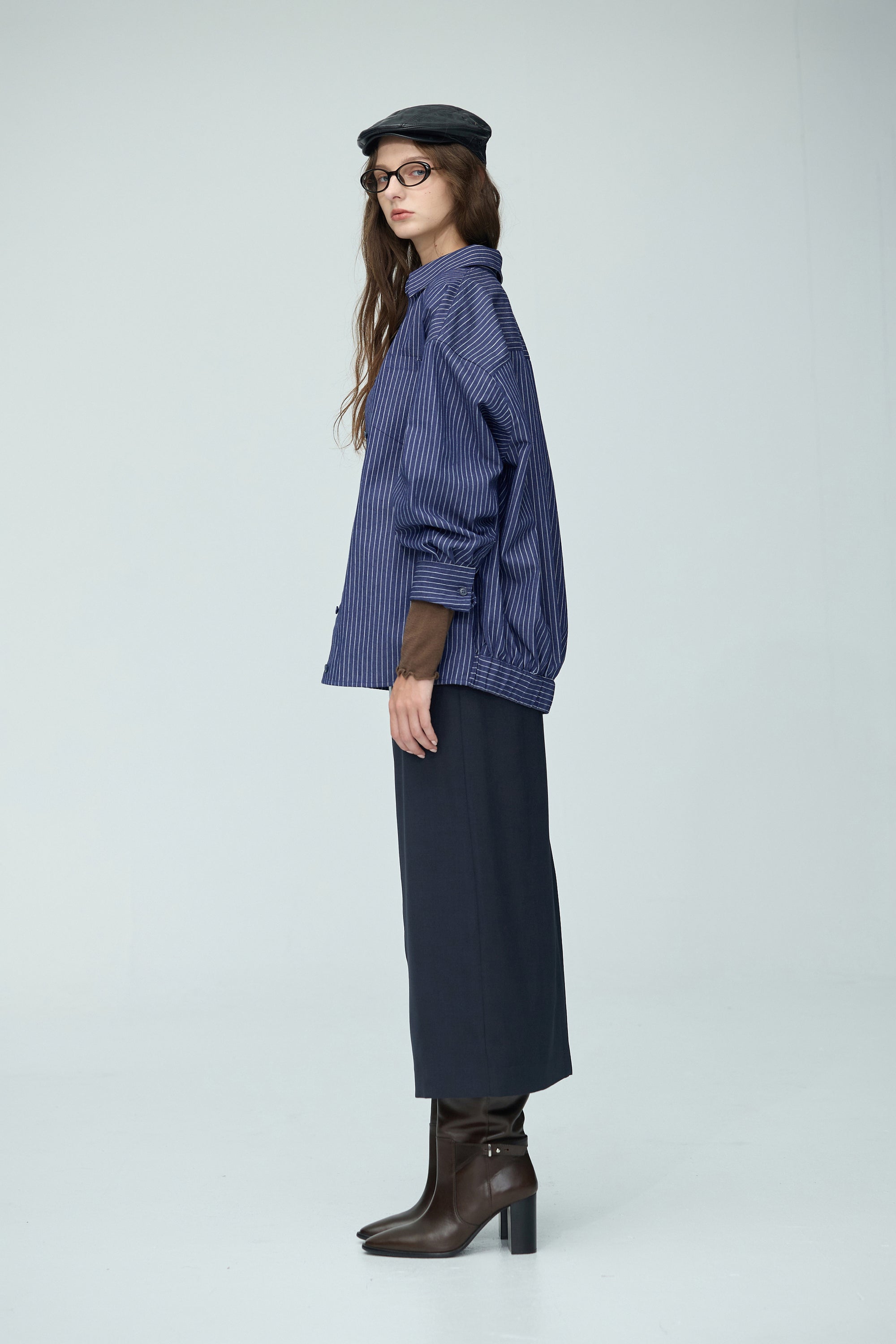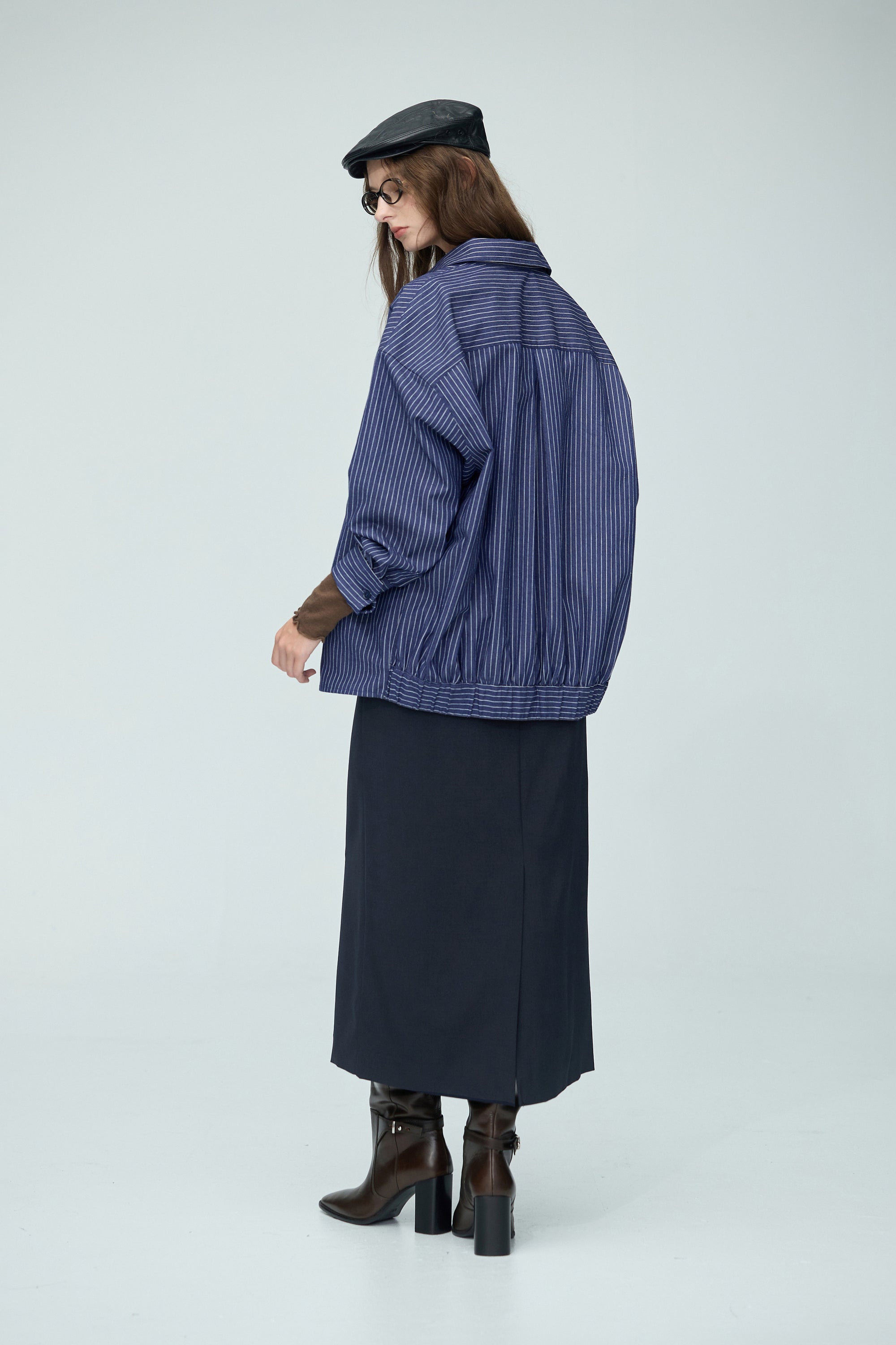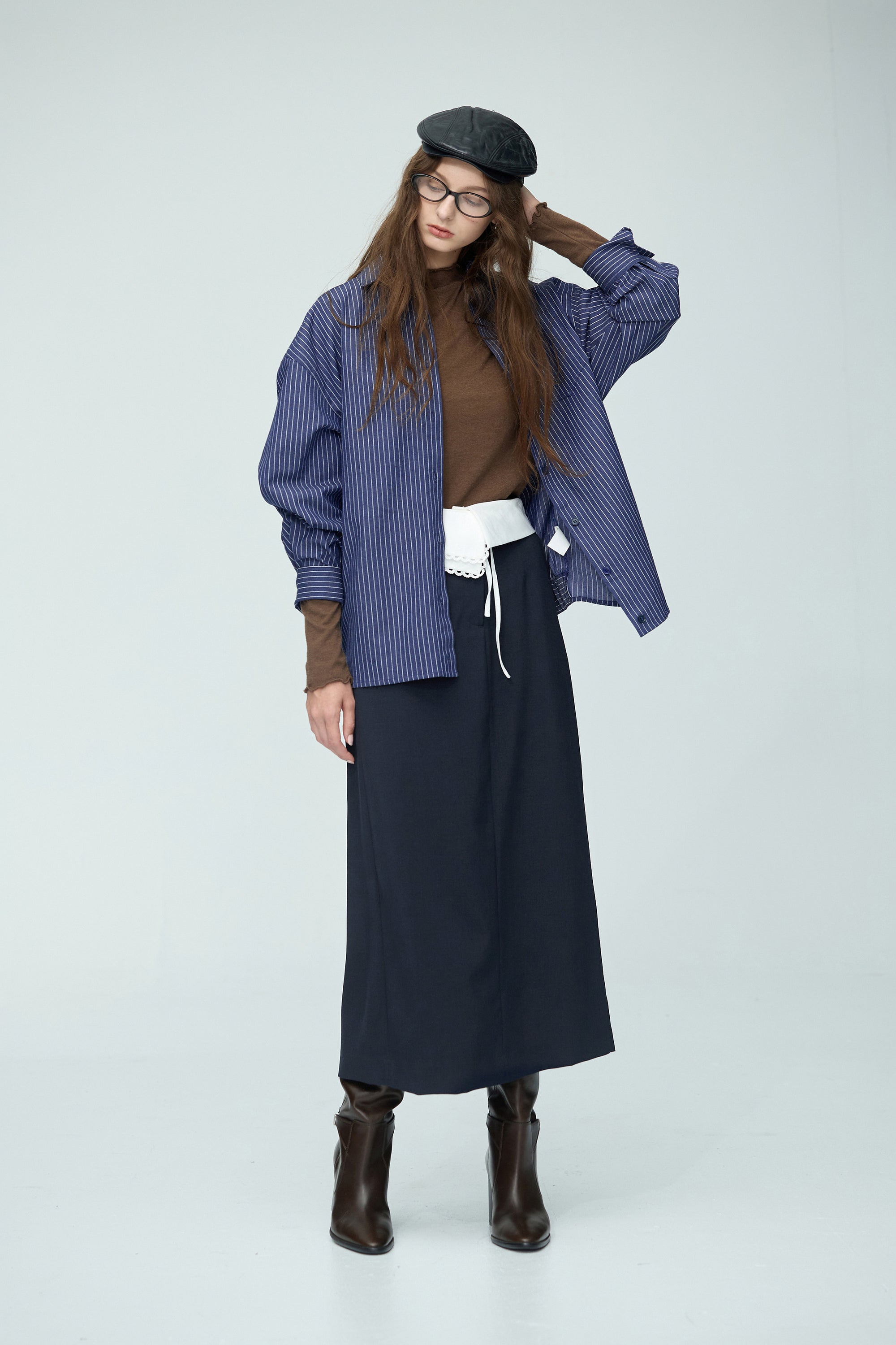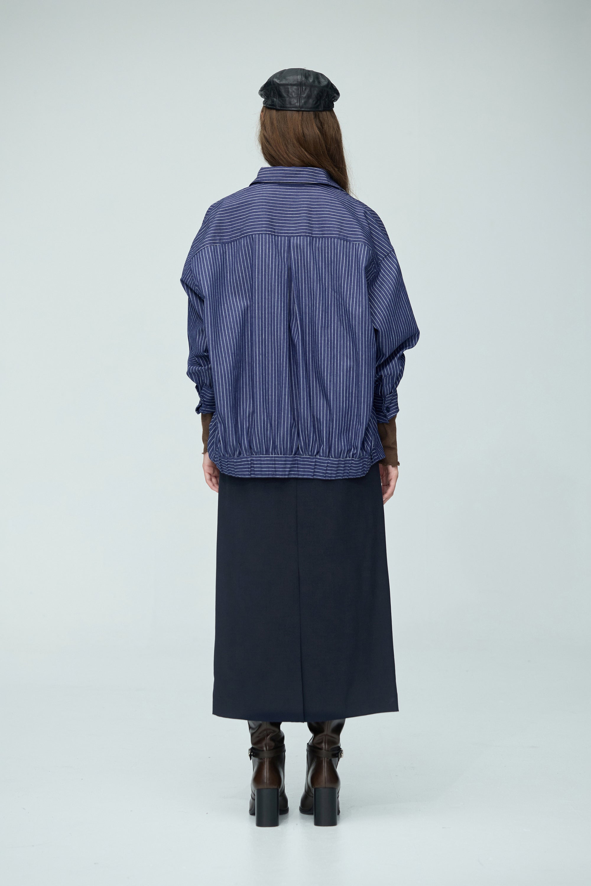 圓領條紋彈性褶皺收腰上衣(附項鍊)-藍色