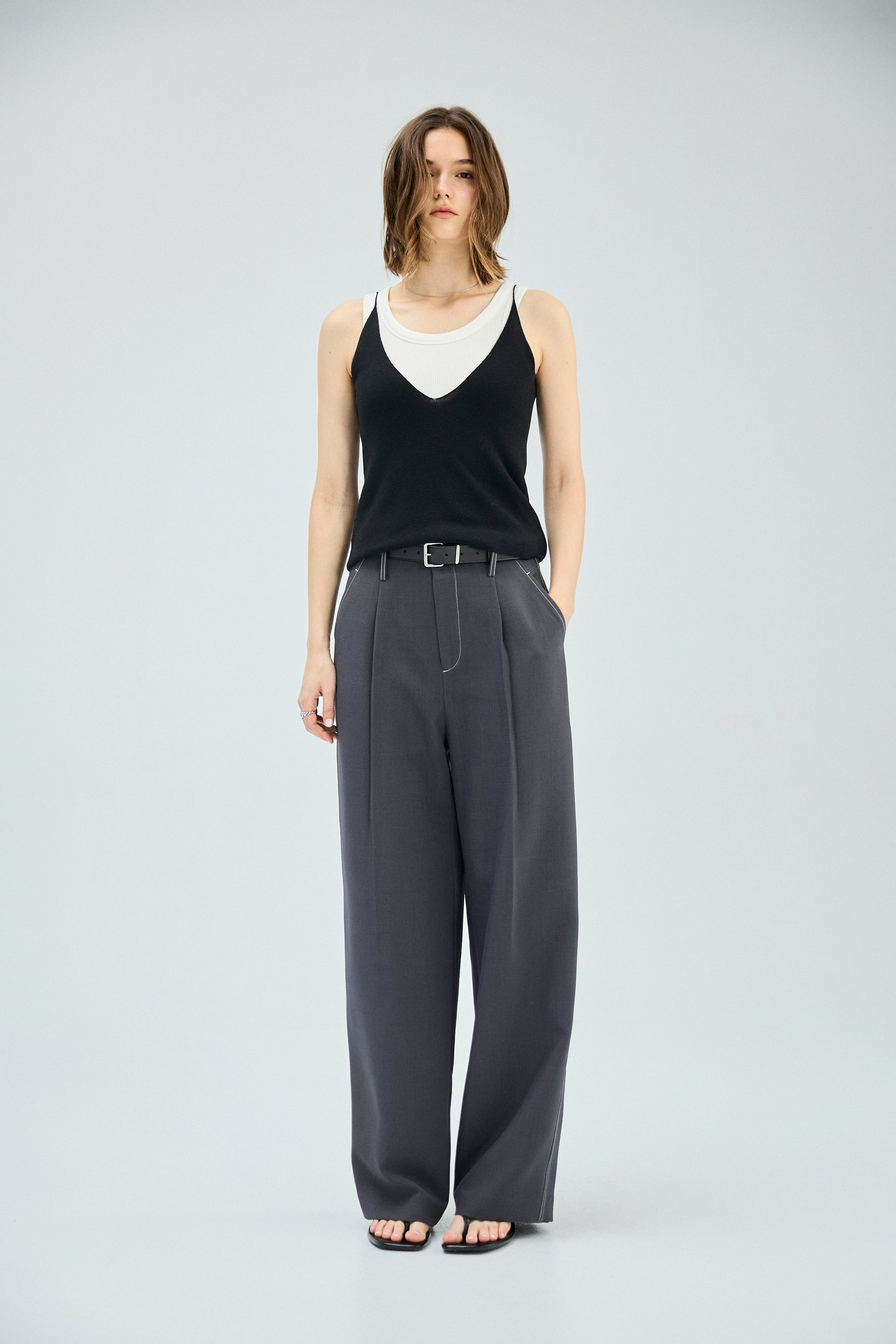 細肩帶柔感羊毛混紡修身針織背心-灰