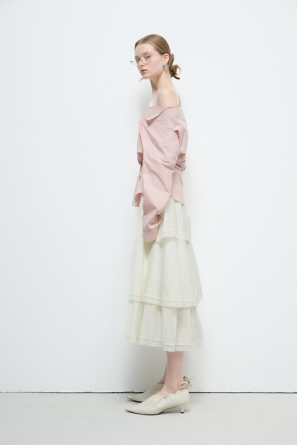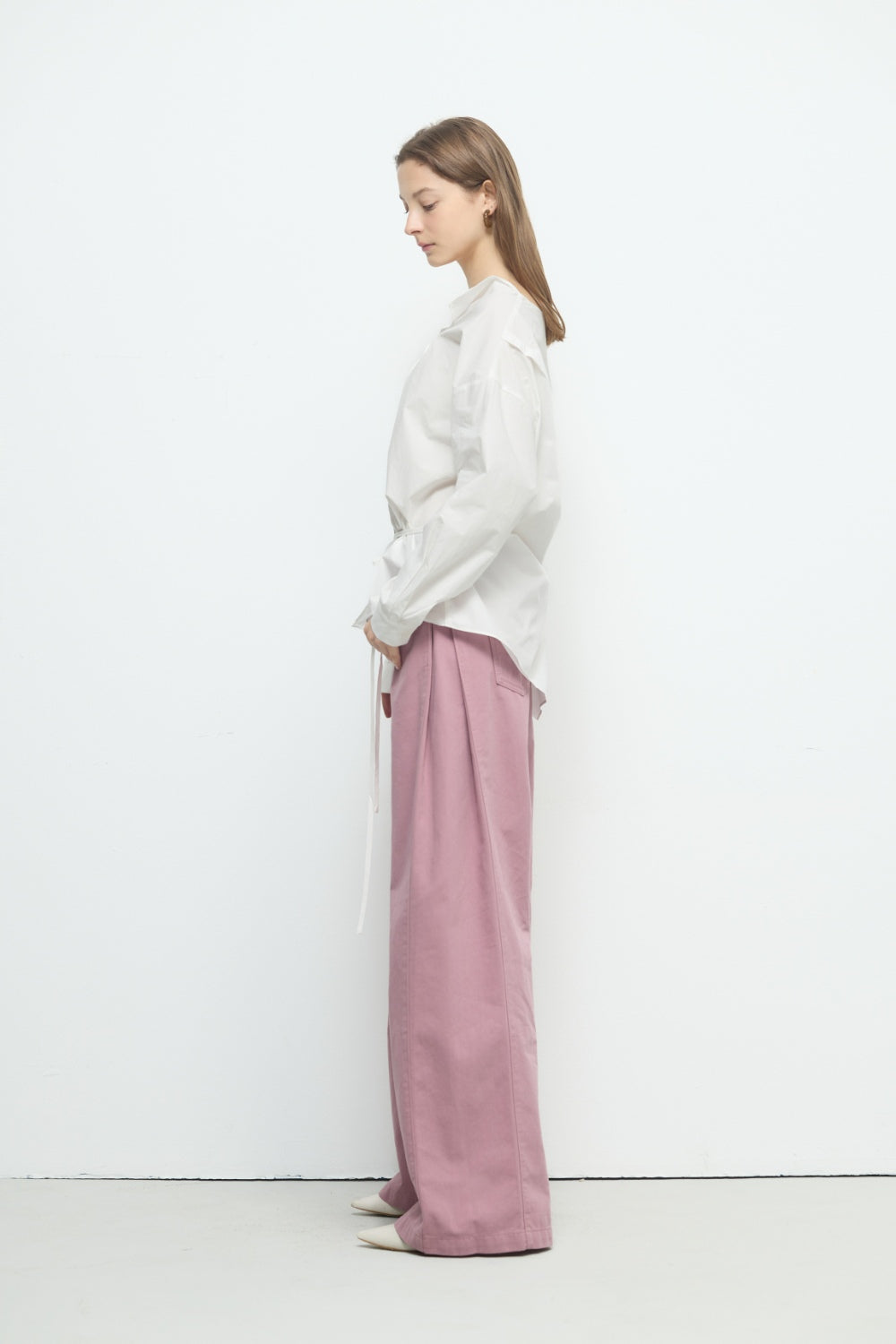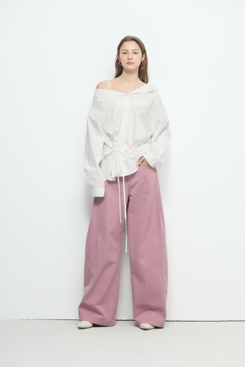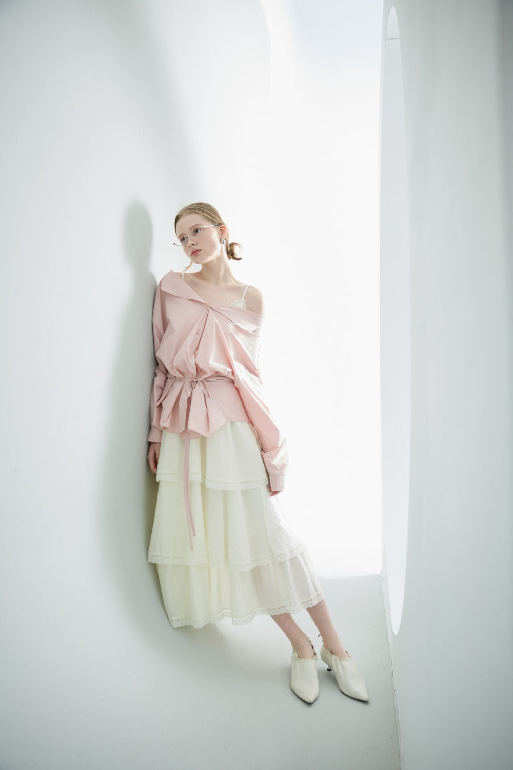 V領車褶線荷葉造型排釦上衣(附綁帶)-米