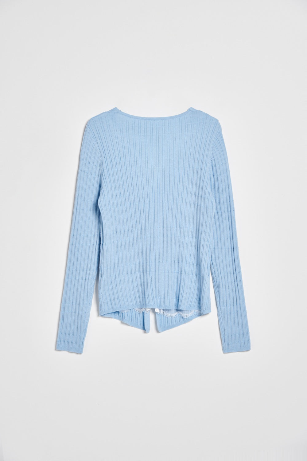 立體織紋蕾絲綁帶假兩件針織上衣-藍色