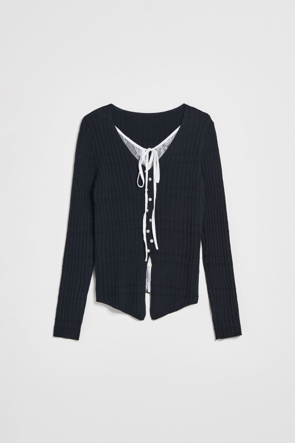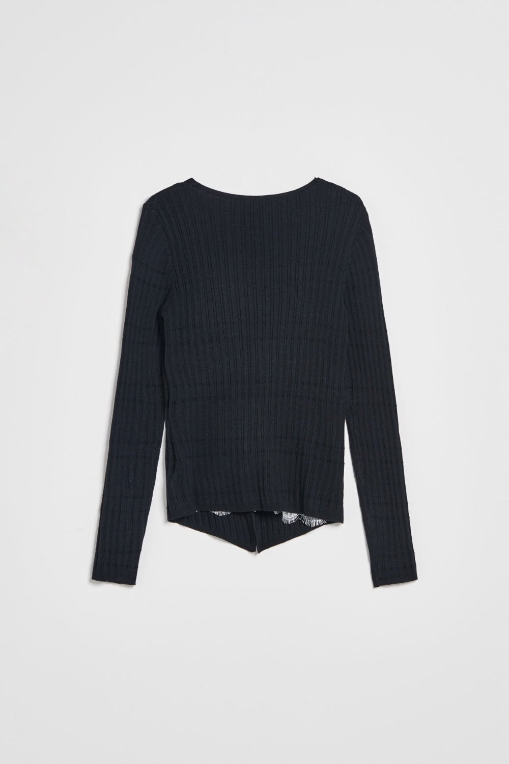 立體織紋蕾絲綁帶假兩件針織上衣-黑