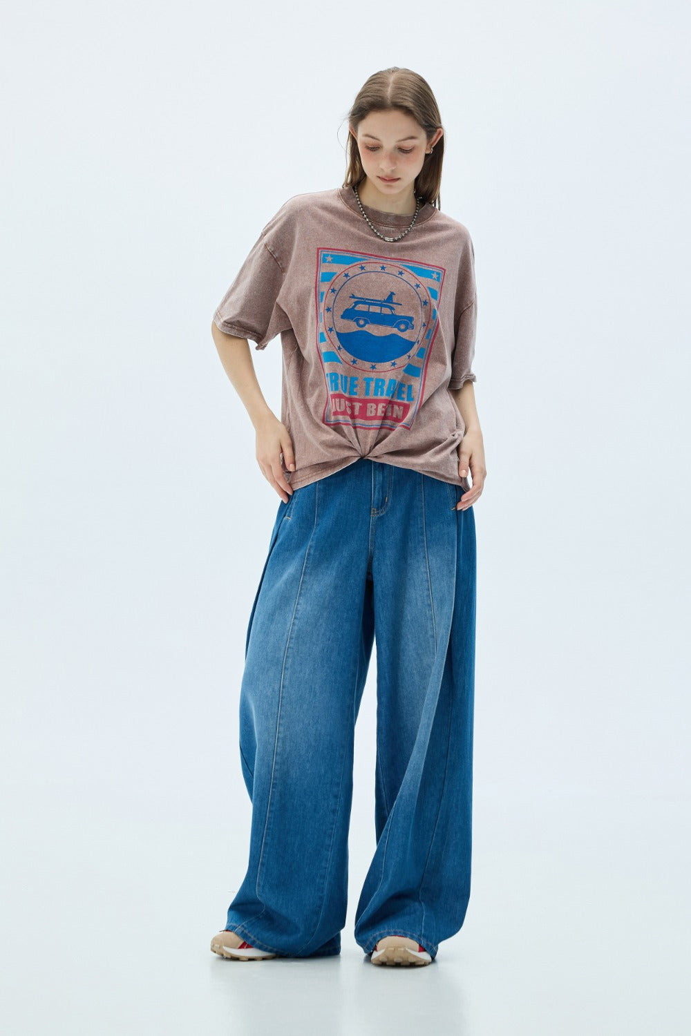 立體刺繡字母針織圓領上衣-藍