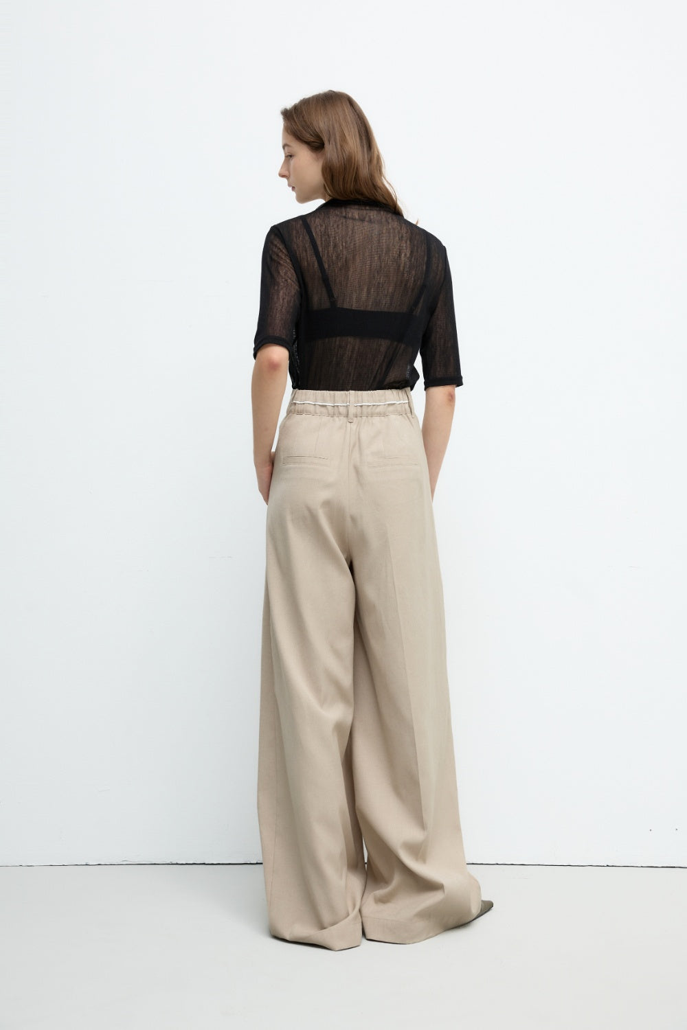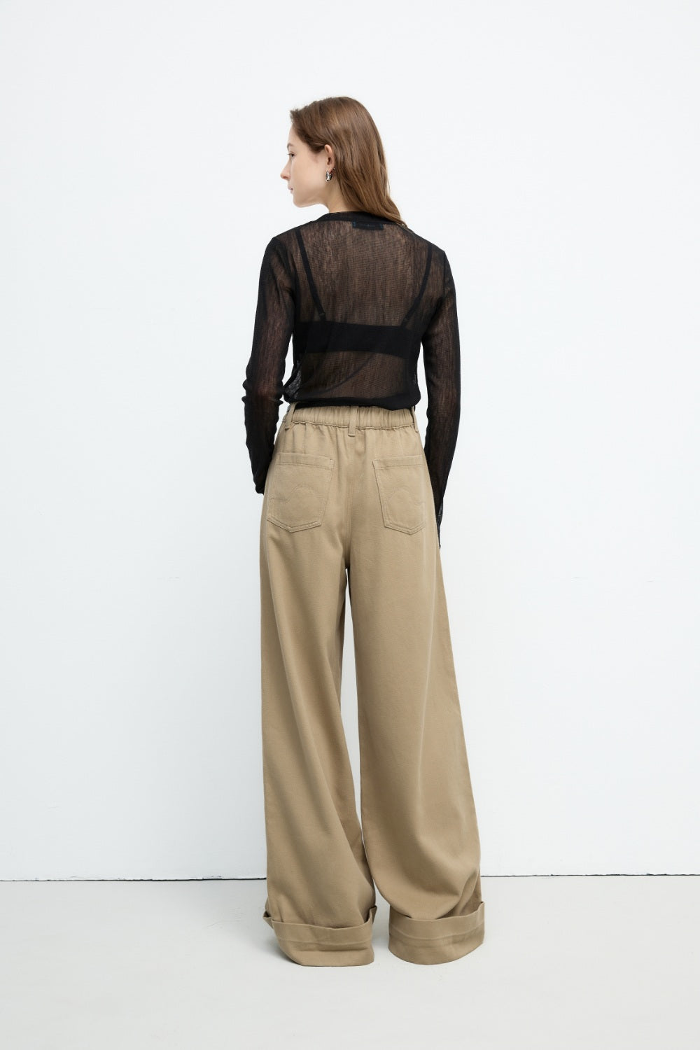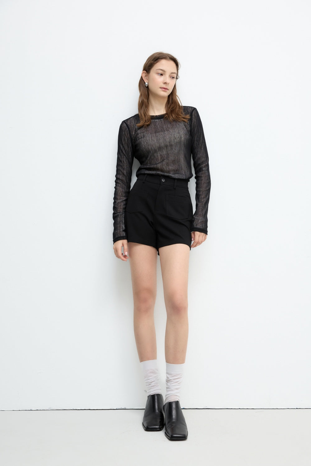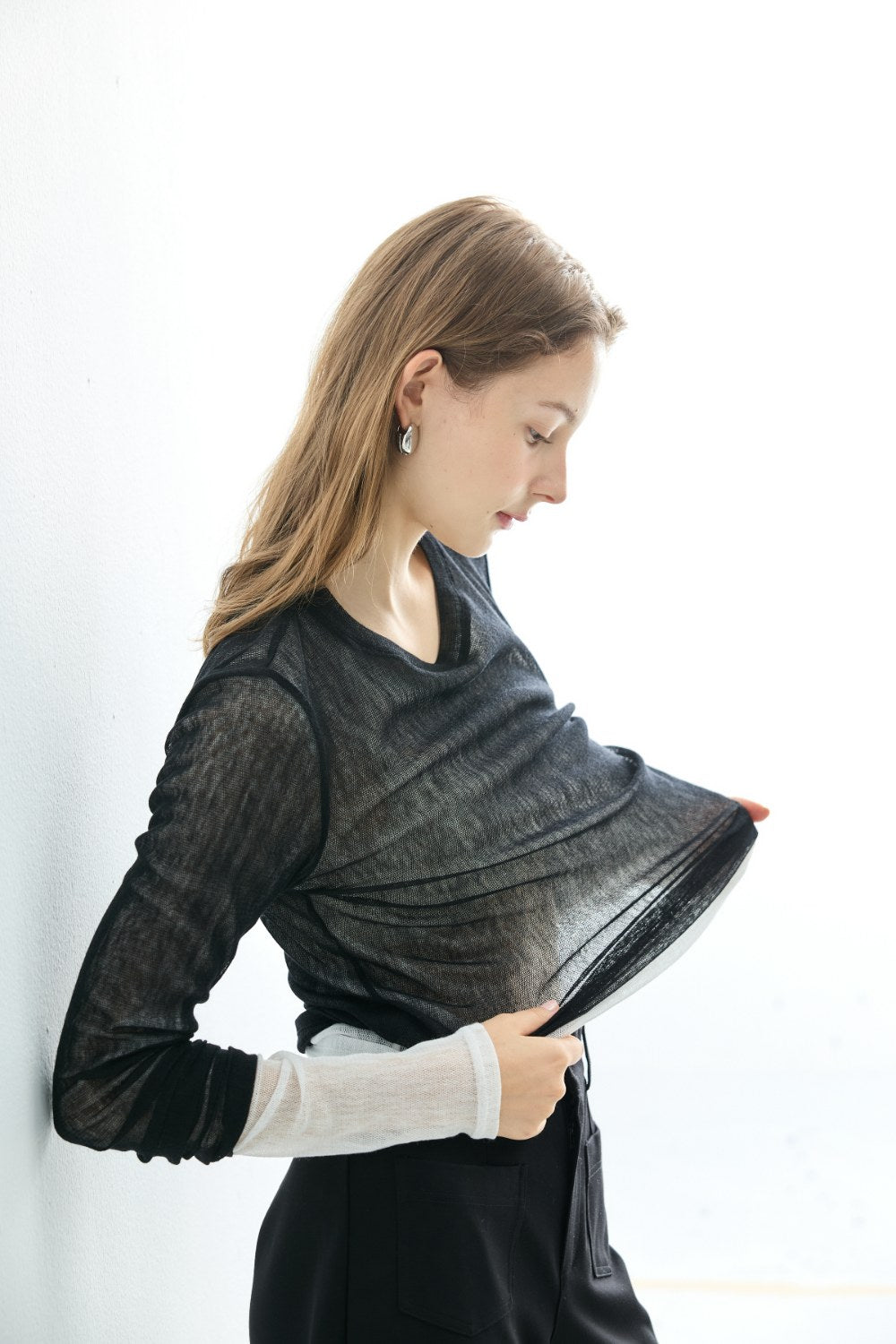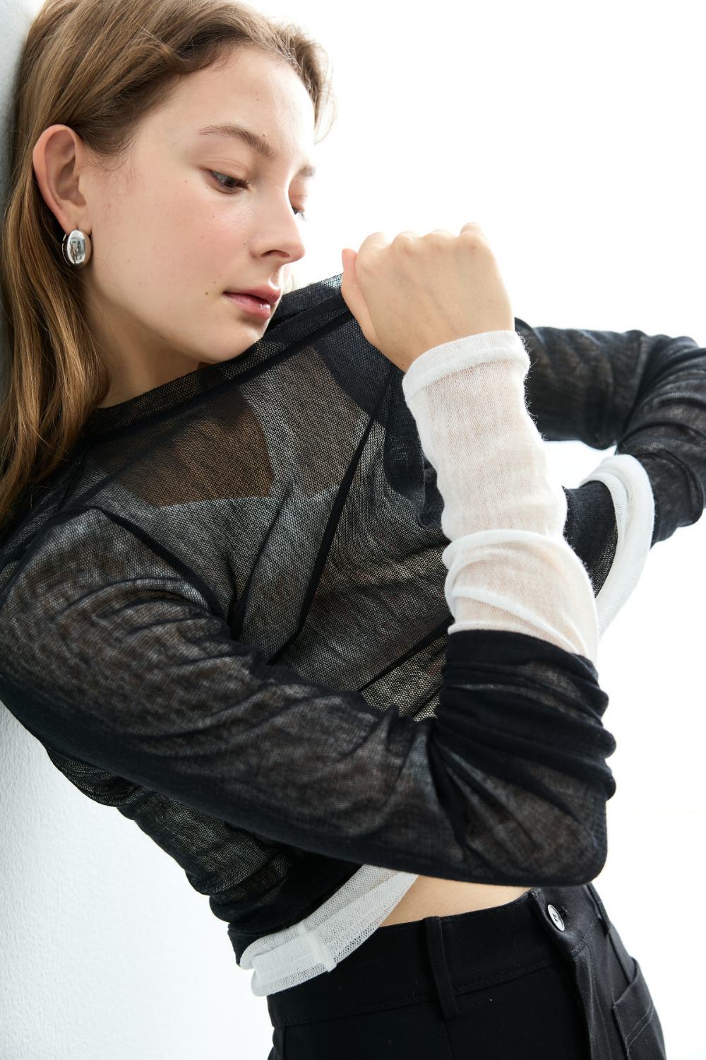 透肌感圓領長袖上衣-黑