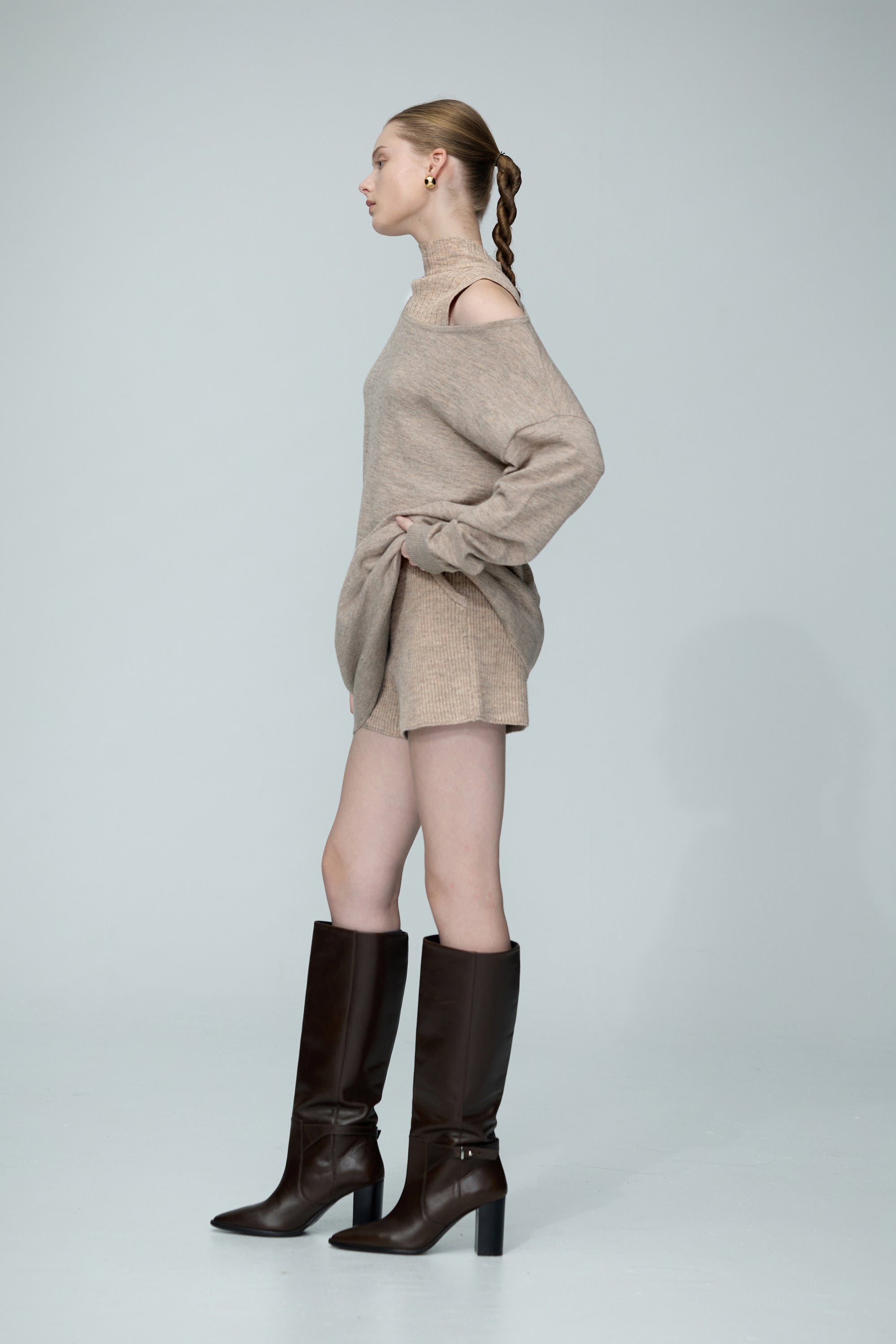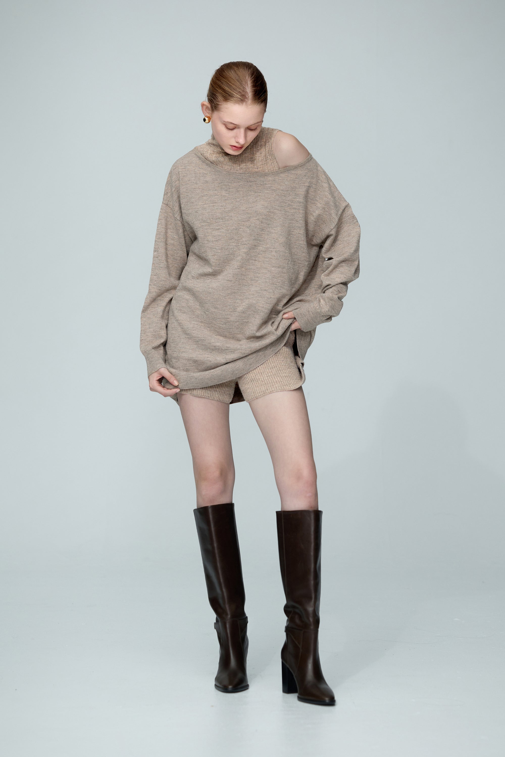 船型領寬長版花紗毛衣上衣-駝色