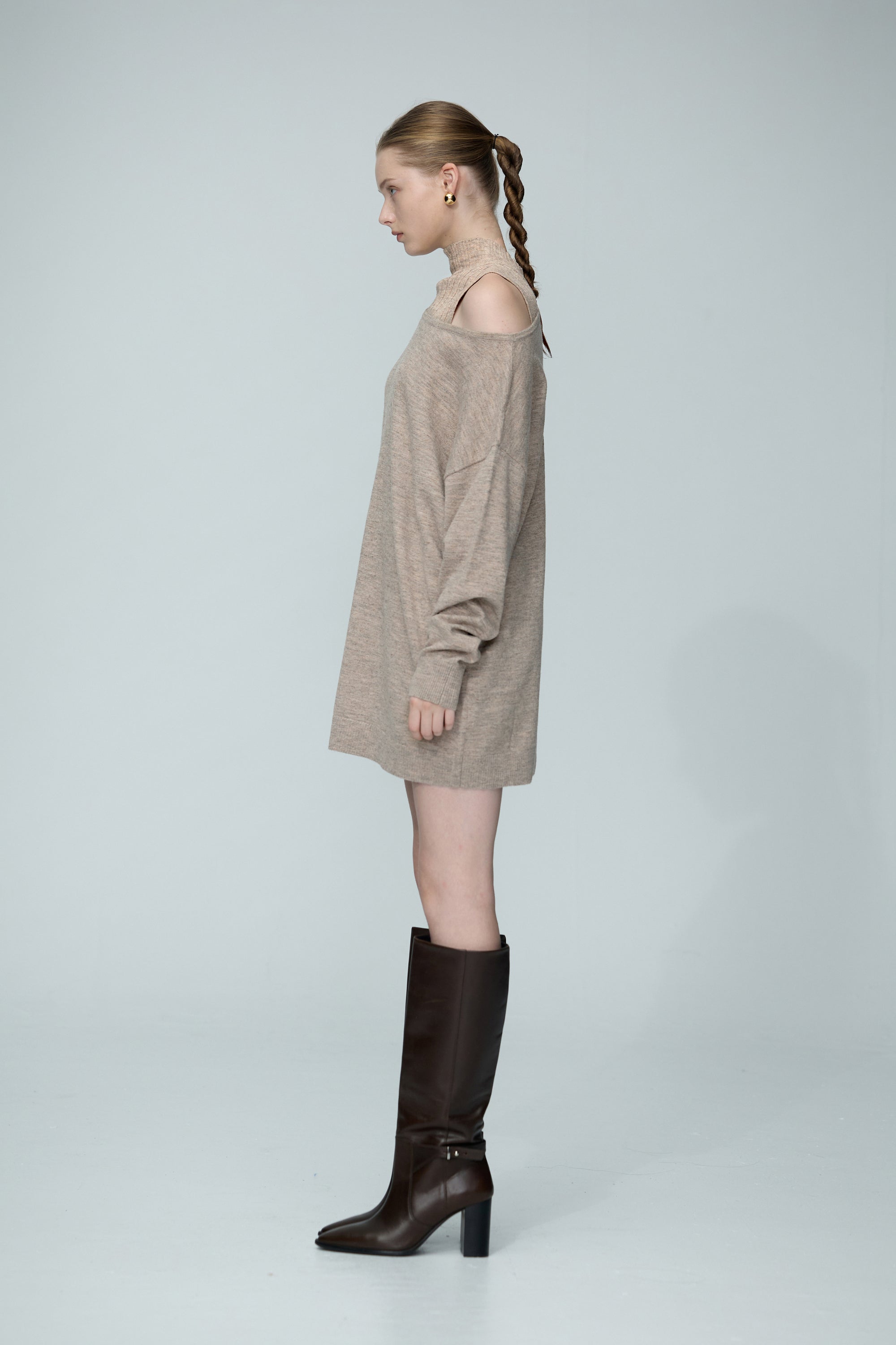 半高領直條排針無袖針織毛衣-駝色