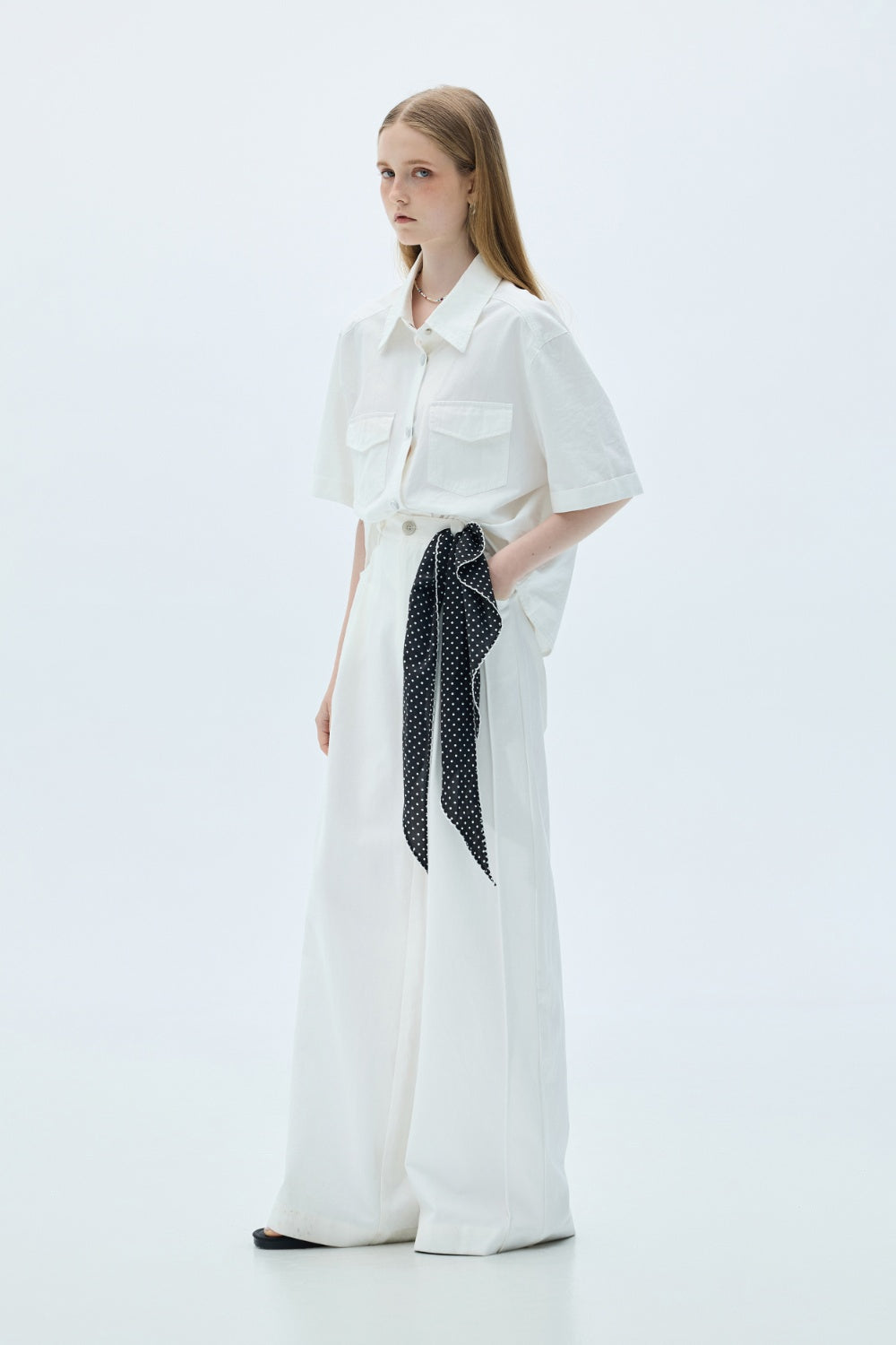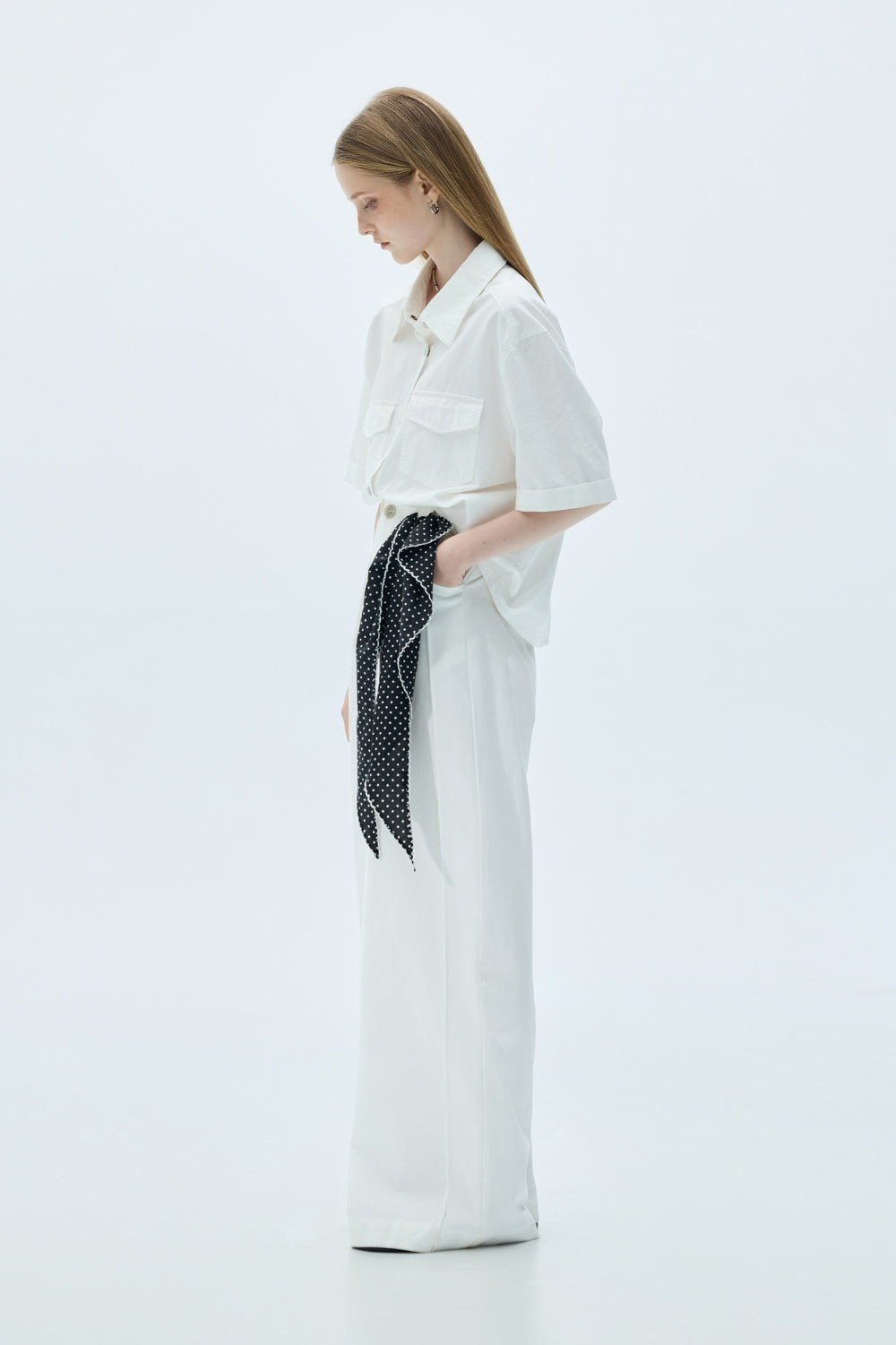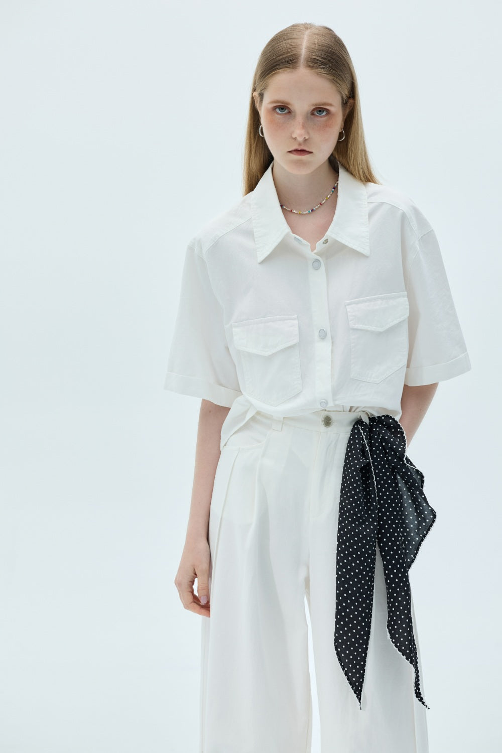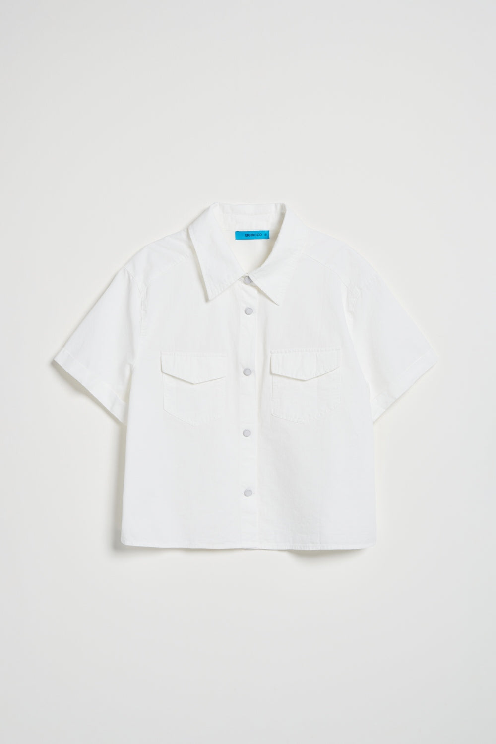 雙口袋翻袋設計短版襯衫-白