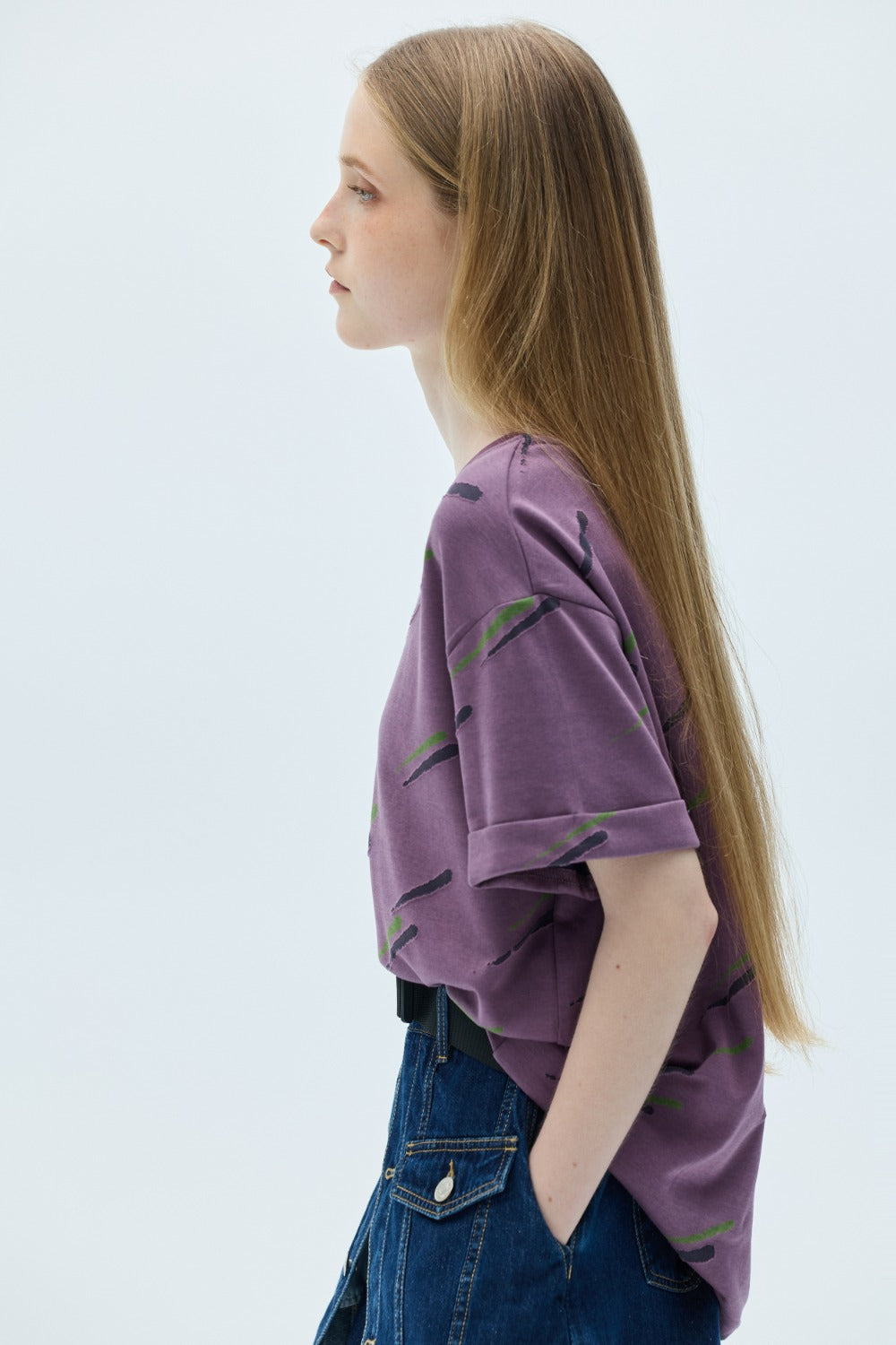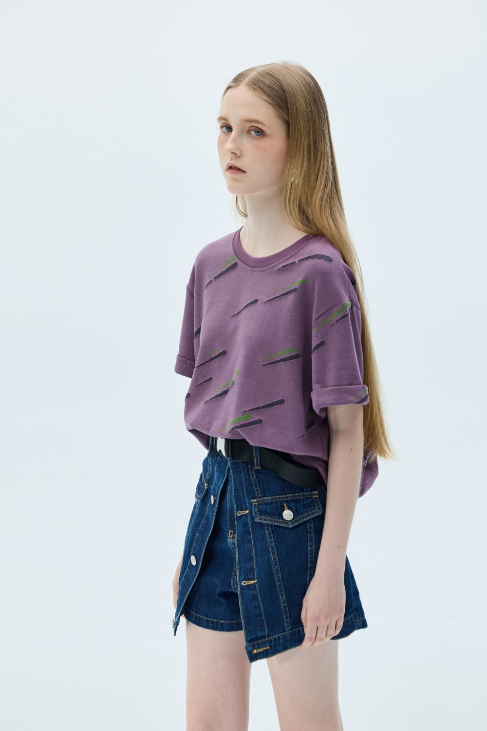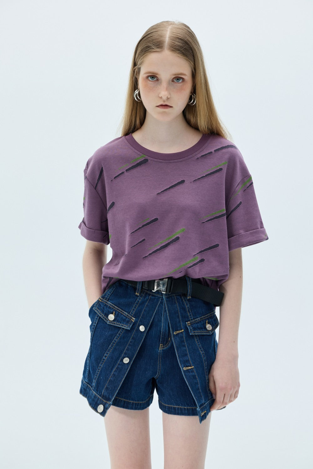 破損剪裁配色Tee上衣-紫