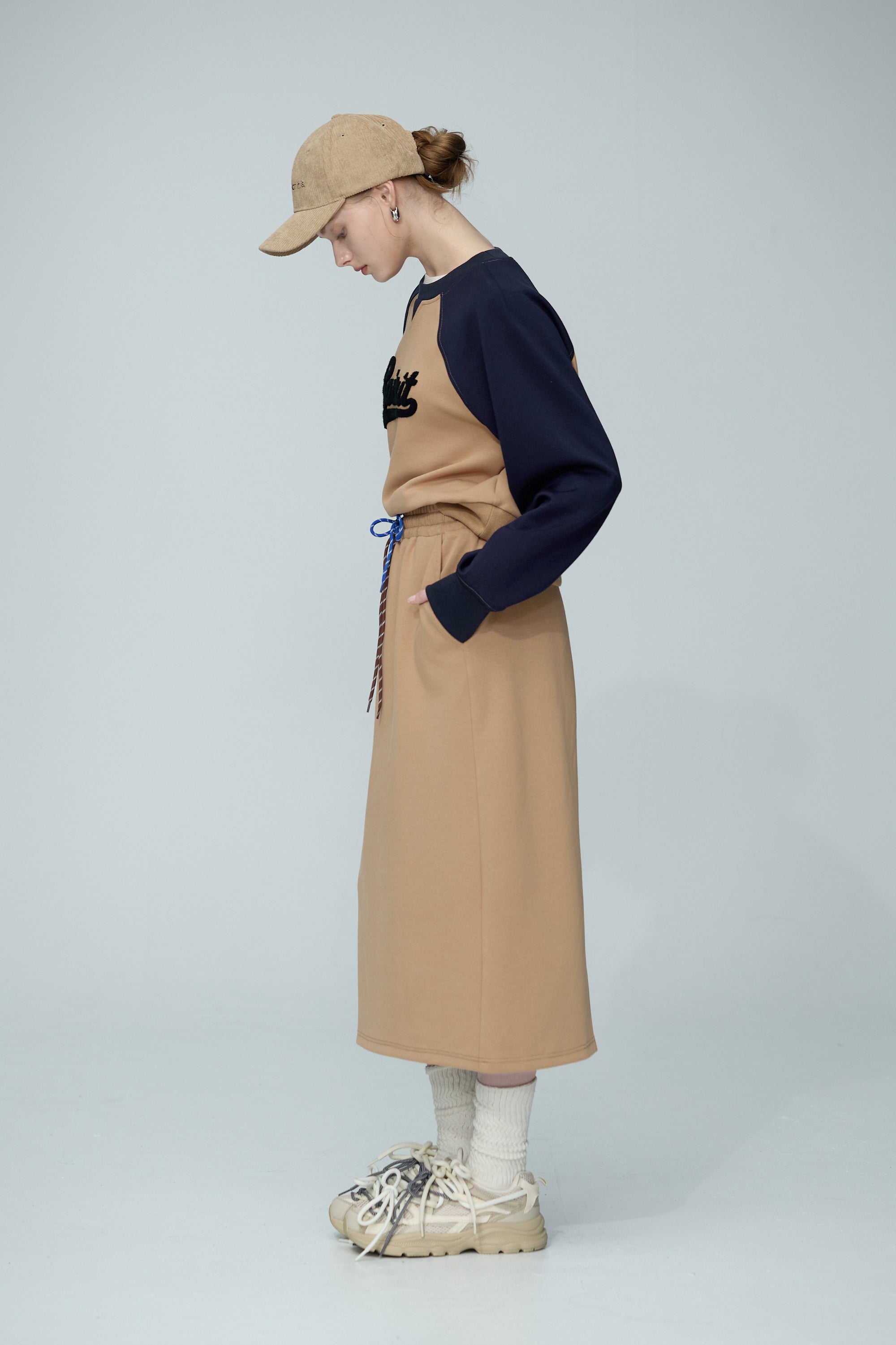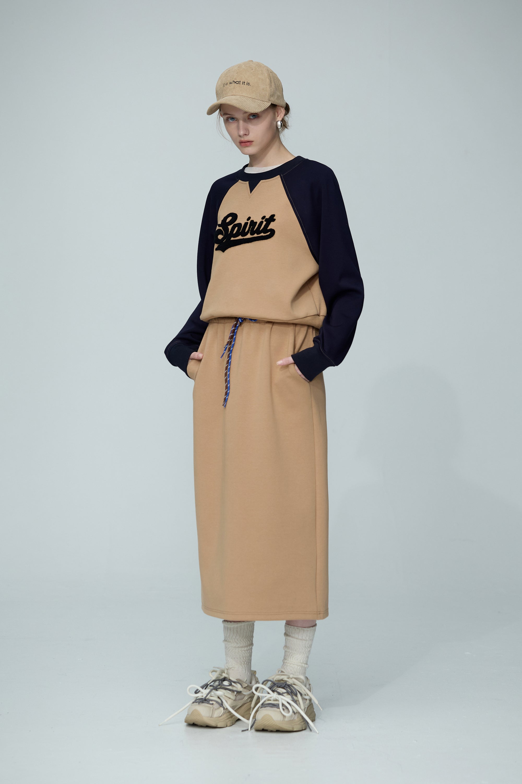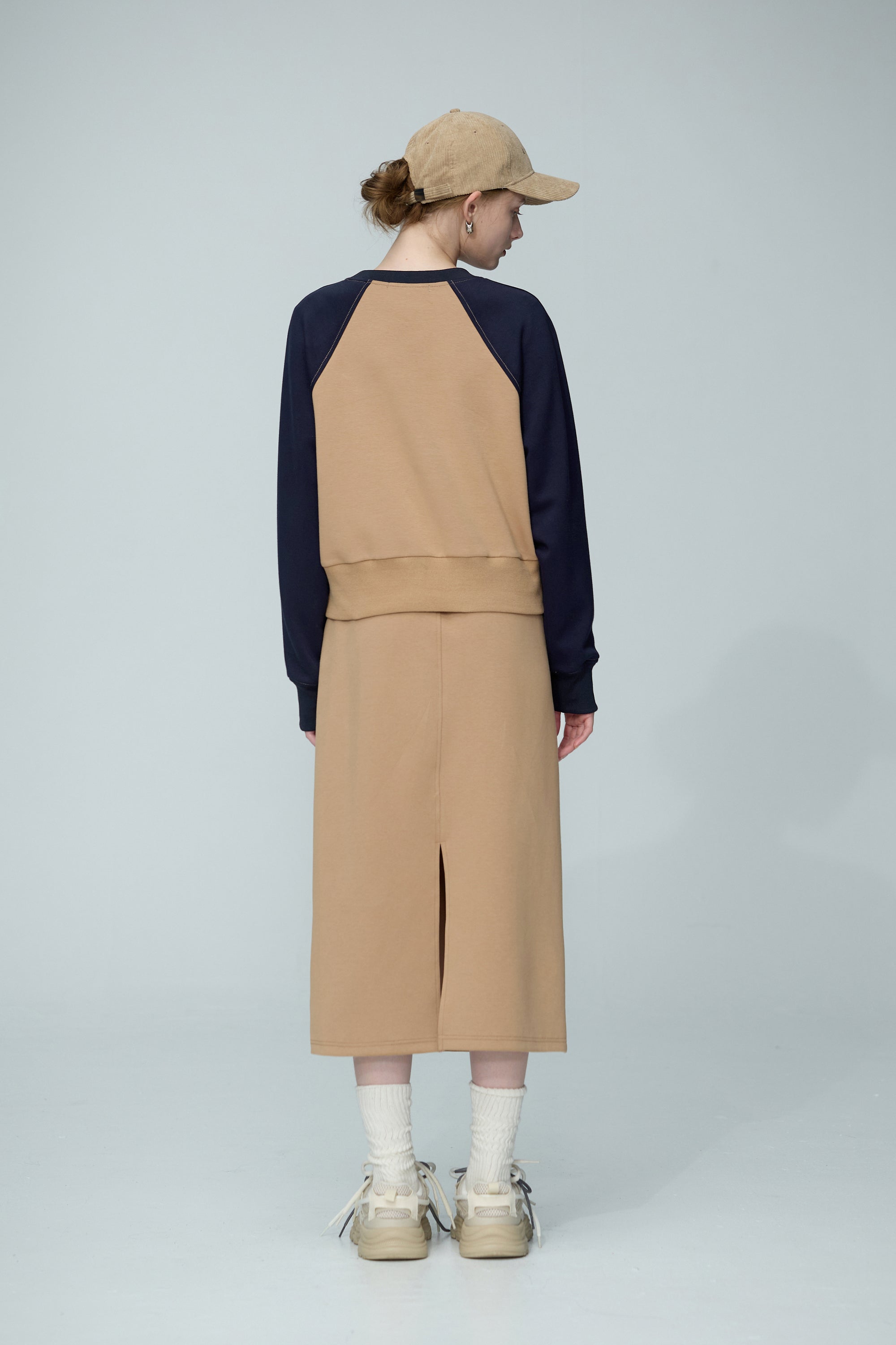 繞頸配色假兩件針織開襟外套-卡其