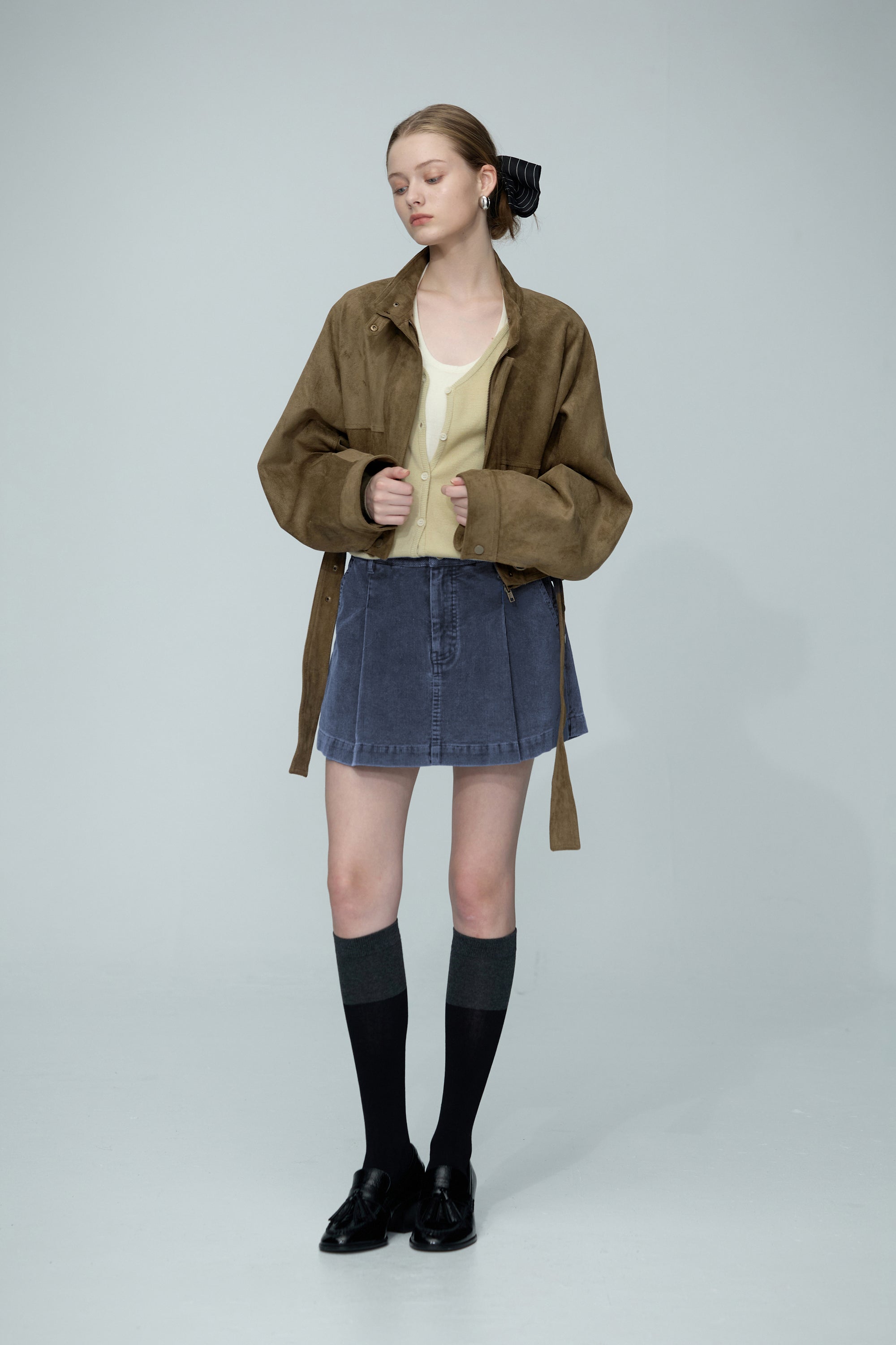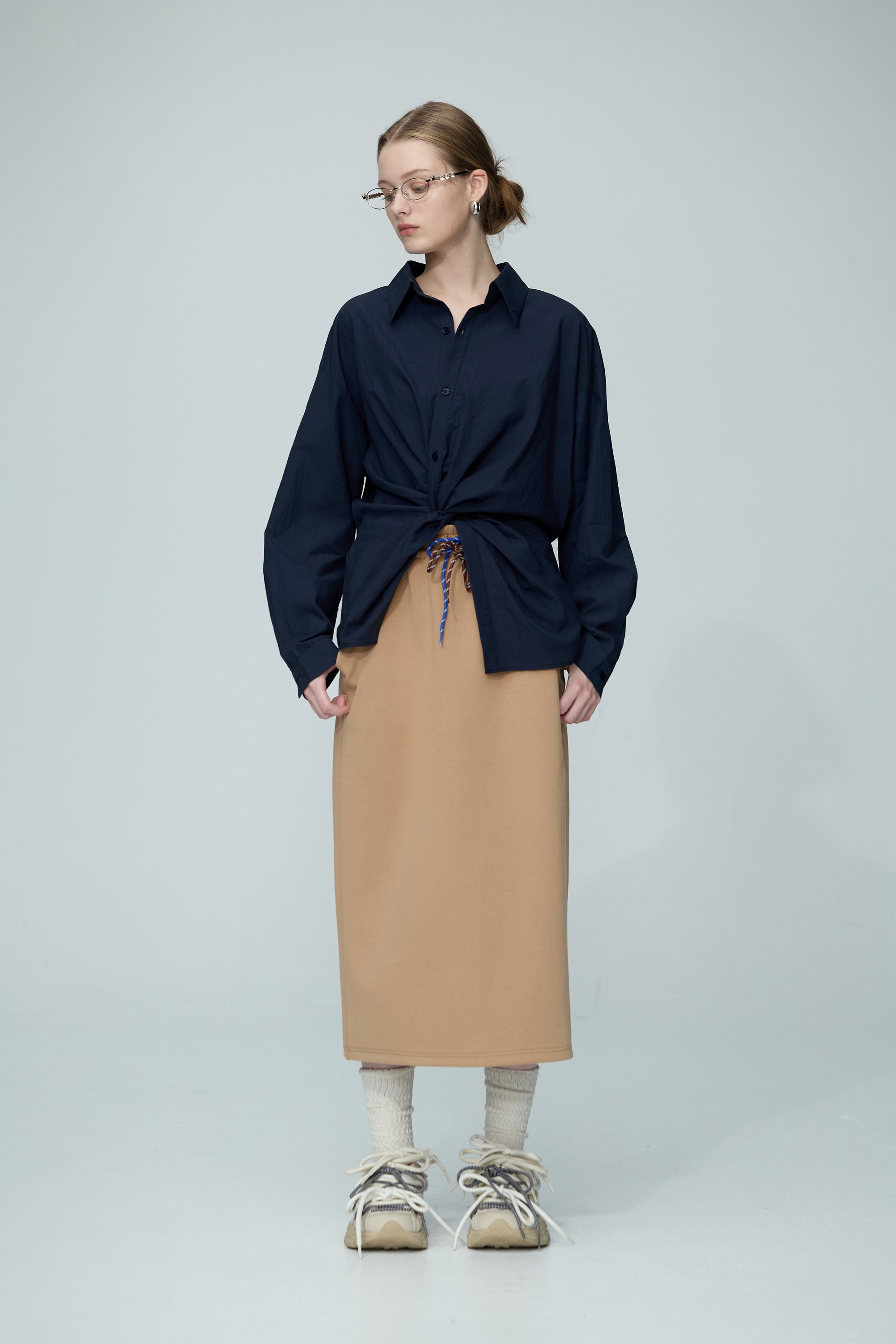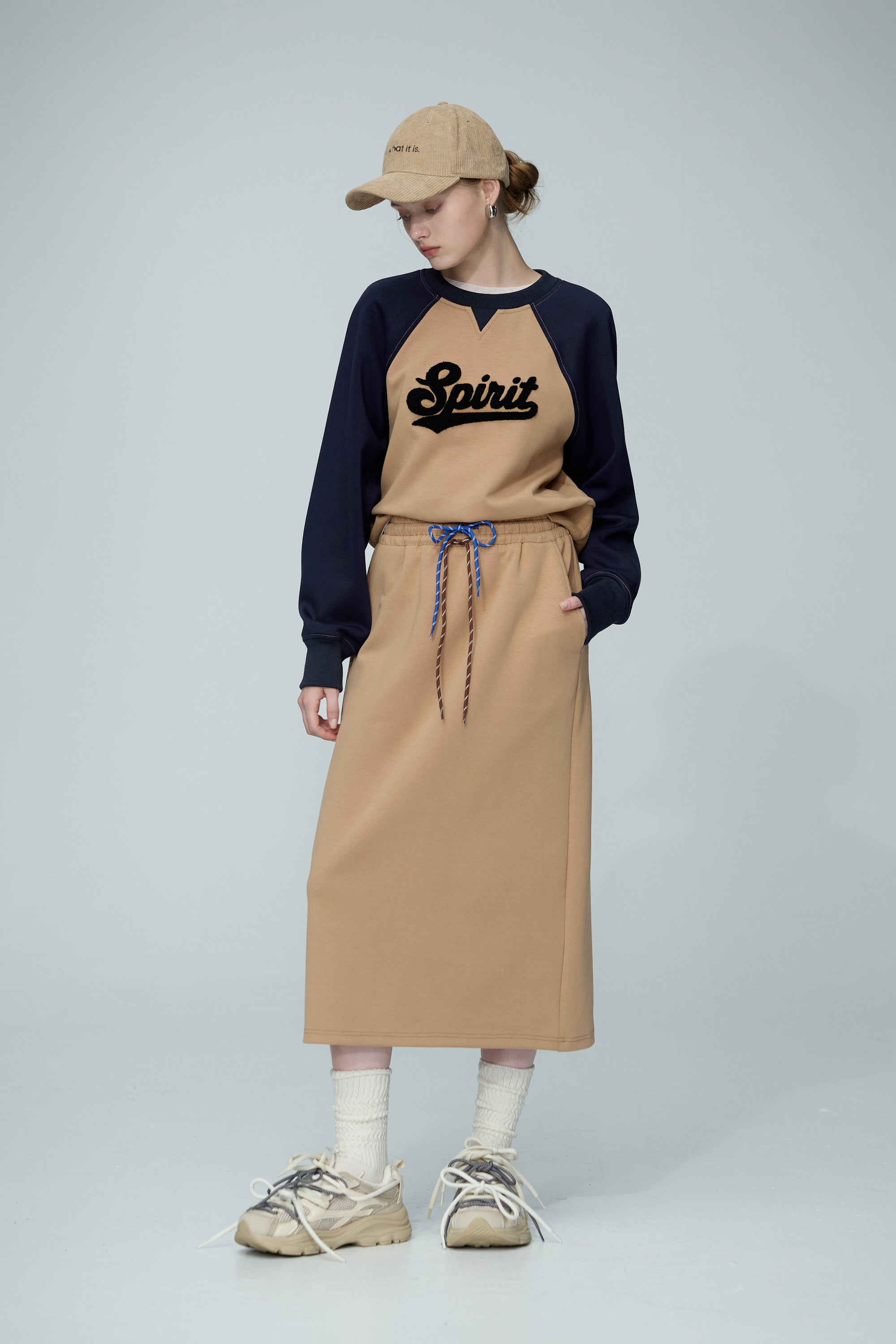 繞頸配色假兩件針織開襟外套-卡其