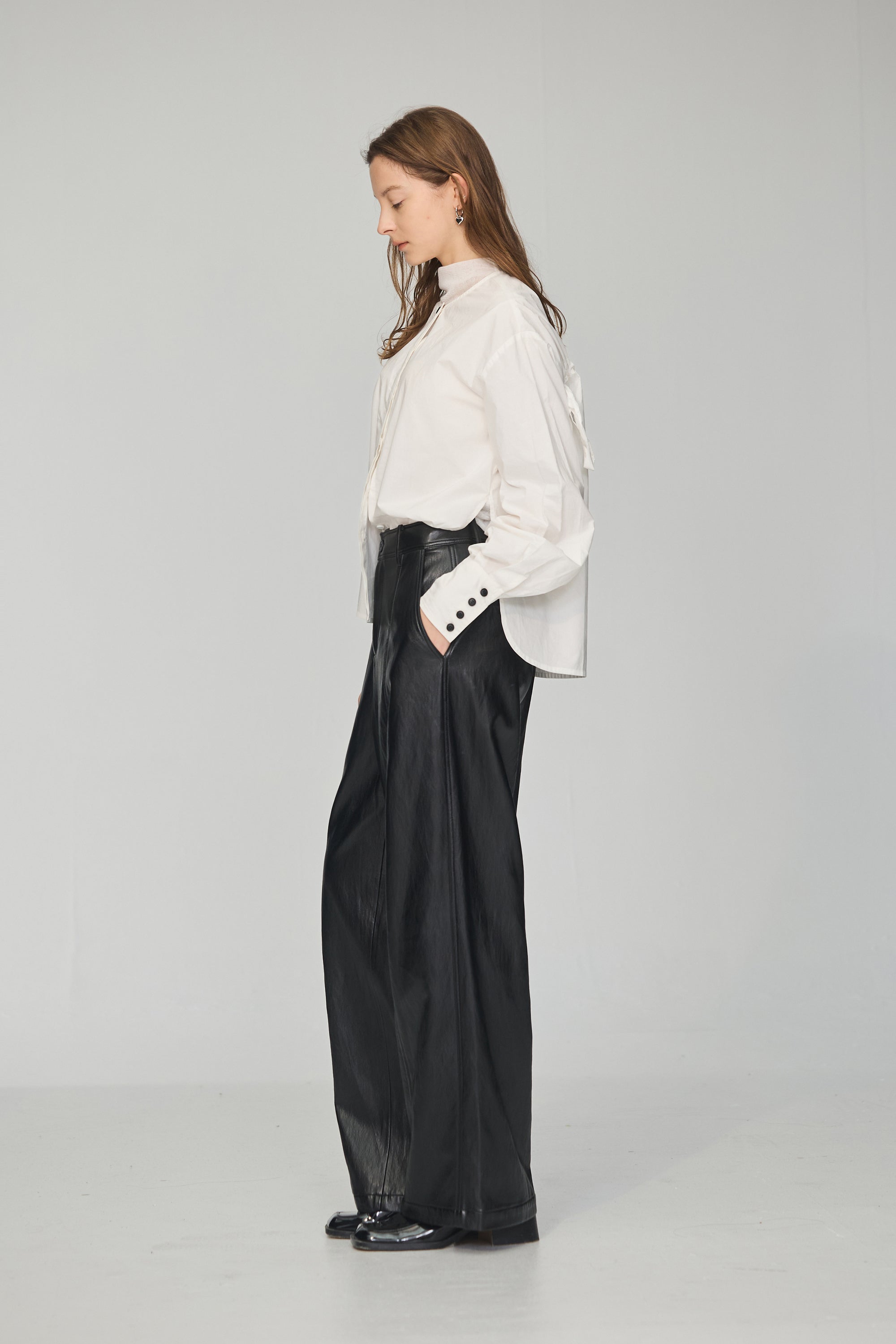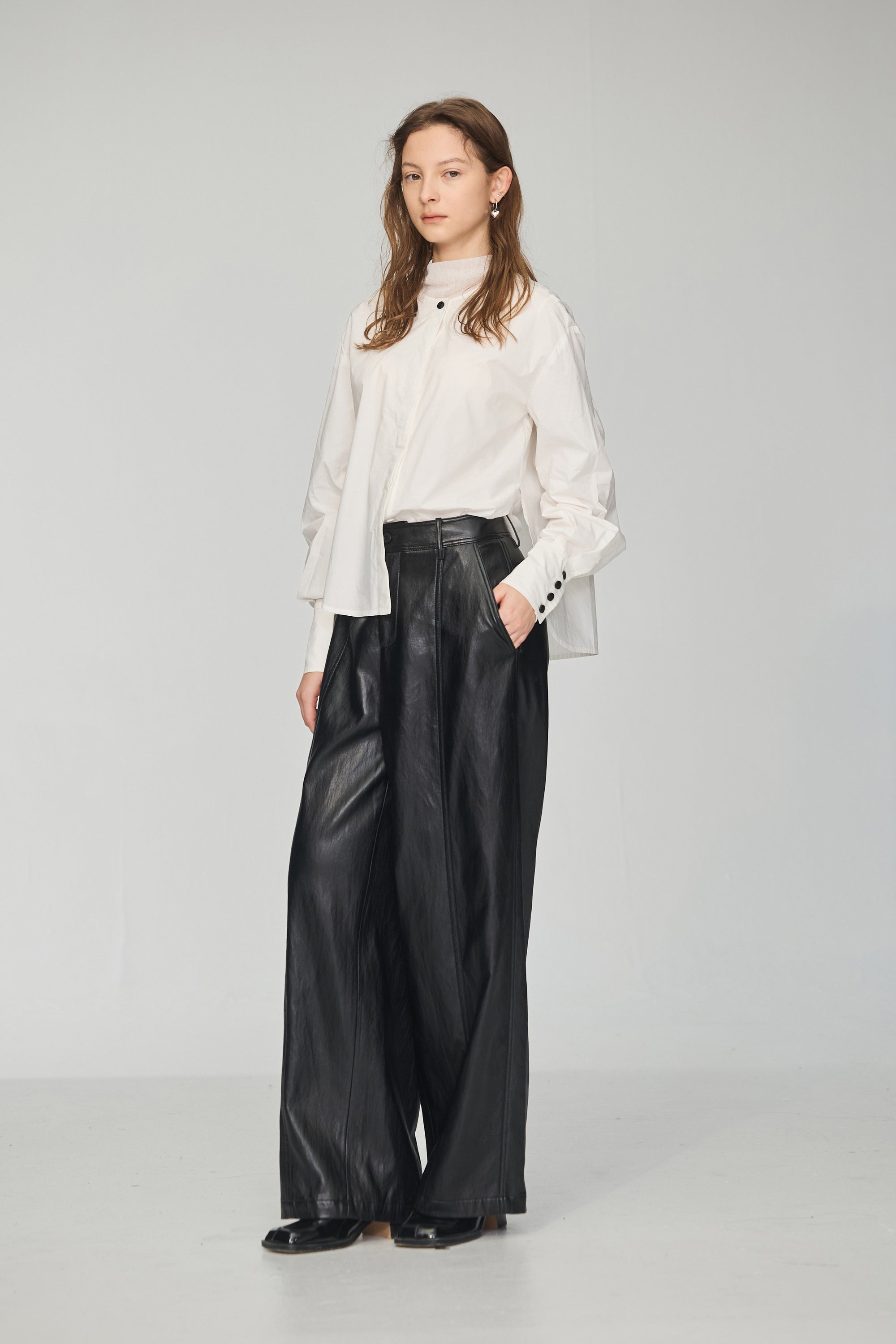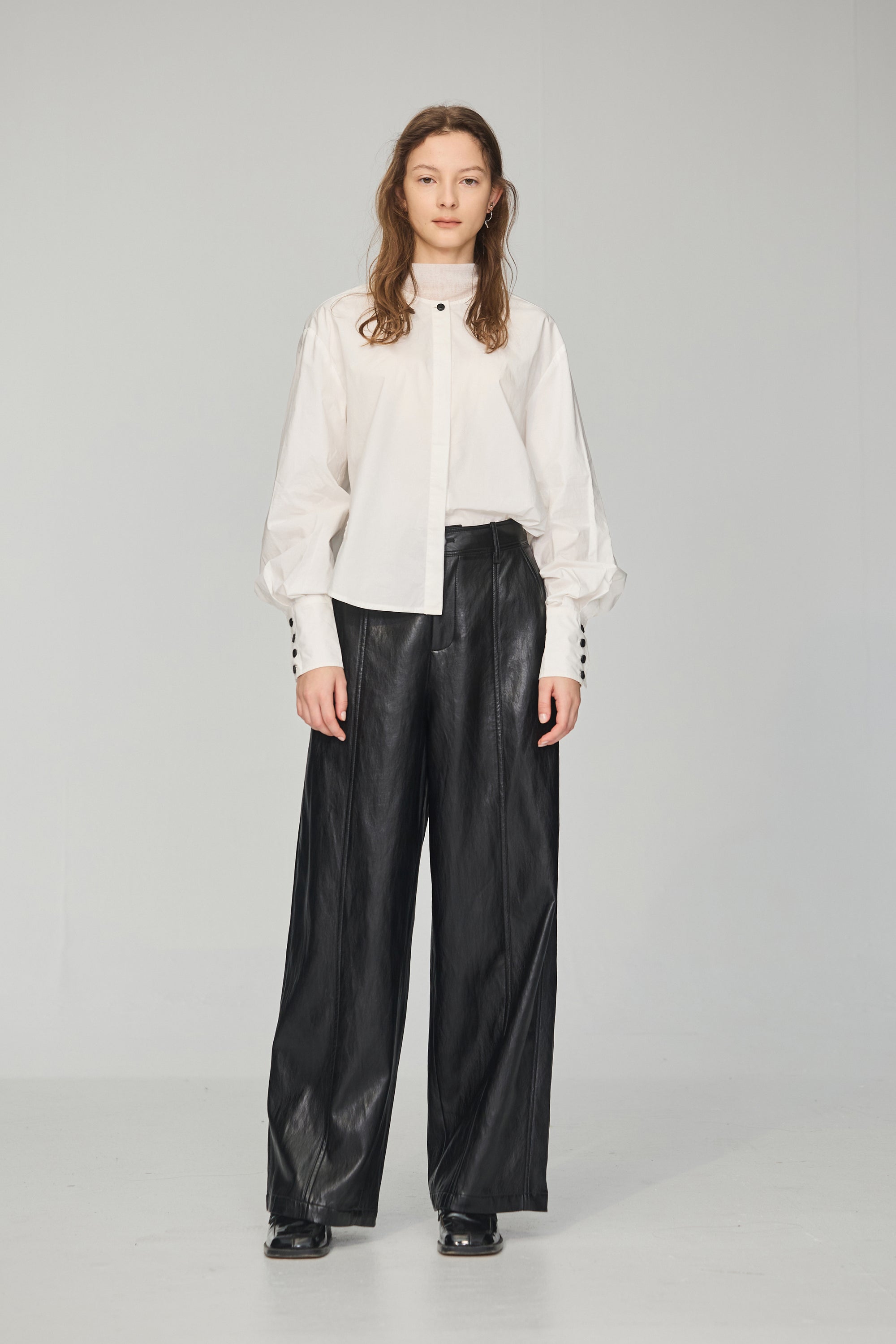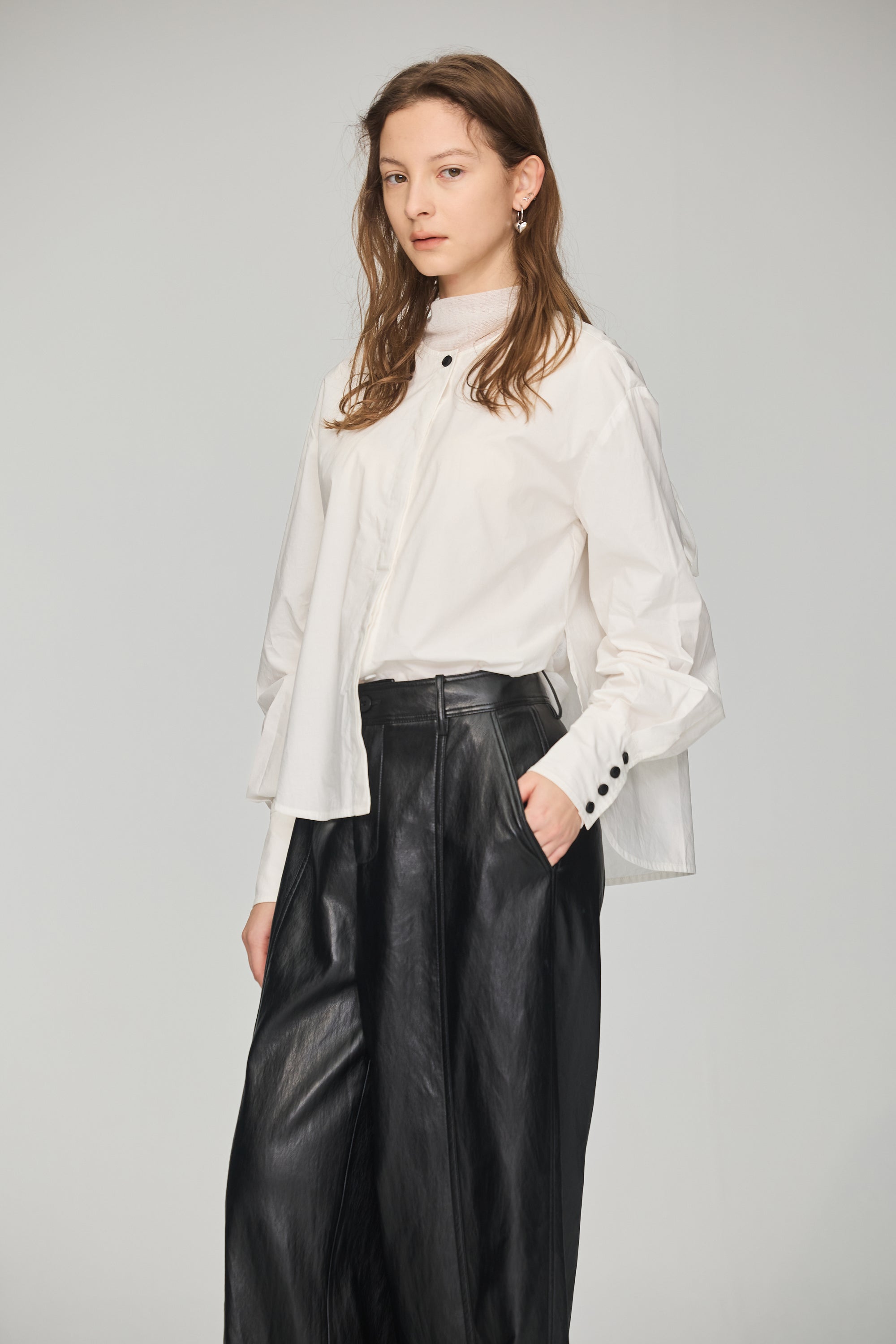 不規則領片車褶收腰襯衫-白