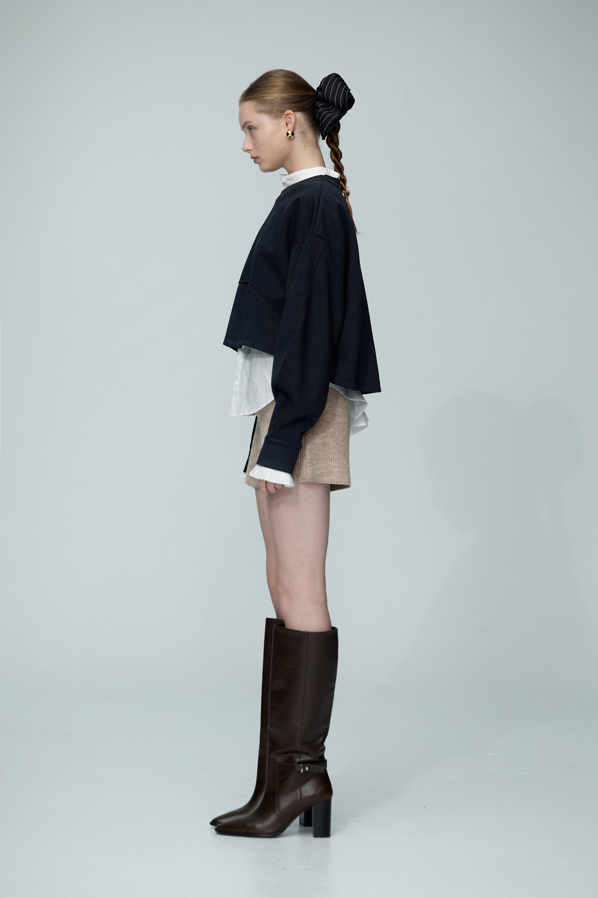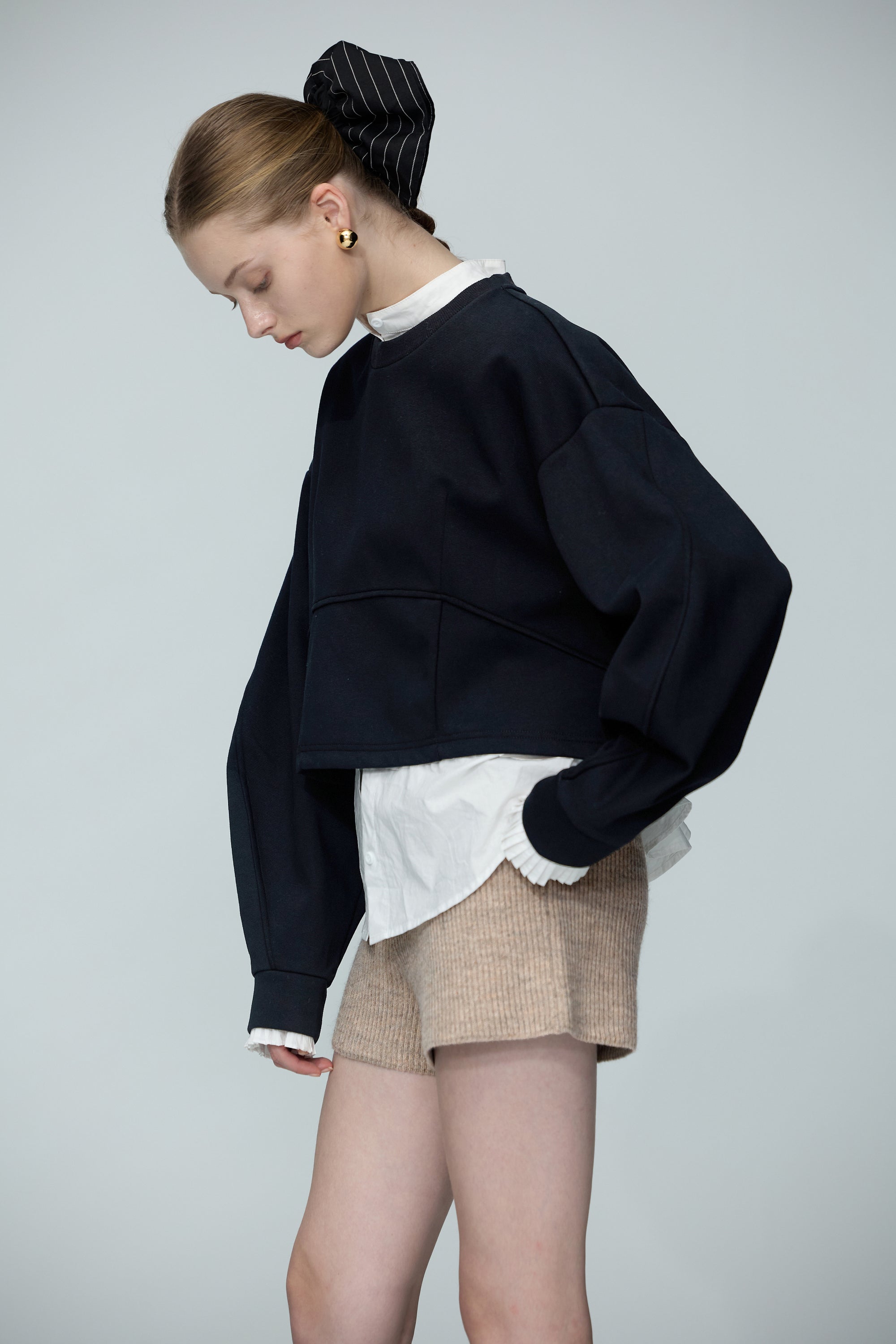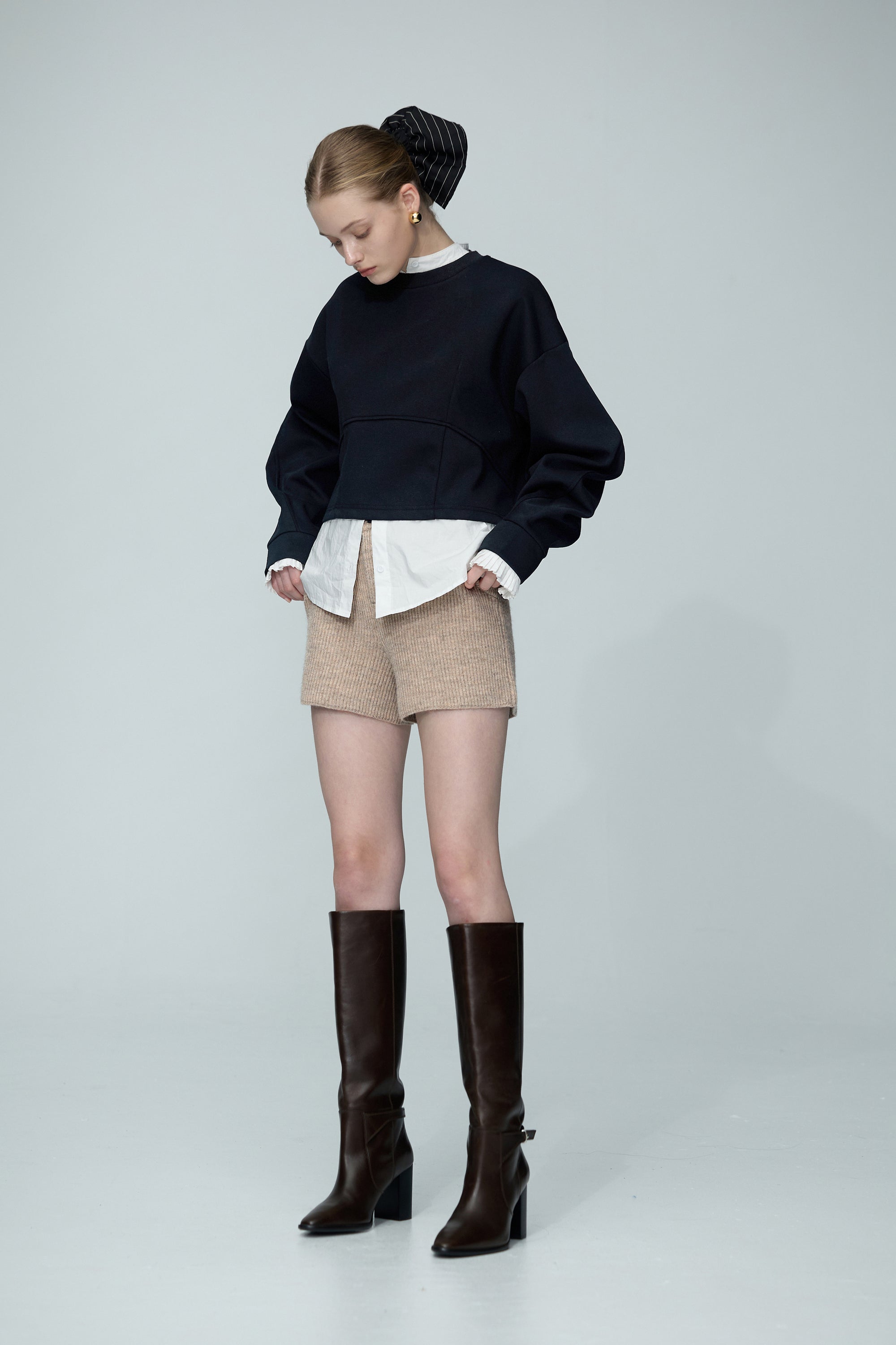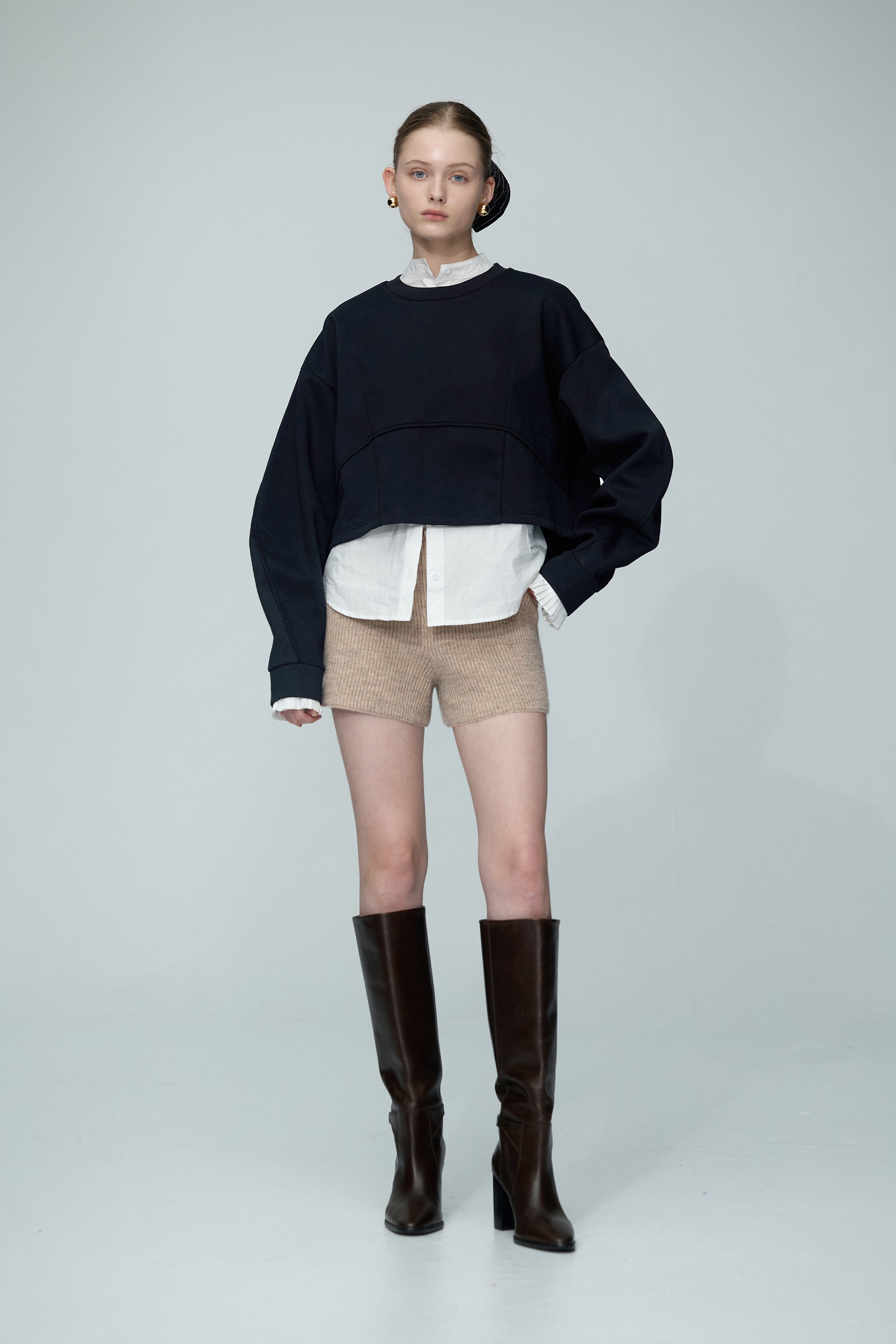 連帽假兩件配色拉鍊收腰上衣-米