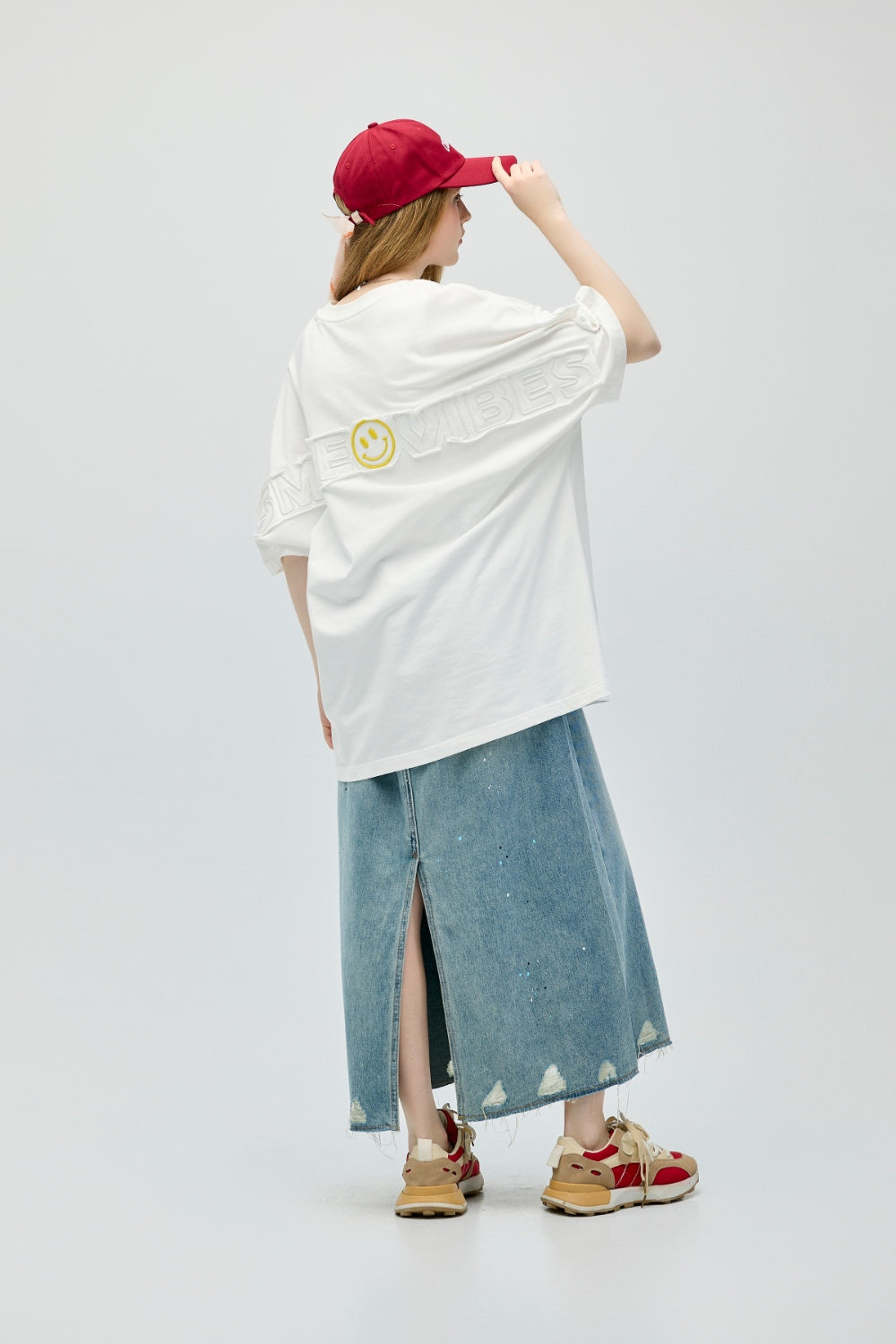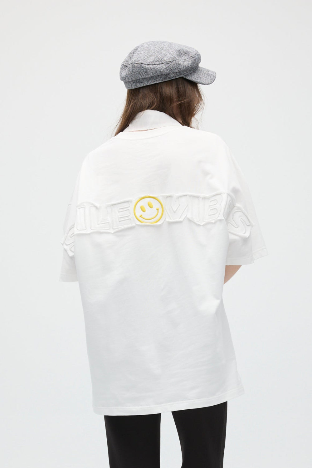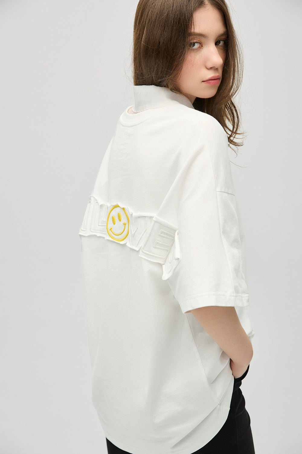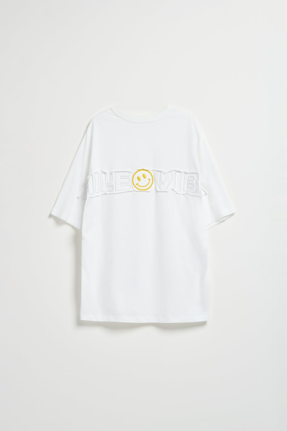 UNISEX寬長版笑臉縫珠TEE上衣-白