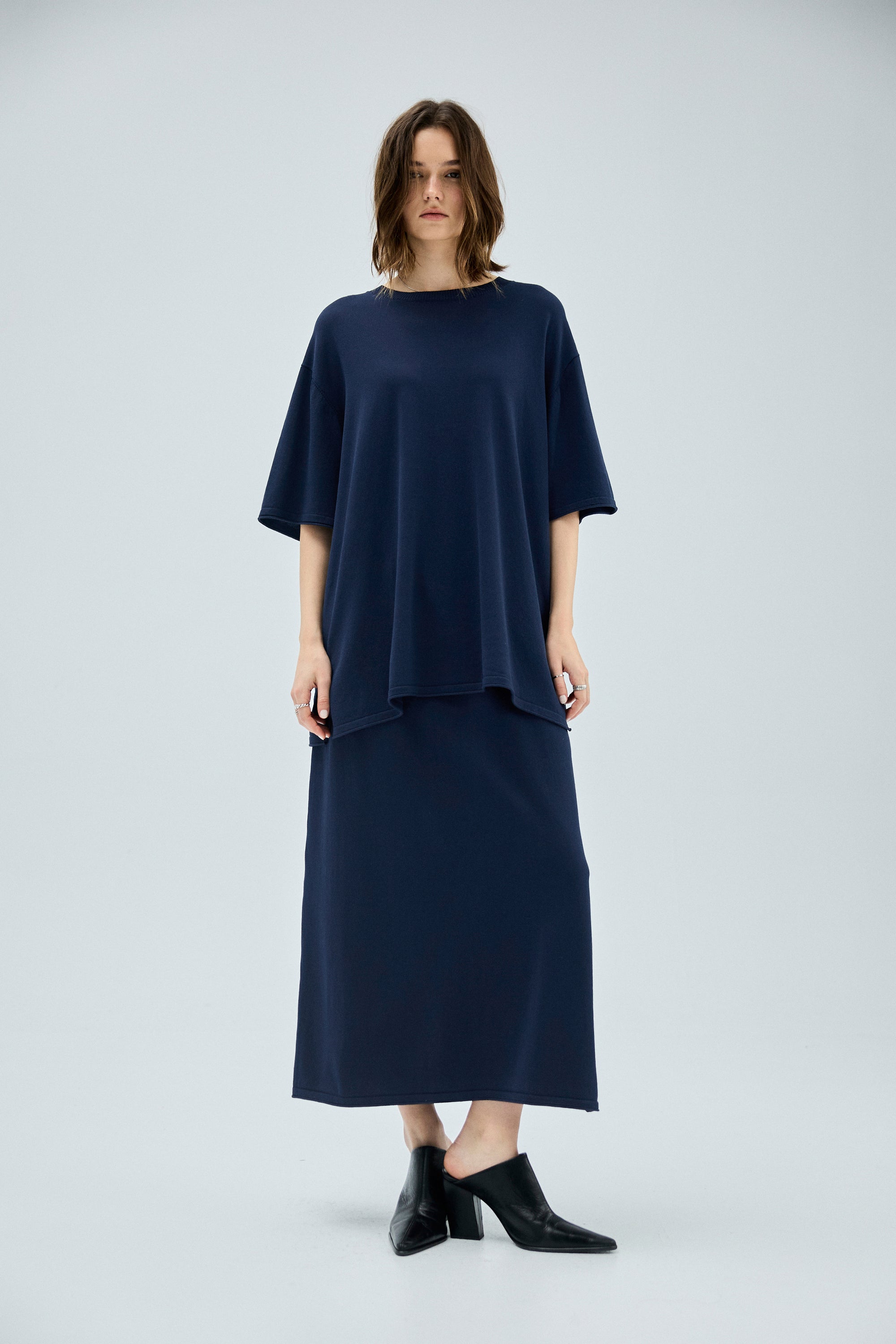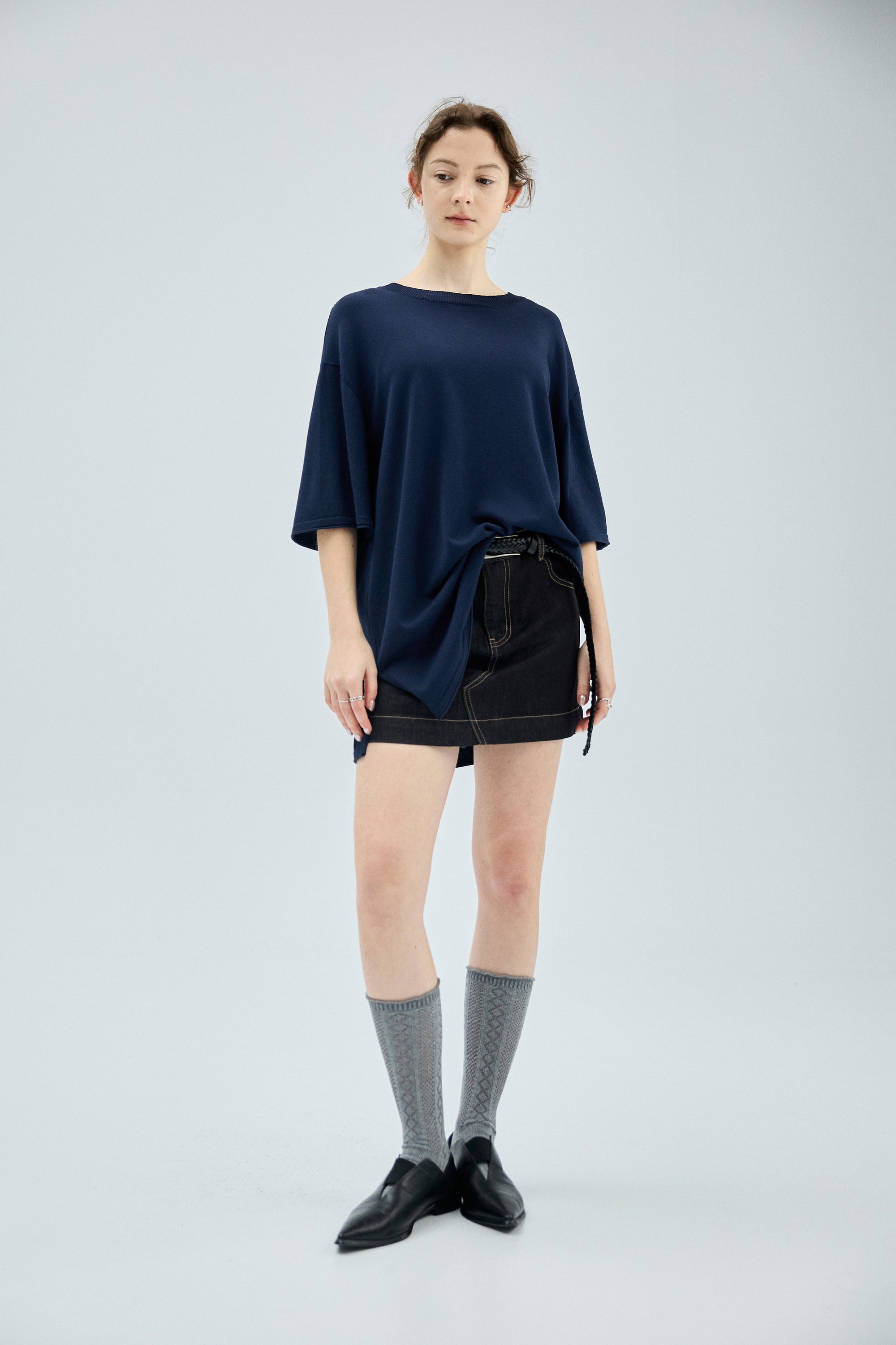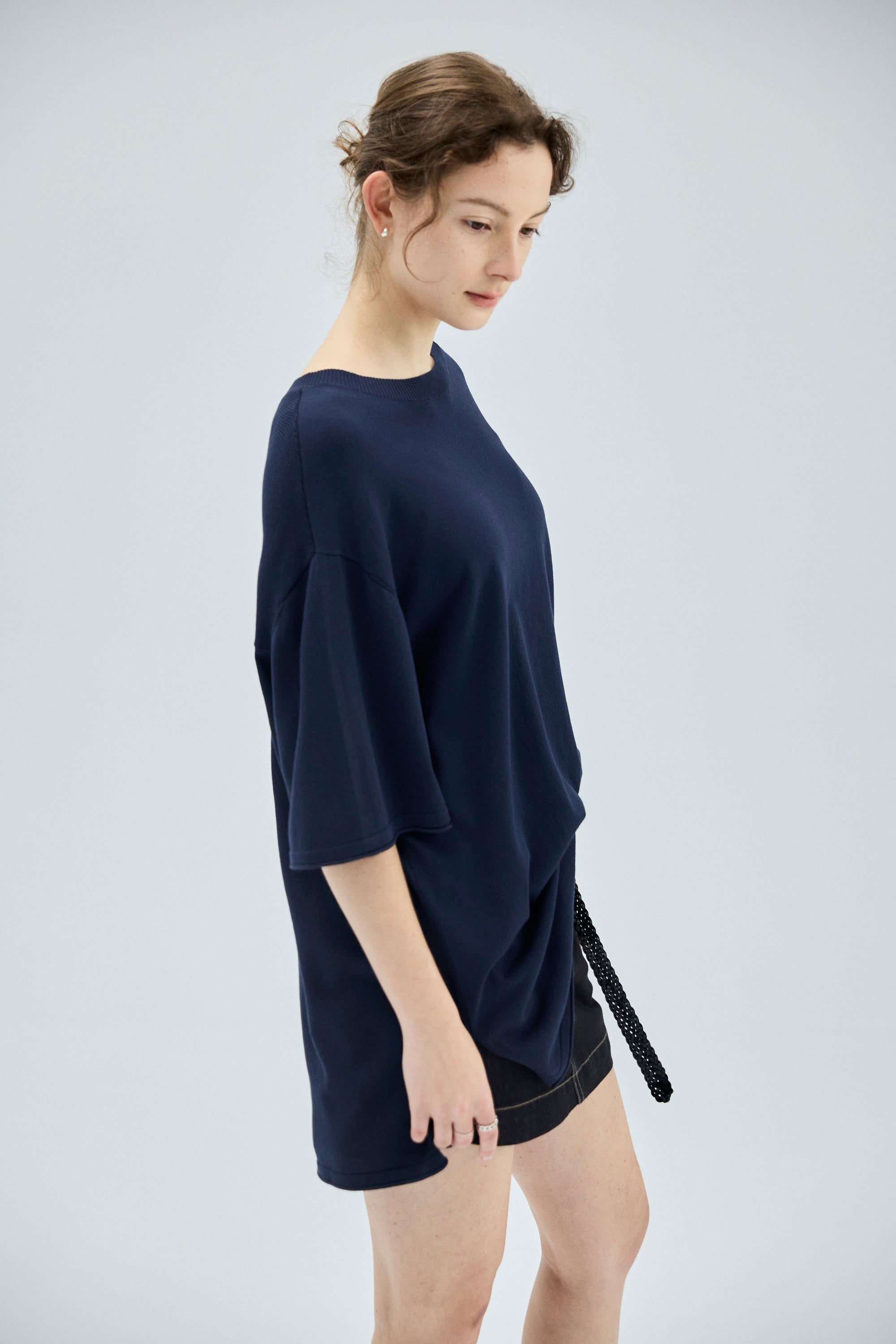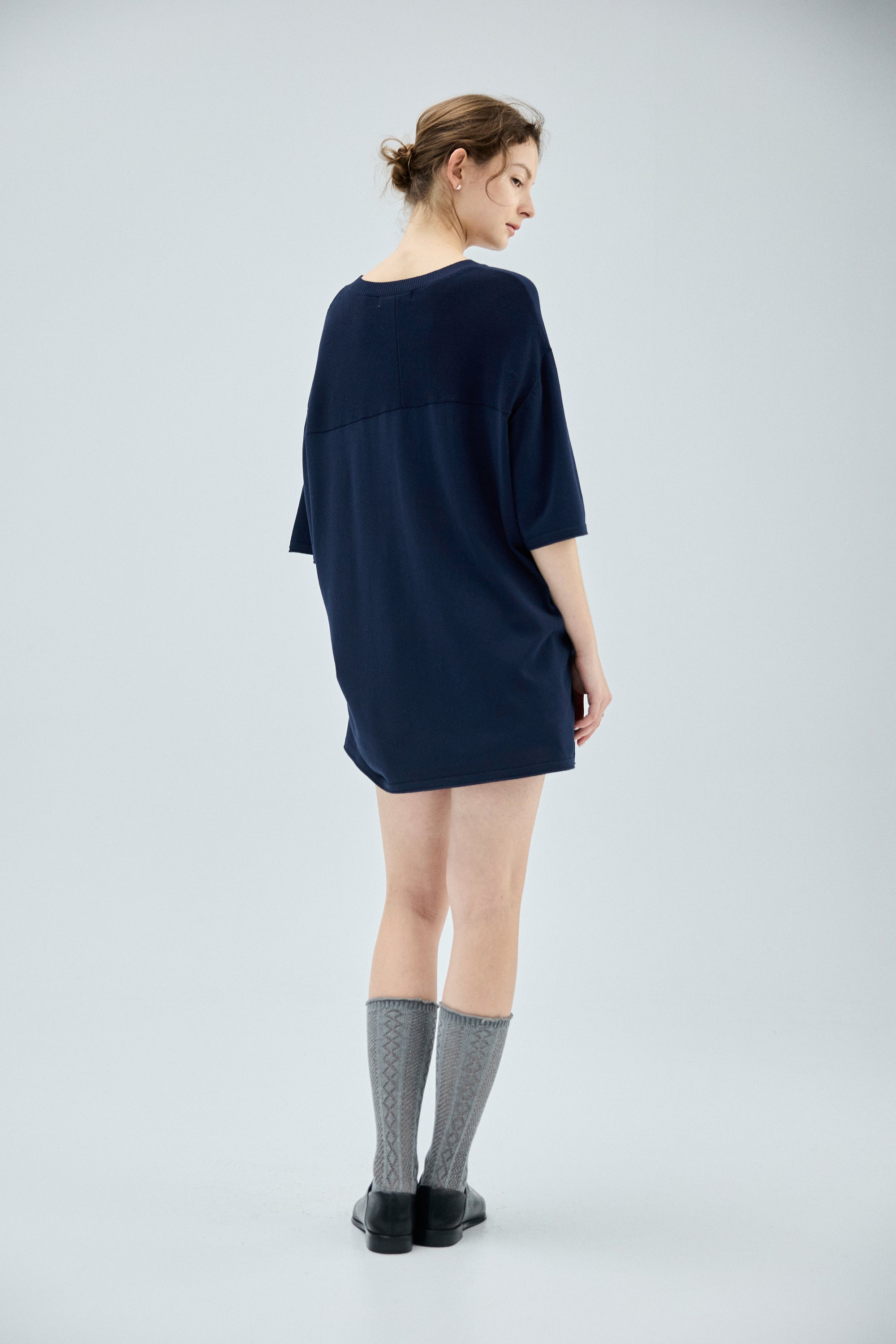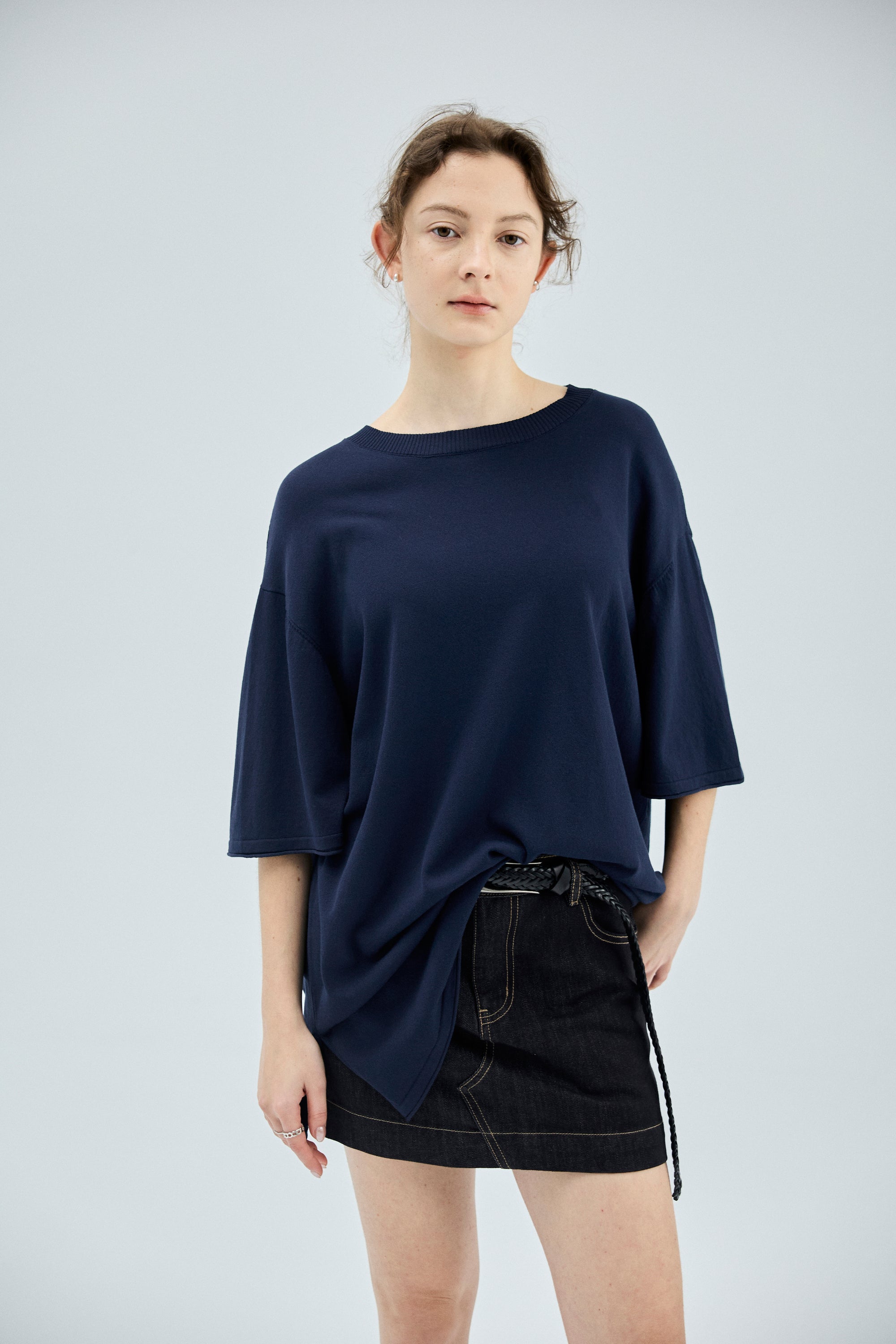 素面捲邊寬鬆長版針織五分袖上衣-藍色