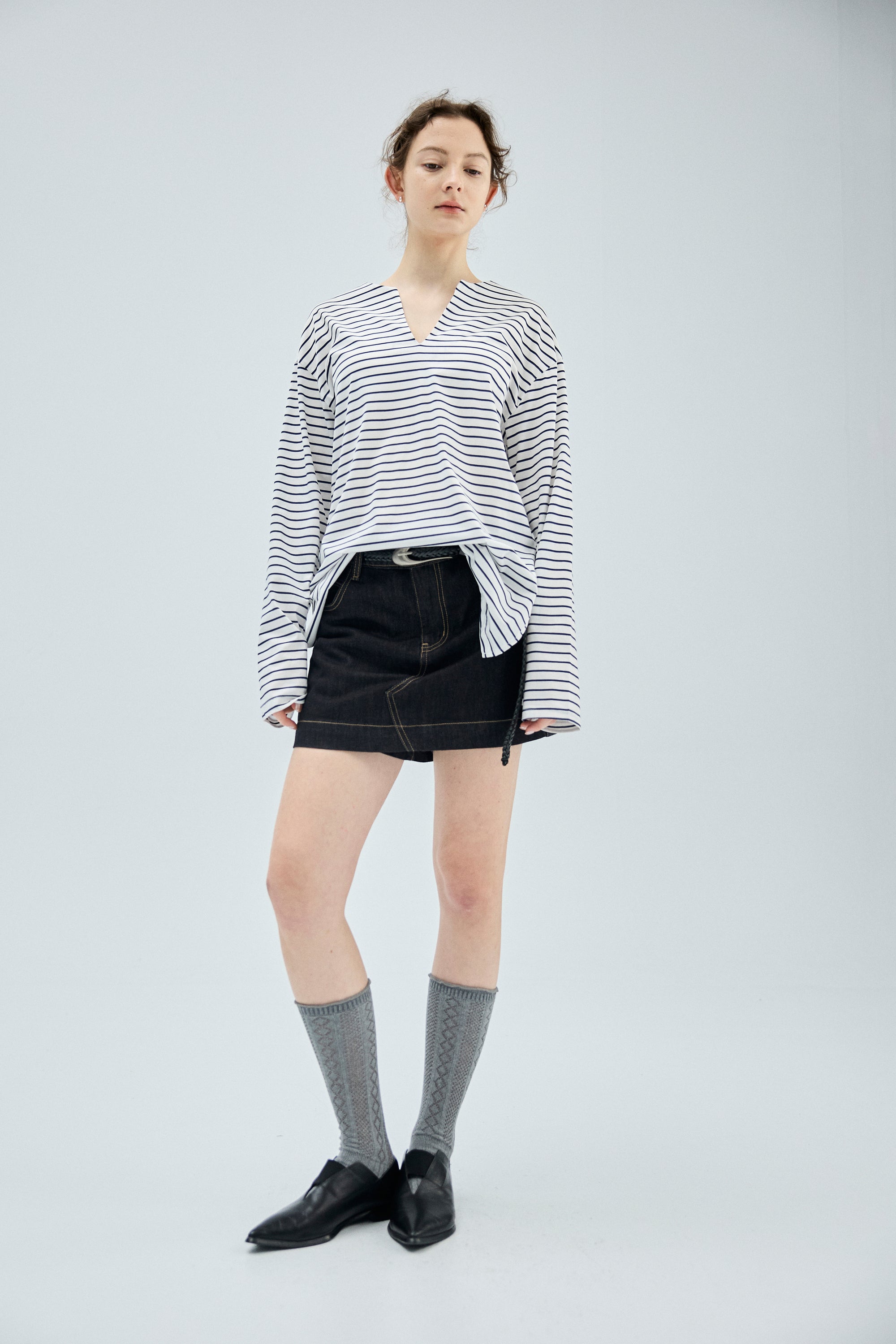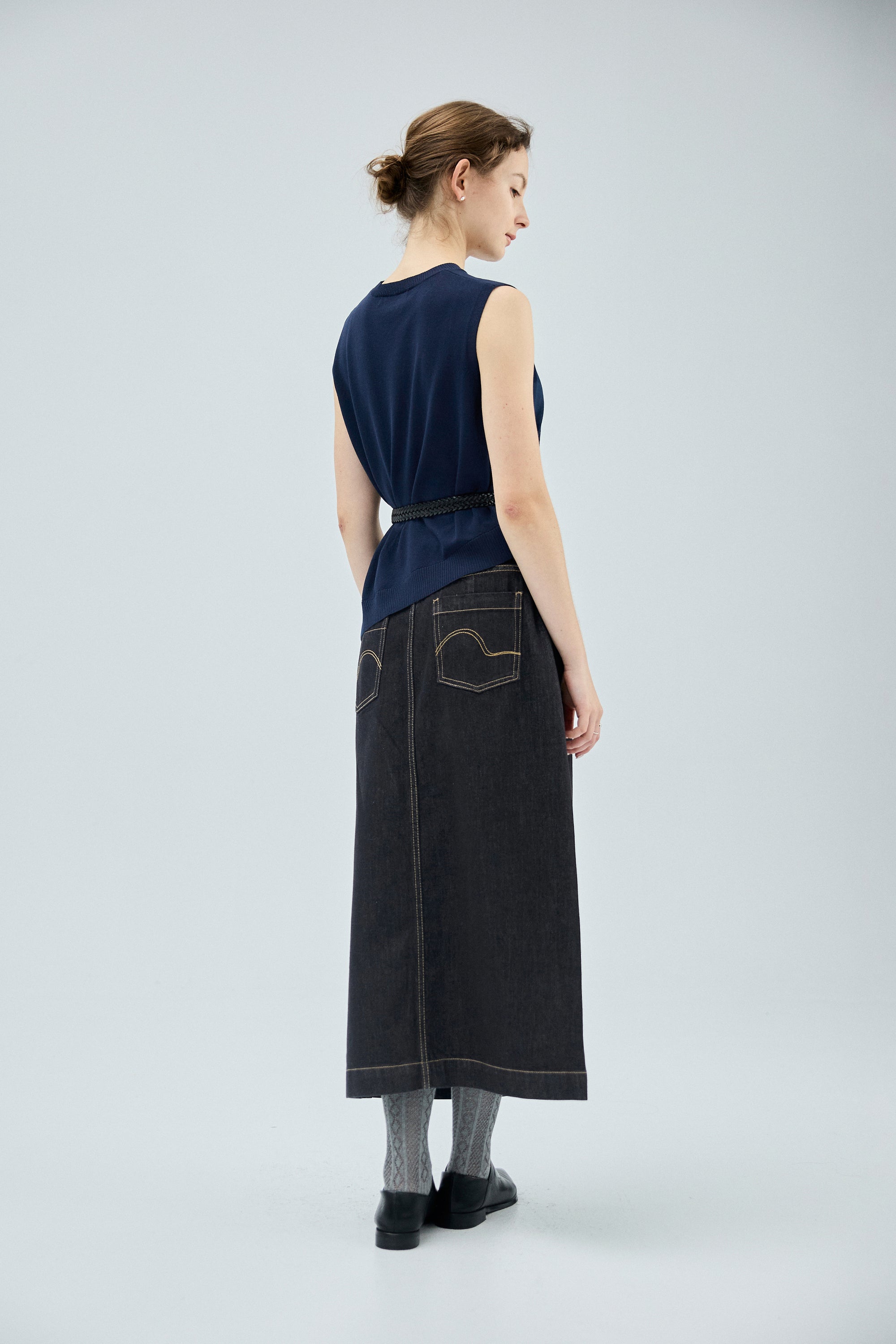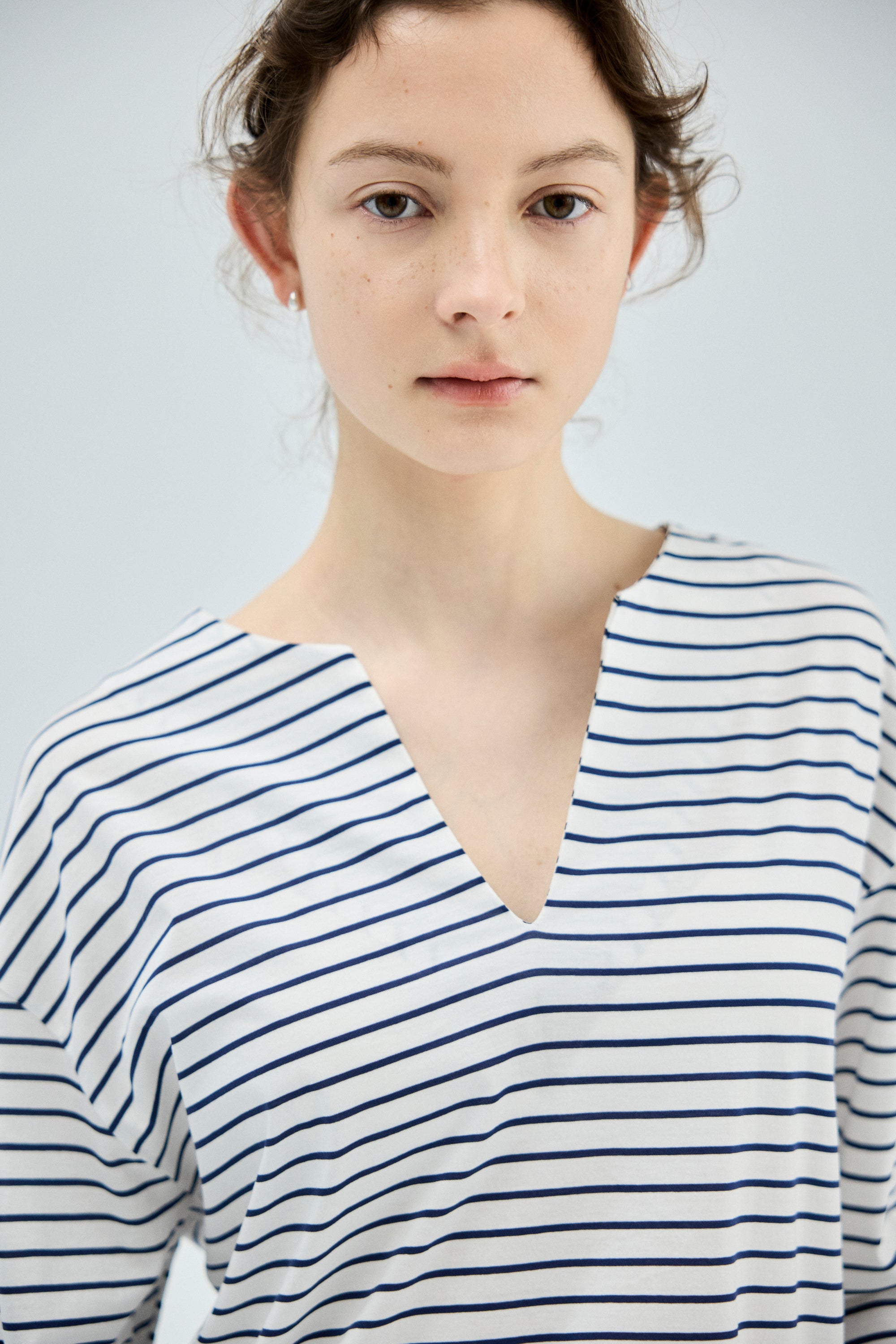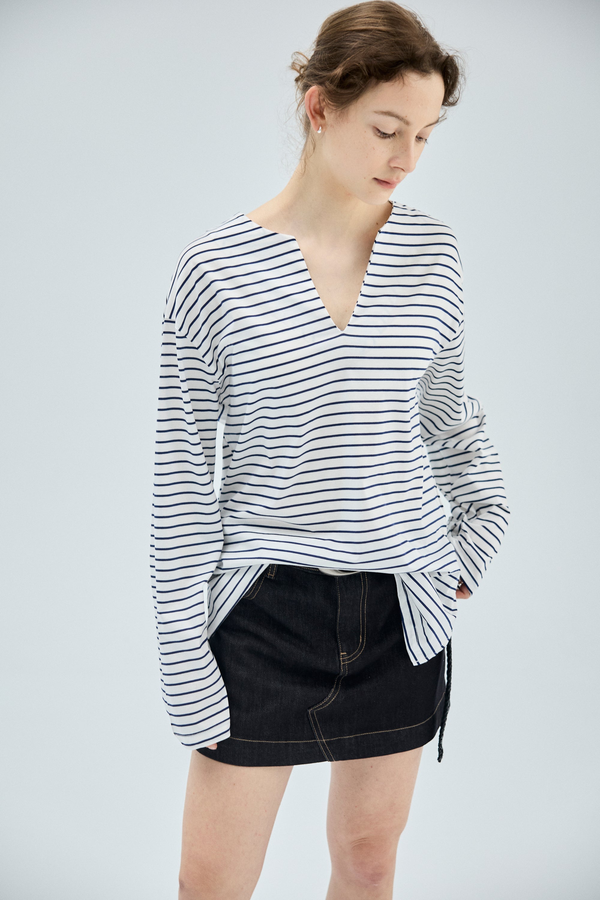 假兩件柔霧萊賽爾針織長袖上衣-藏青