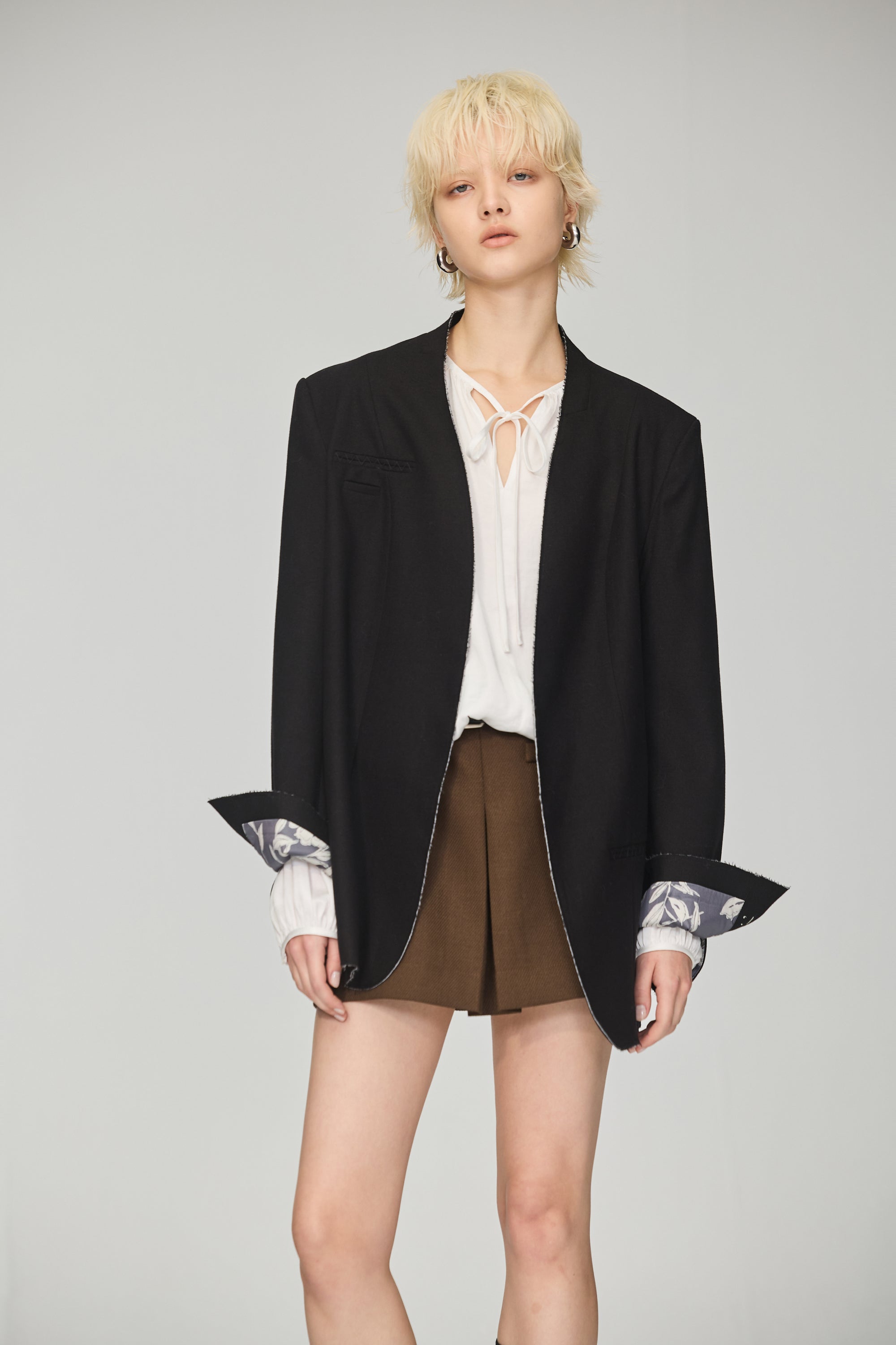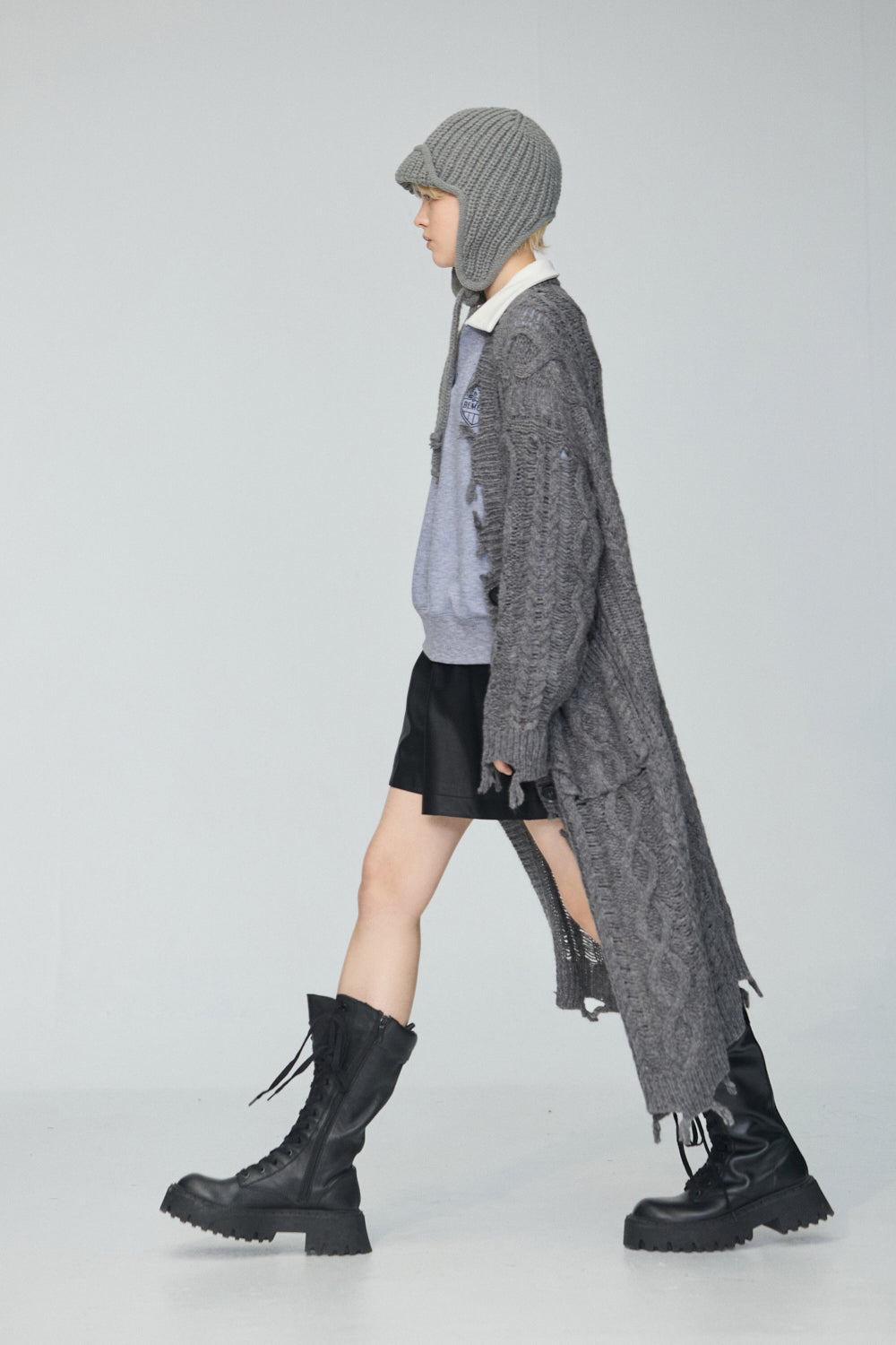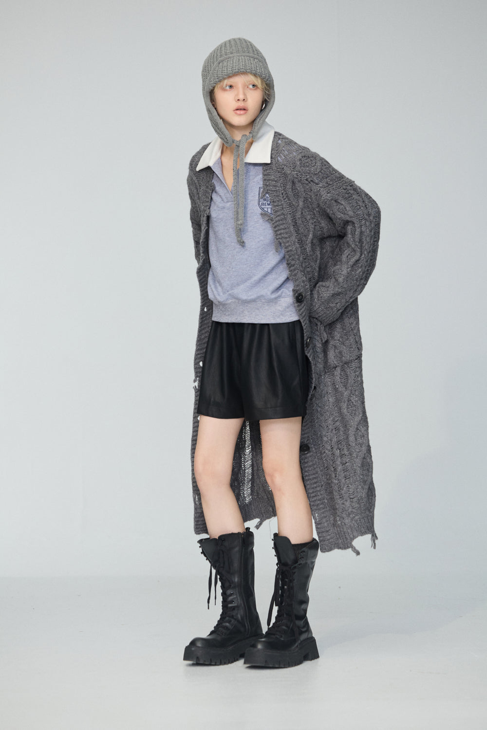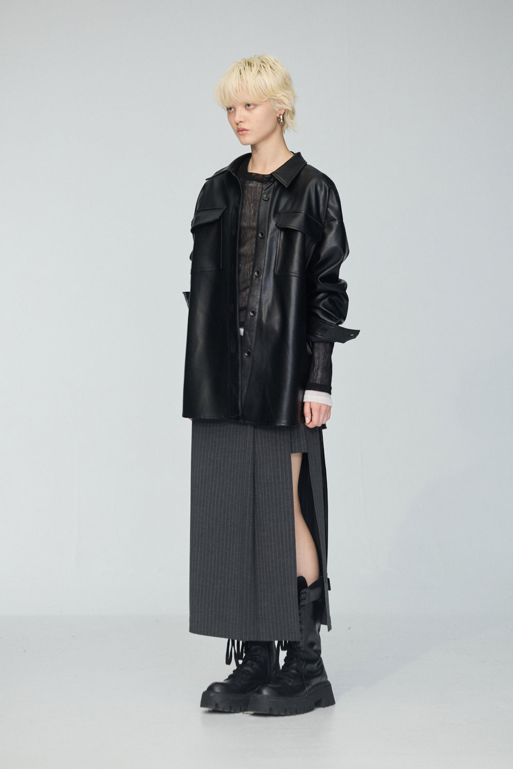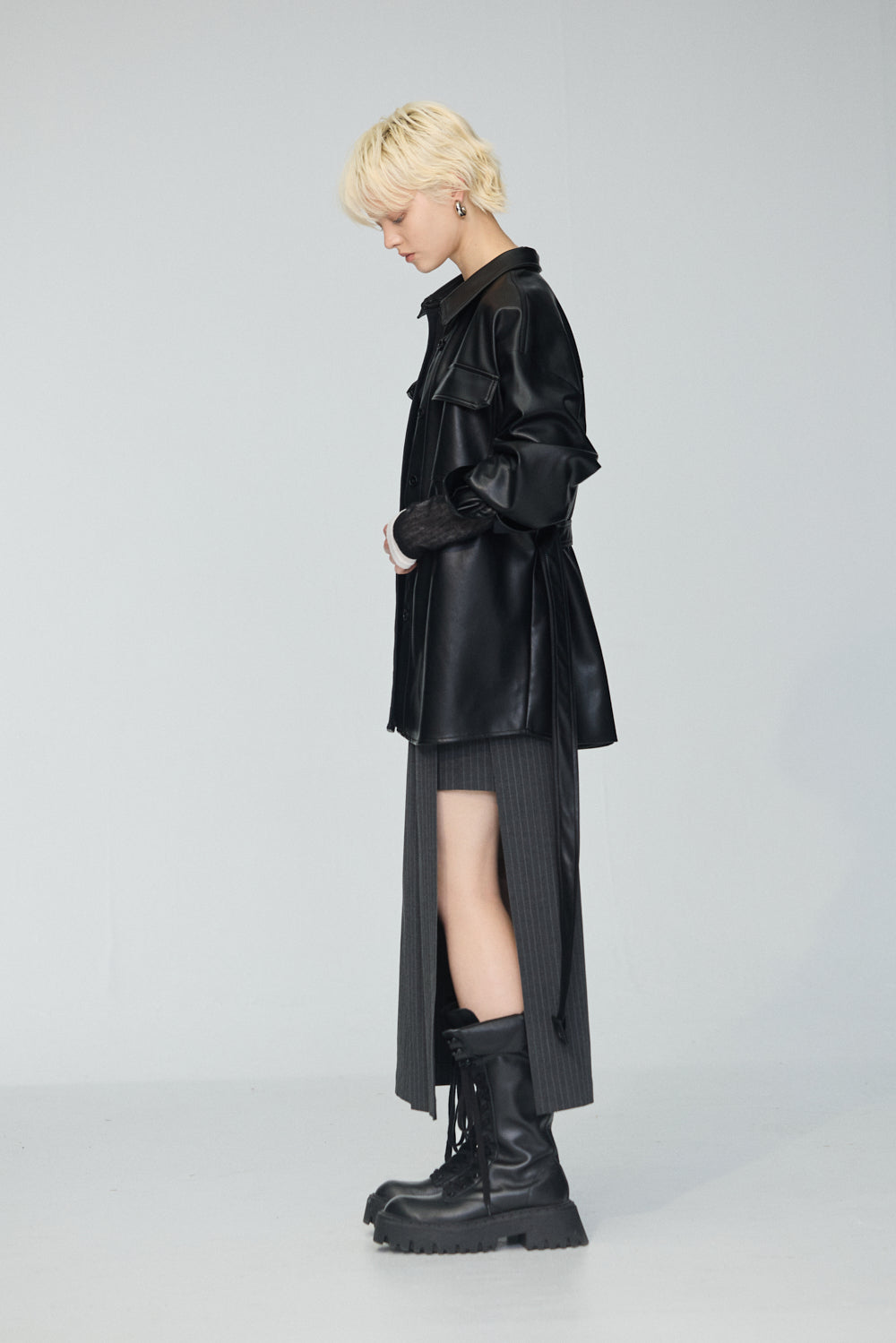 下襬抽繩立領皮革外套-灰