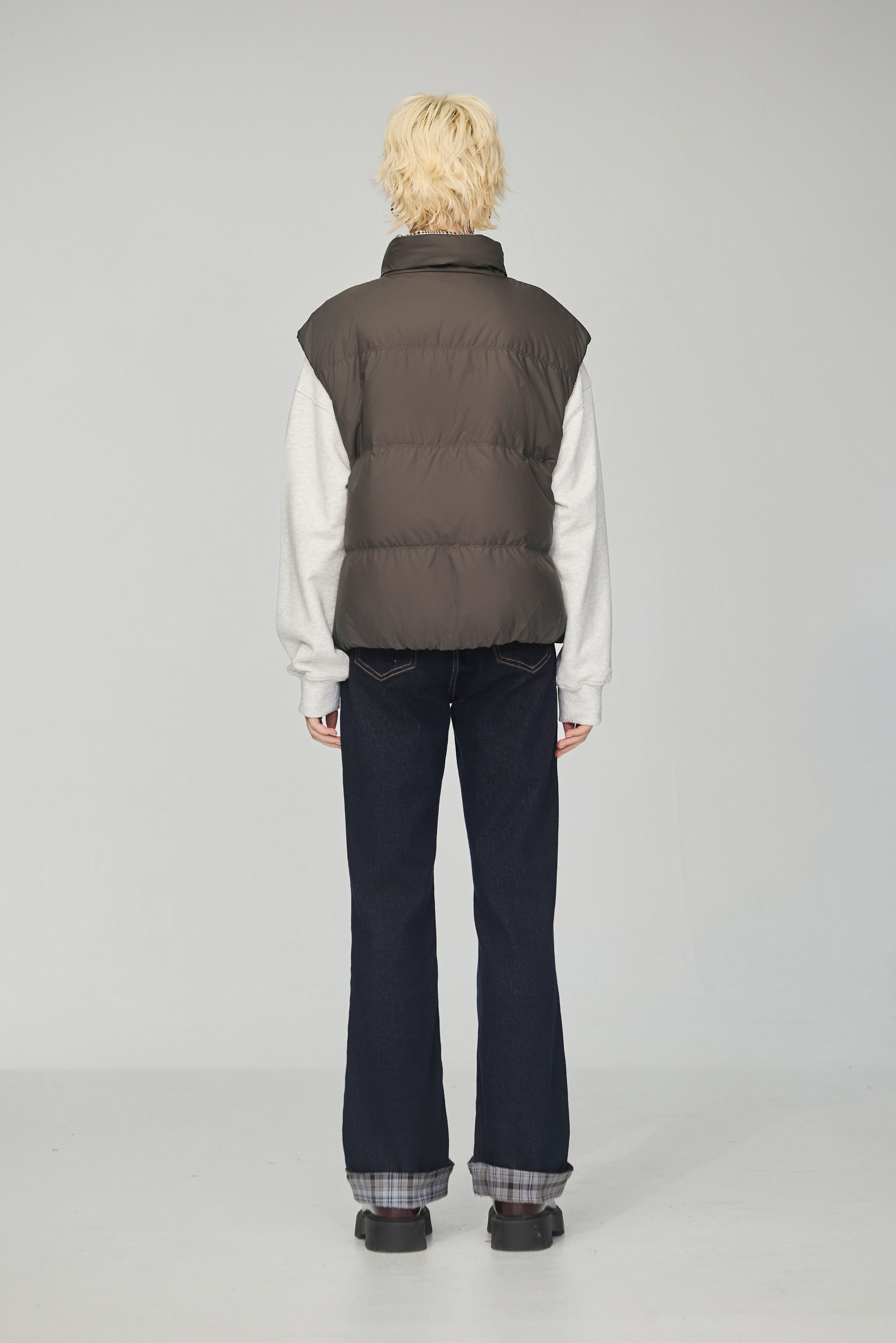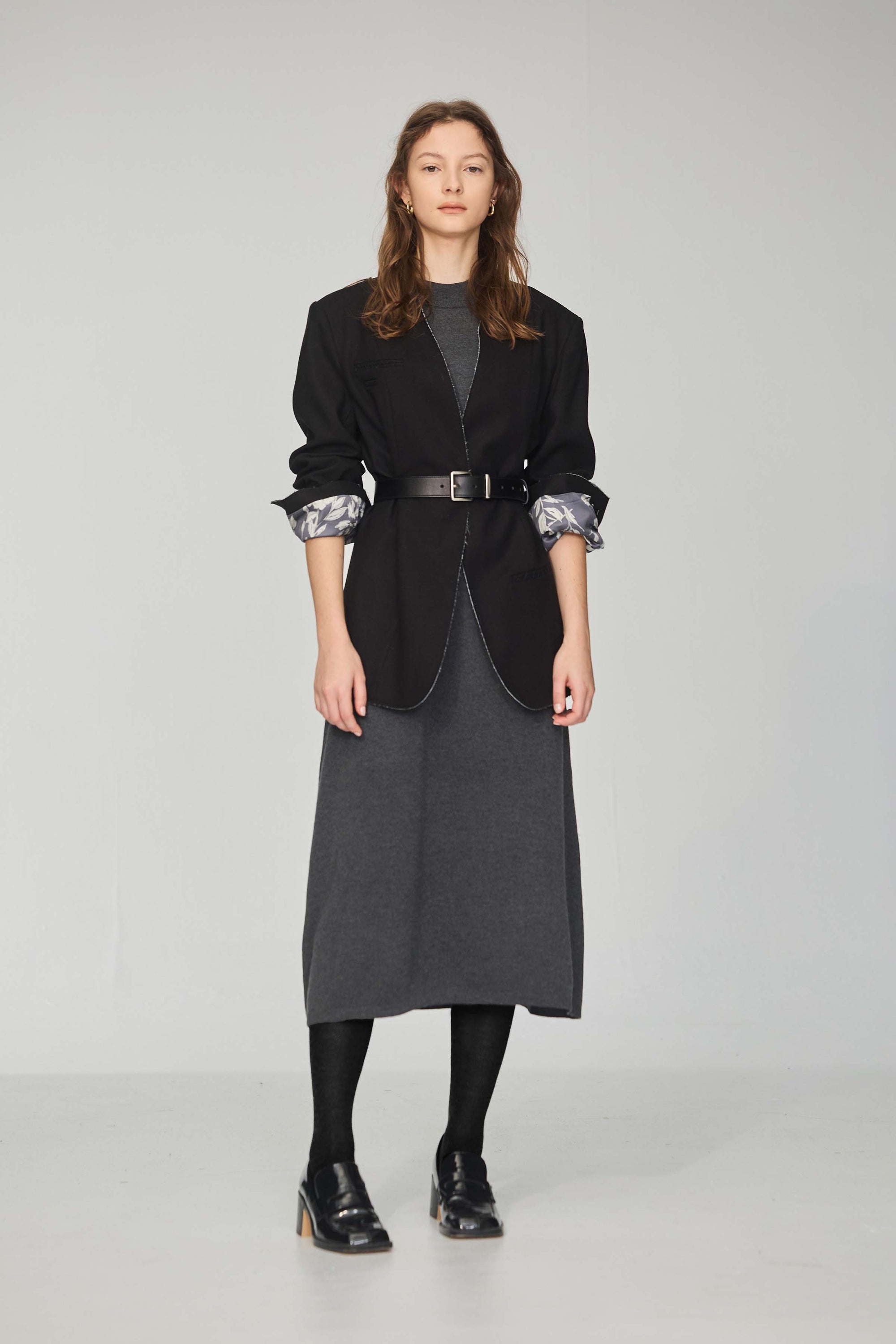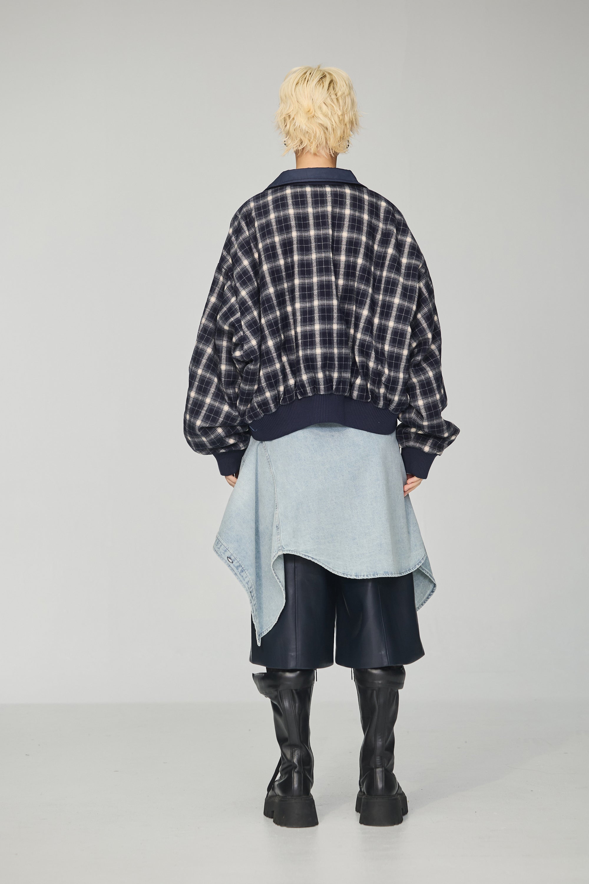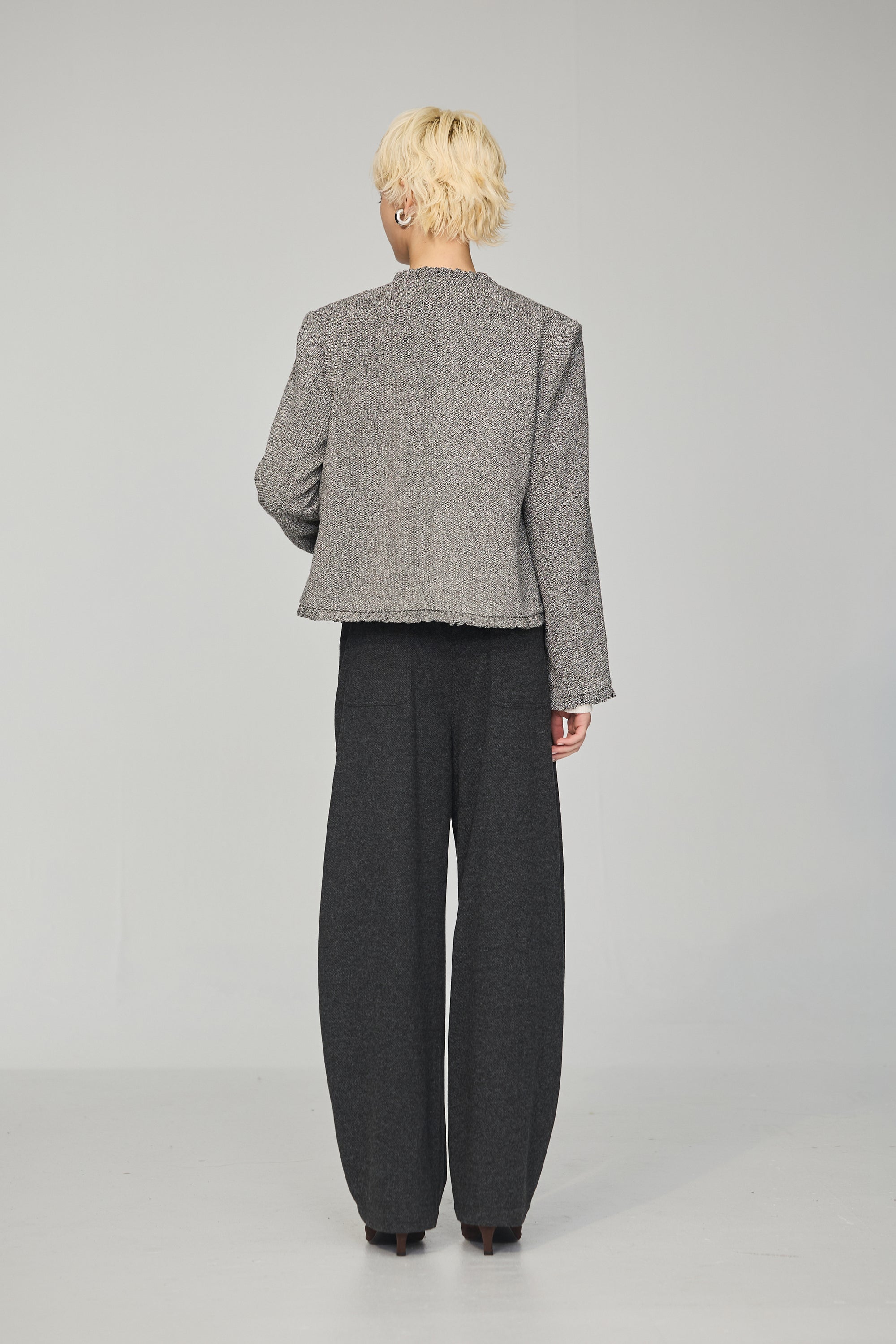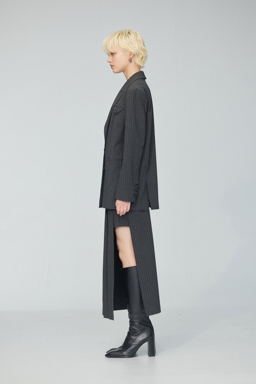 下襬抽繩立領皮革外套-灰