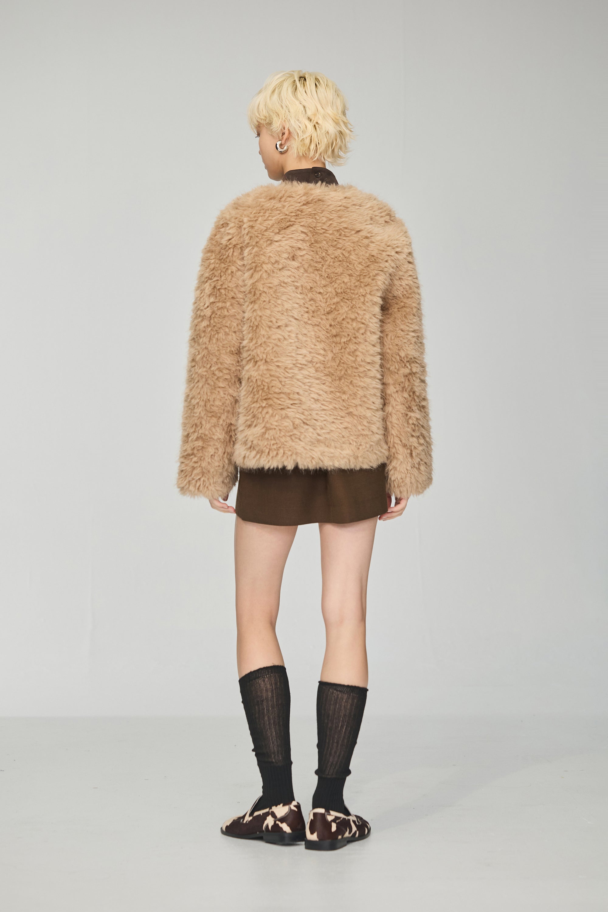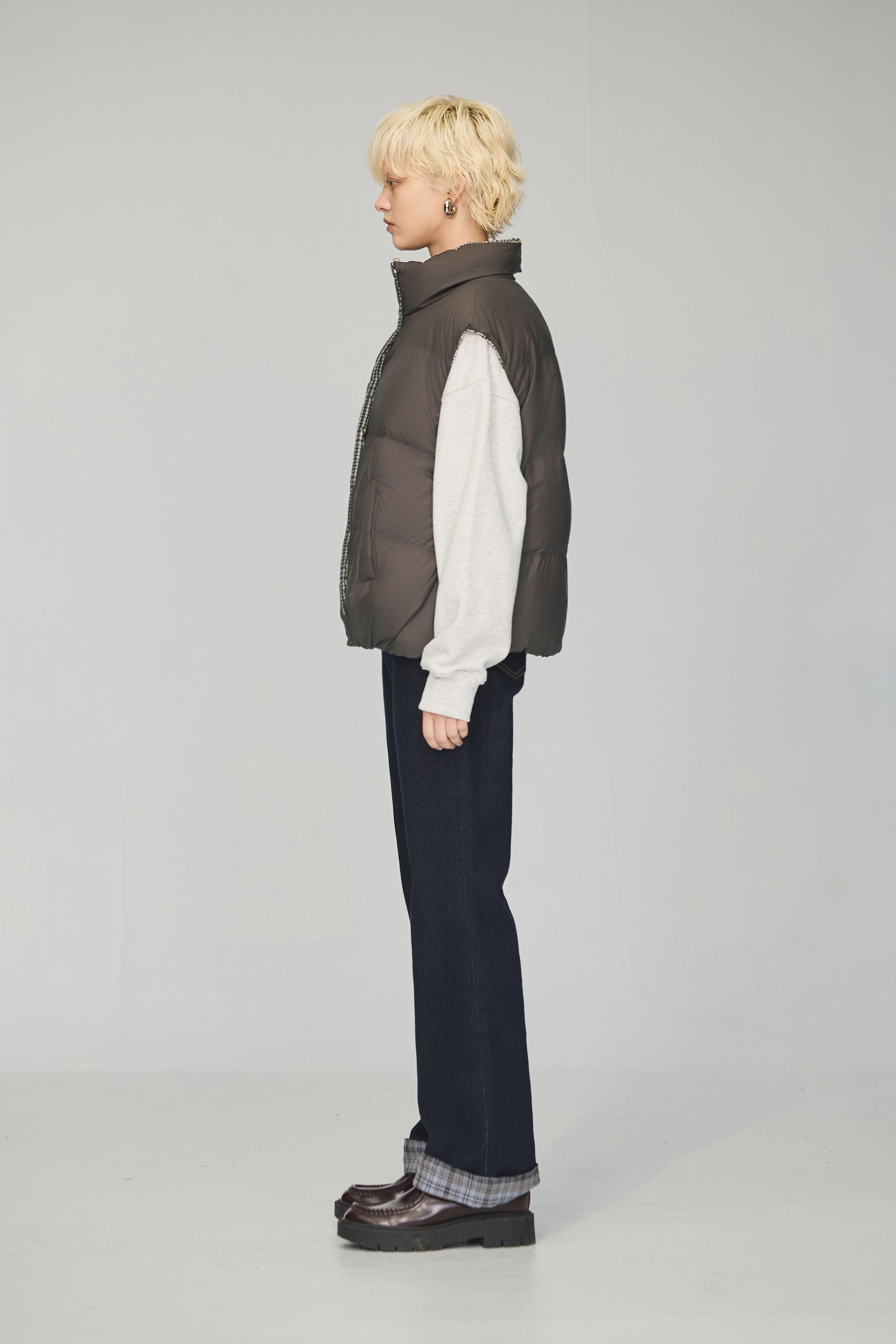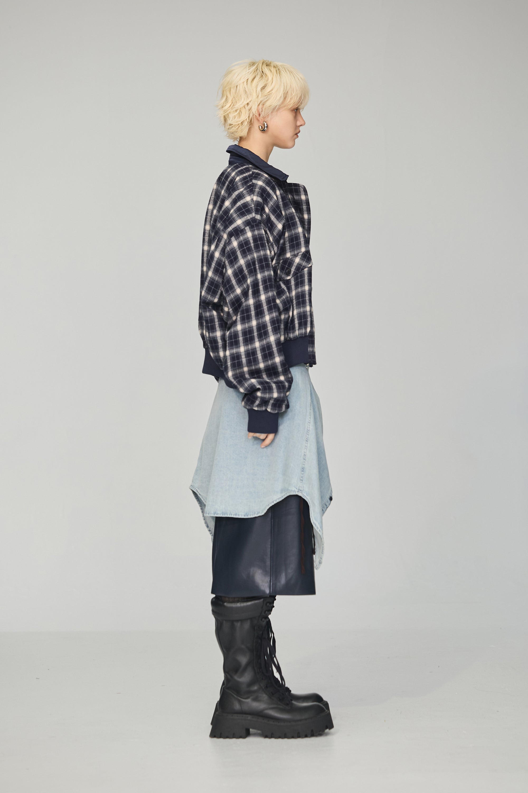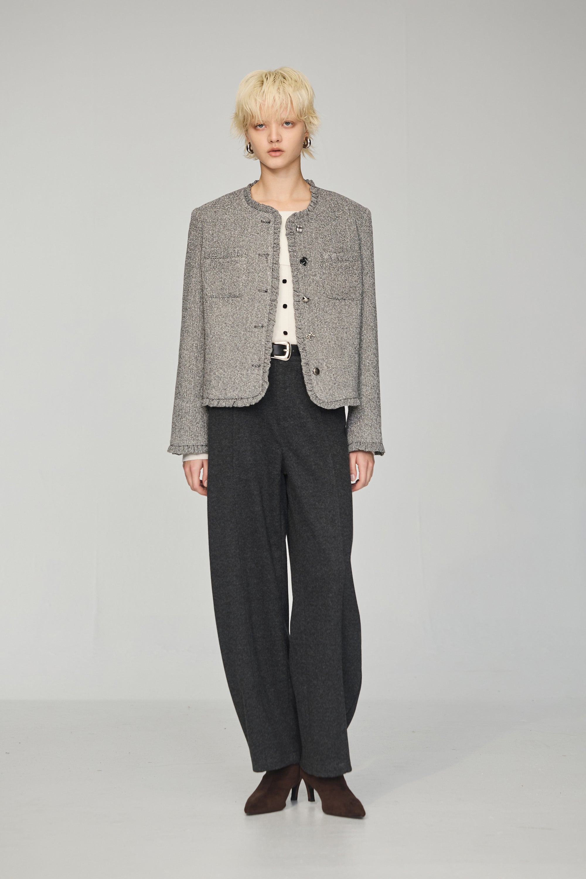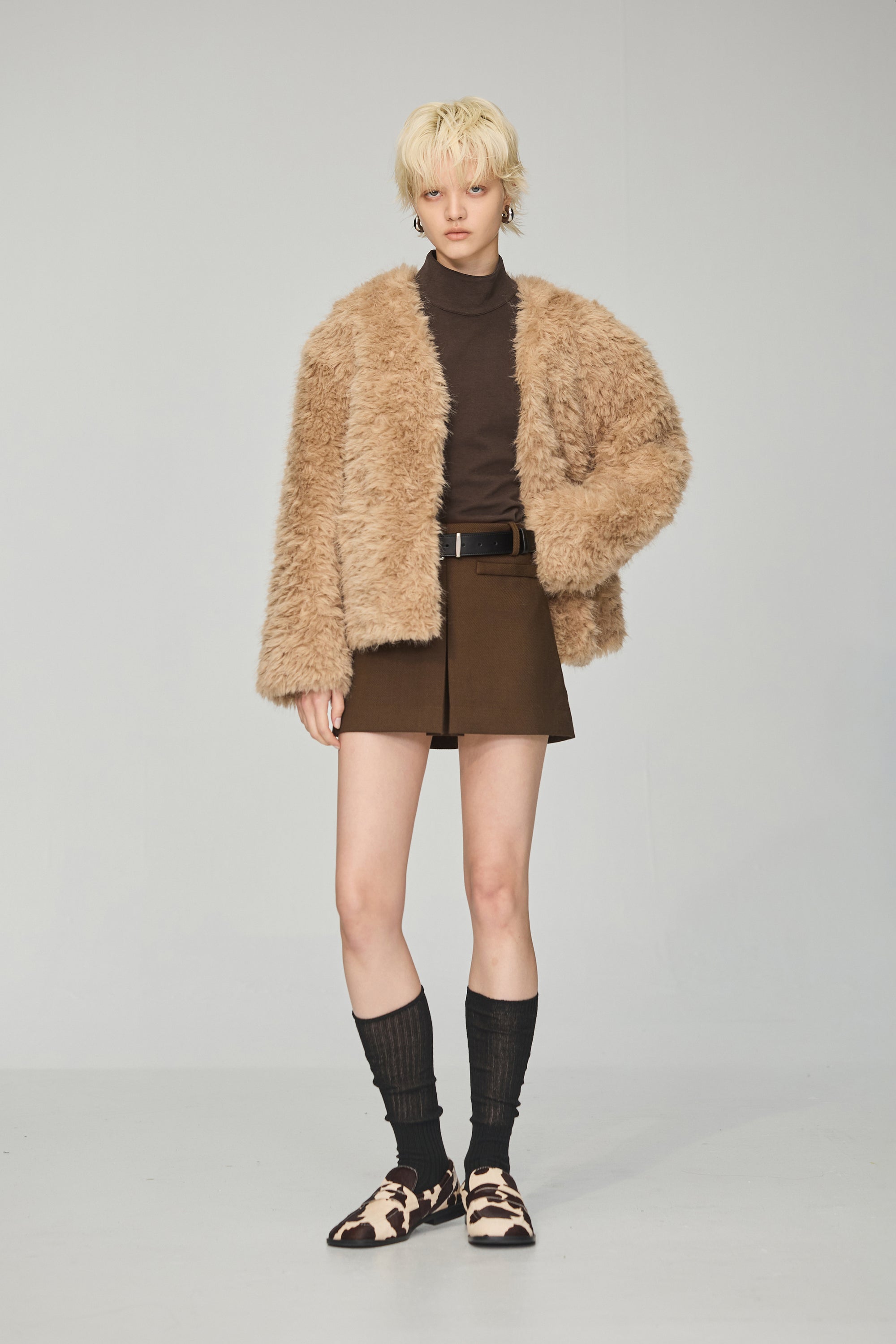 下襬抽繩立領皮革外套-灰