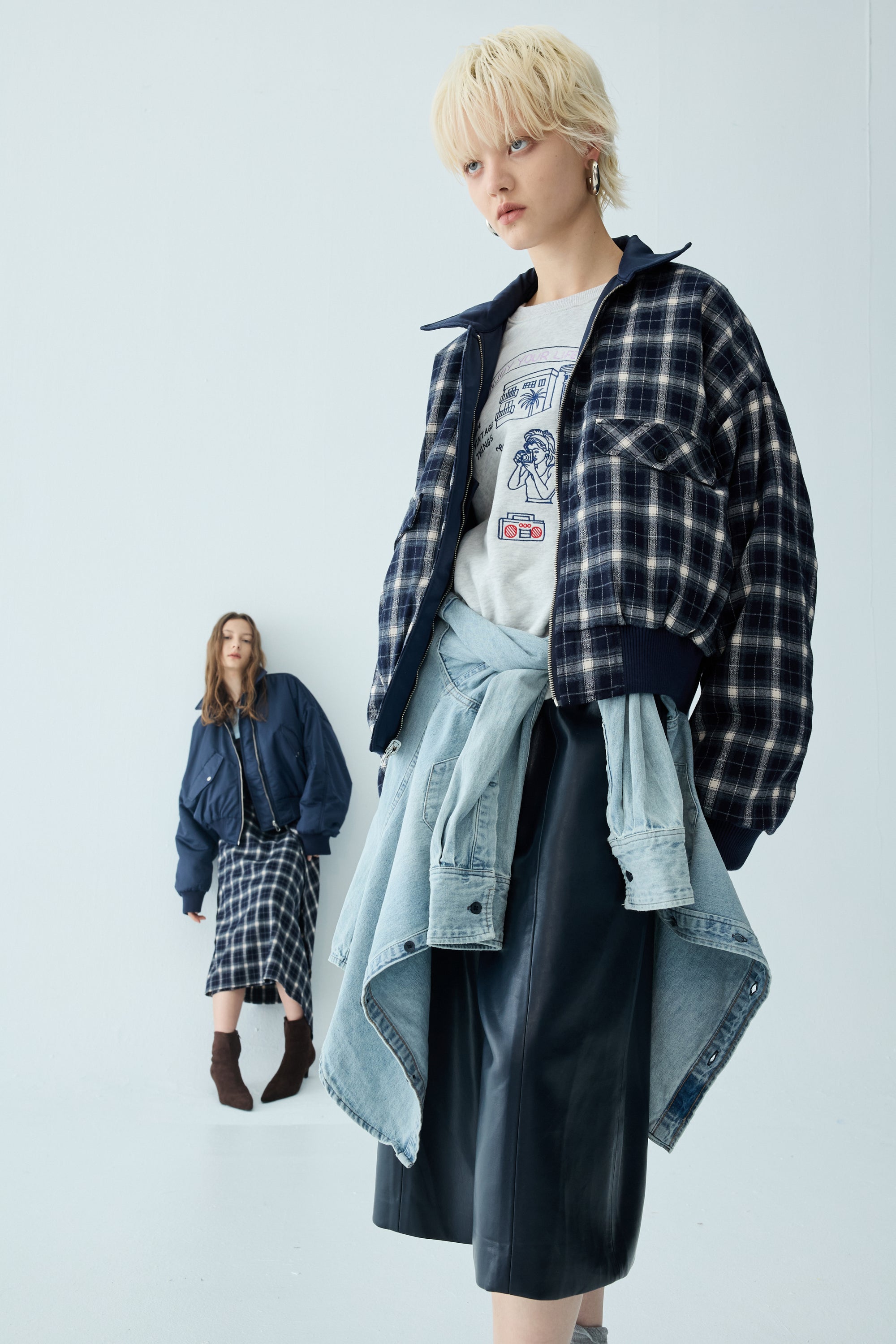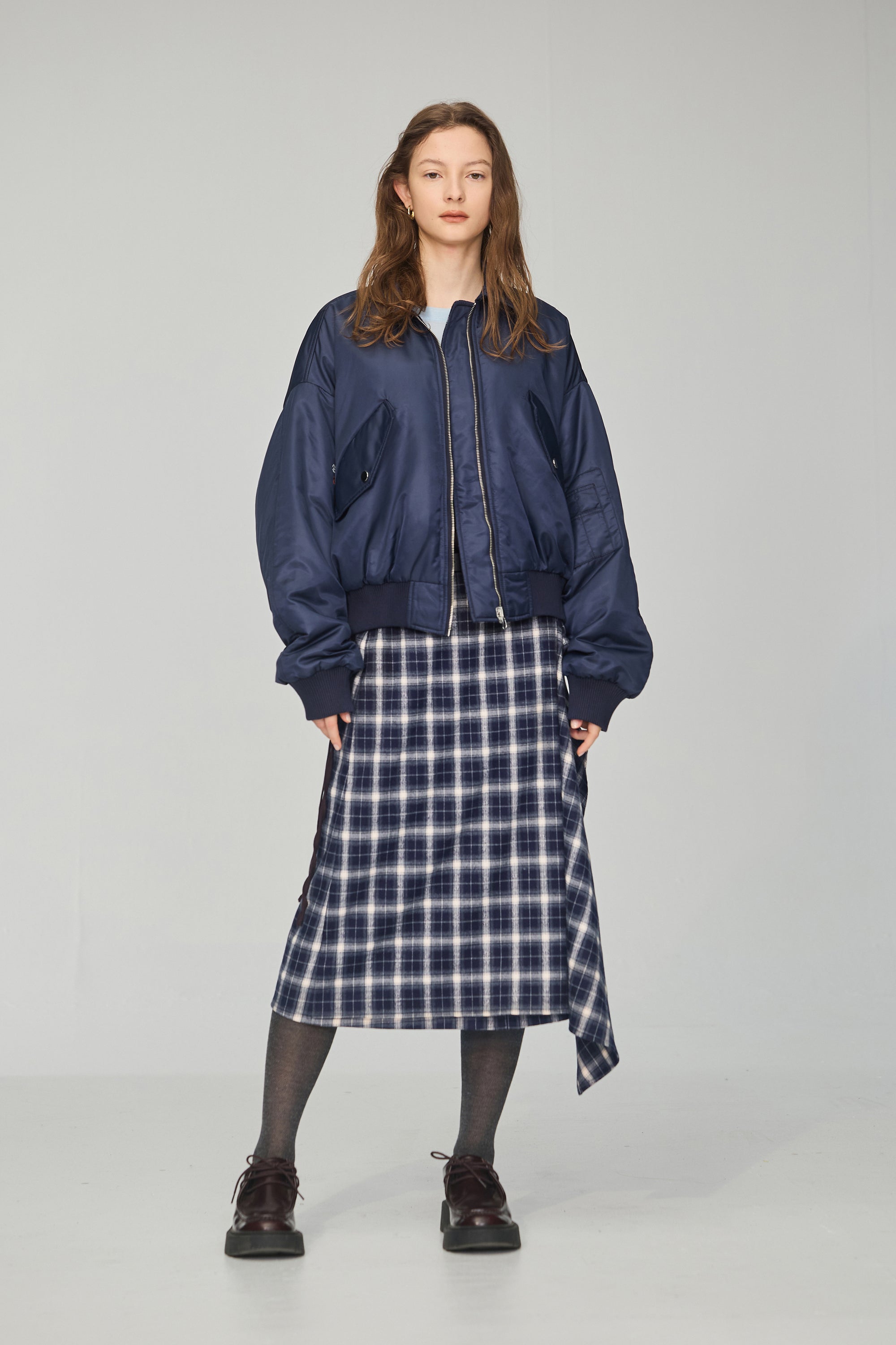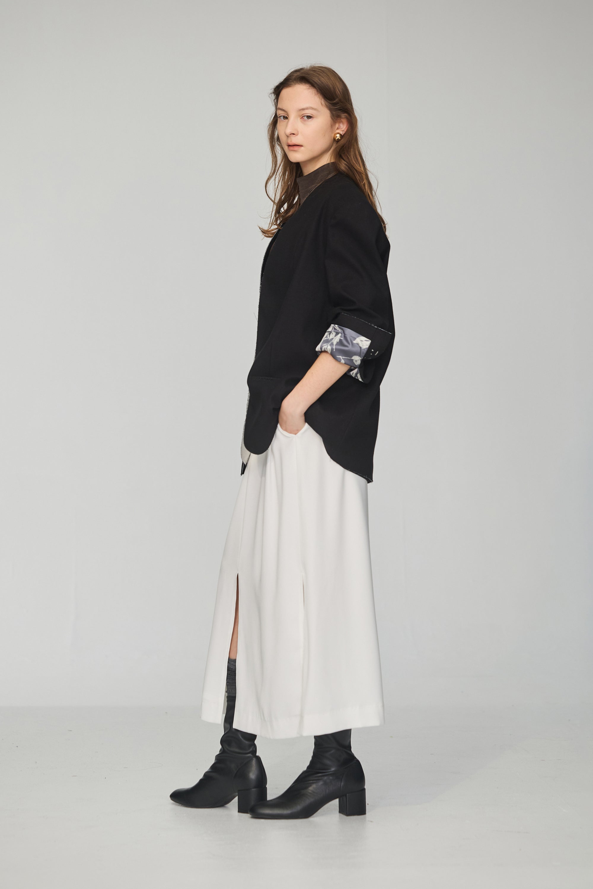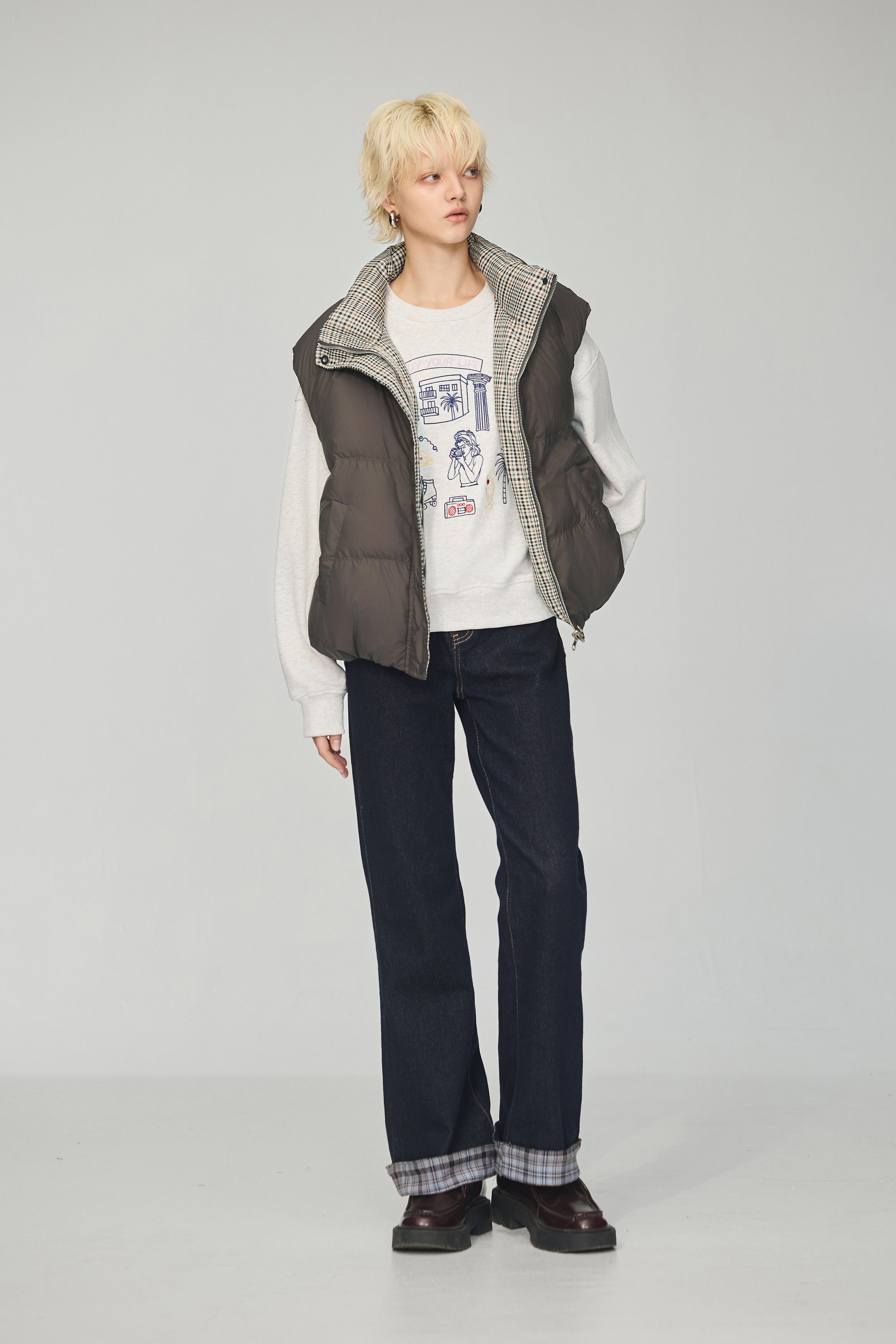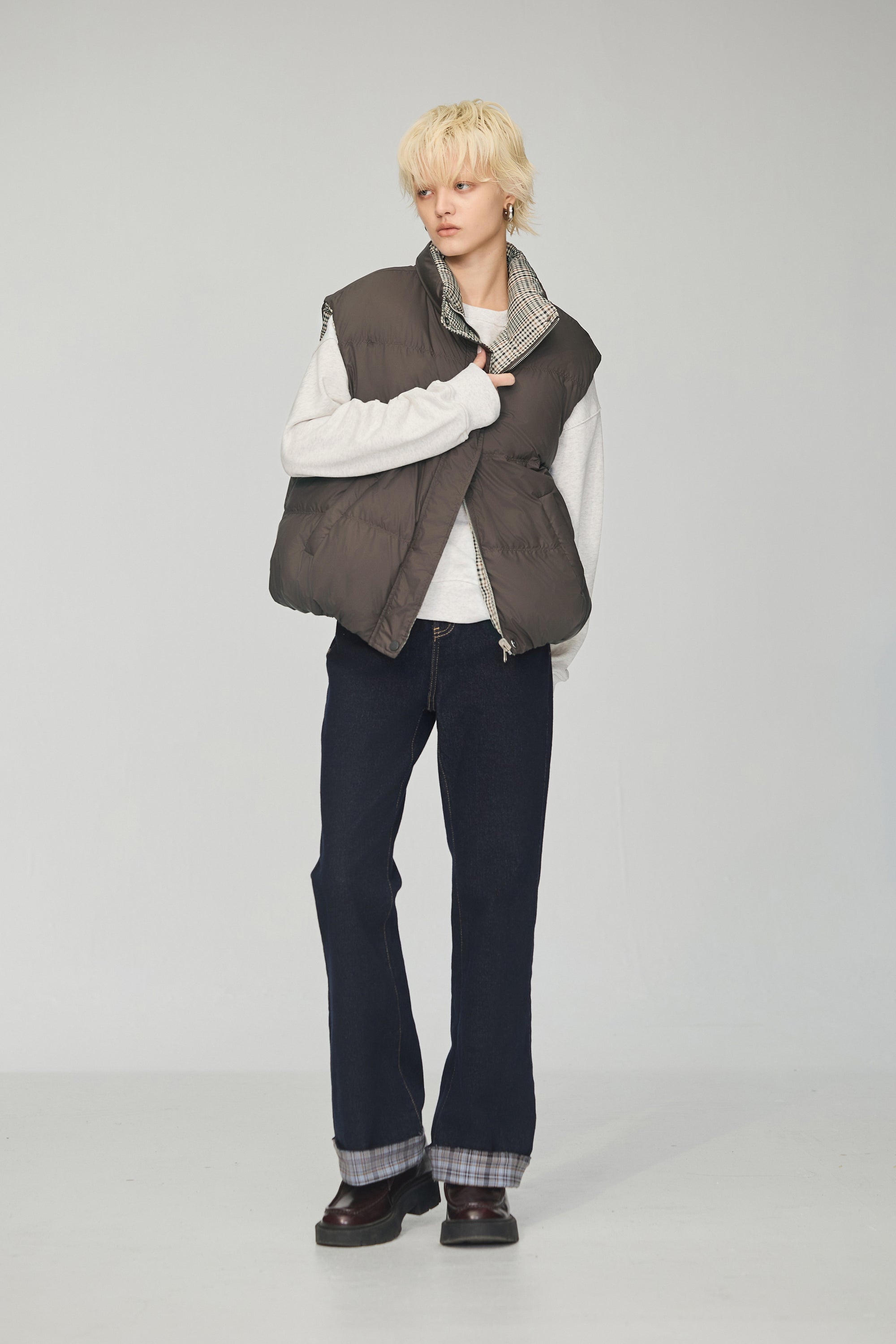 下襬抽繩立領皮革外套-灰