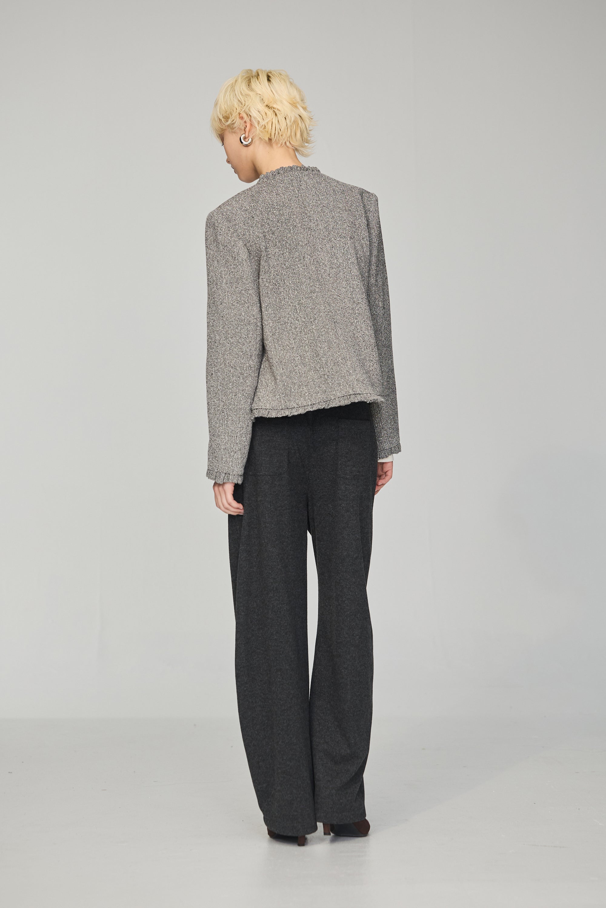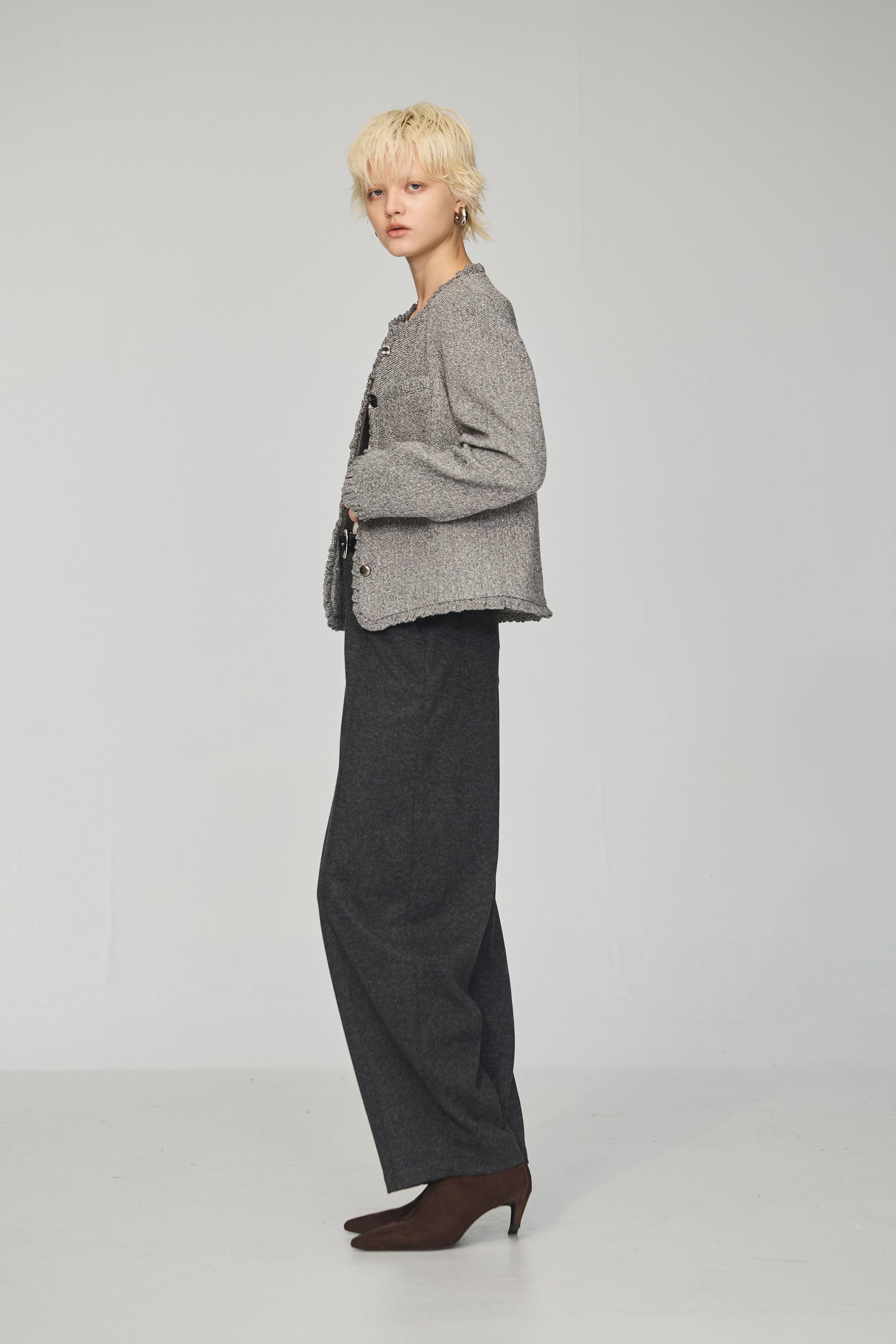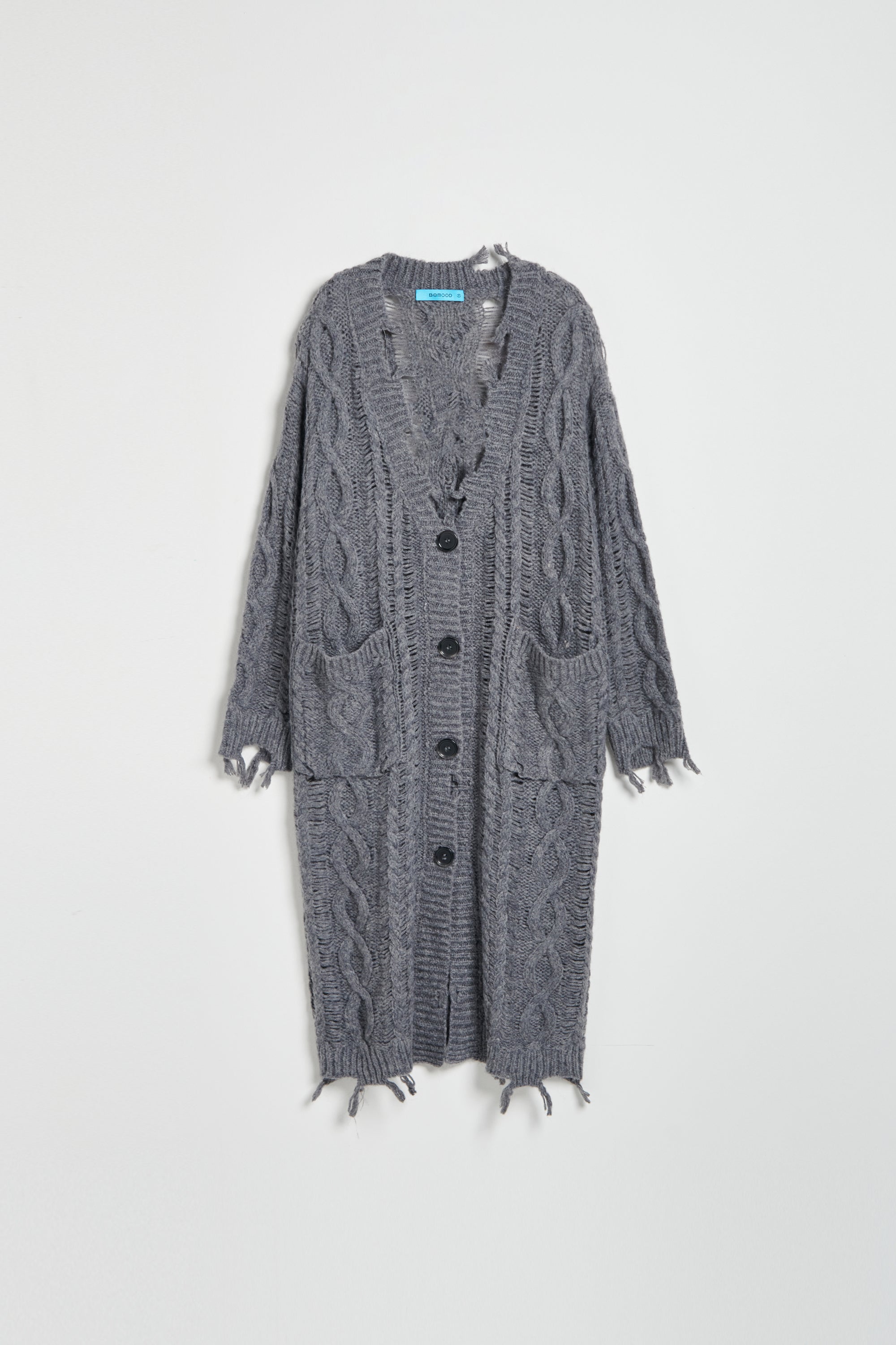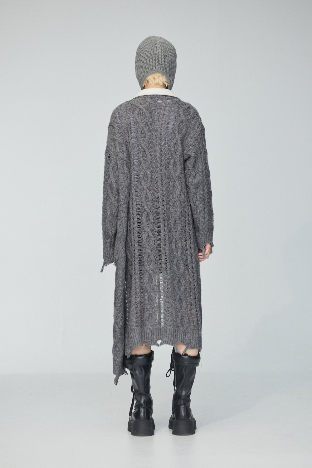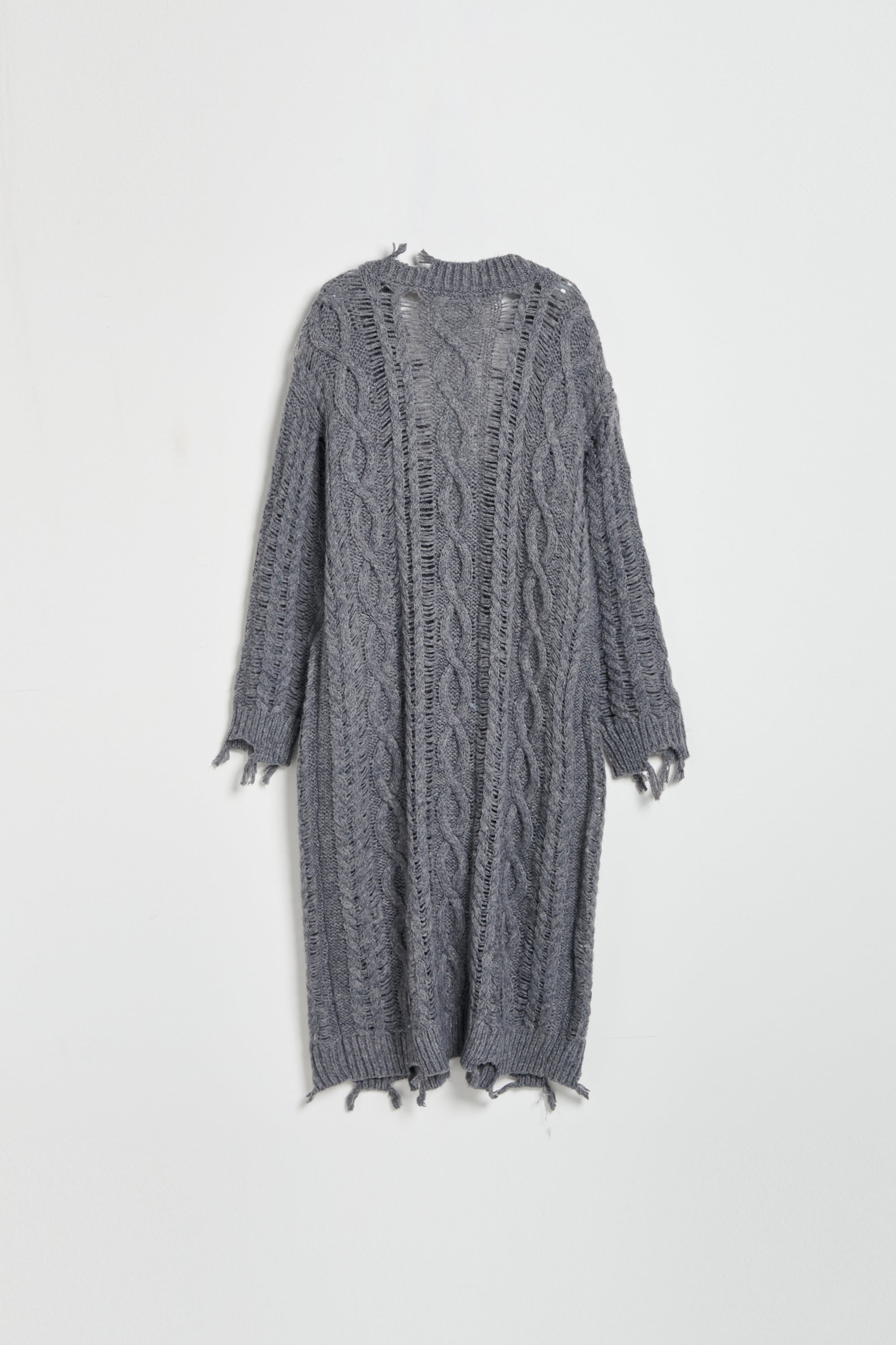 羊毛混紡鏤空織紋開襟毛衣外套-灰