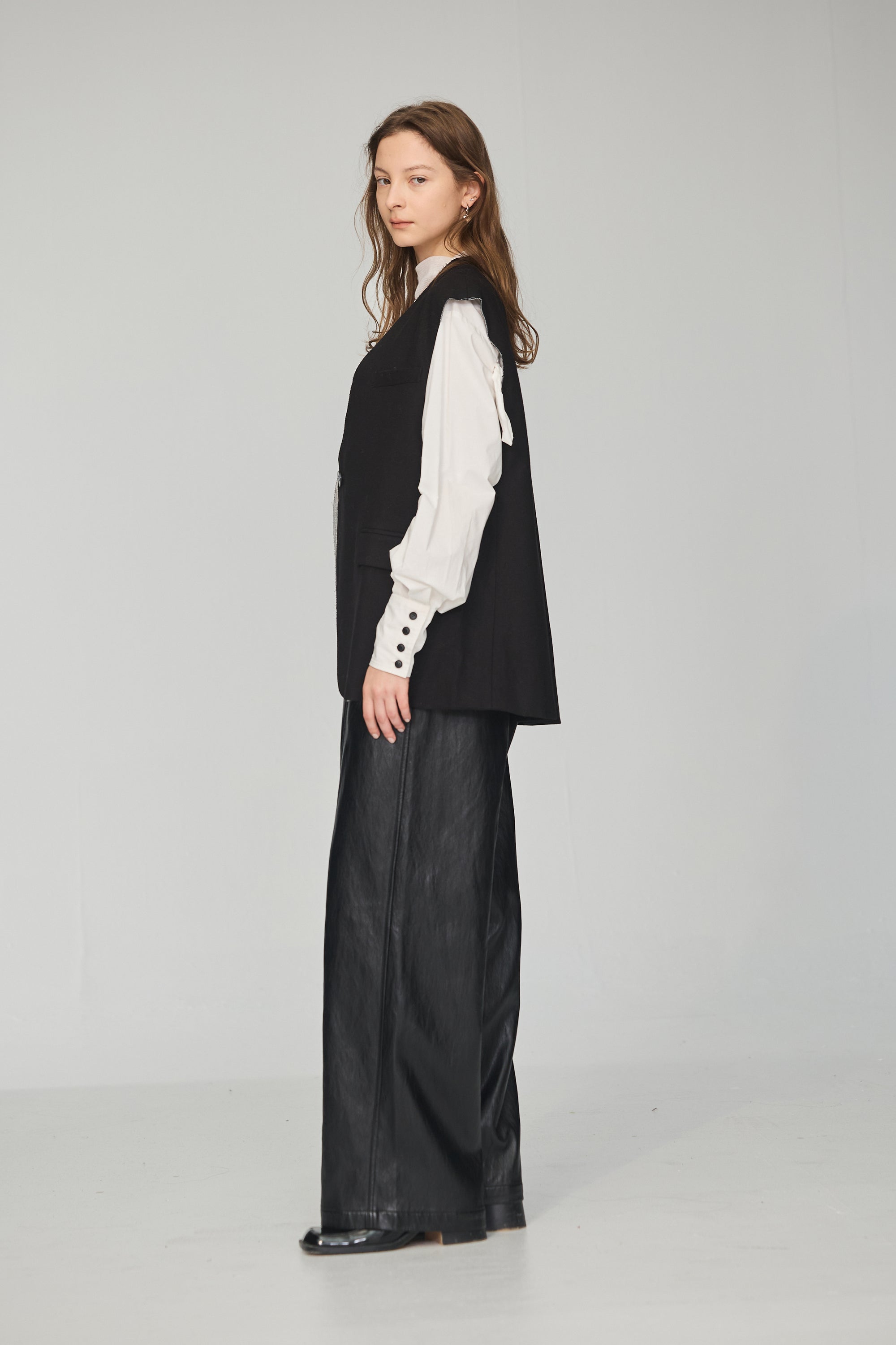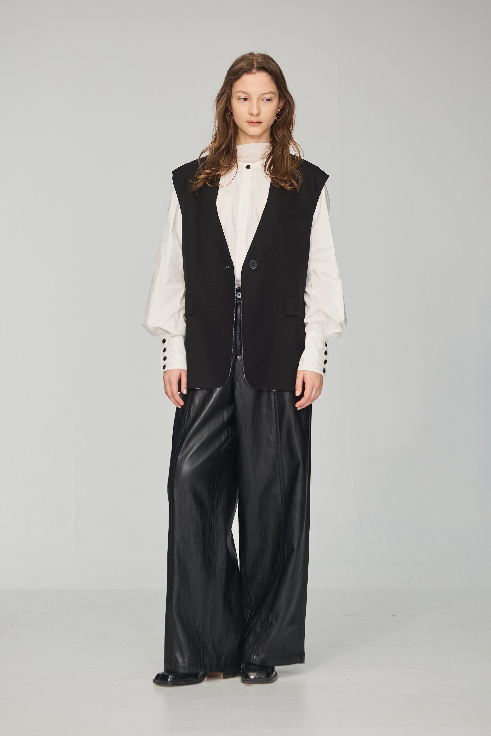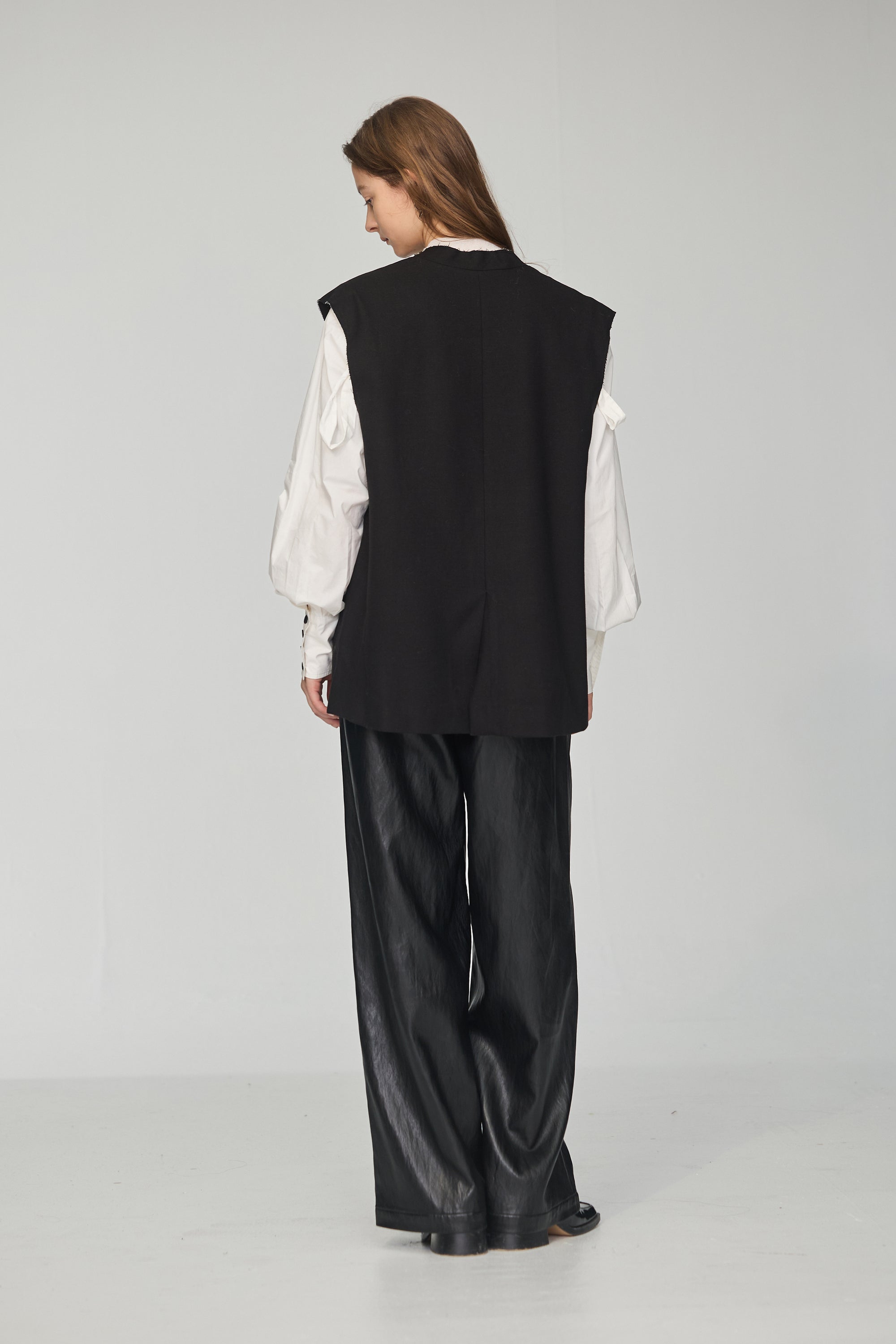 下襬抽繩立領皮革外套-黑