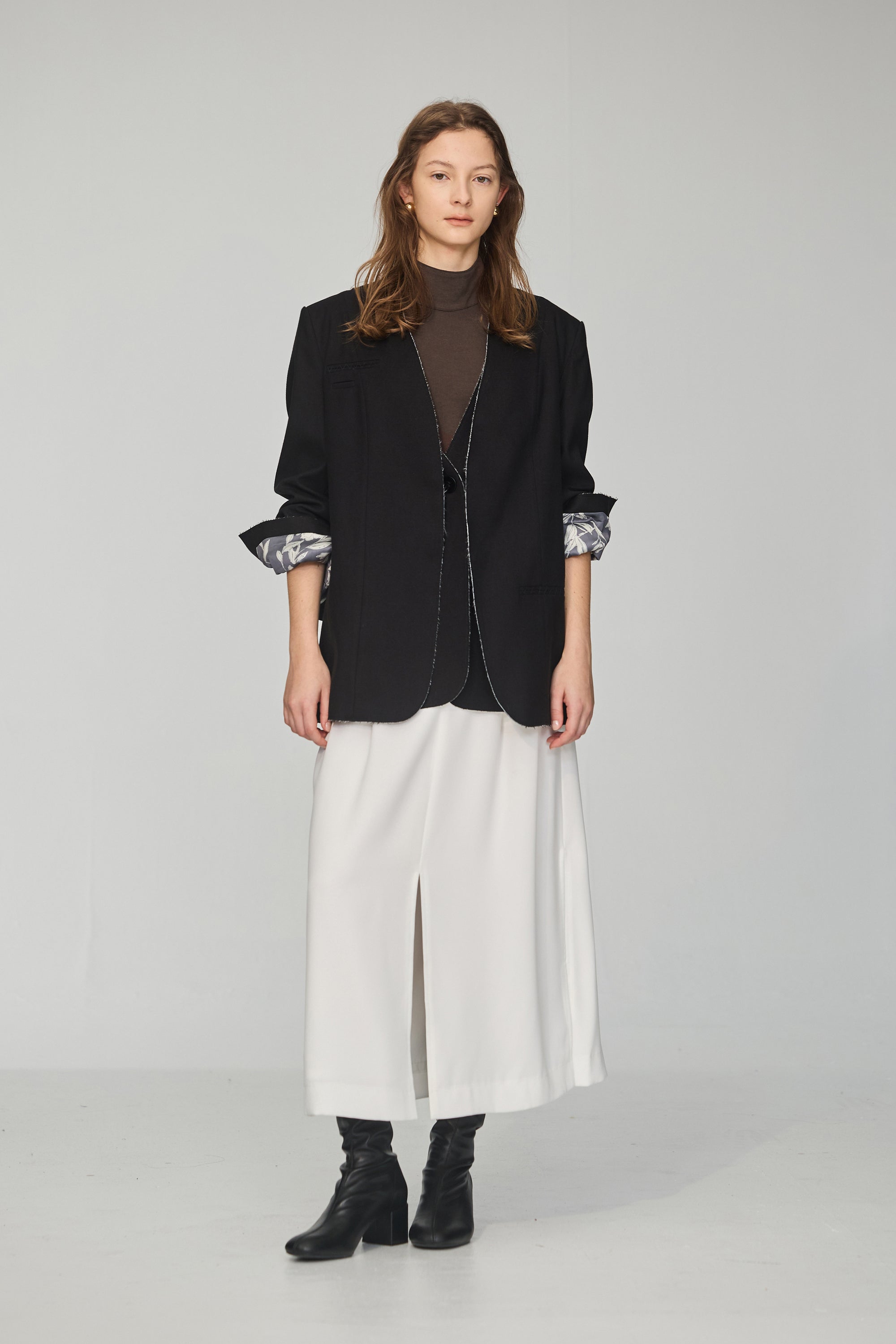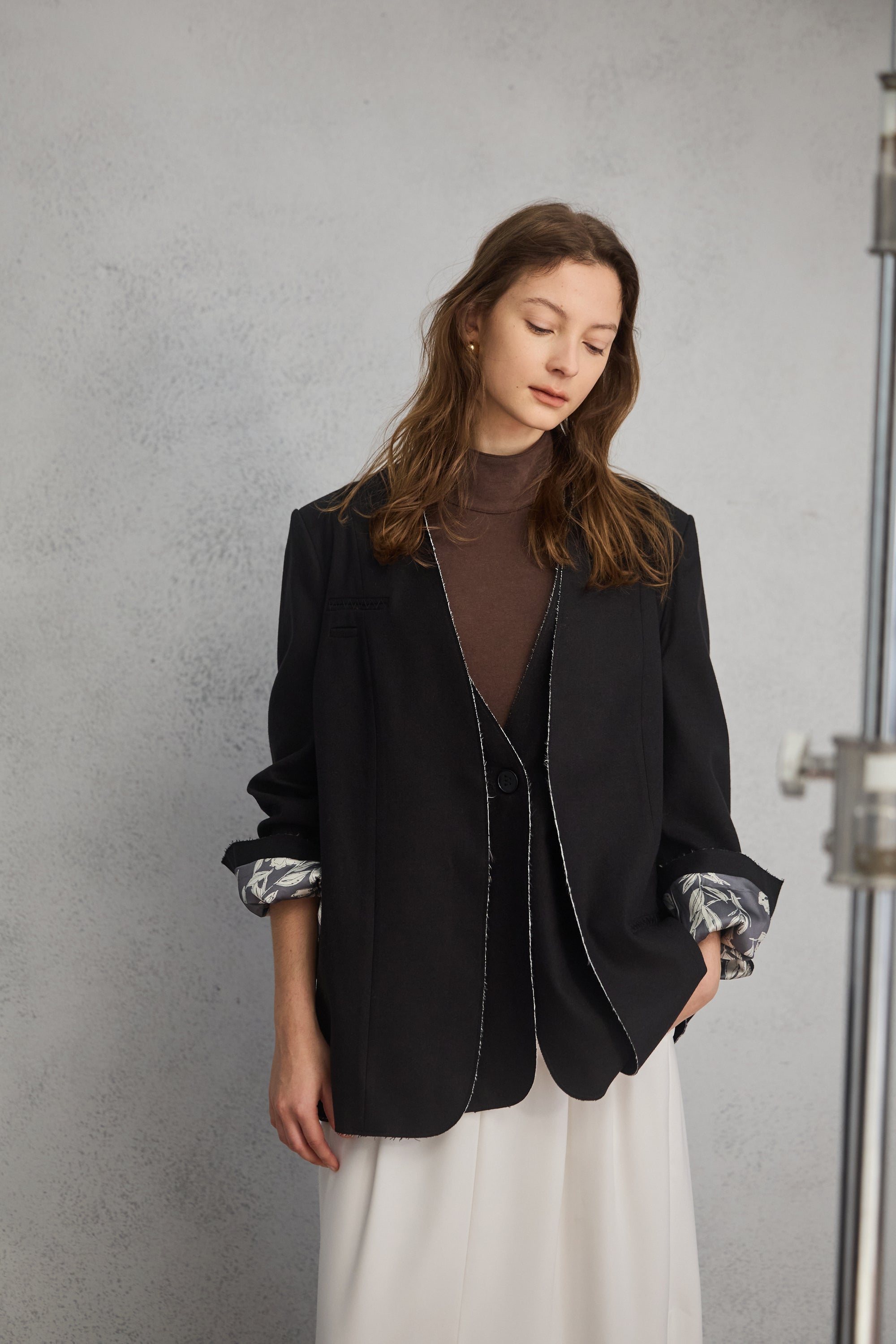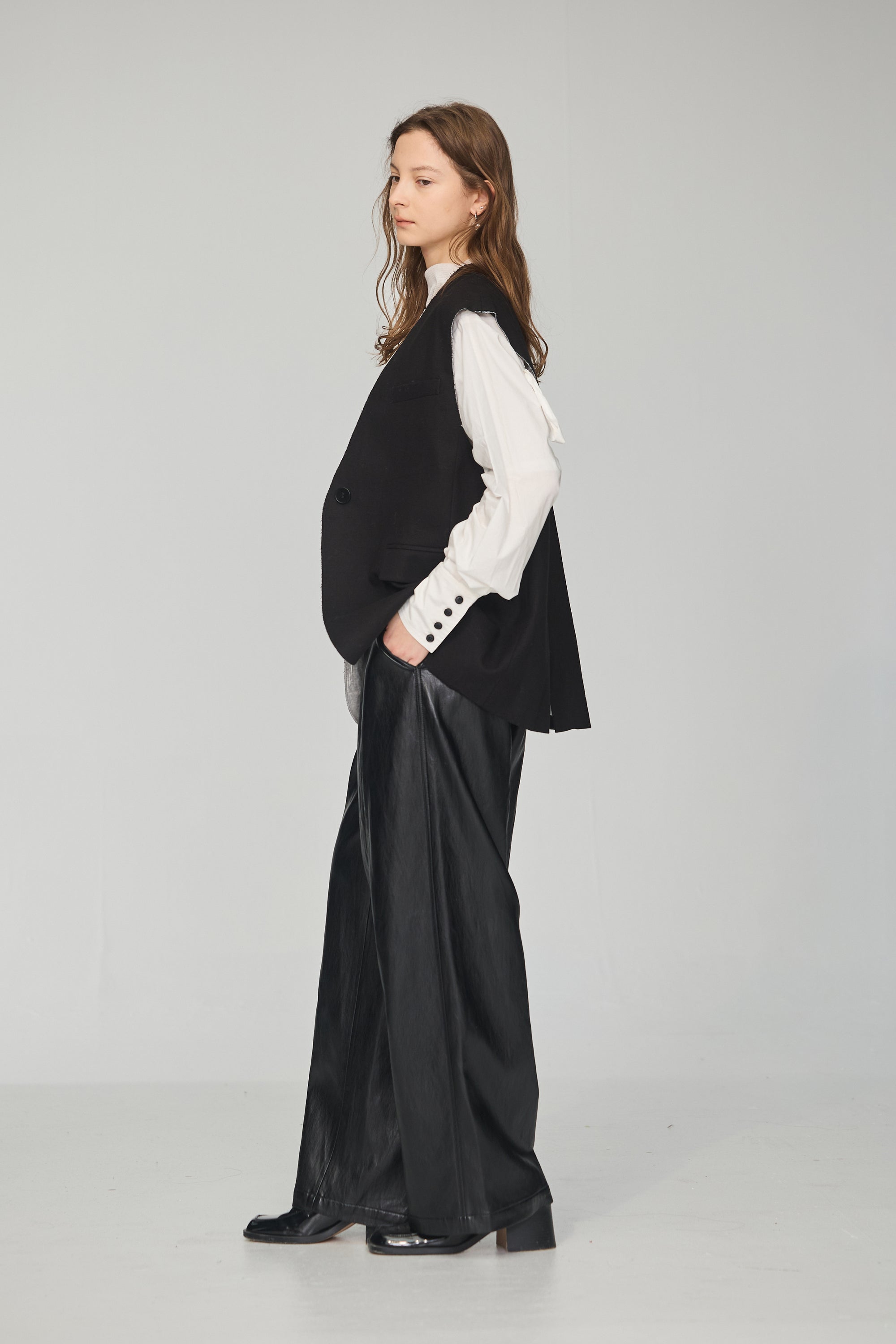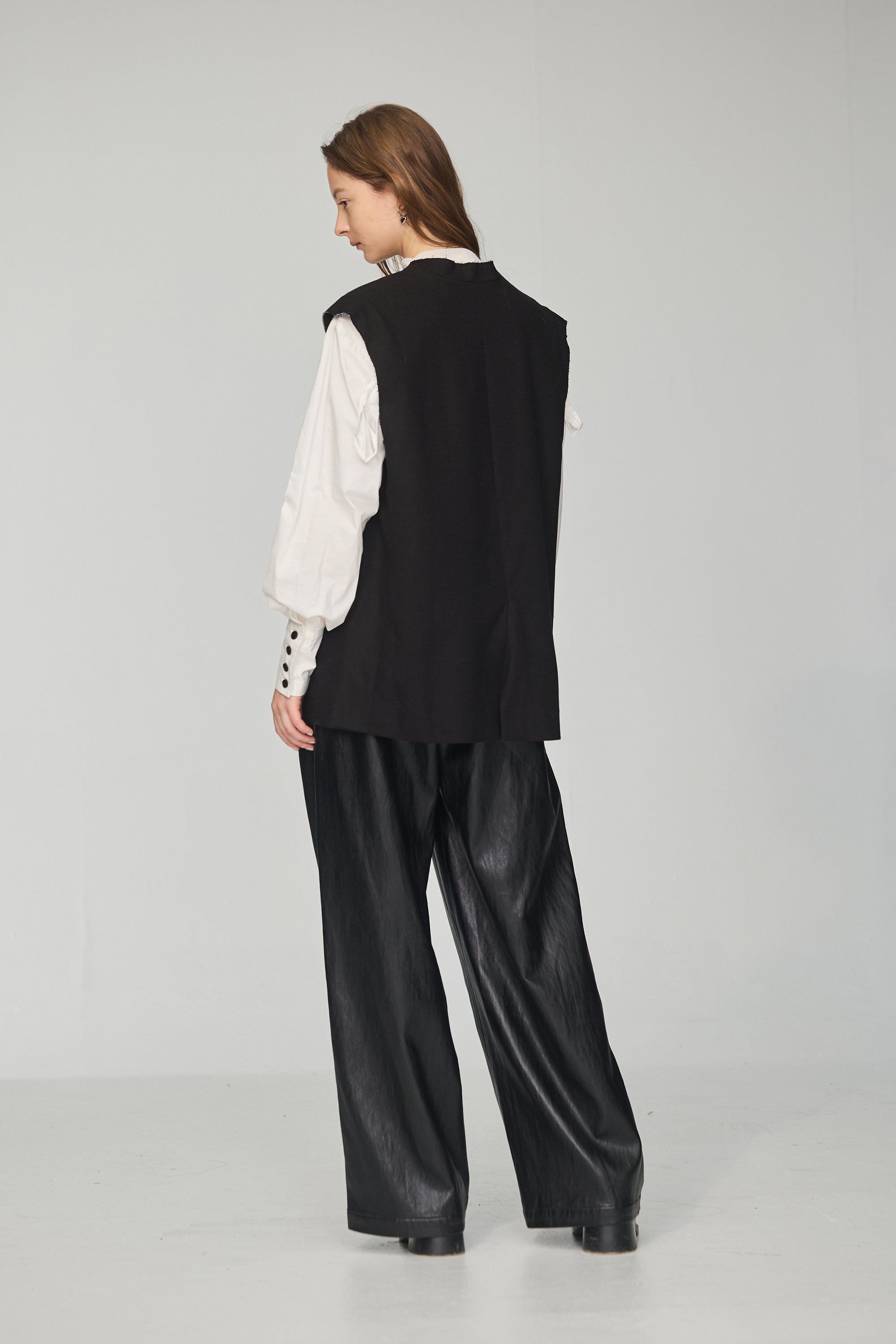 下襬抽繩立領皮革外套-黑