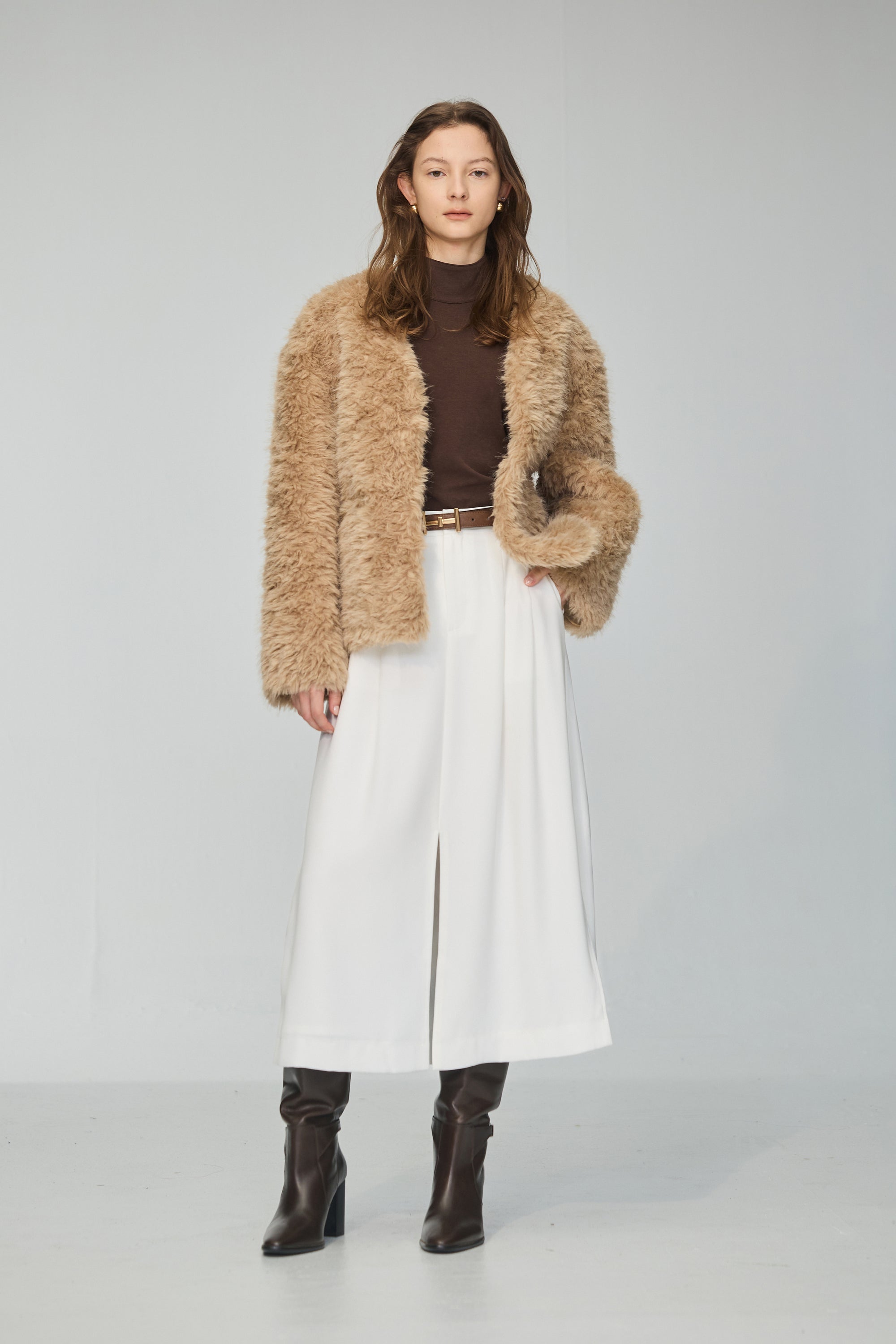 圓領開襟綁帶針織上衣-咖