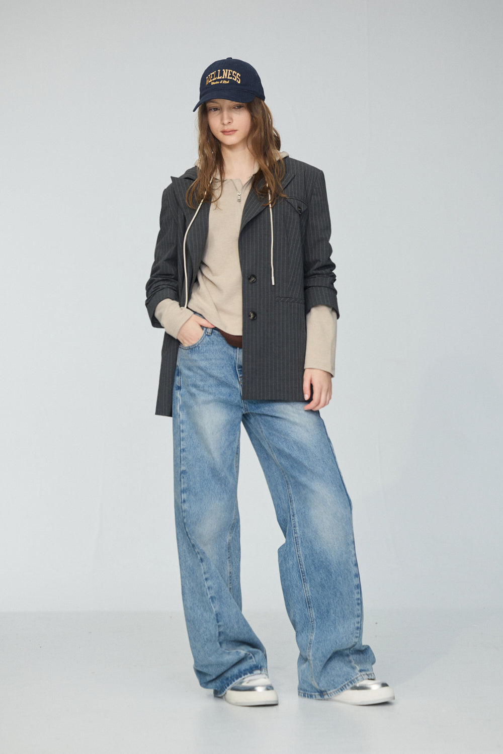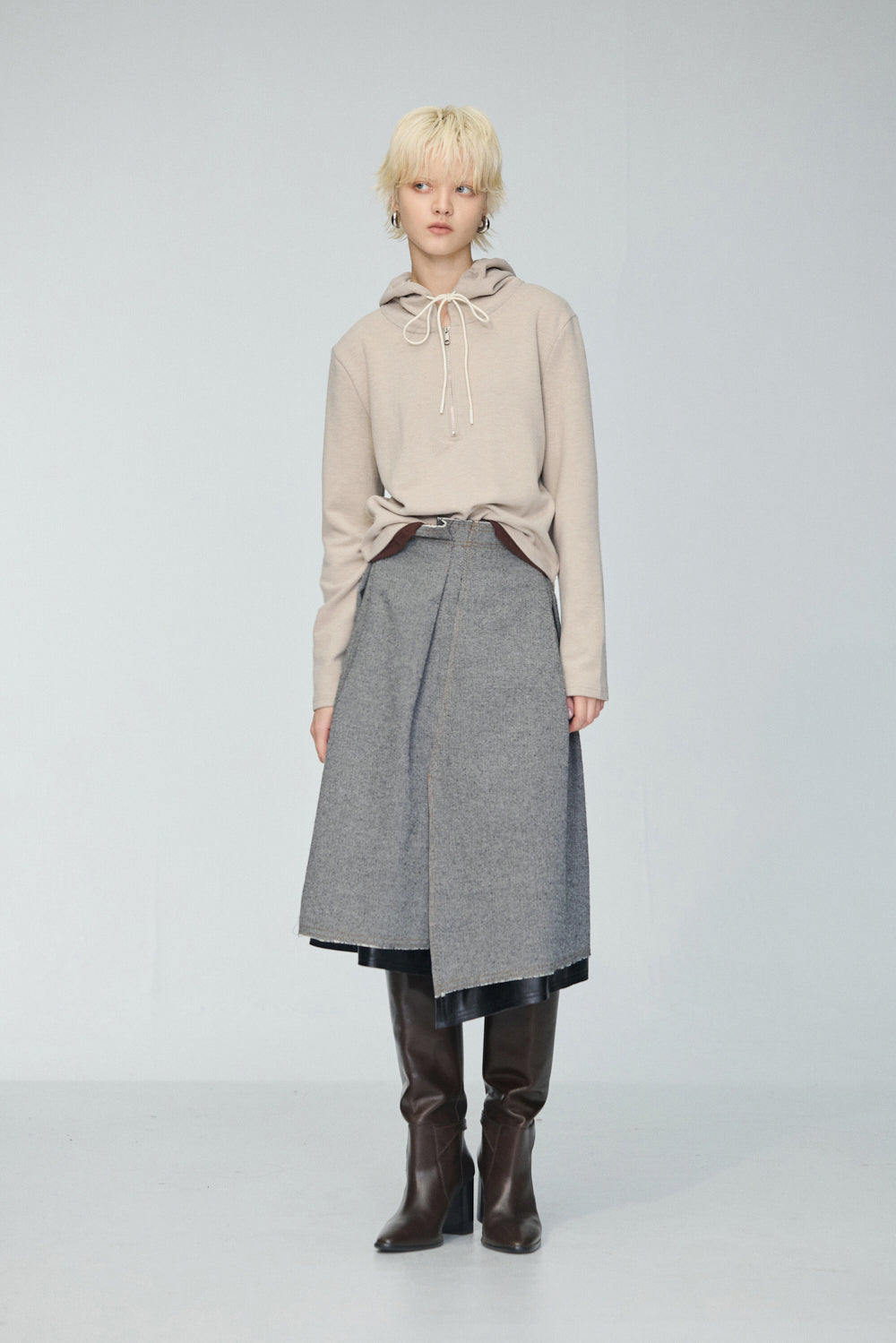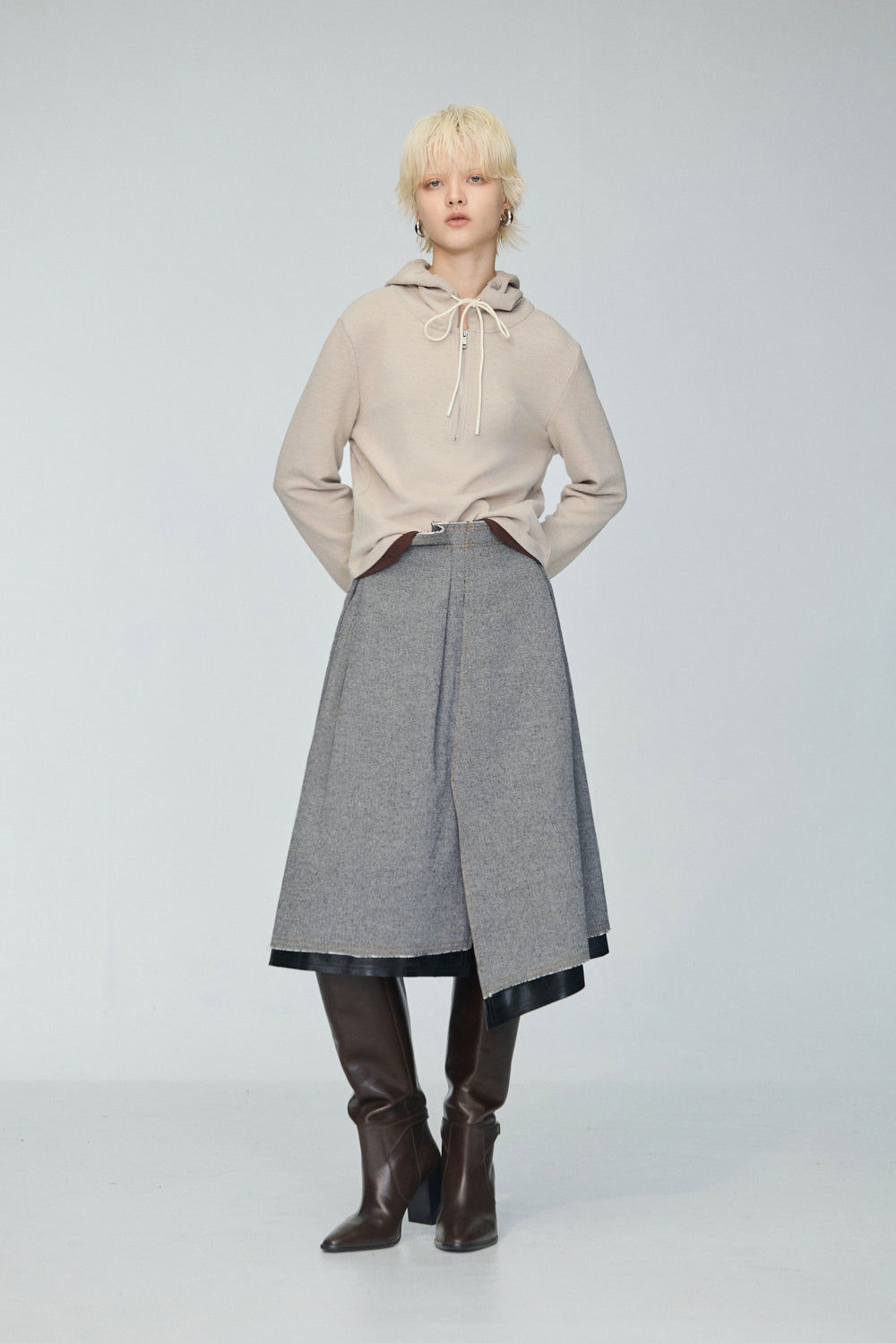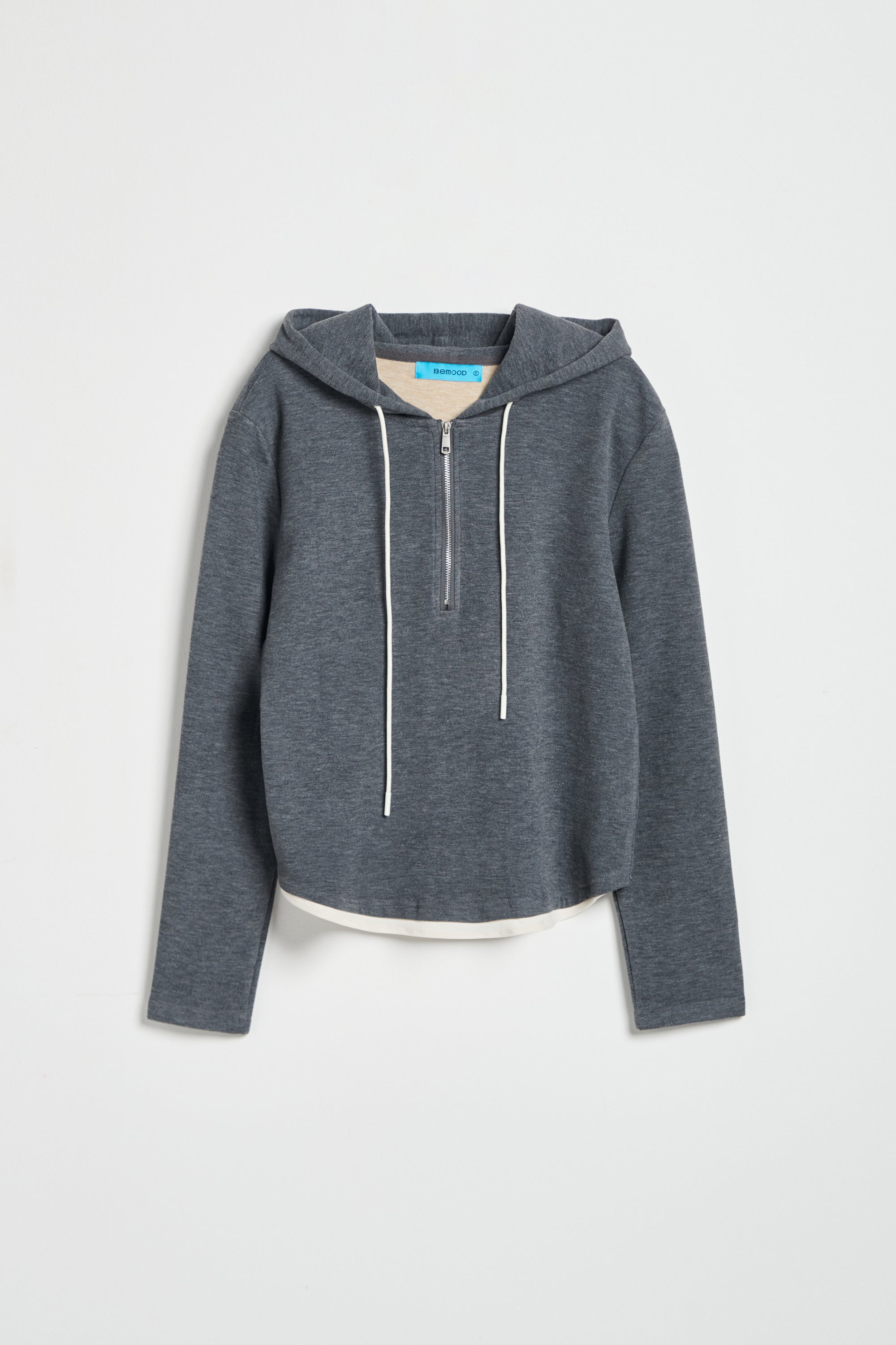 連帽假兩件配色拉鍊收腰上衣-米