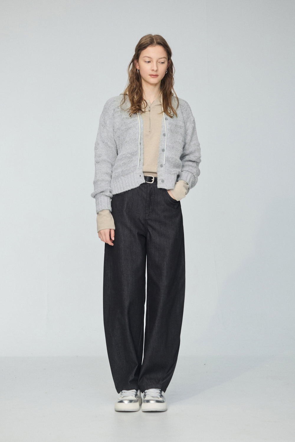 圓領開襟綁帶針織上衣-深灰