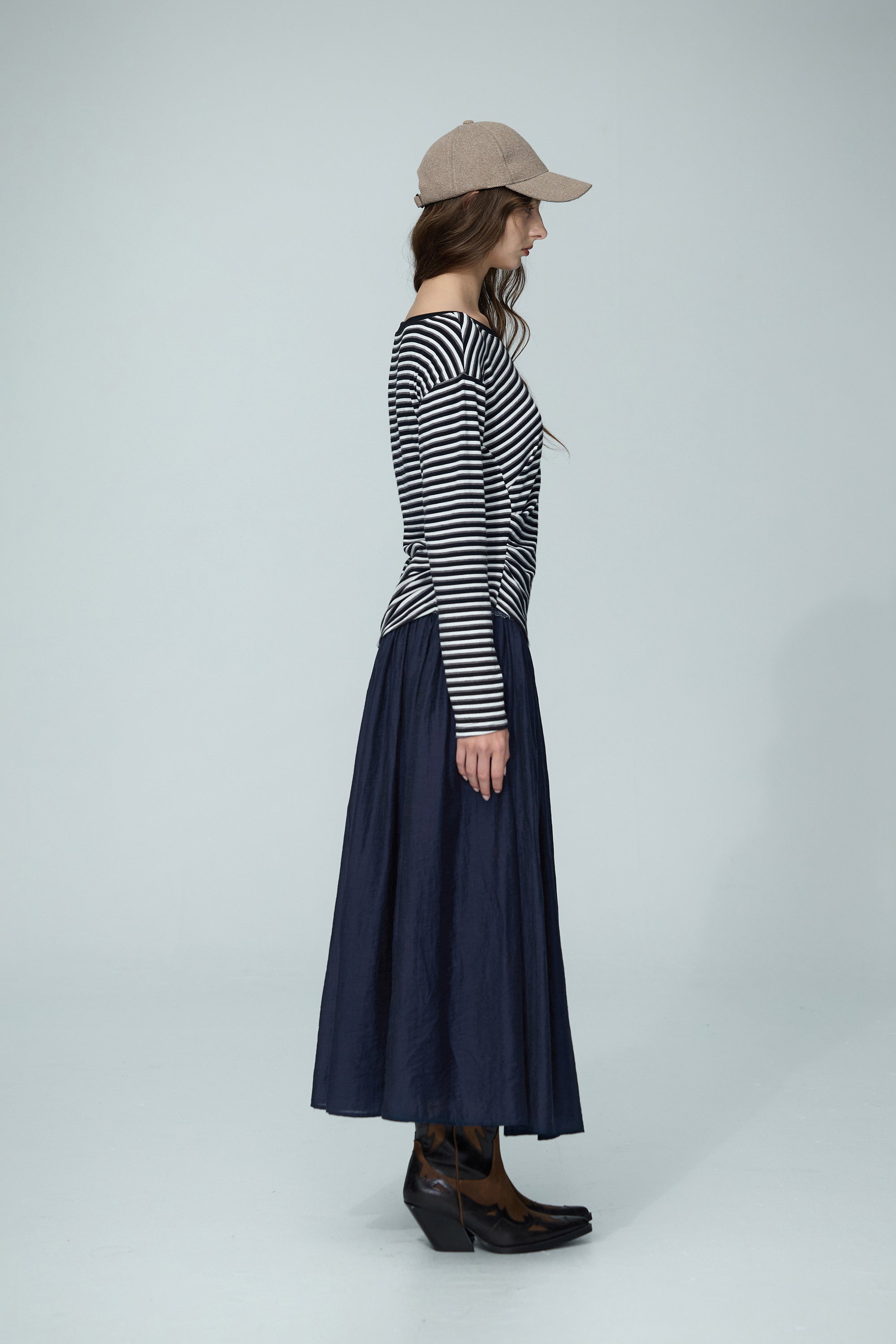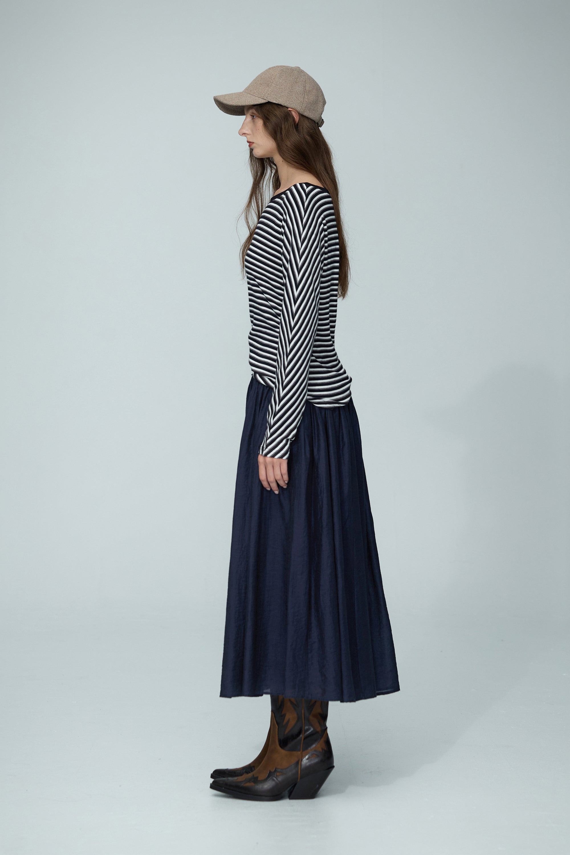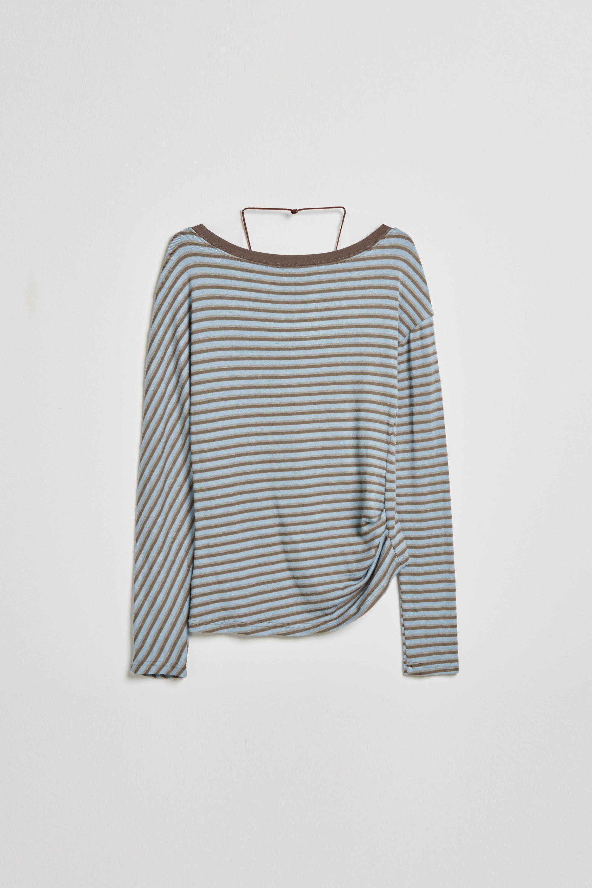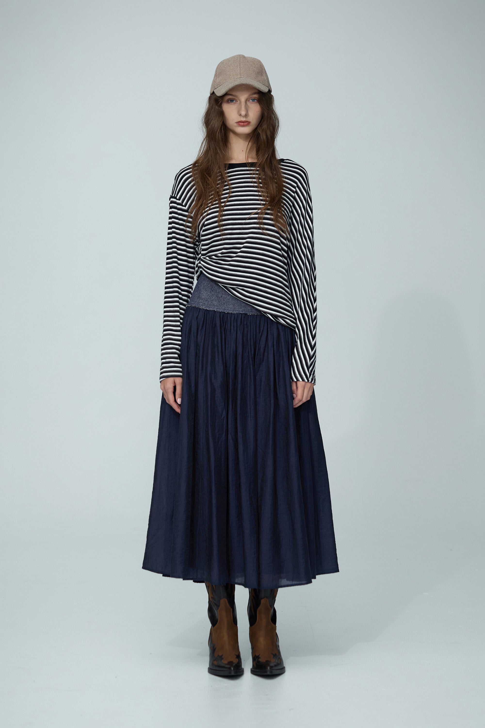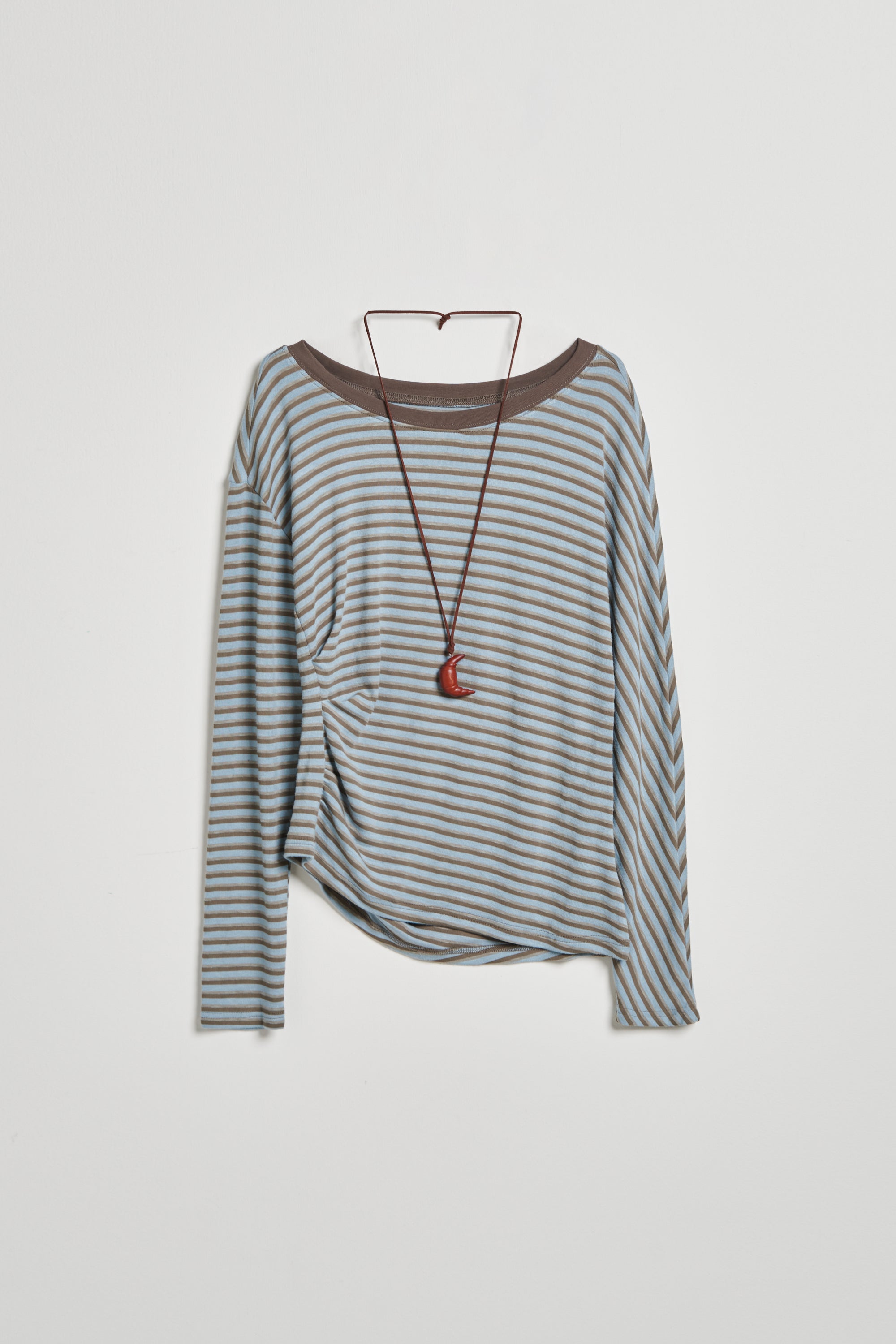 圓領條紋彈性褶皺收腰上衣(附項鍊)-藍色