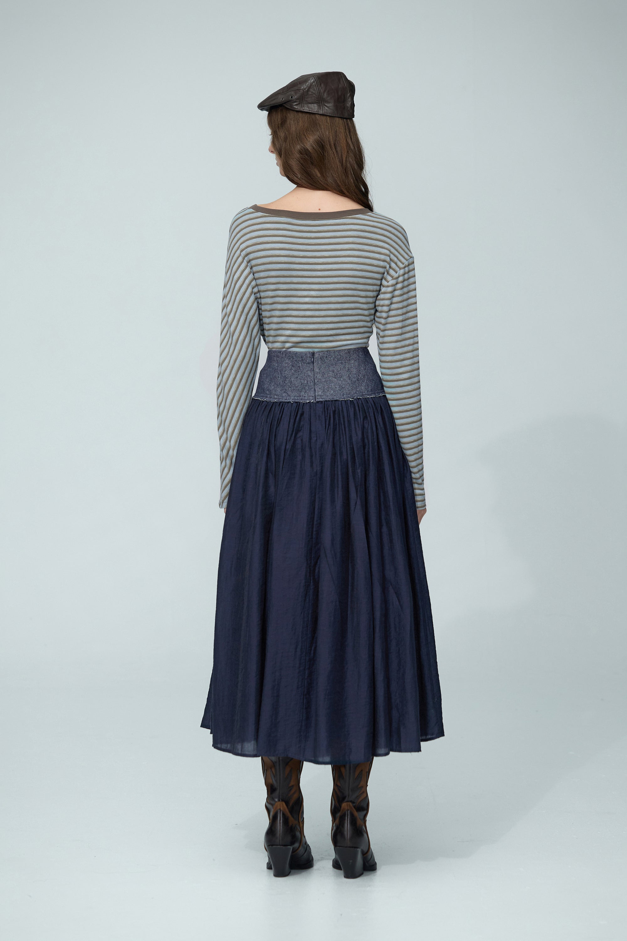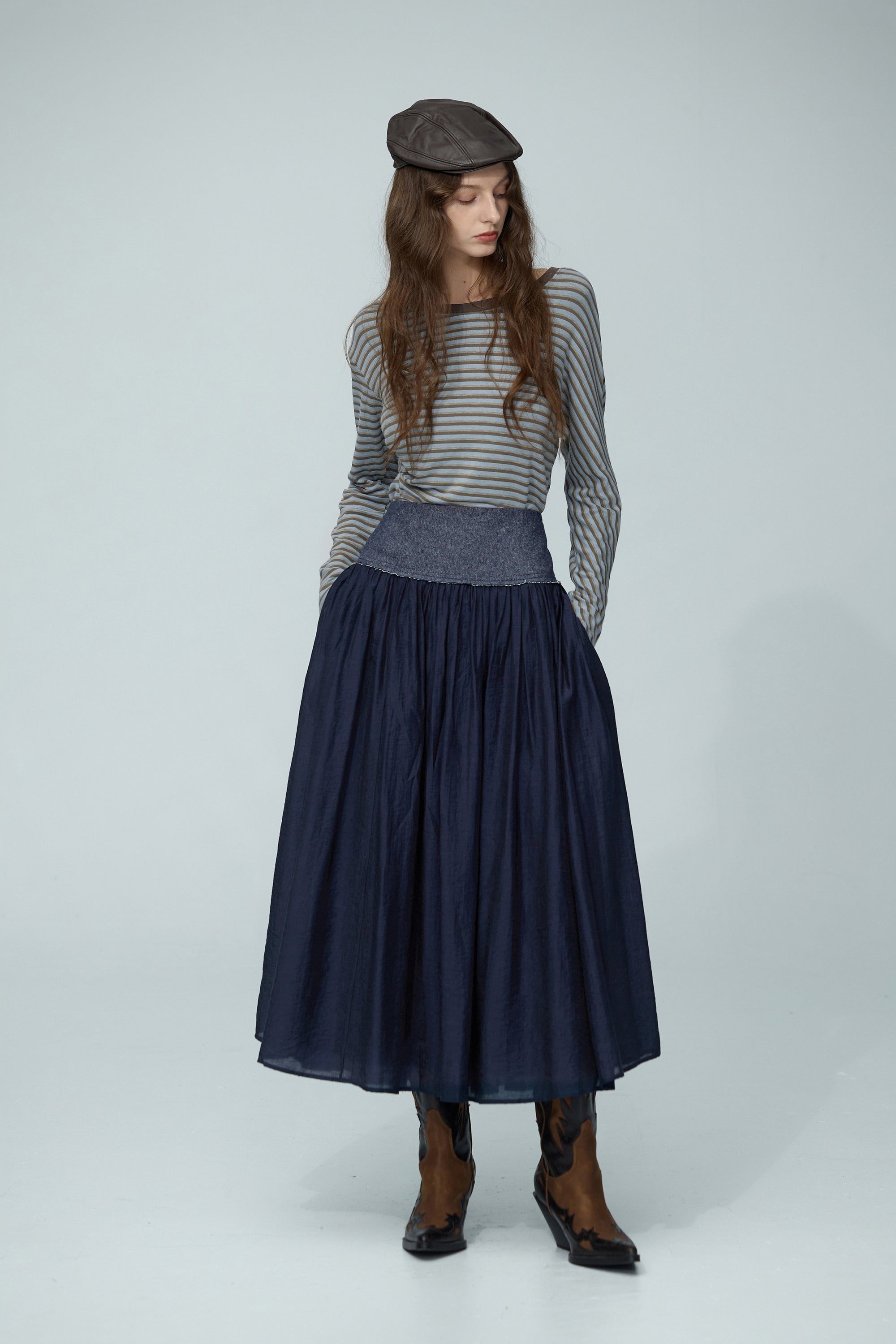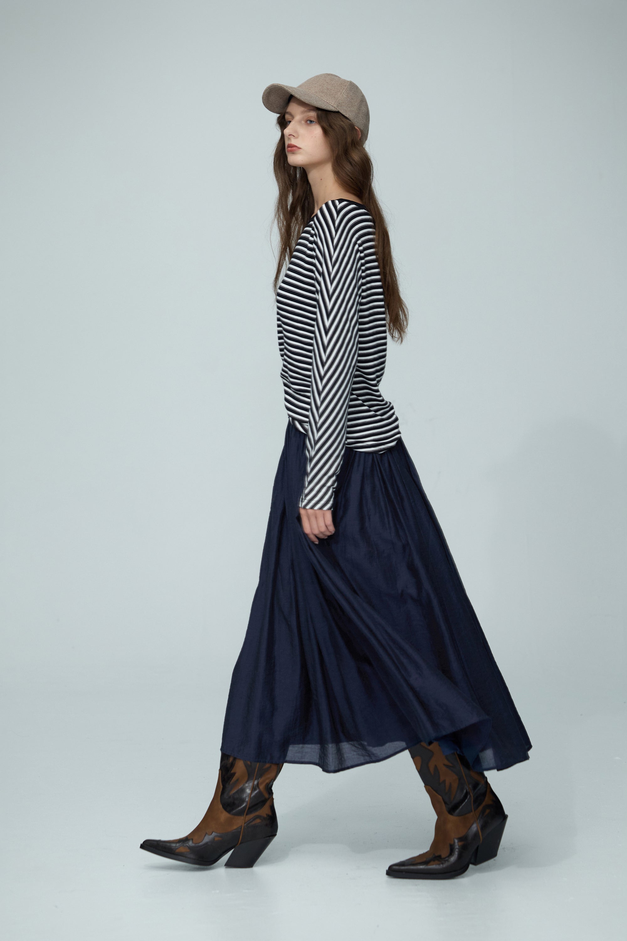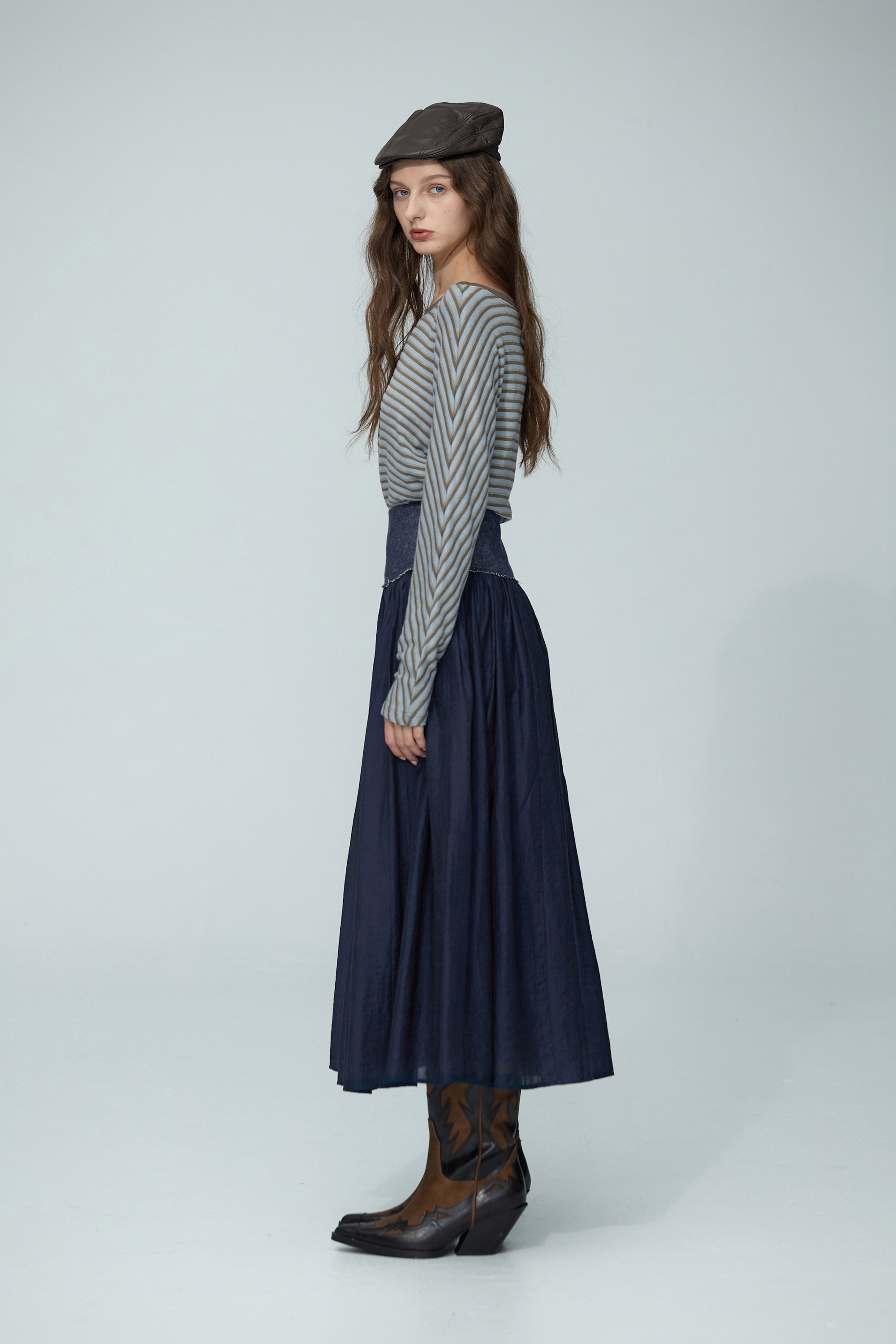 圓領條紋彈性褶皺收腰上衣(附項鍊)-藍色