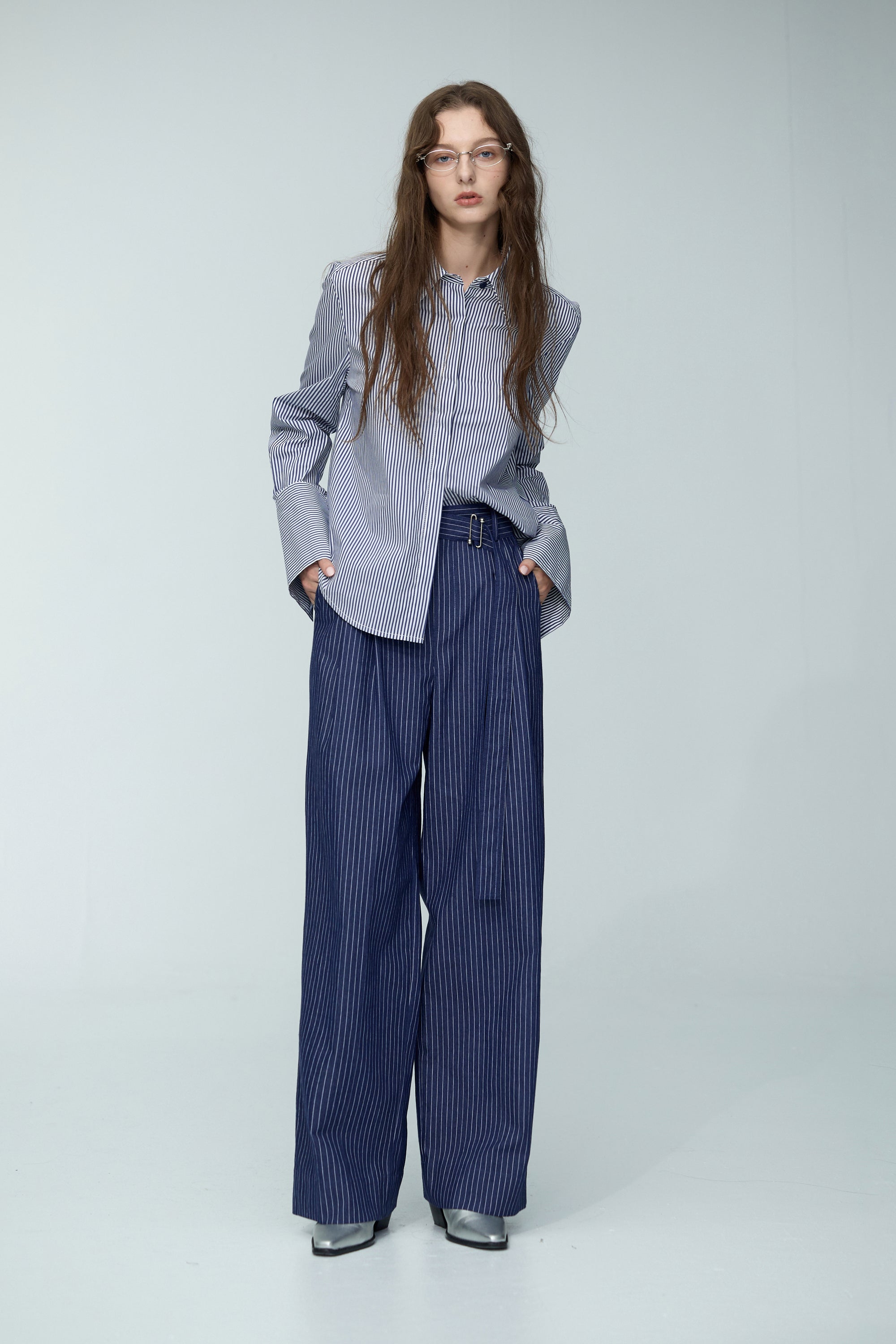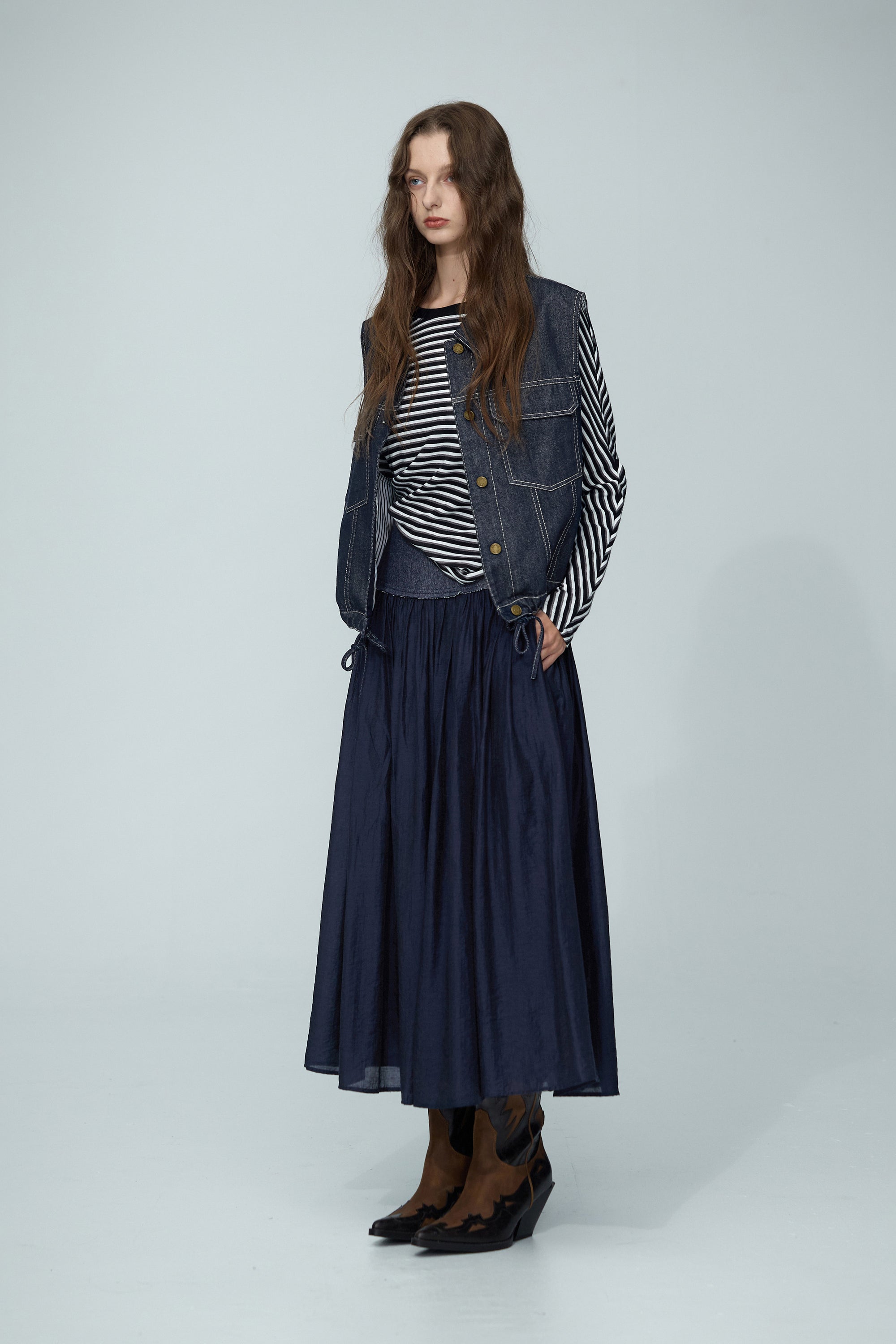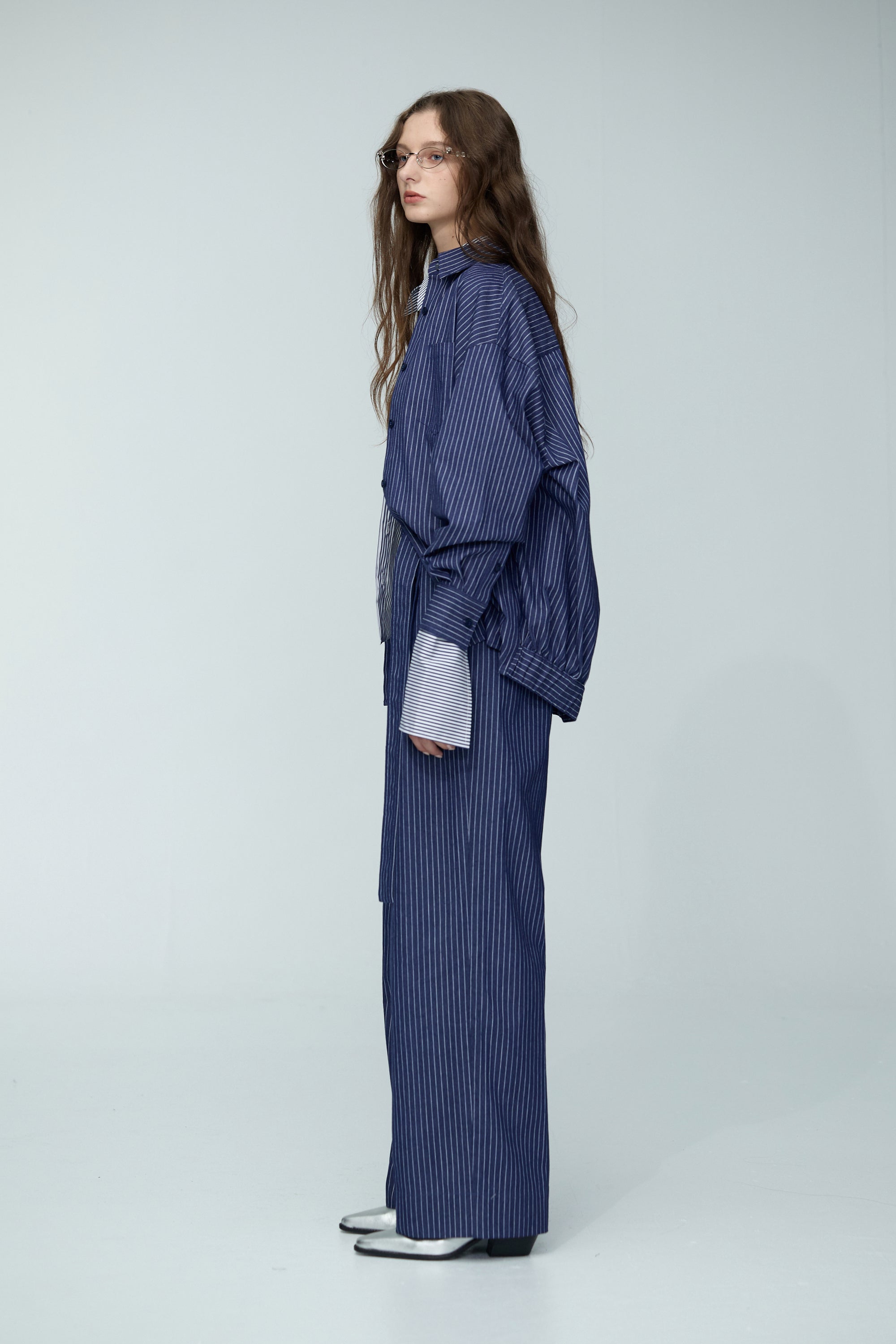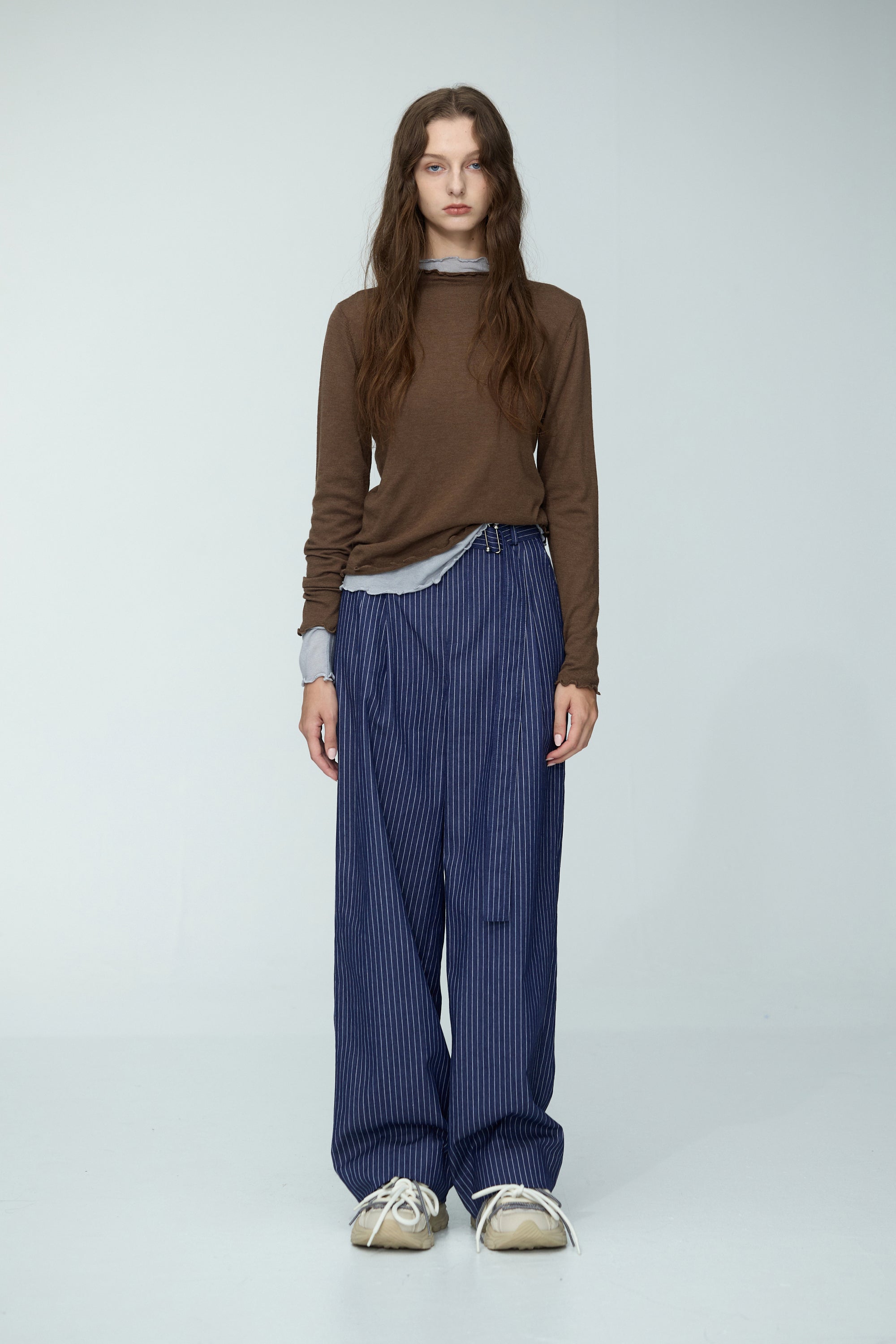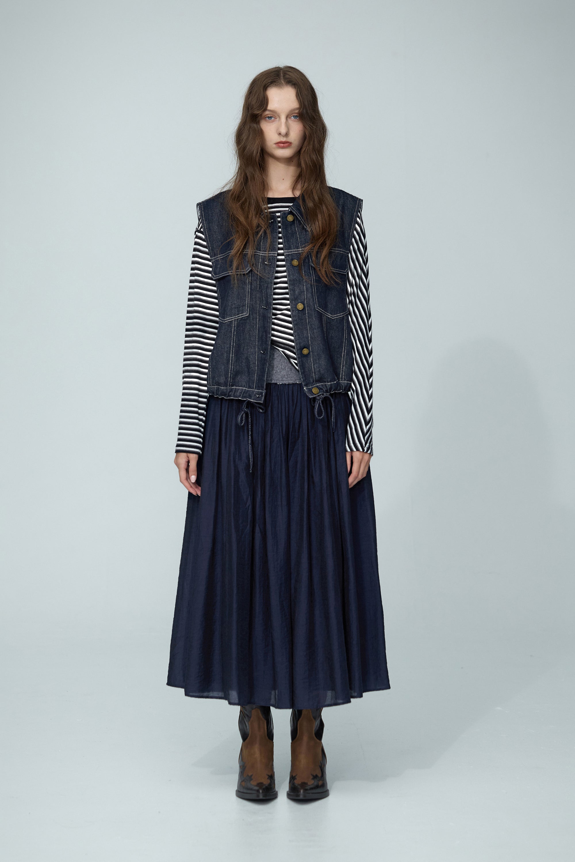 圓領條紋彈性褶皺收腰上衣(附項鍊)-藍色