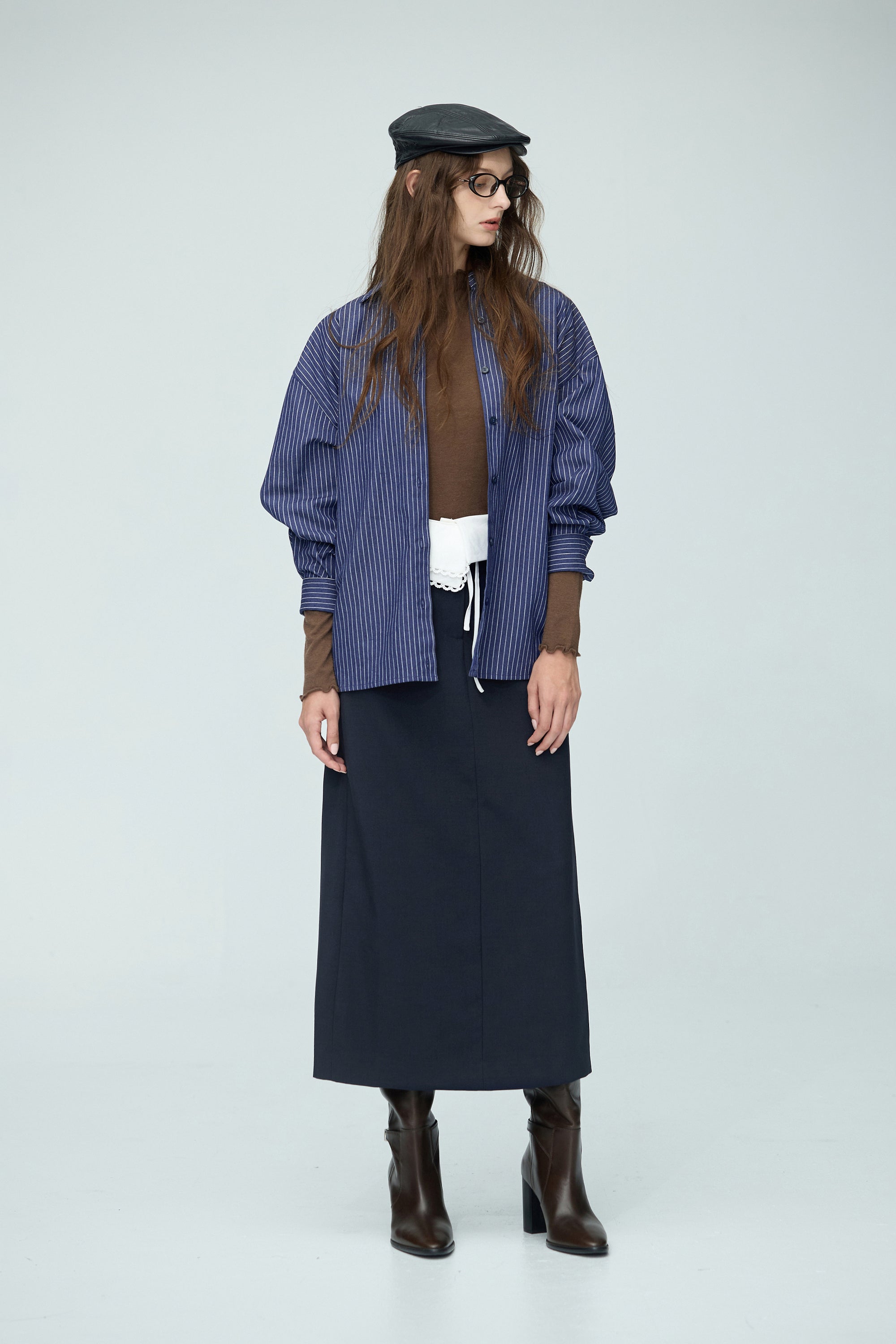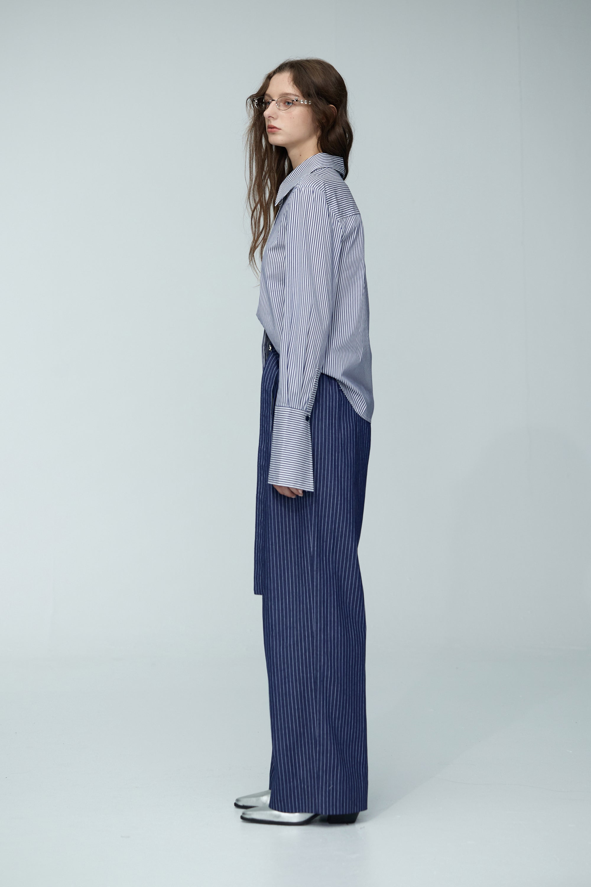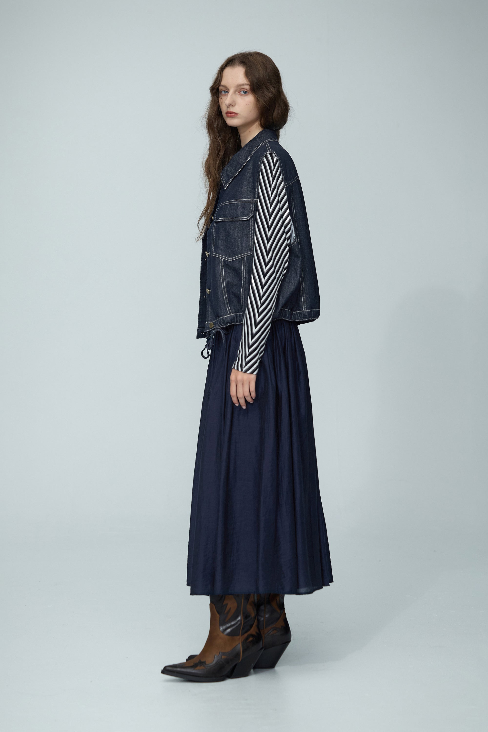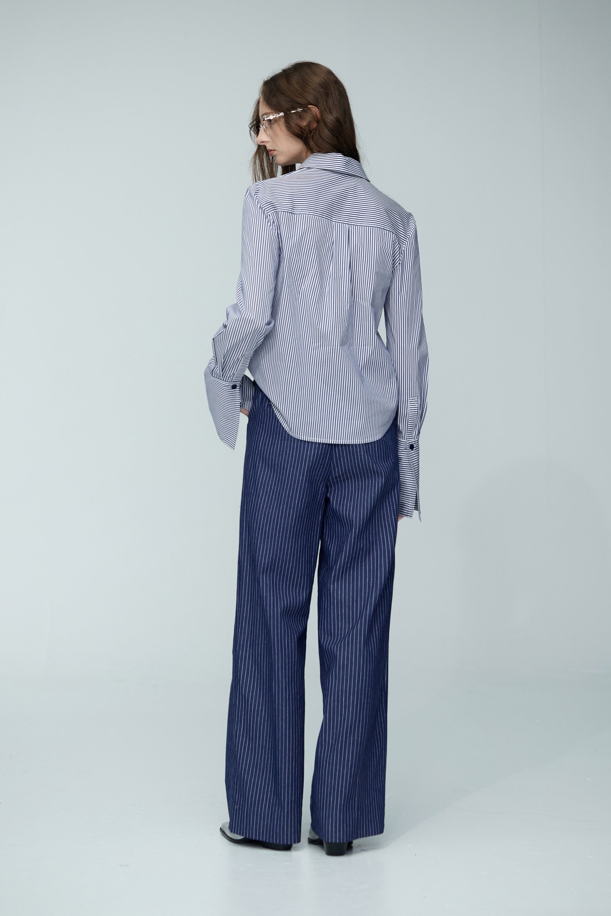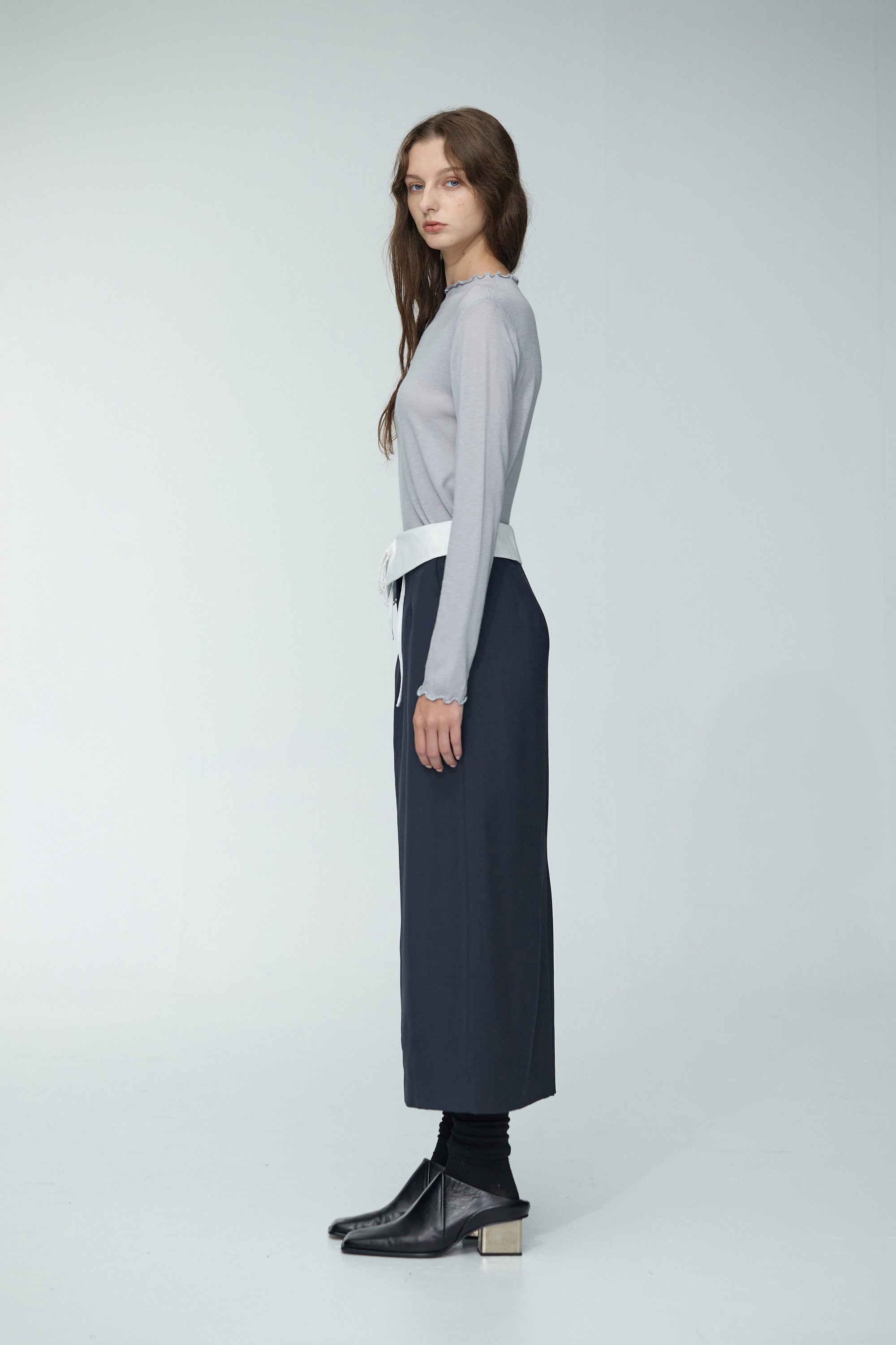 圓領條紋彈性褶皺收腰上衣(附項鍊)-藍色