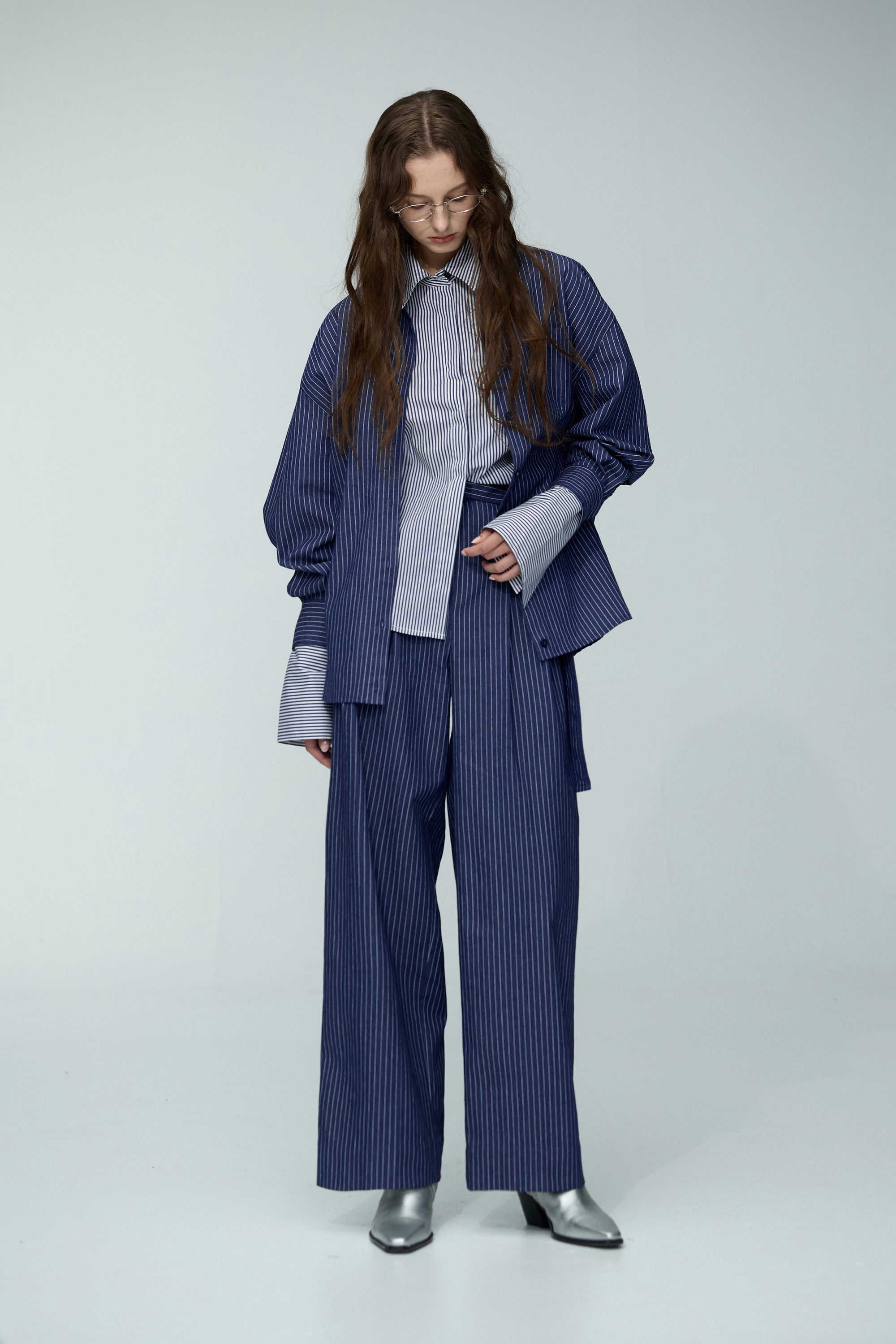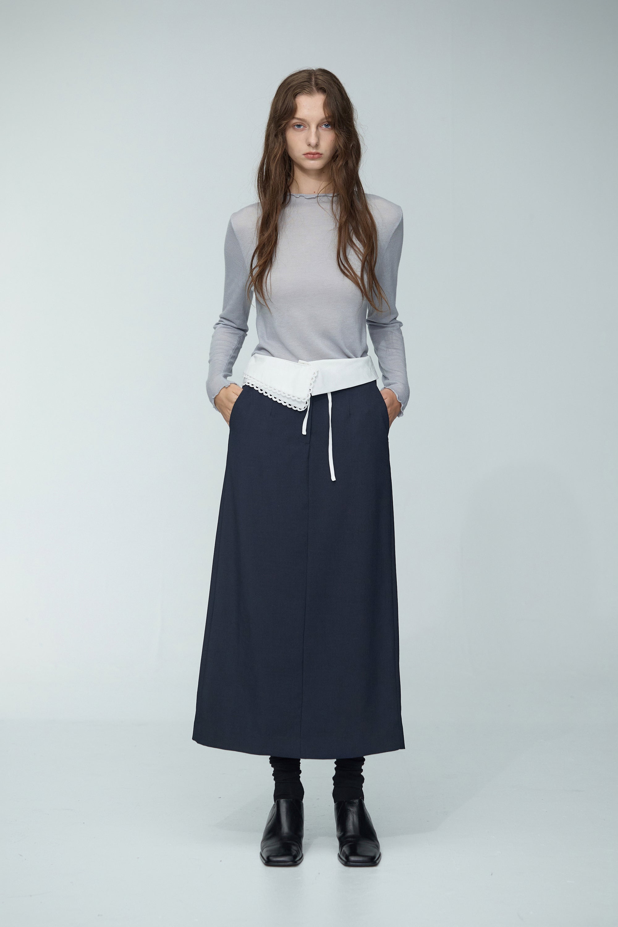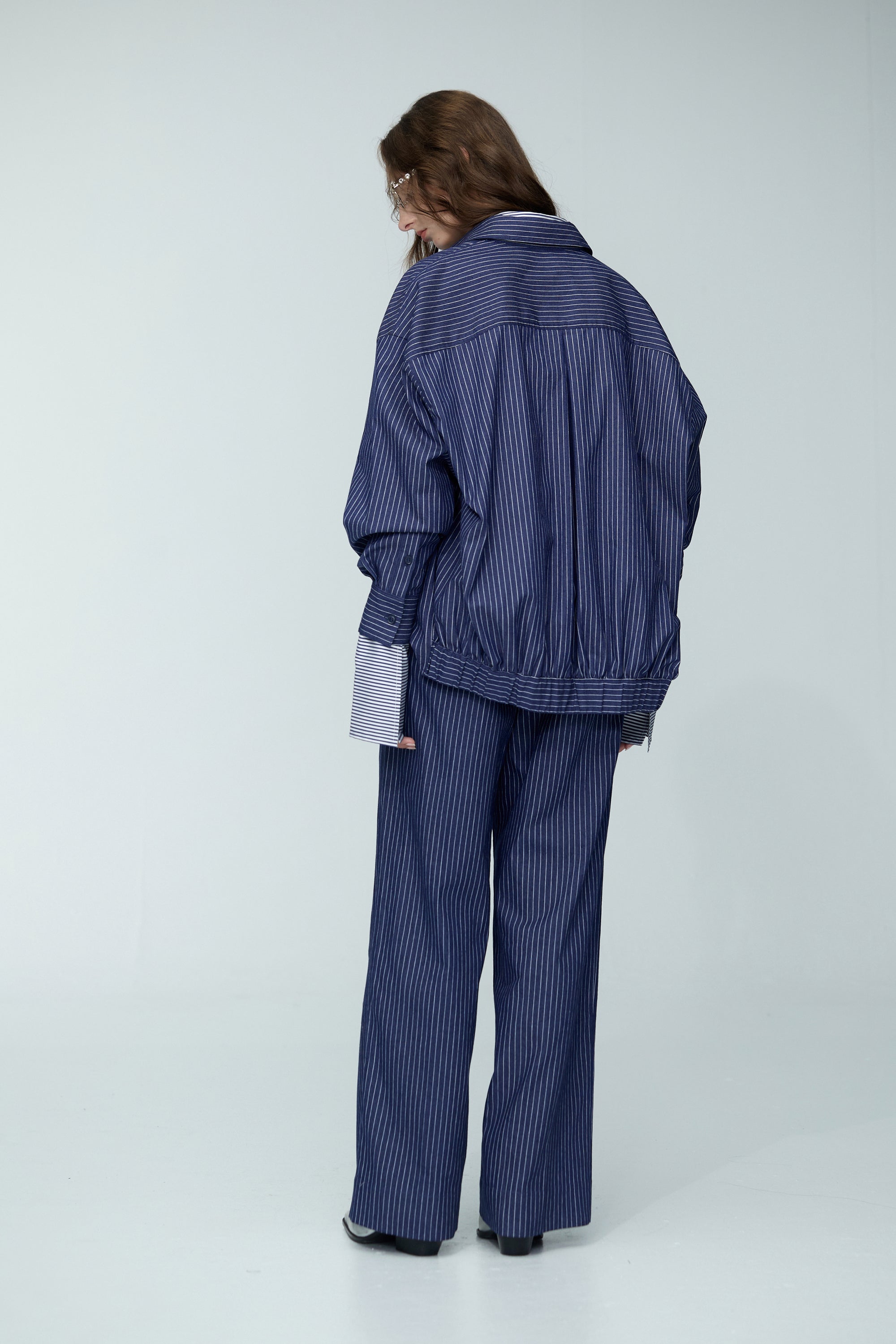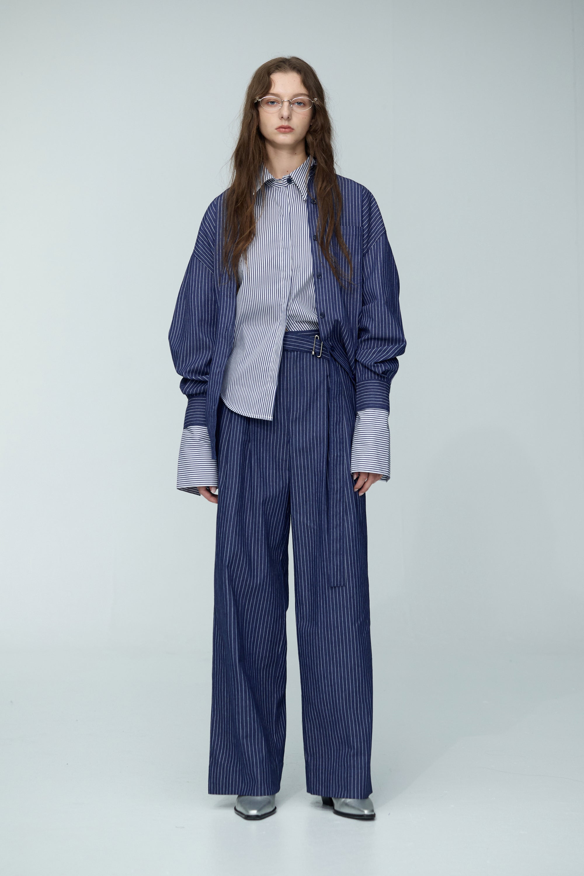 圓領條紋彈性褶皺收腰上衣(附項鍊)-藍色