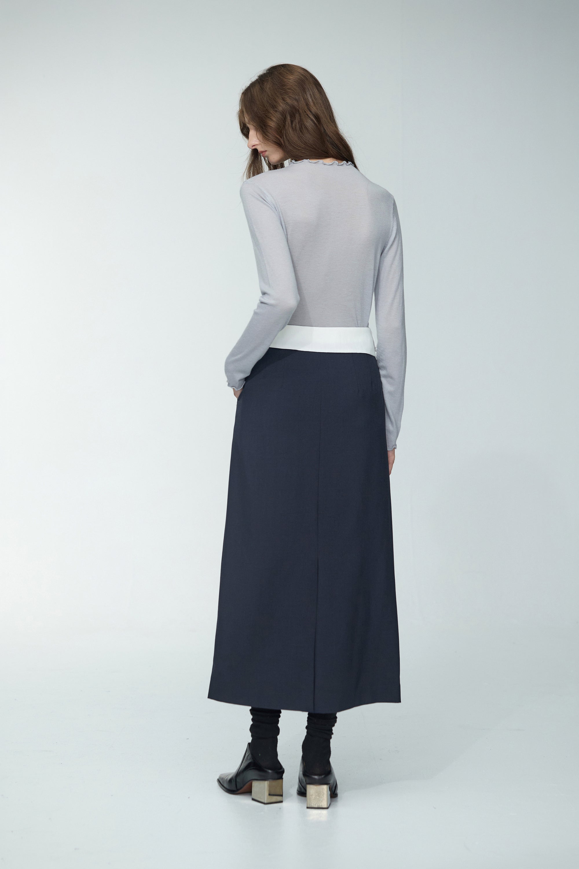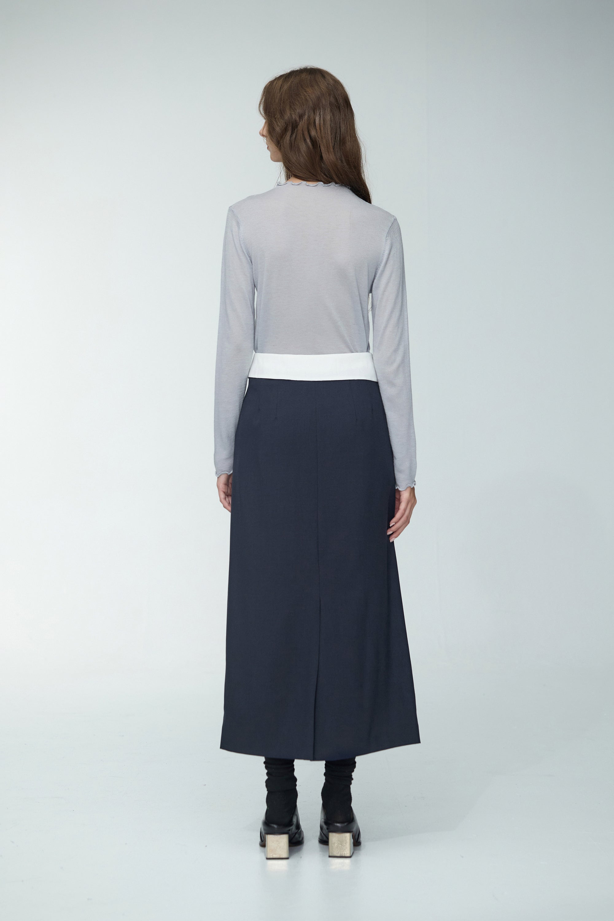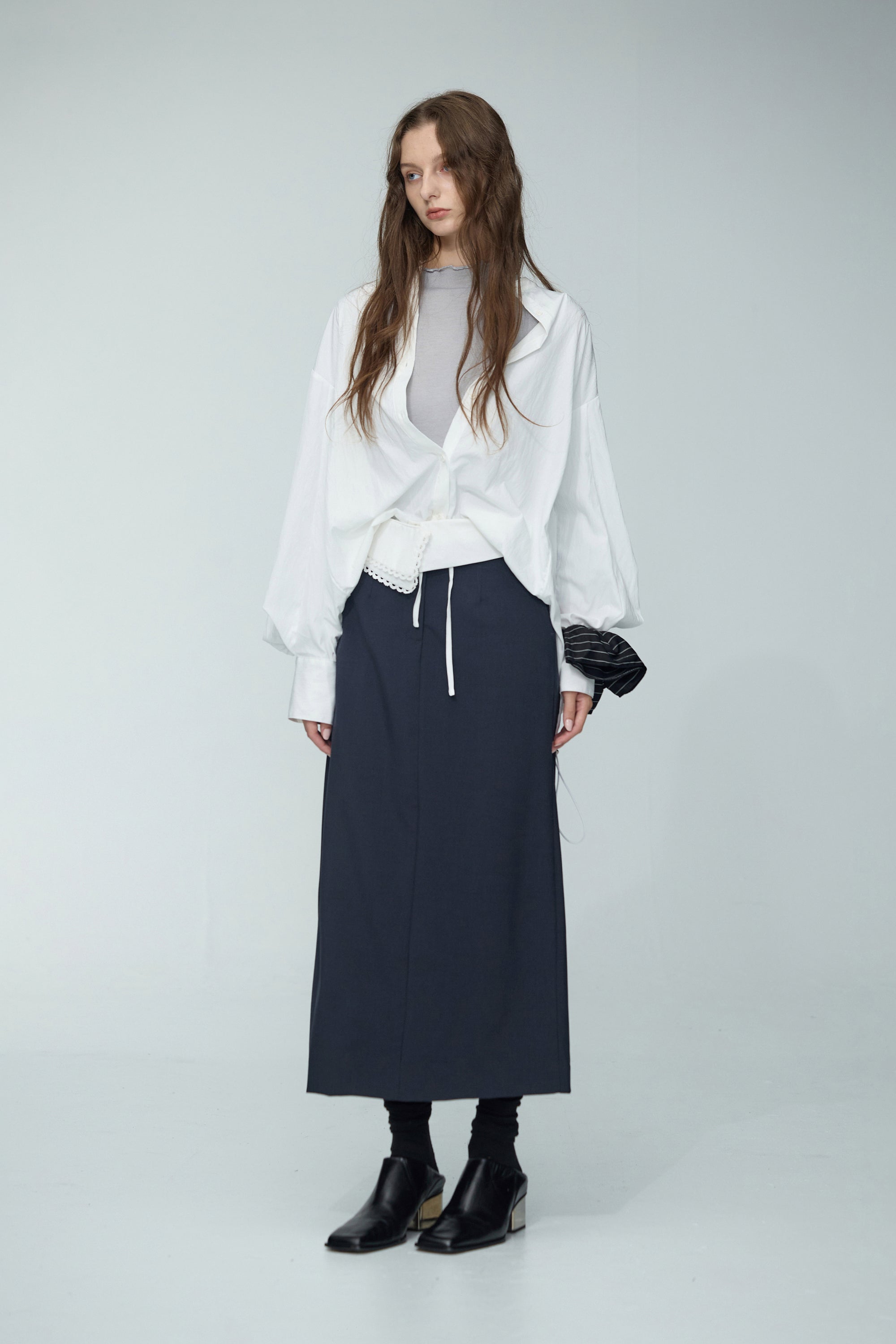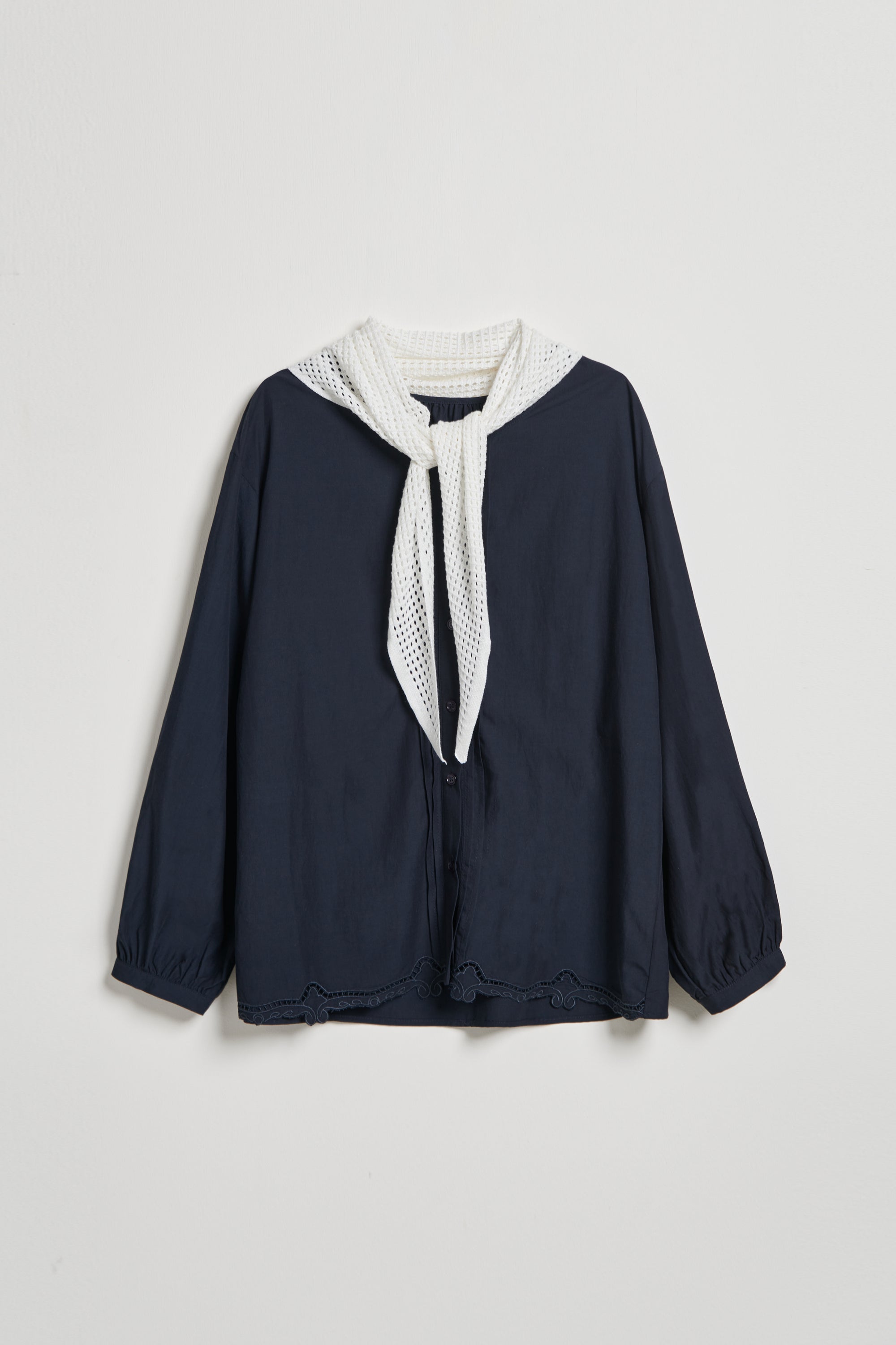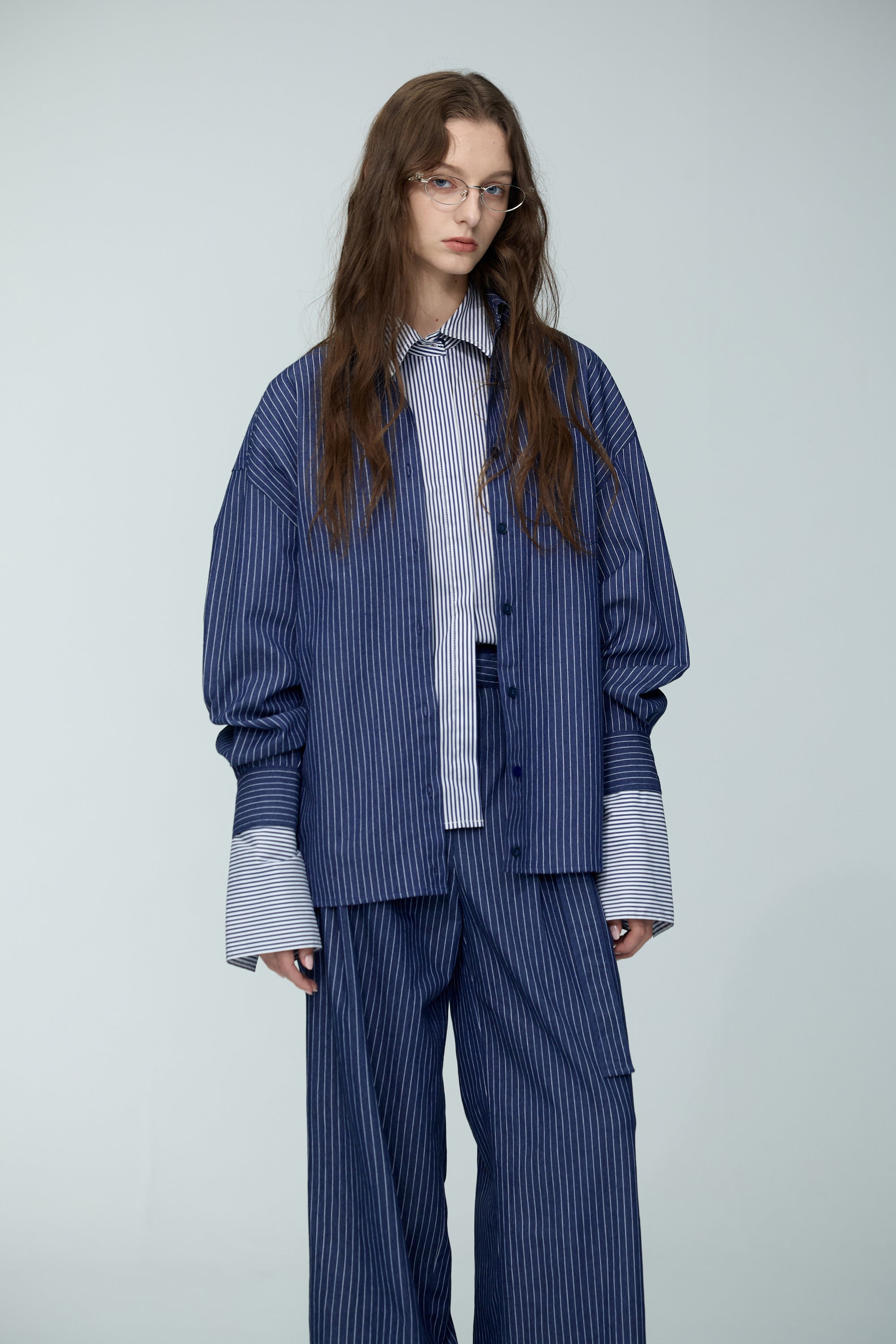 圓領條紋彈性褶皺收腰上衣(附項鍊)-藍色
