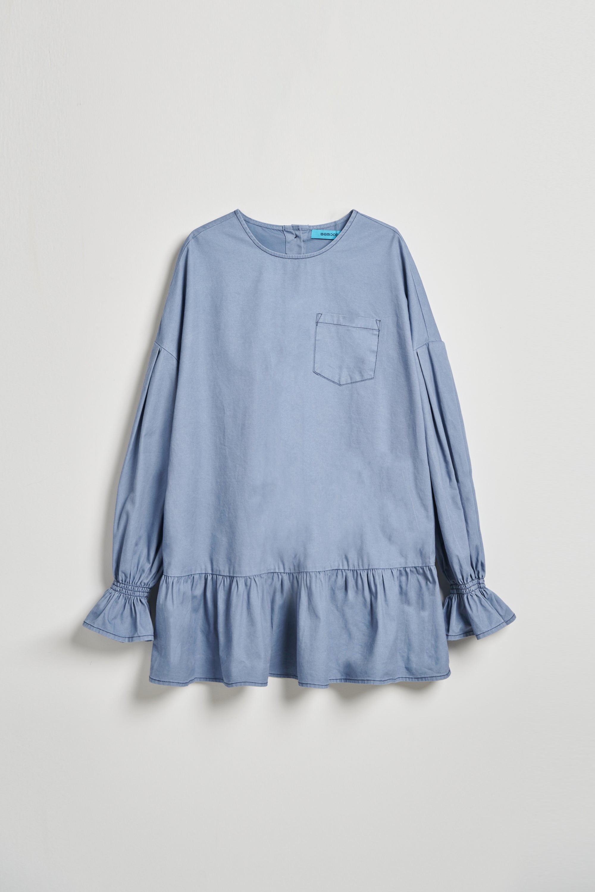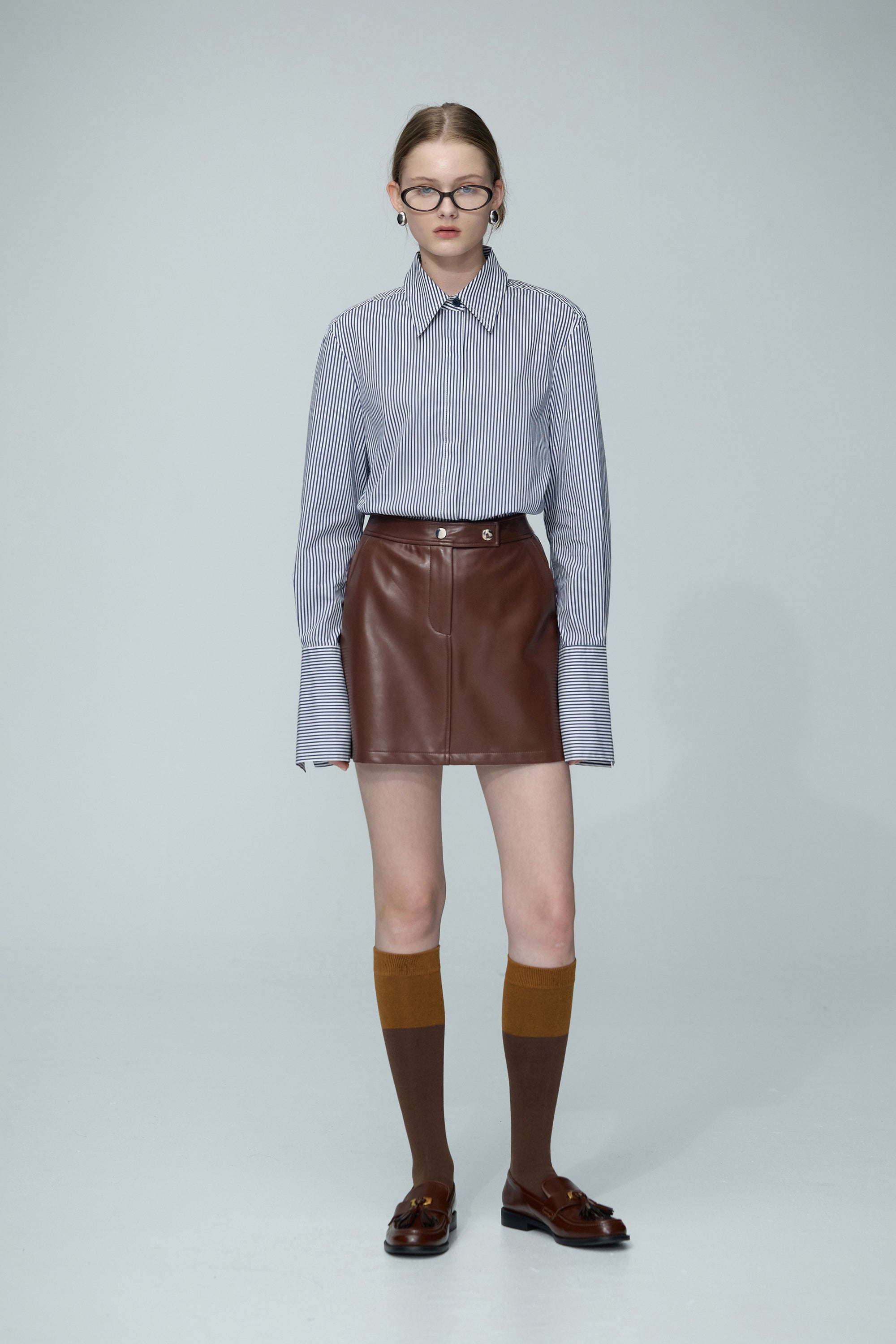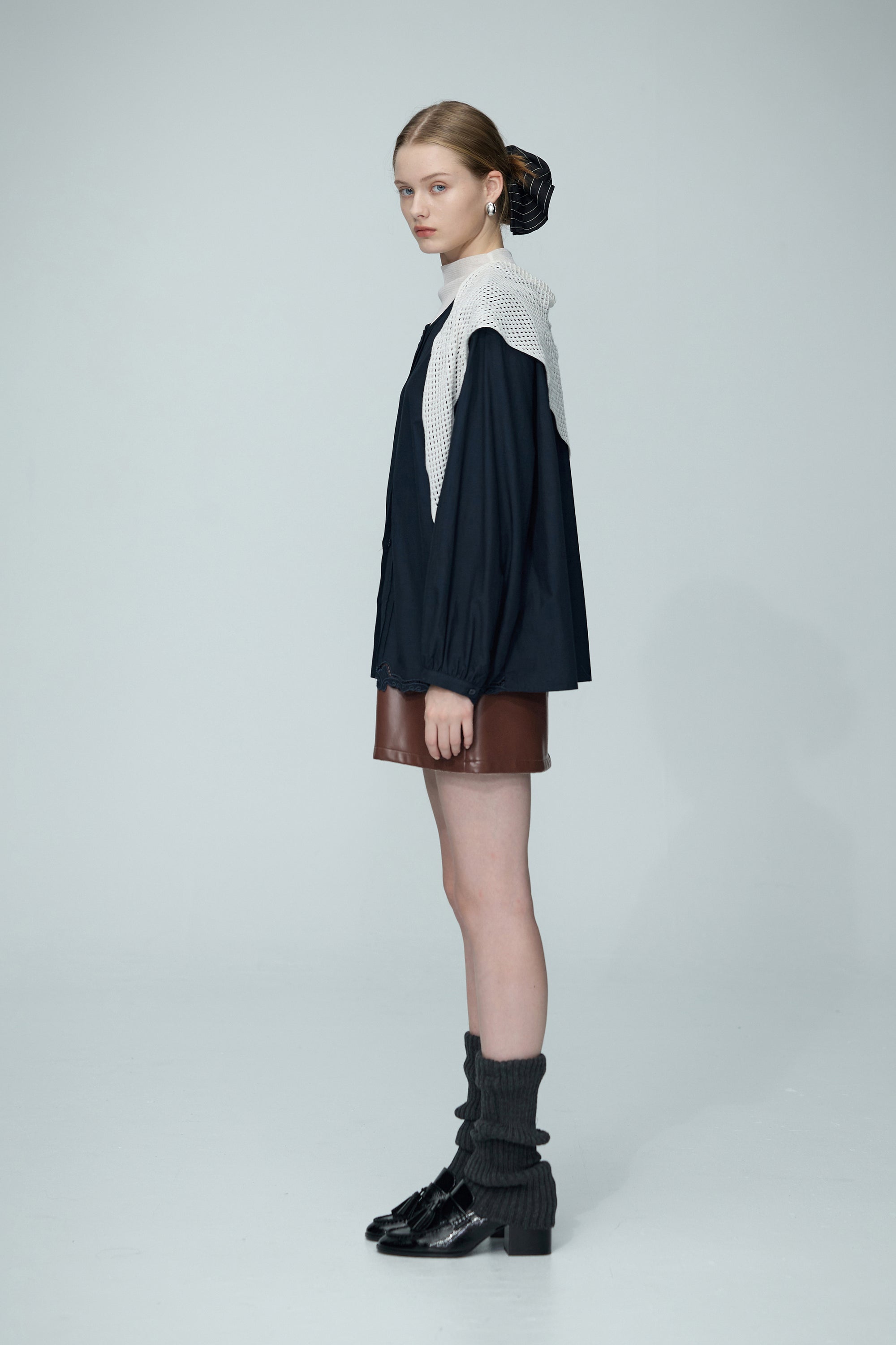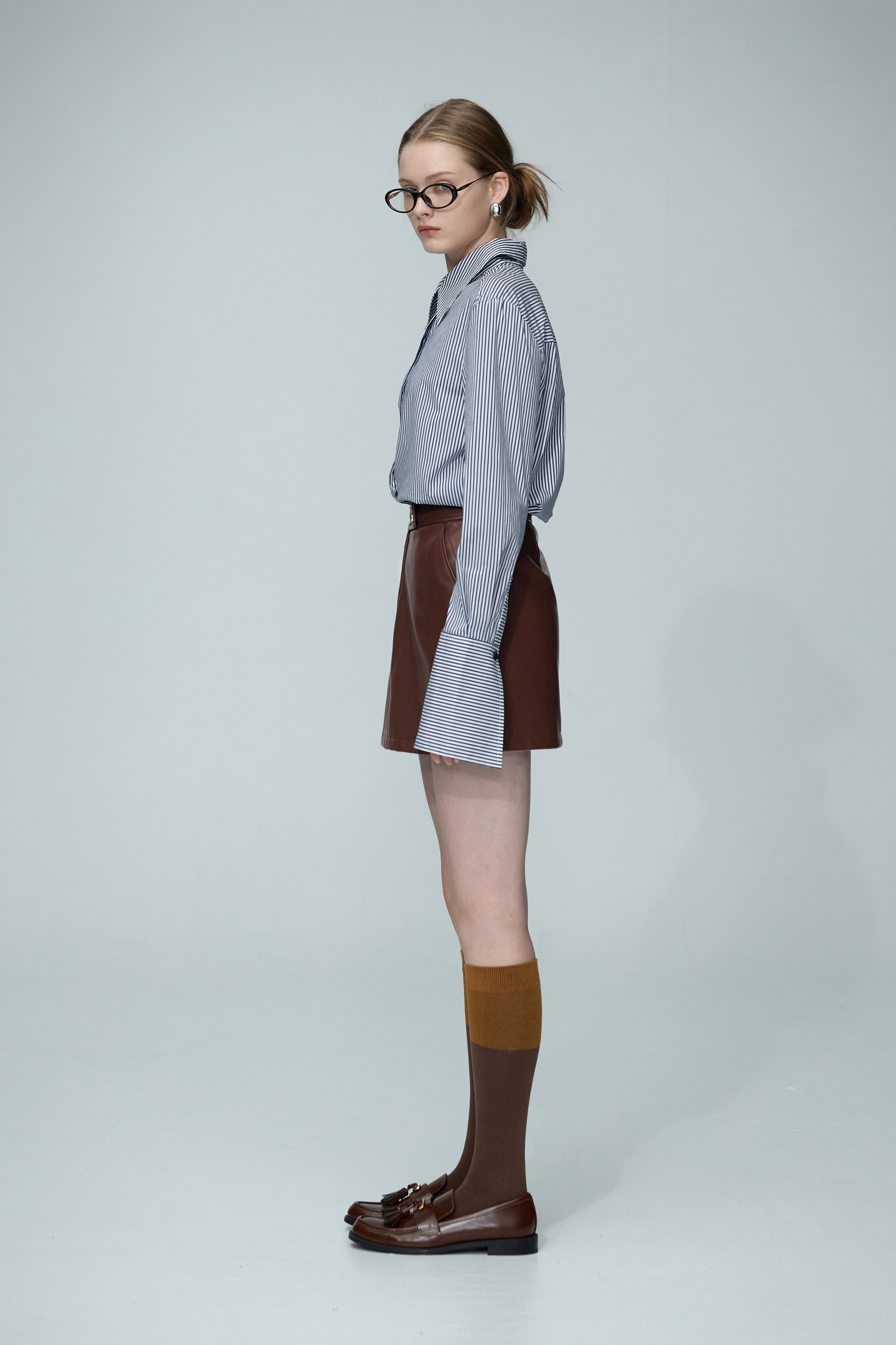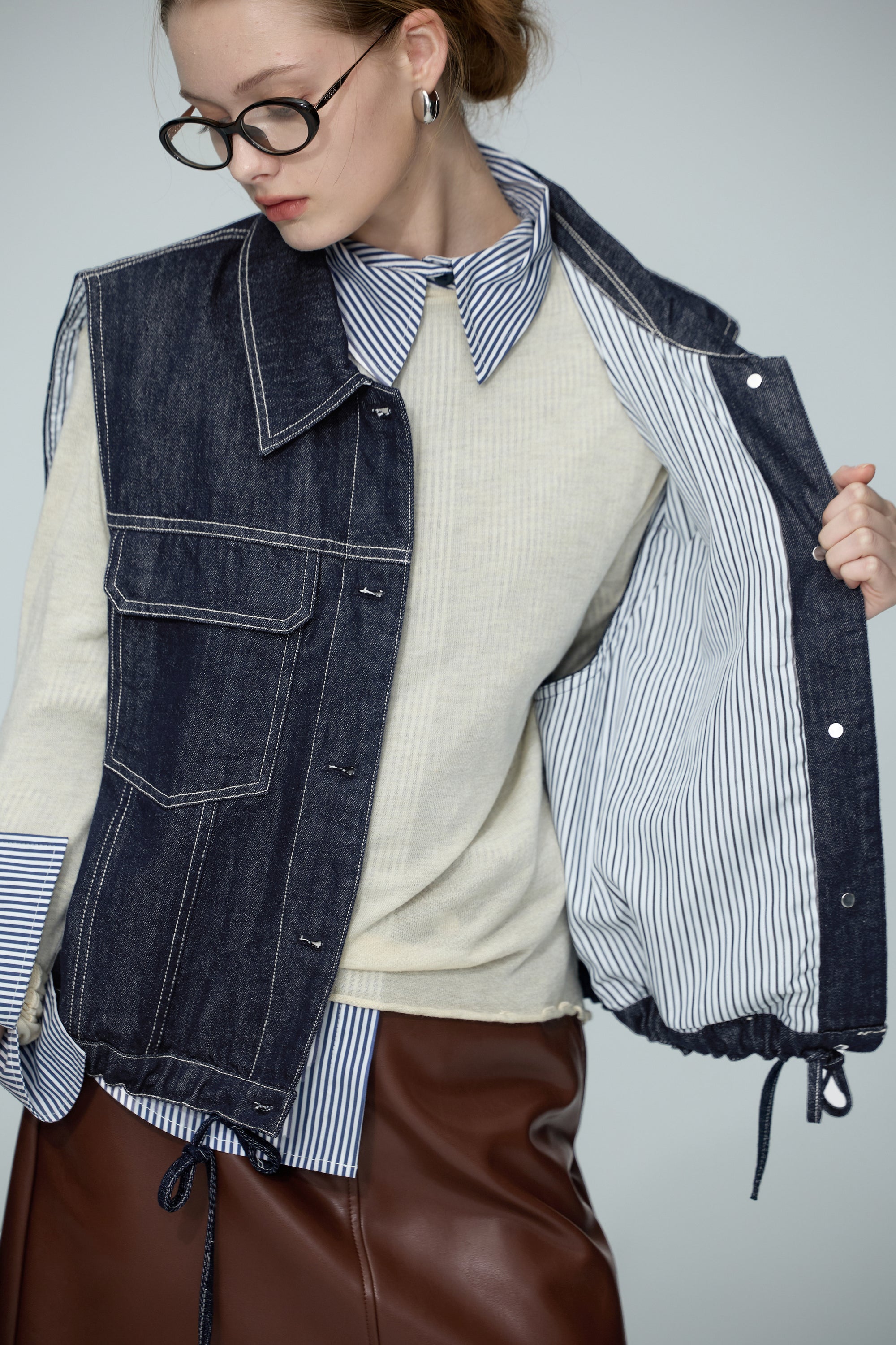 圓領條紋彈性褶皺收腰上衣(附項鍊)-藍色