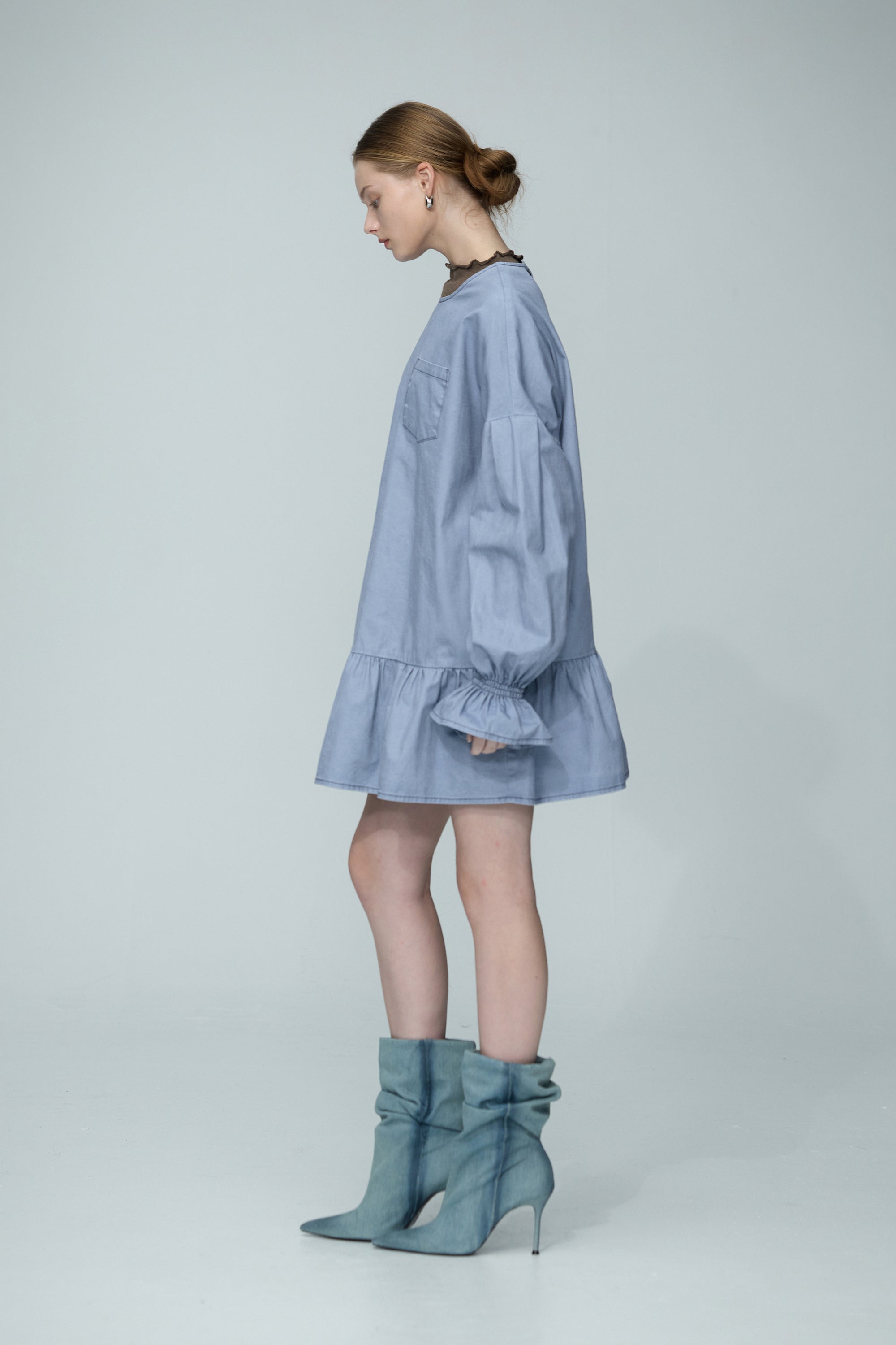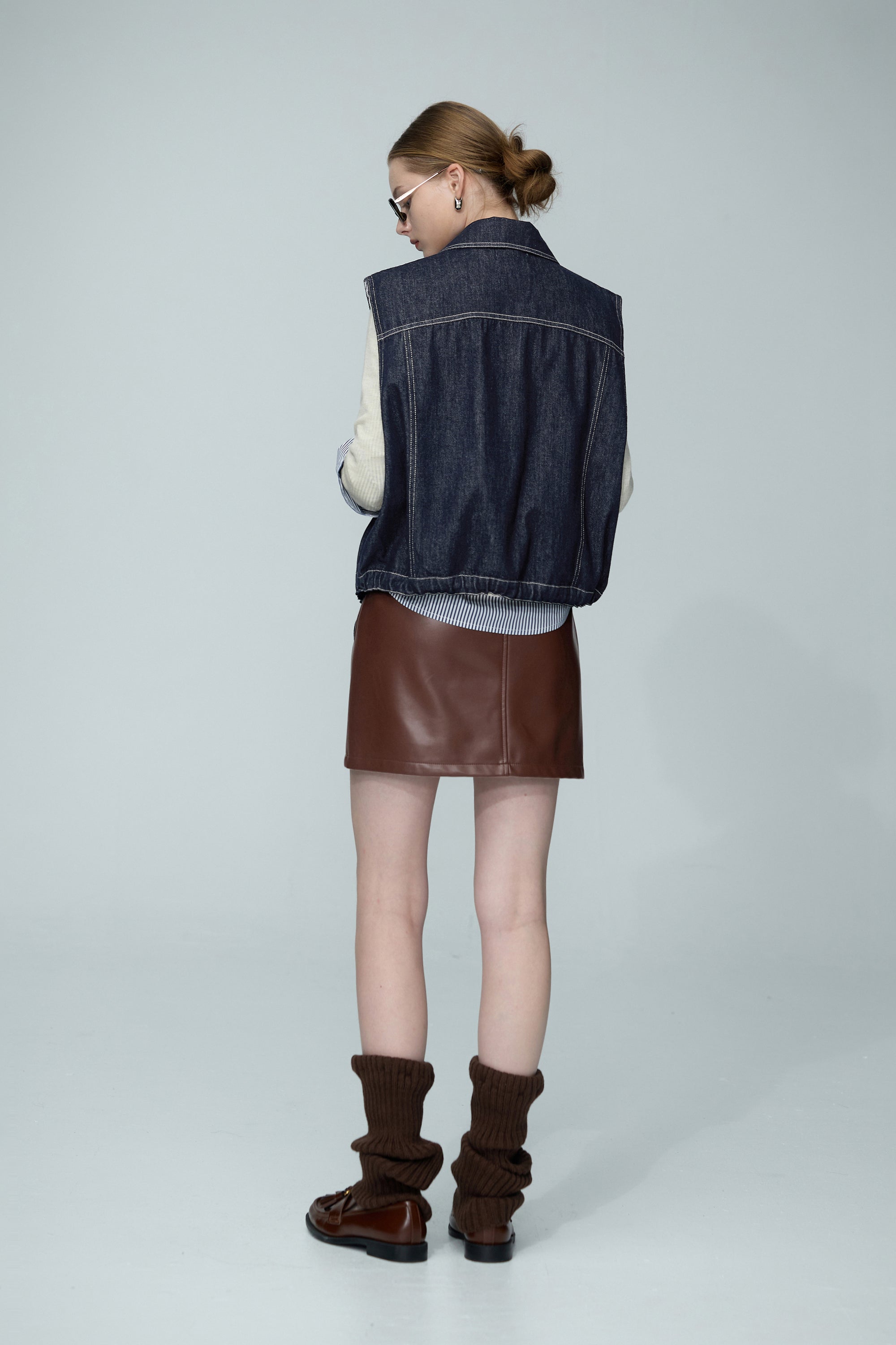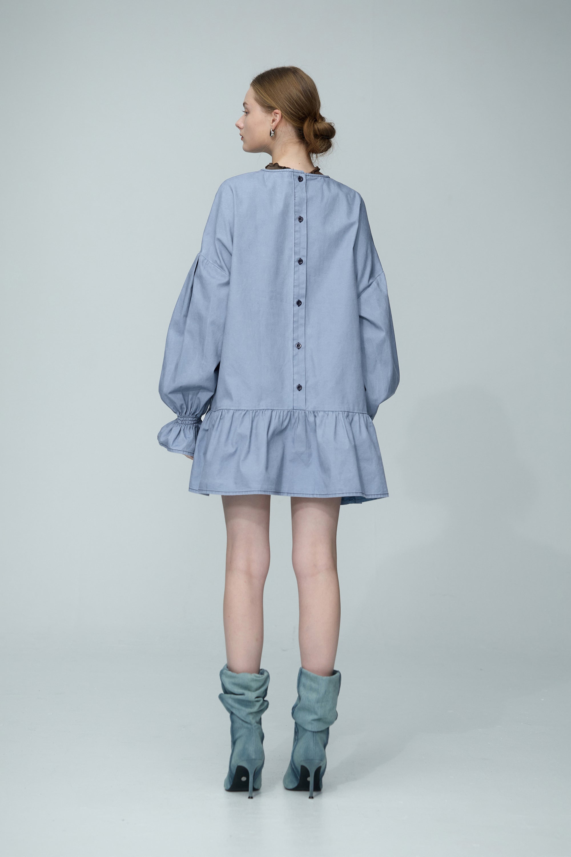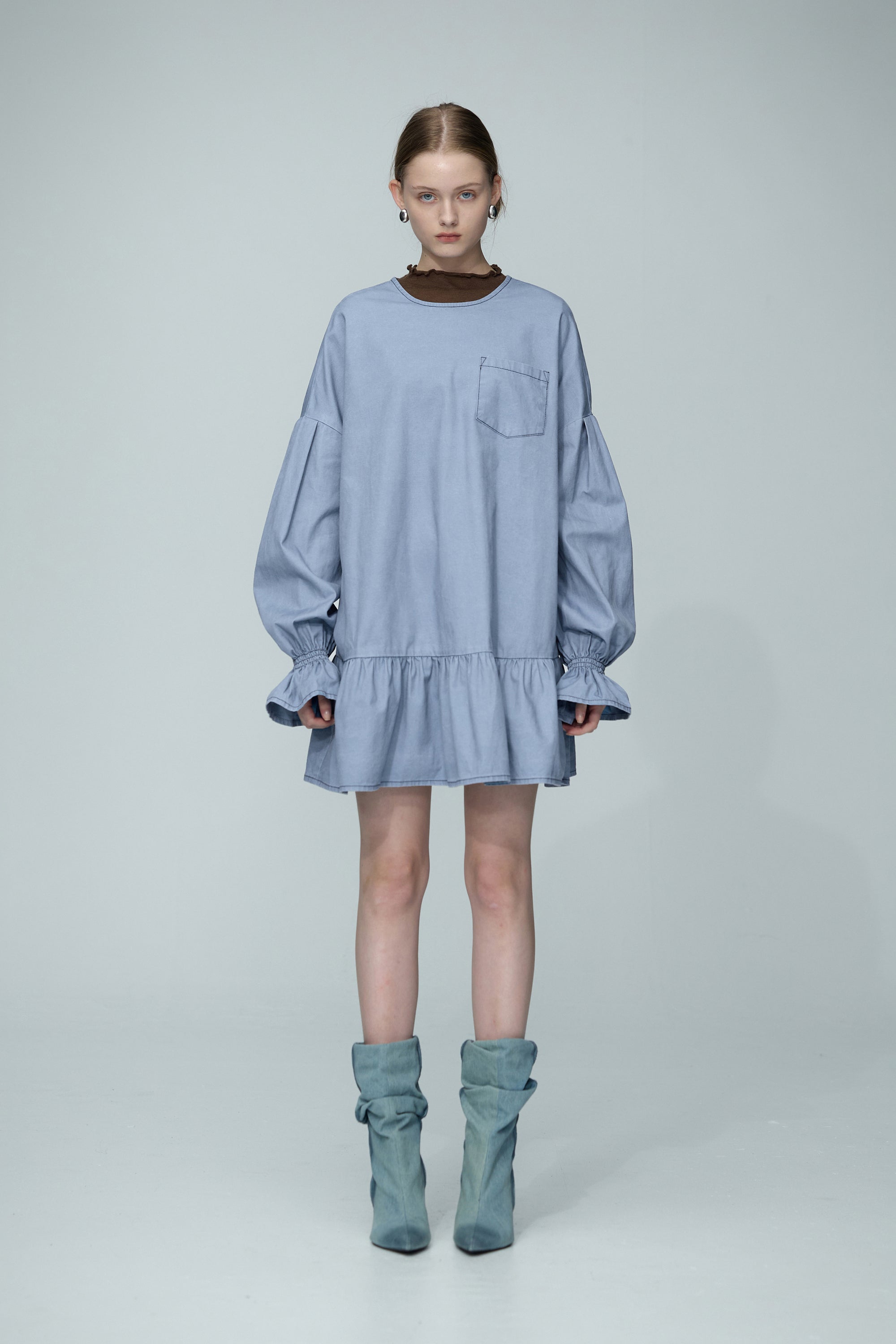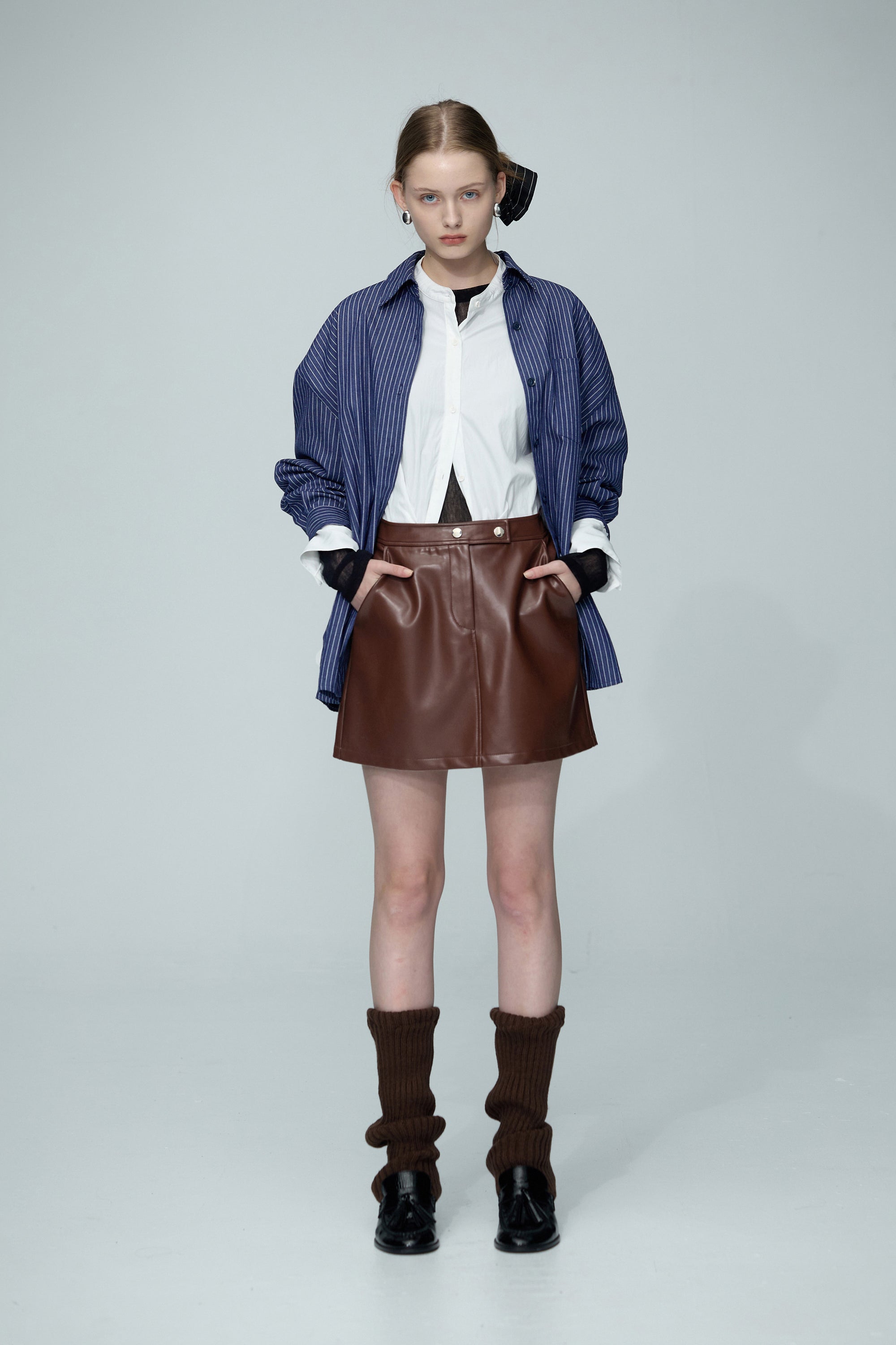 圓領條紋彈性褶皺收腰上衣(附項鍊)-藍色