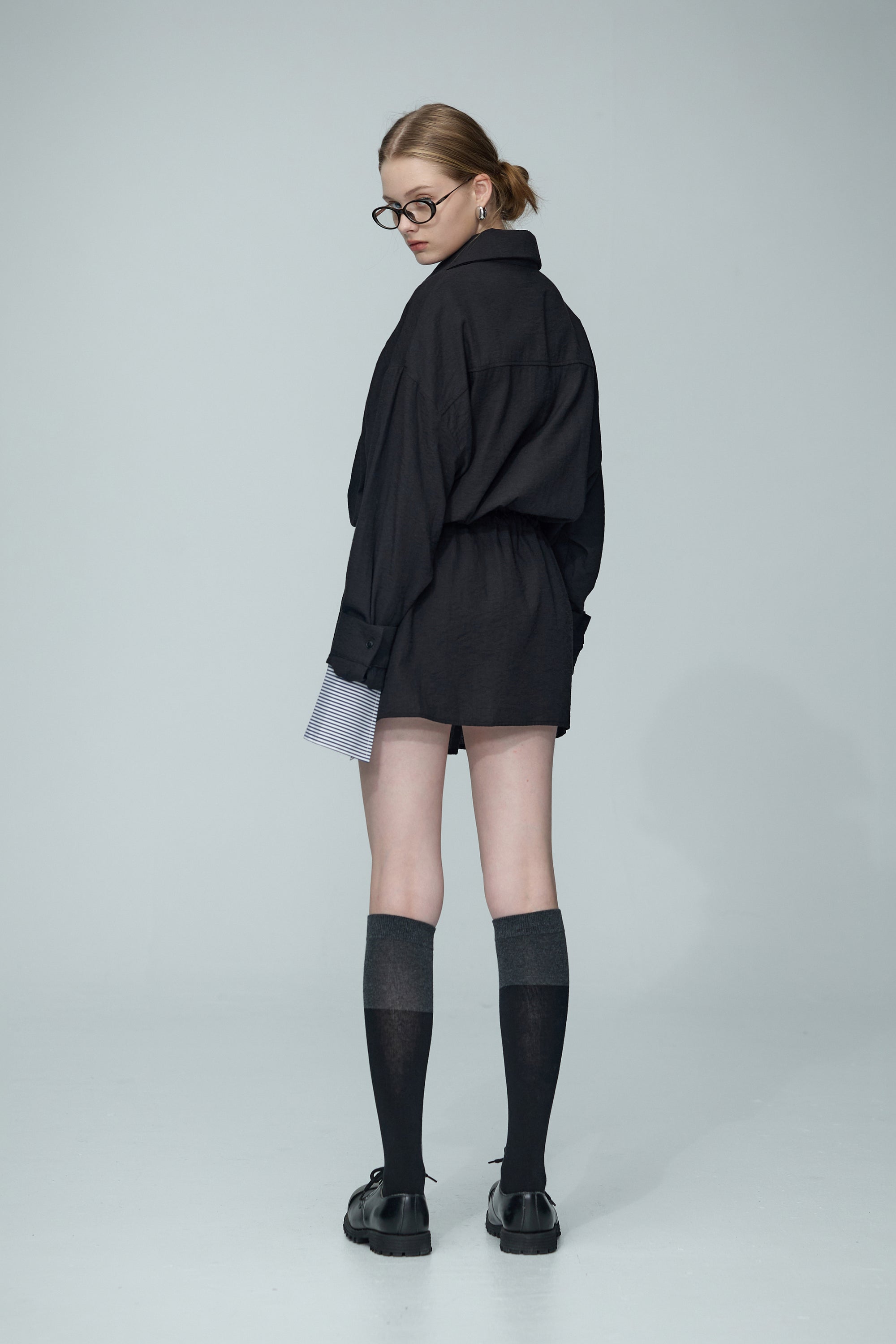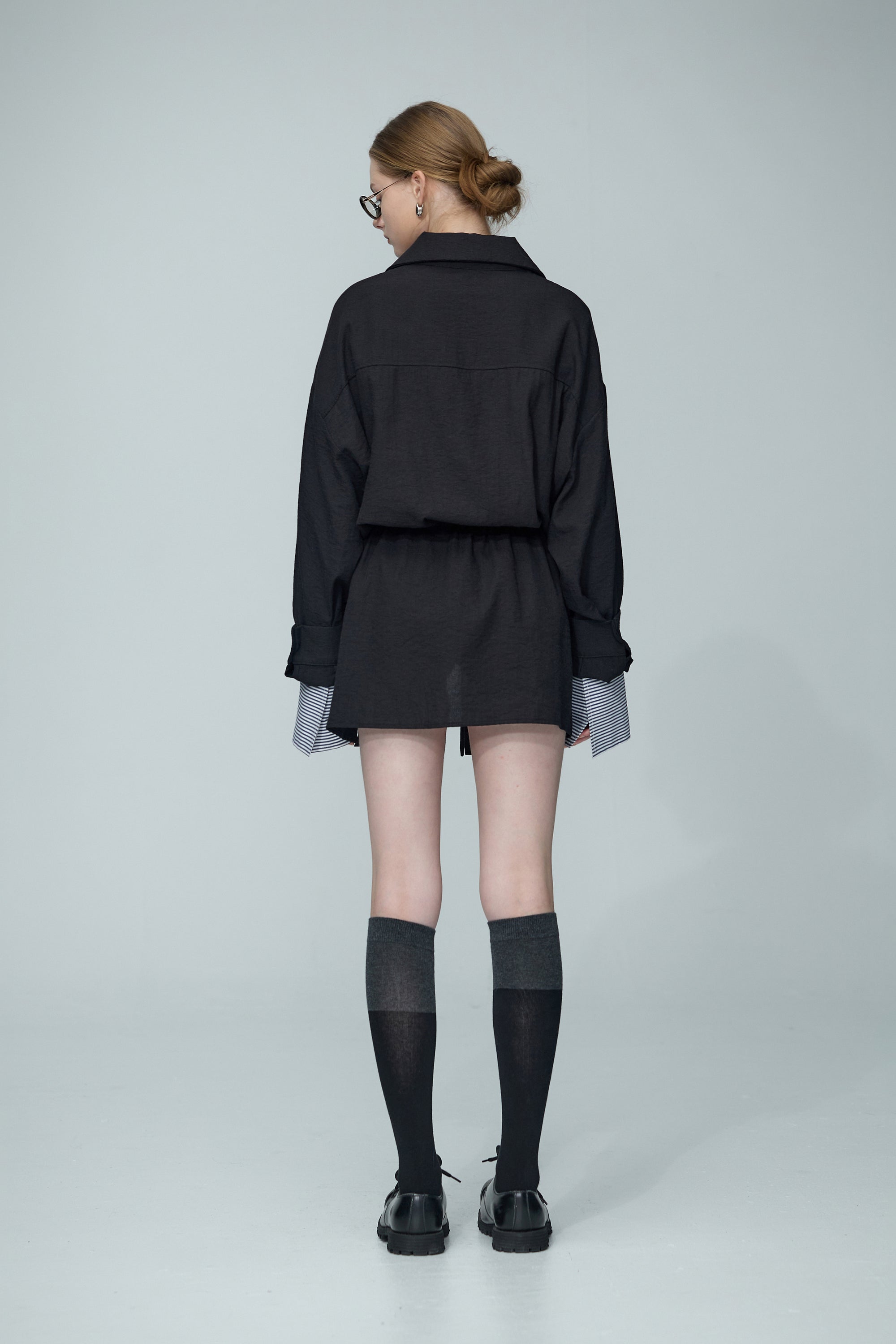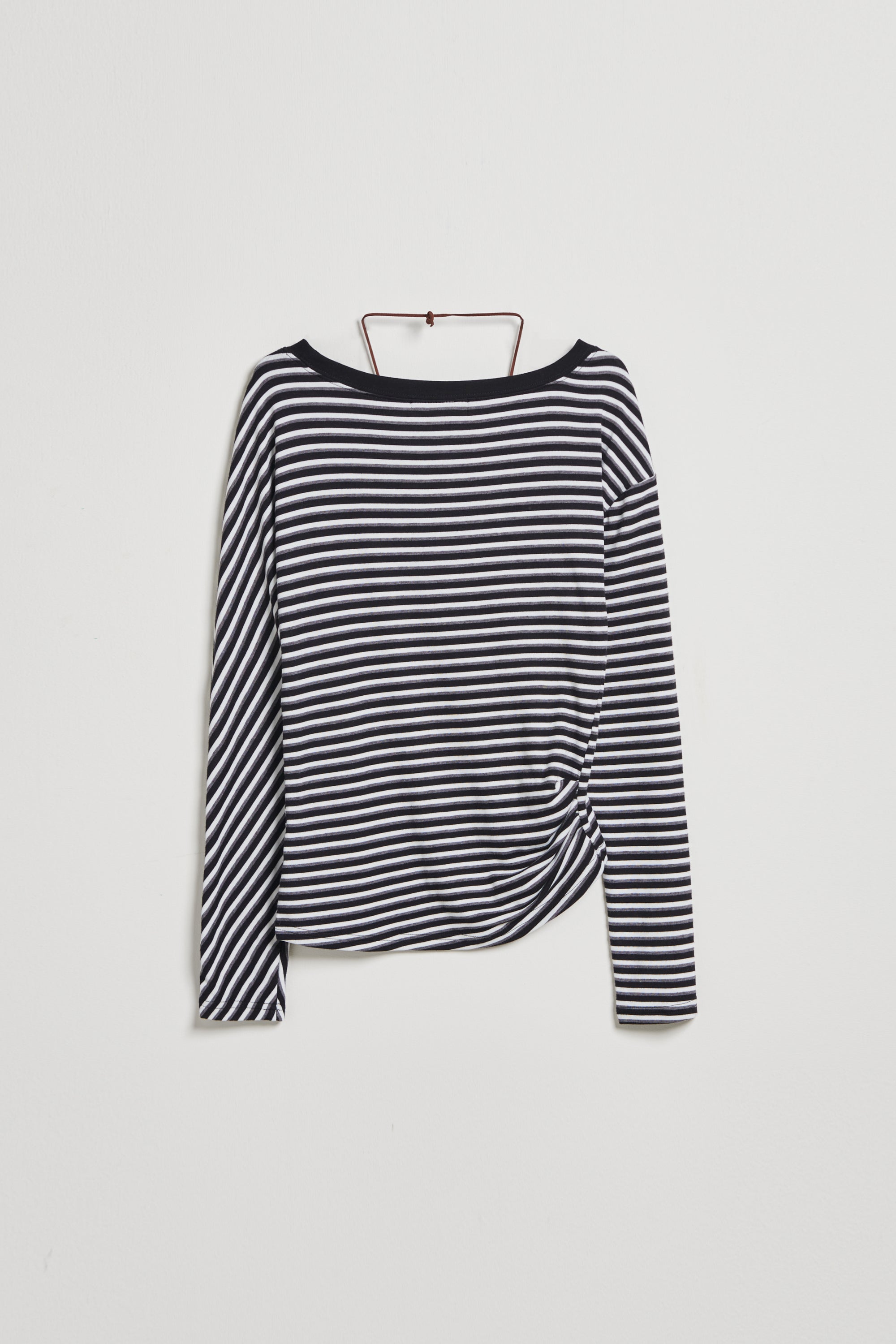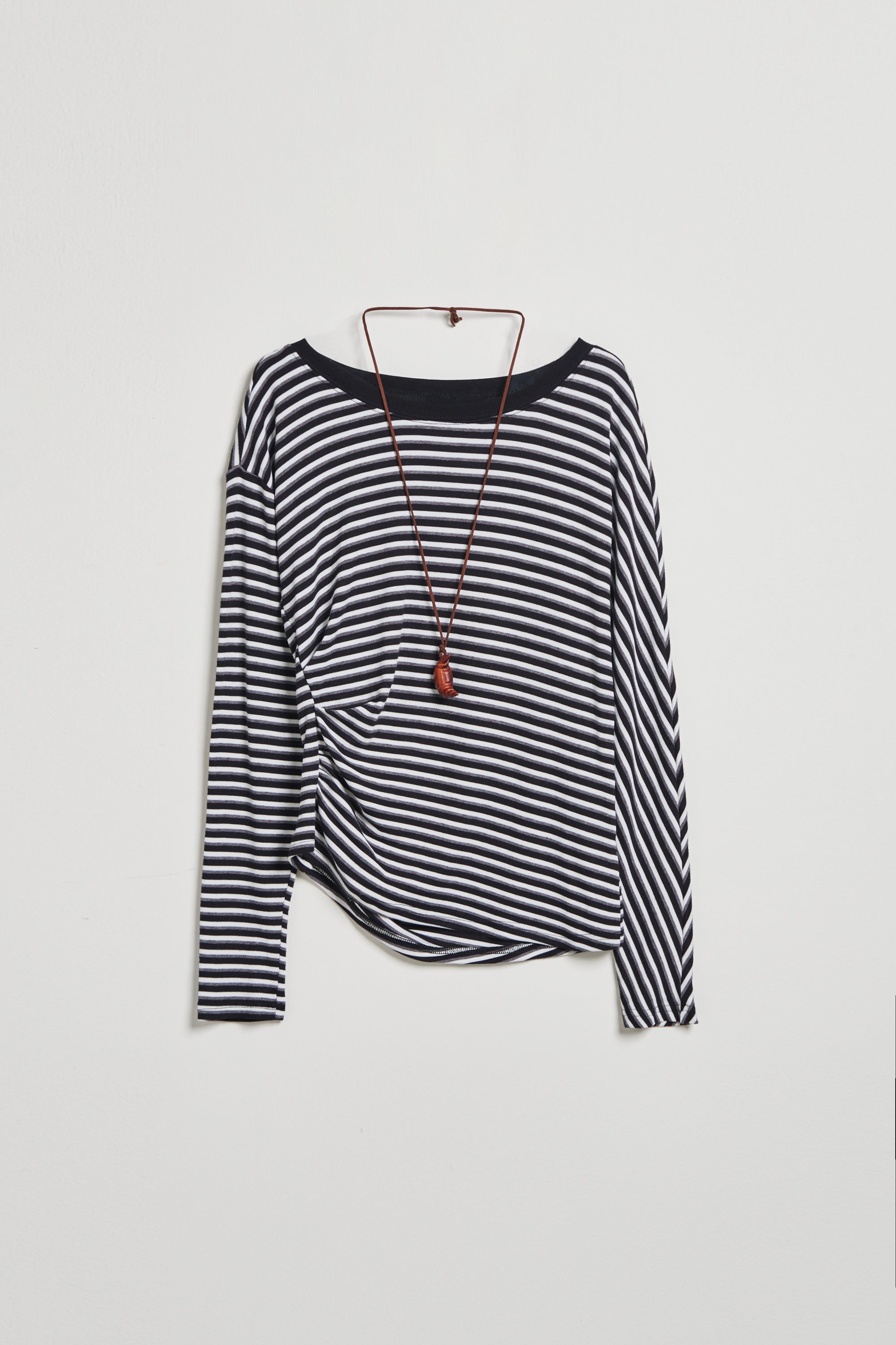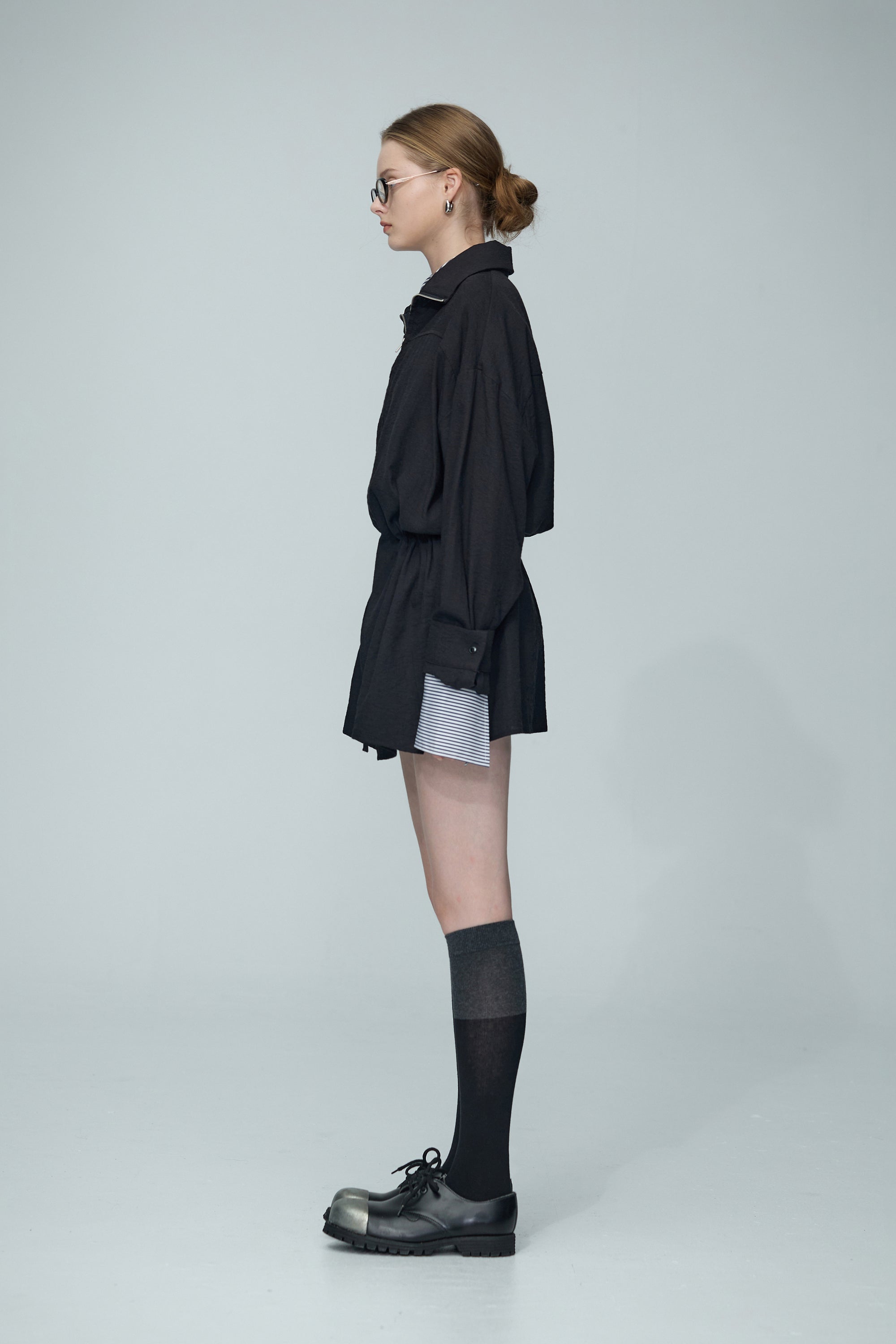 圓領條紋彈性褶皺收腰上衣(附項鍊)-黑