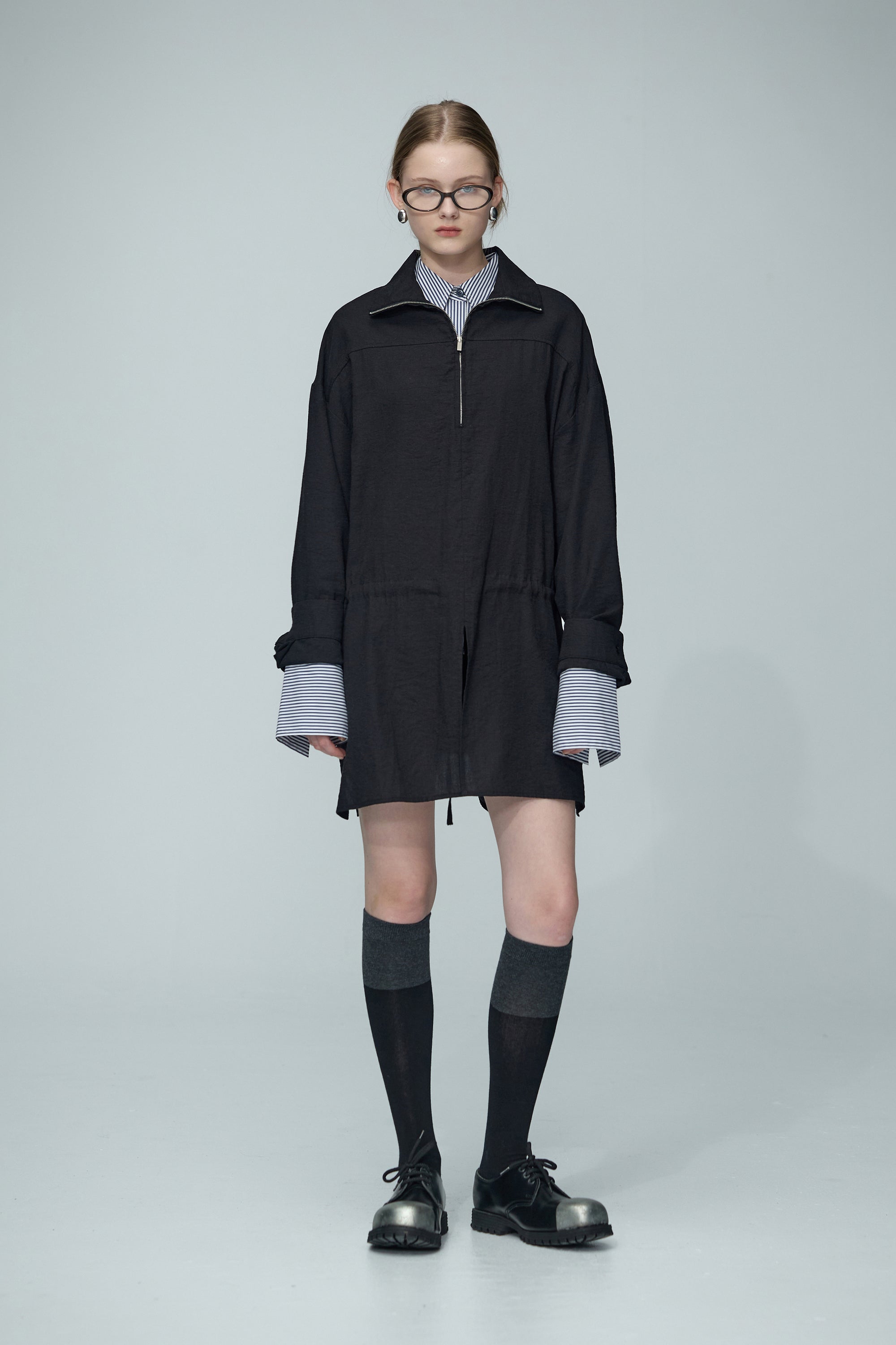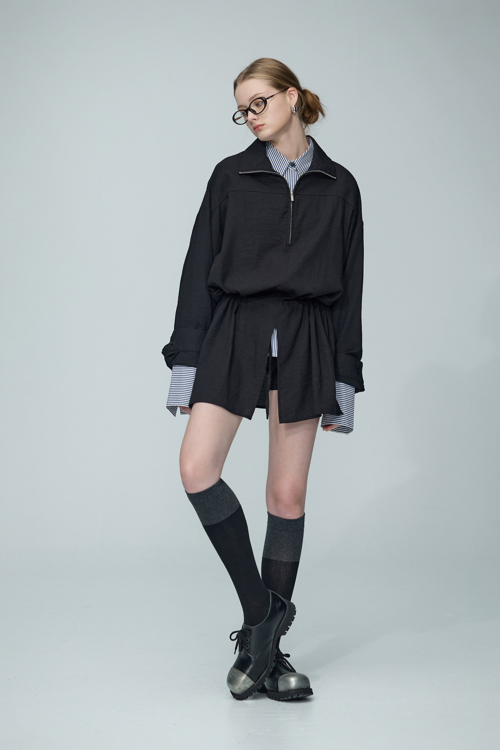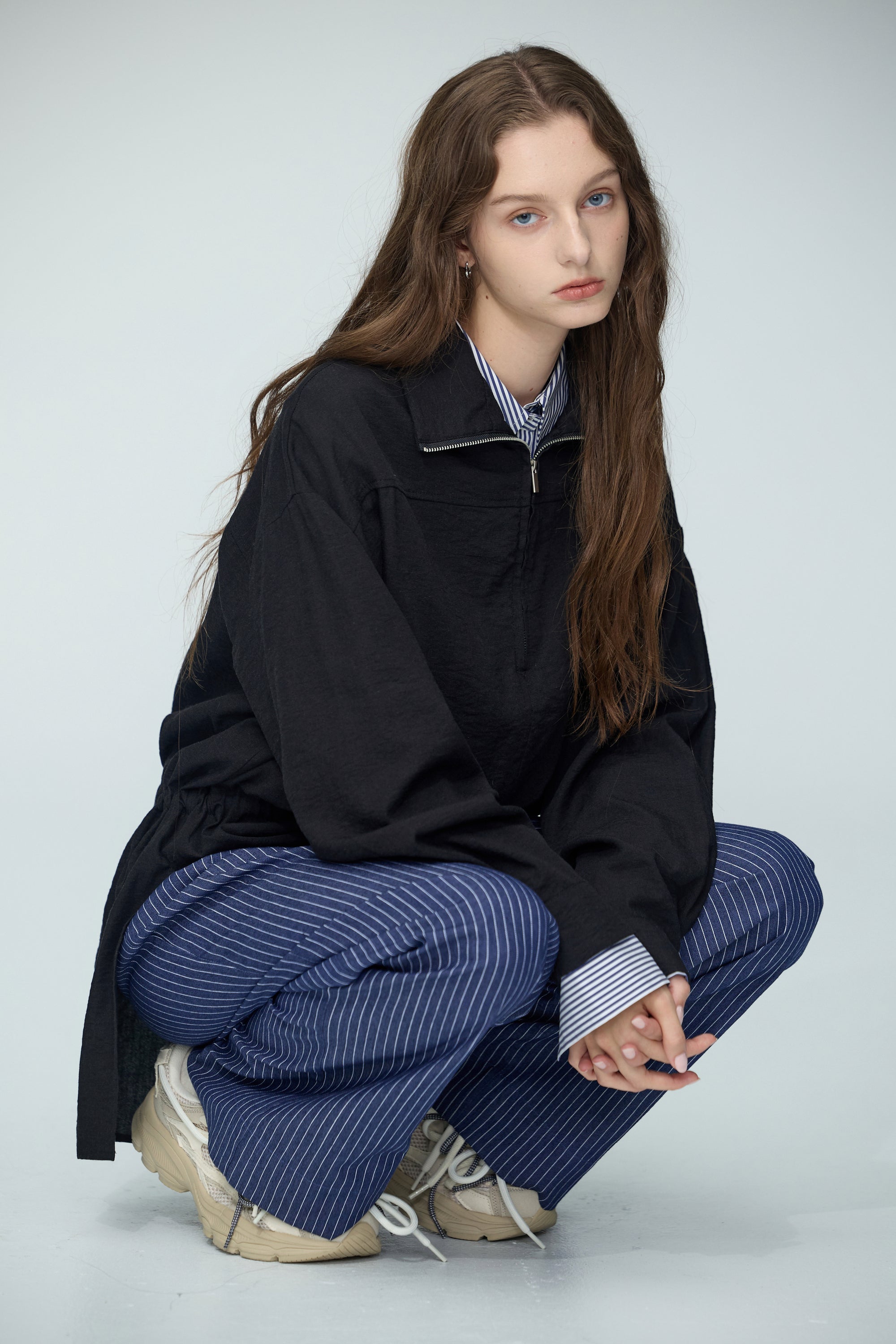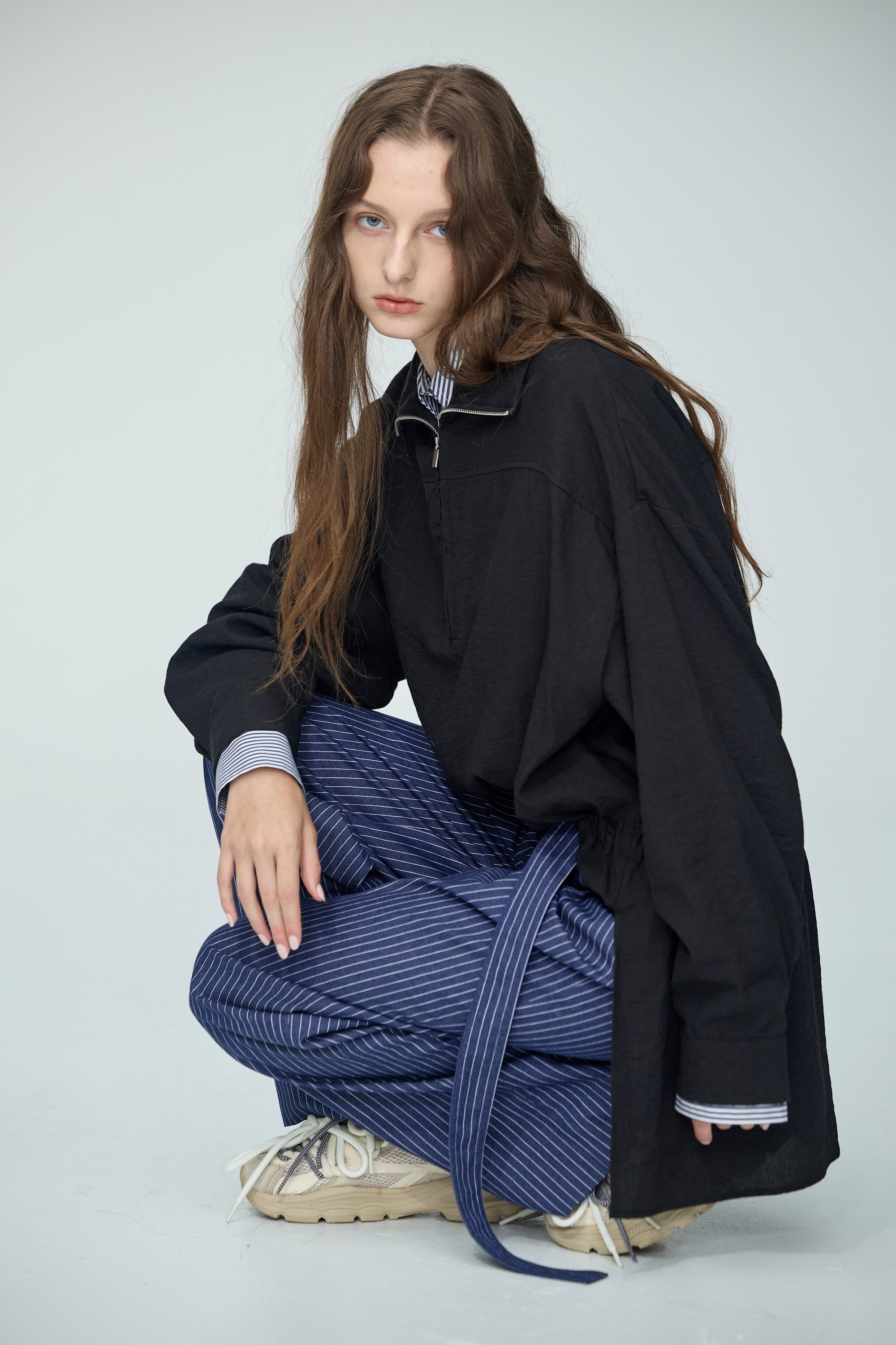 圓領條紋彈性褶皺收腰上衣(附項鍊)-黑