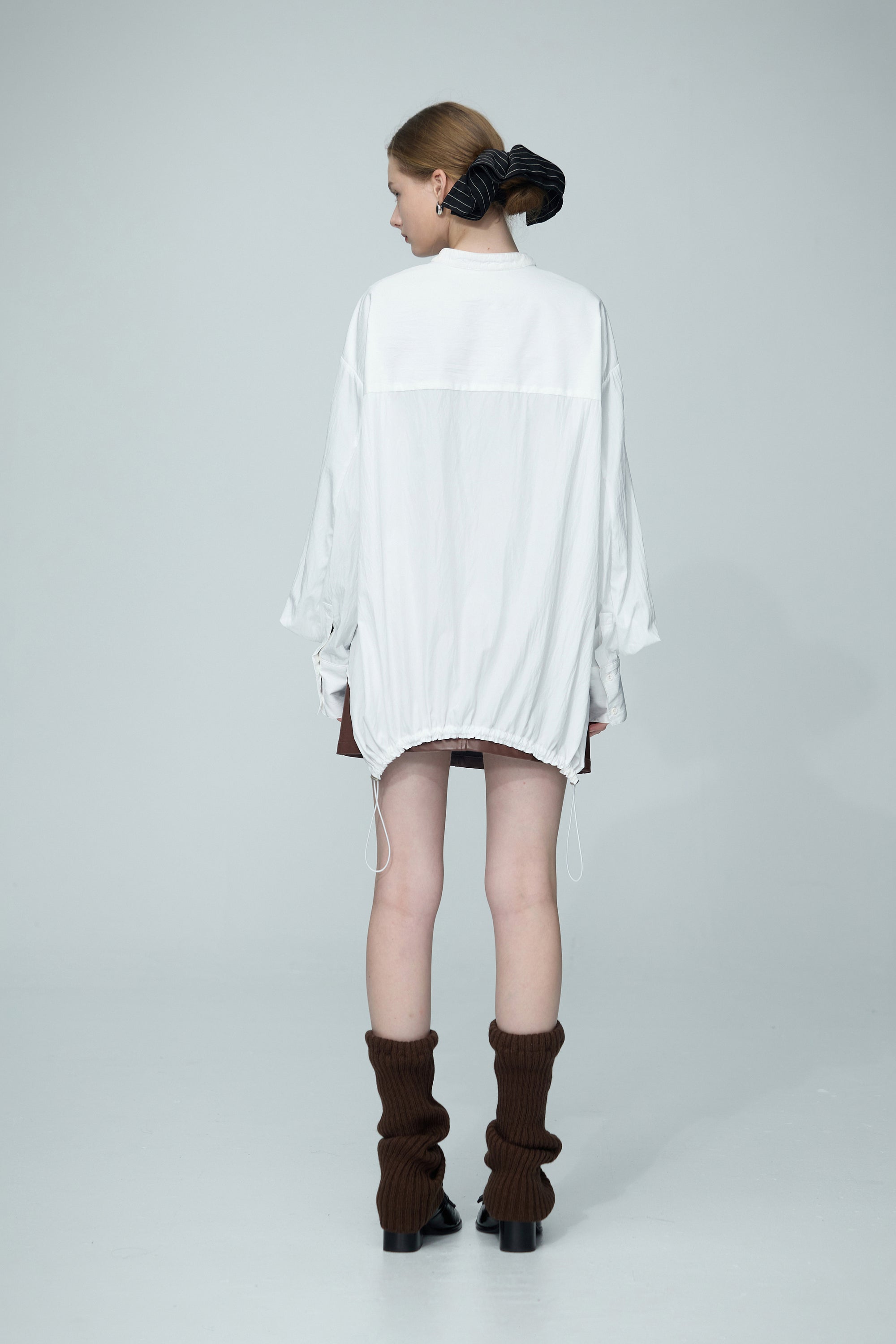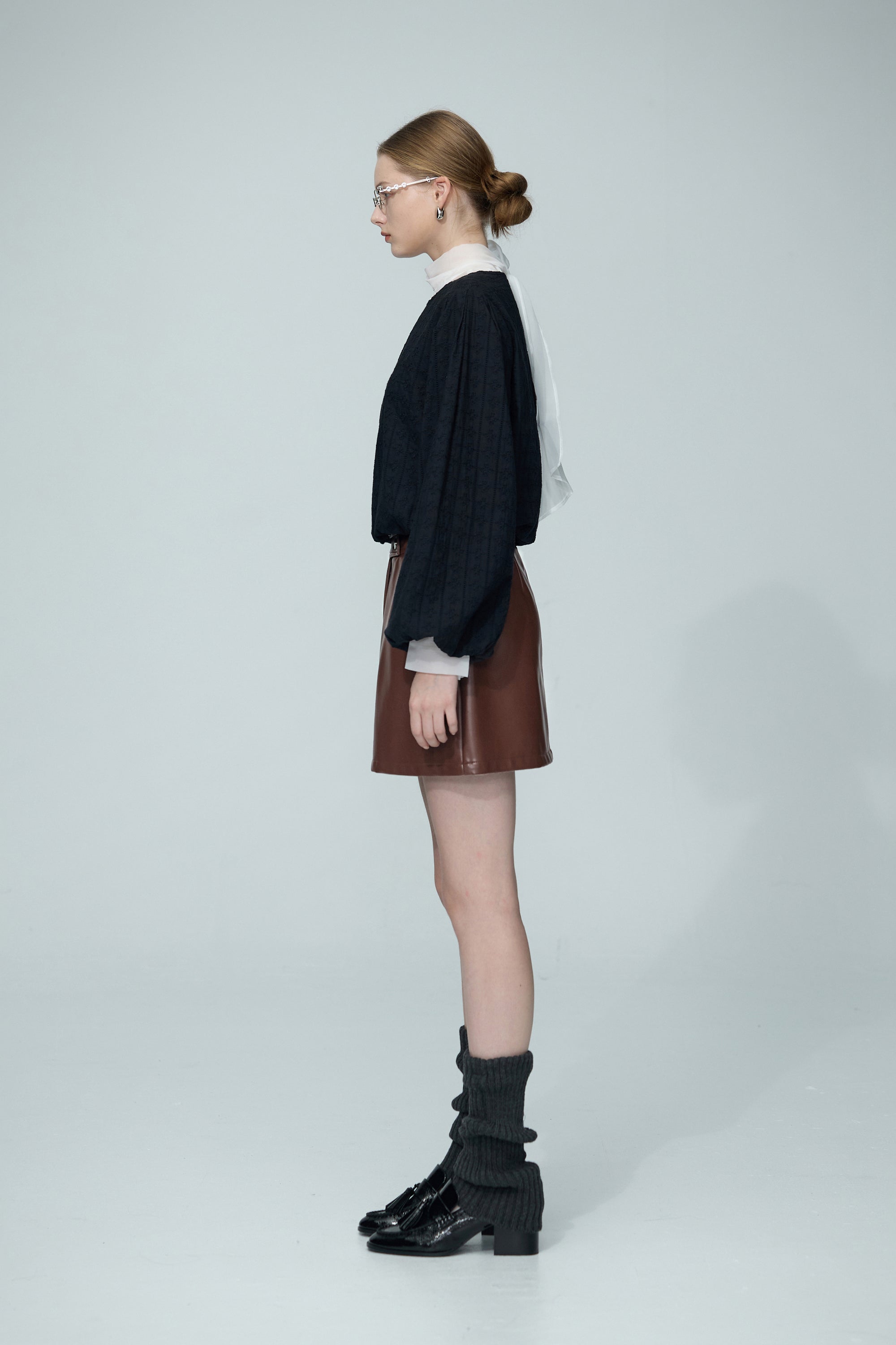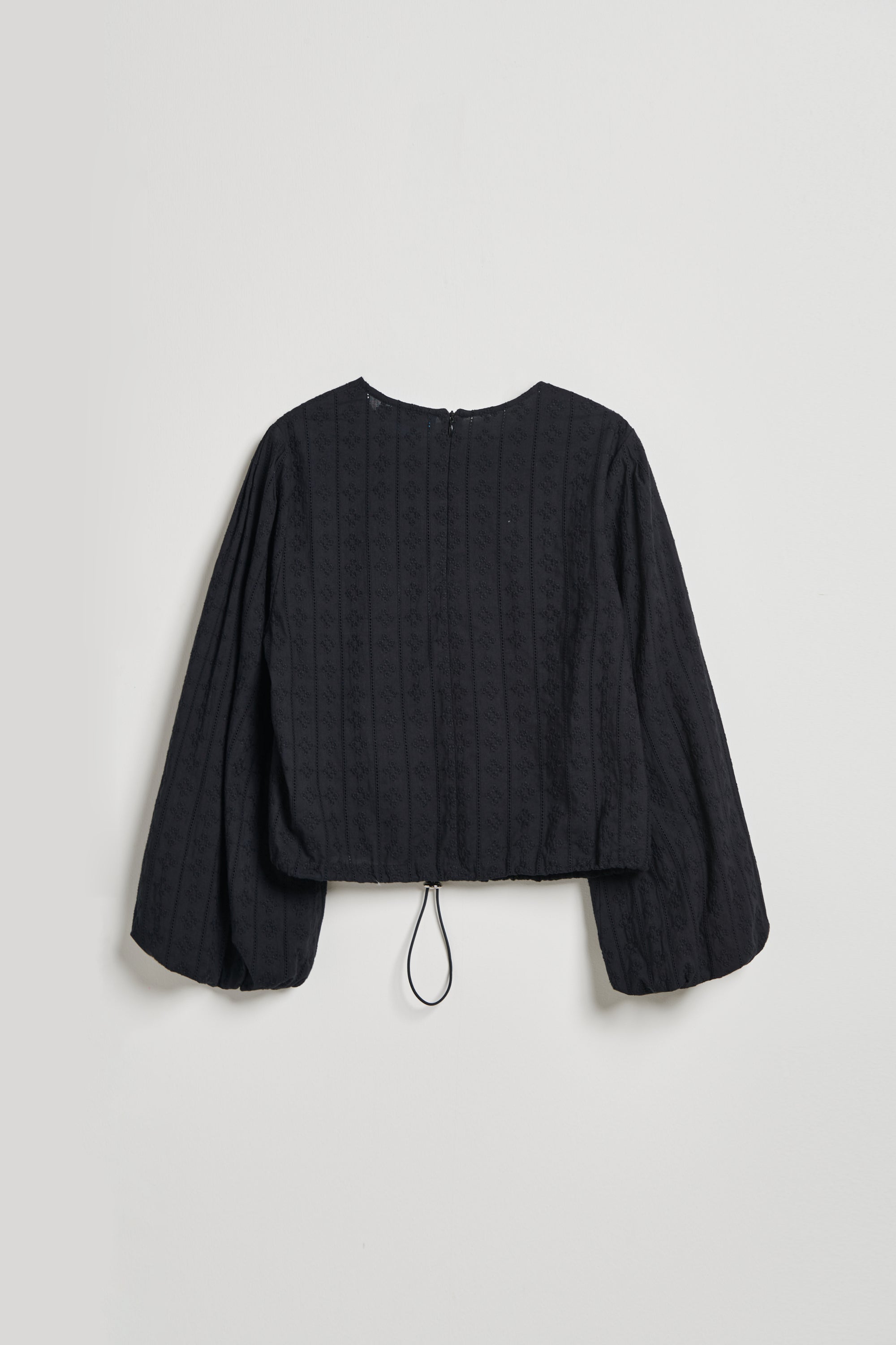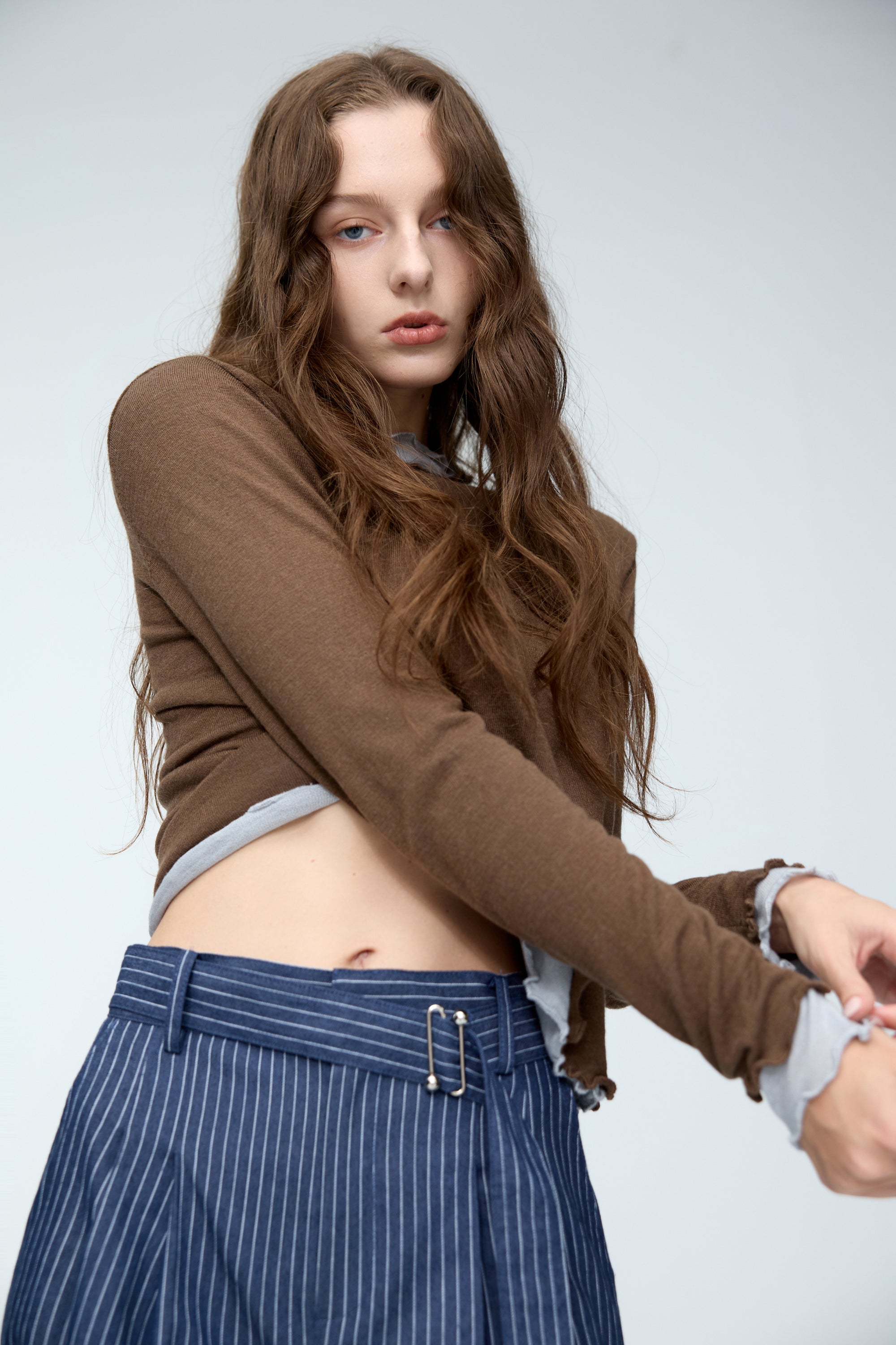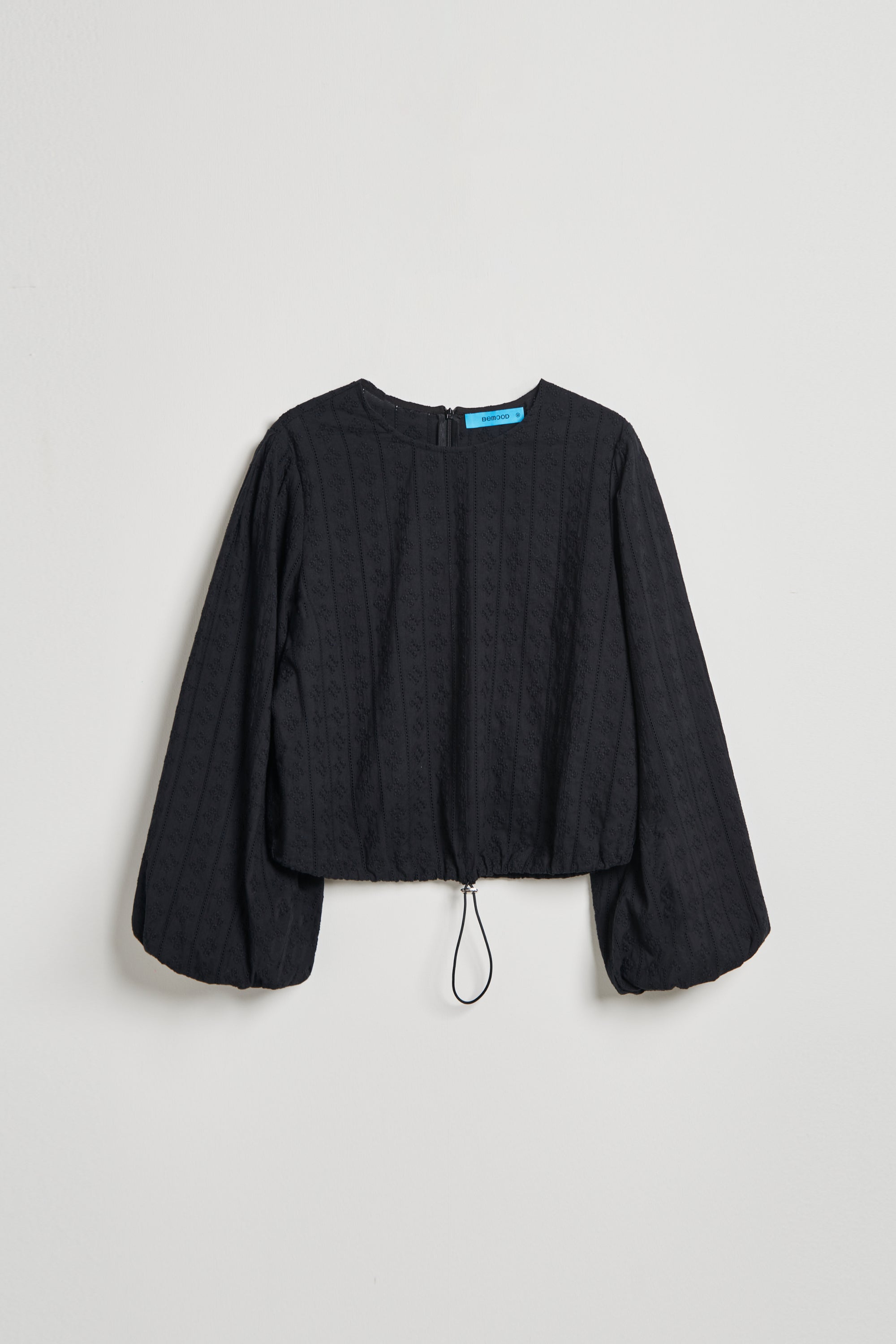 圓領條紋彈性褶皺收腰上衣(附項鍊)-黑