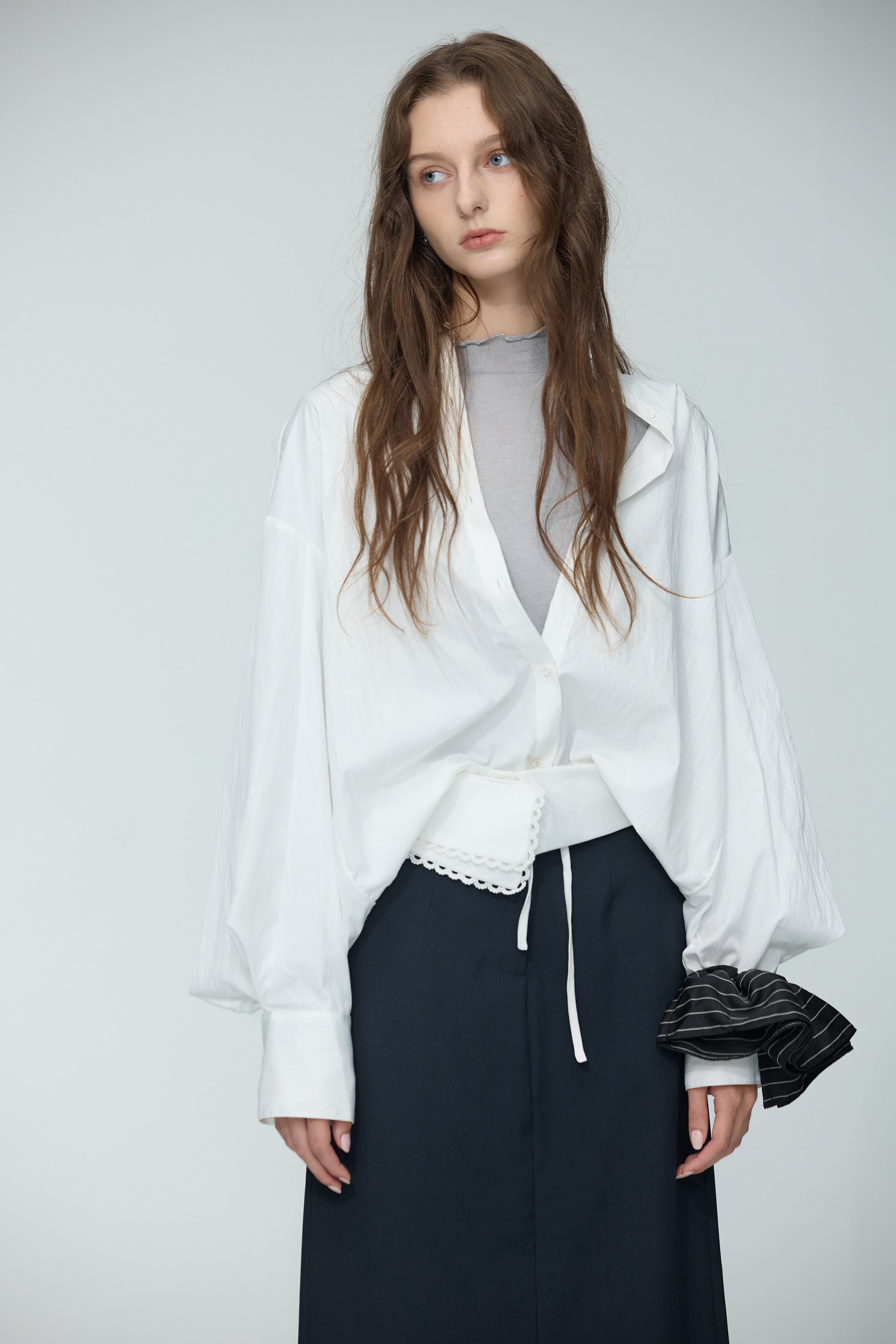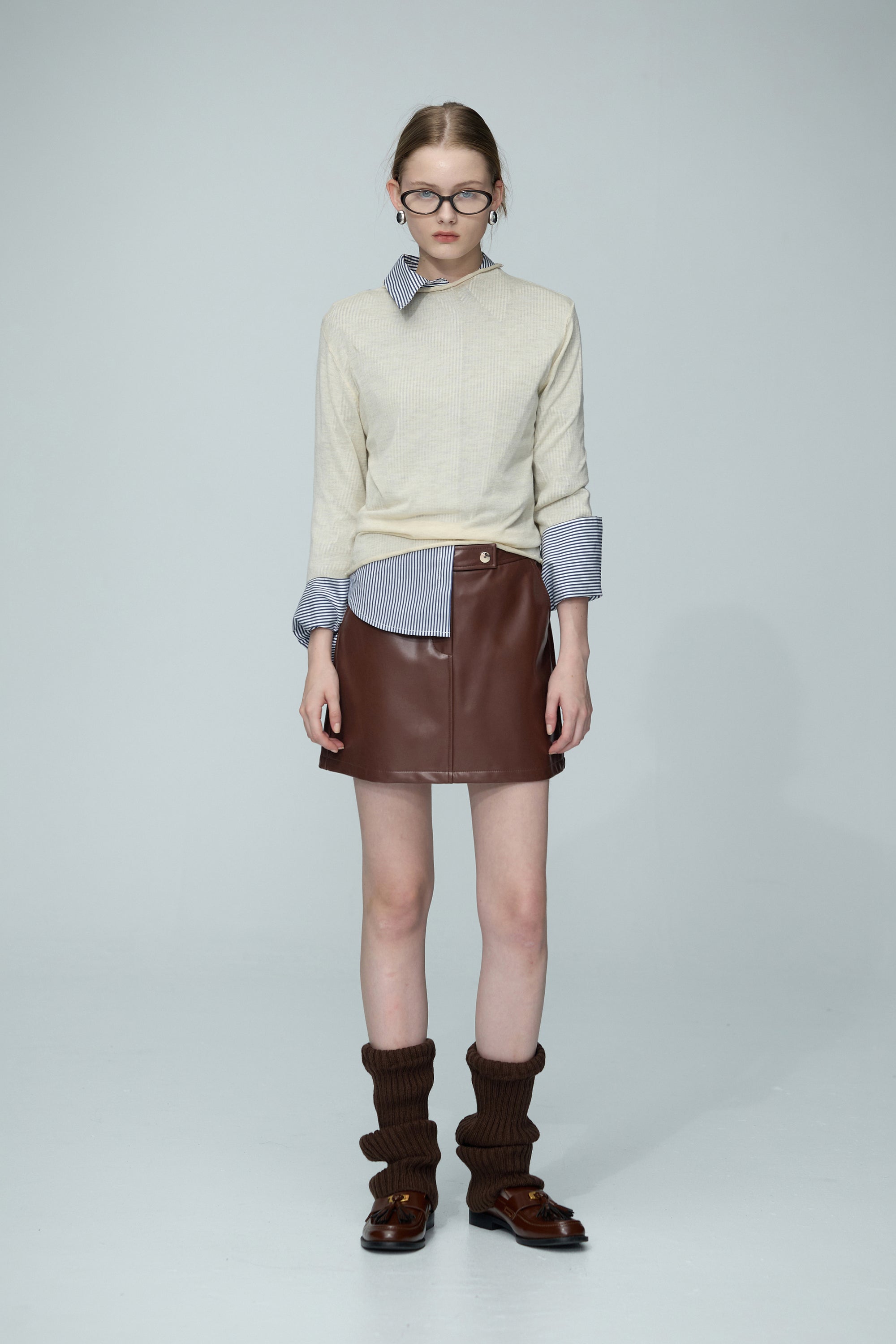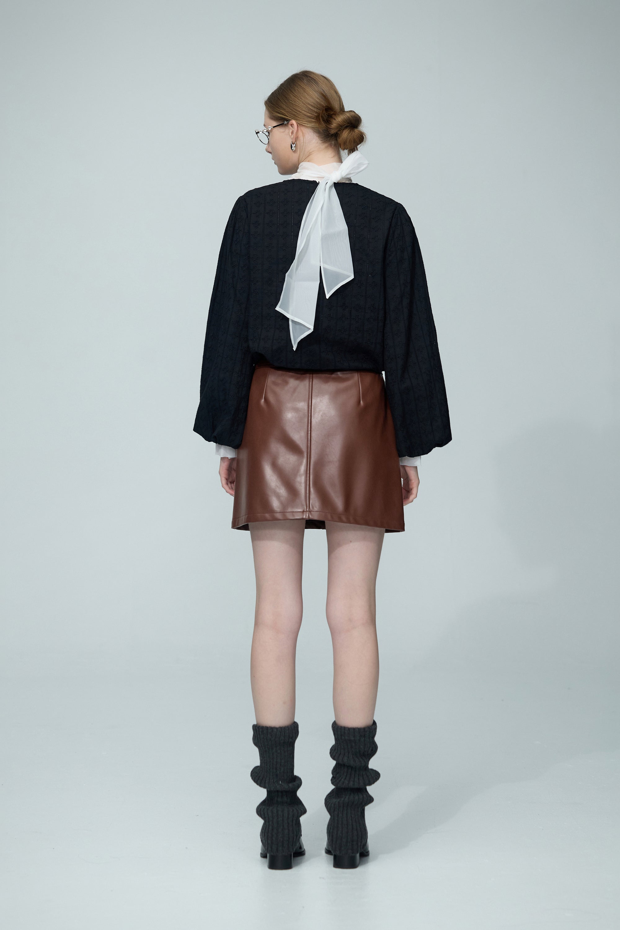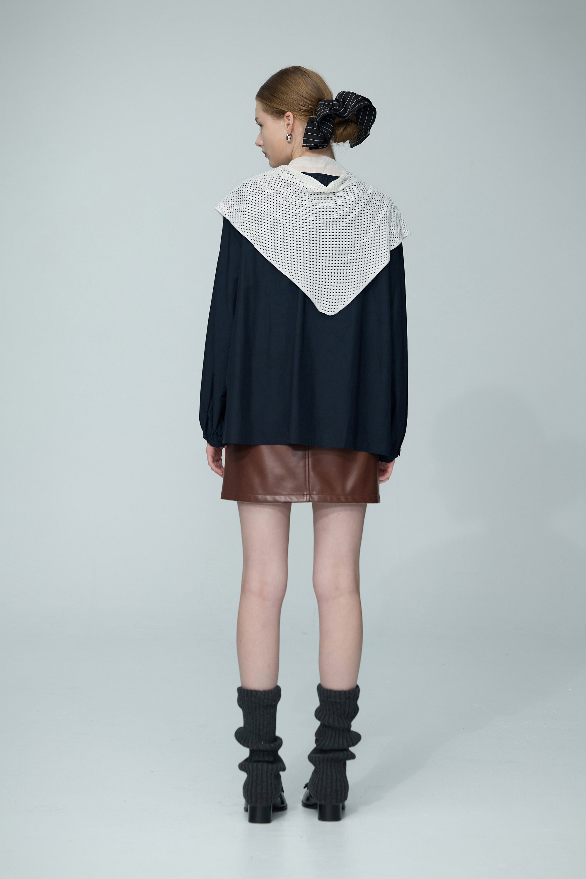 圓領條紋彈性褶皺收腰上衣(附項鍊)-黑