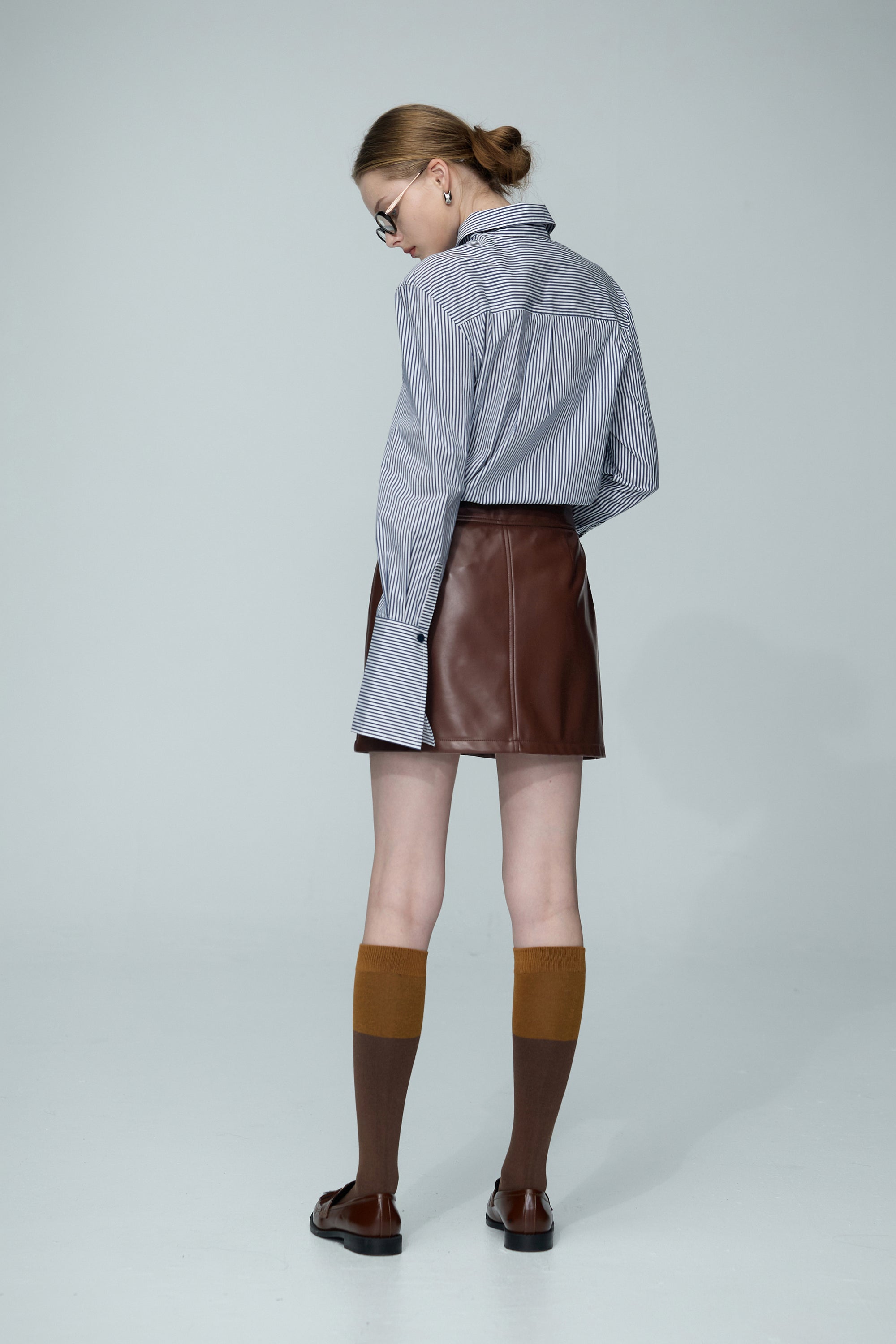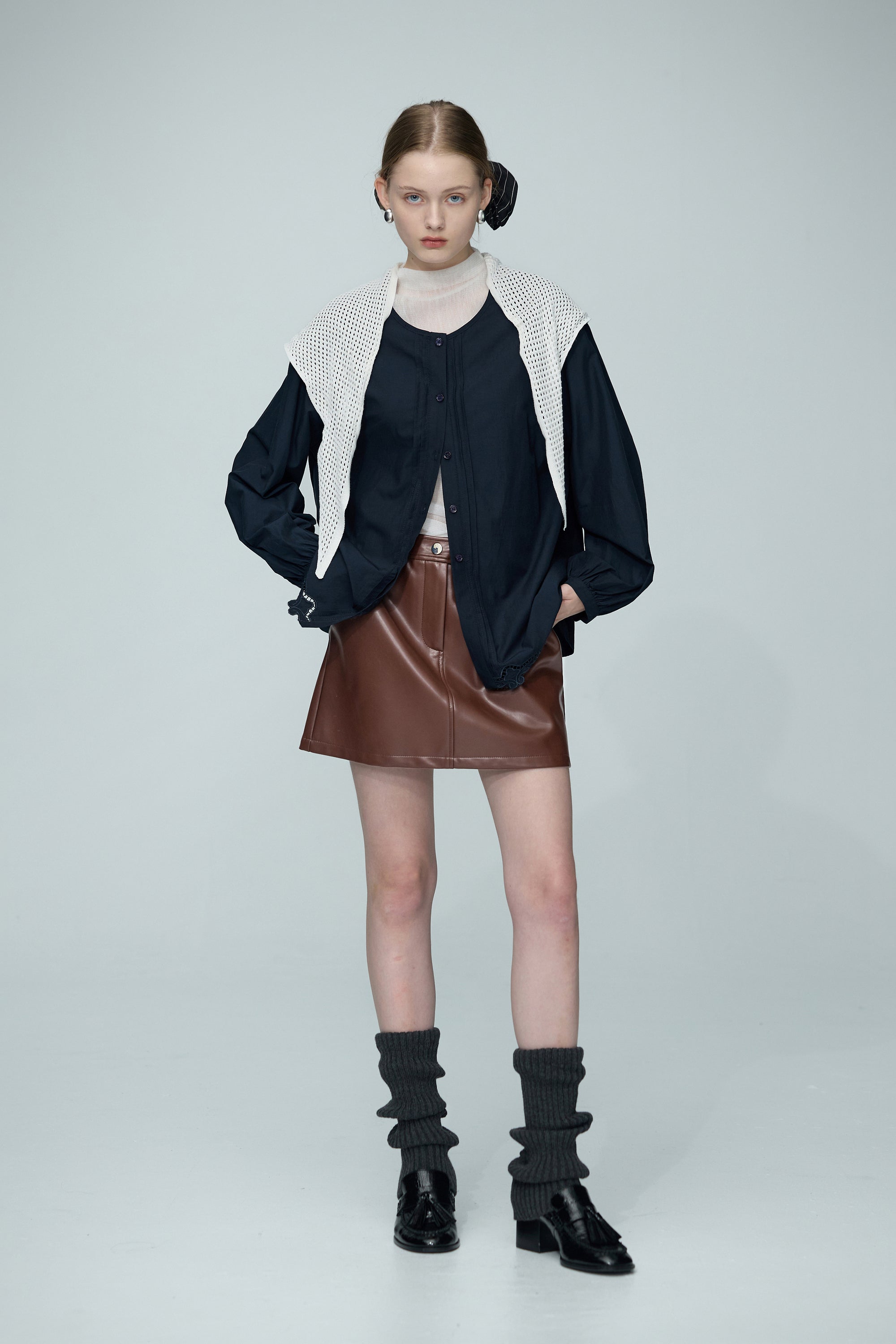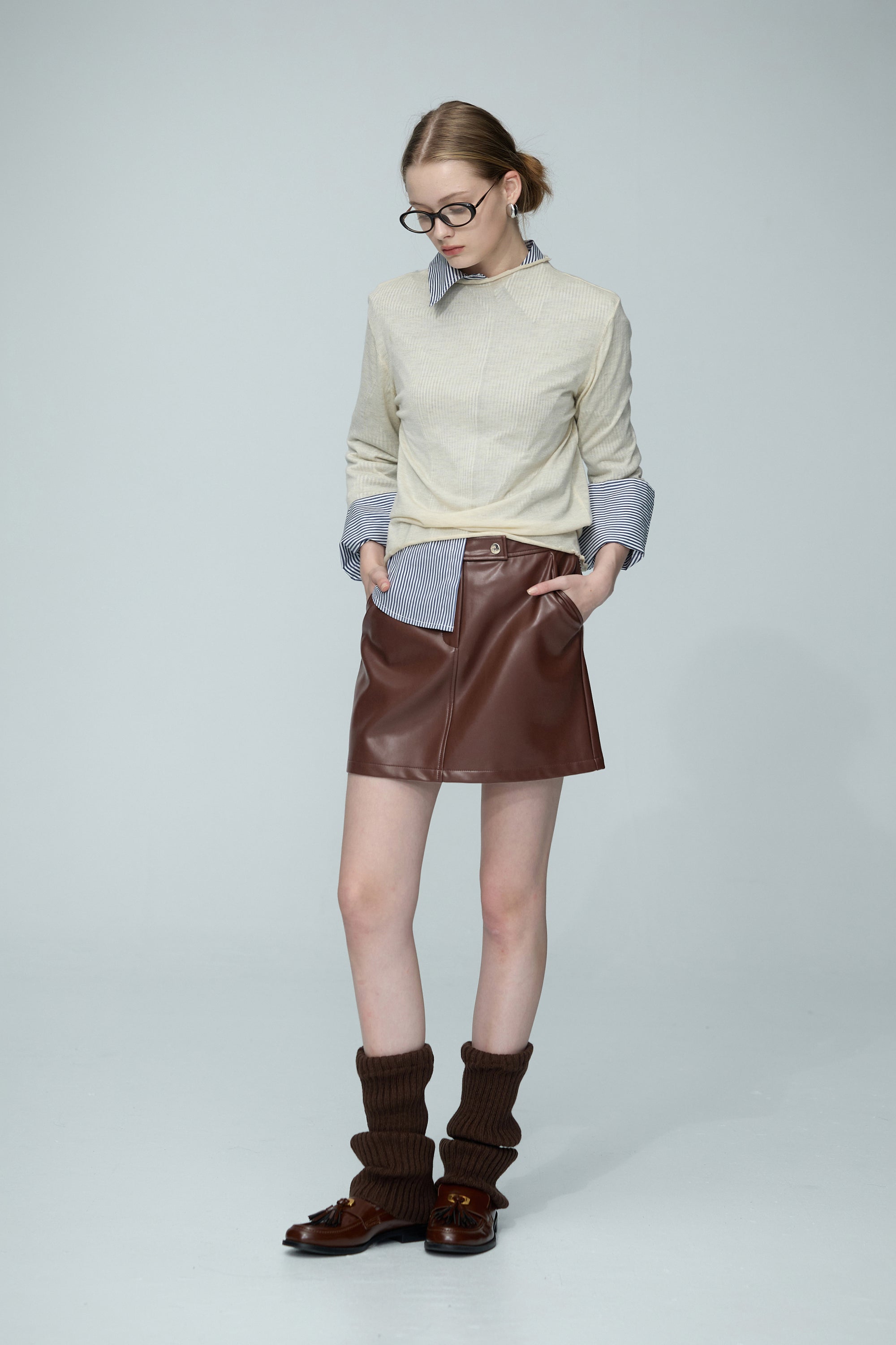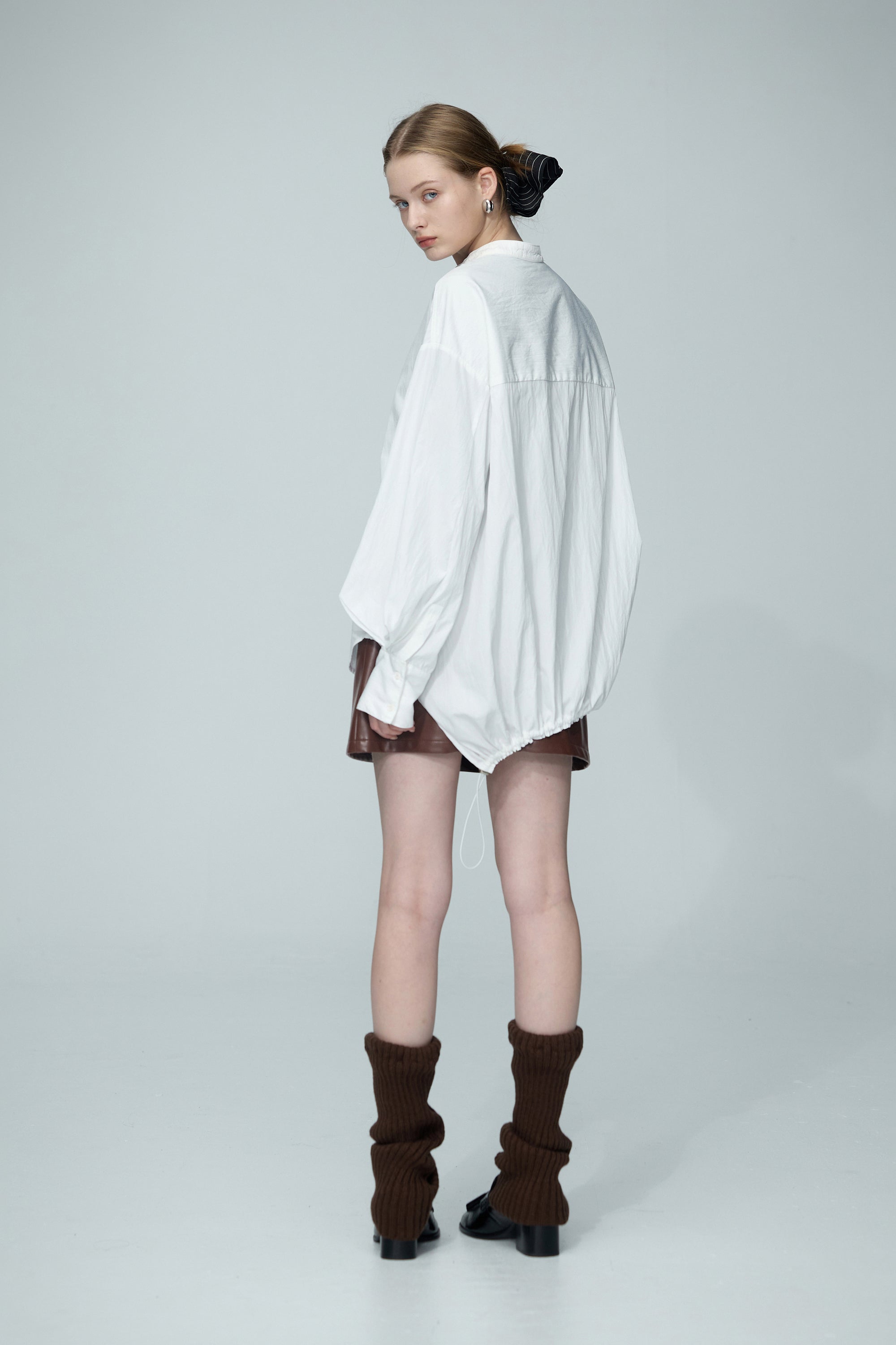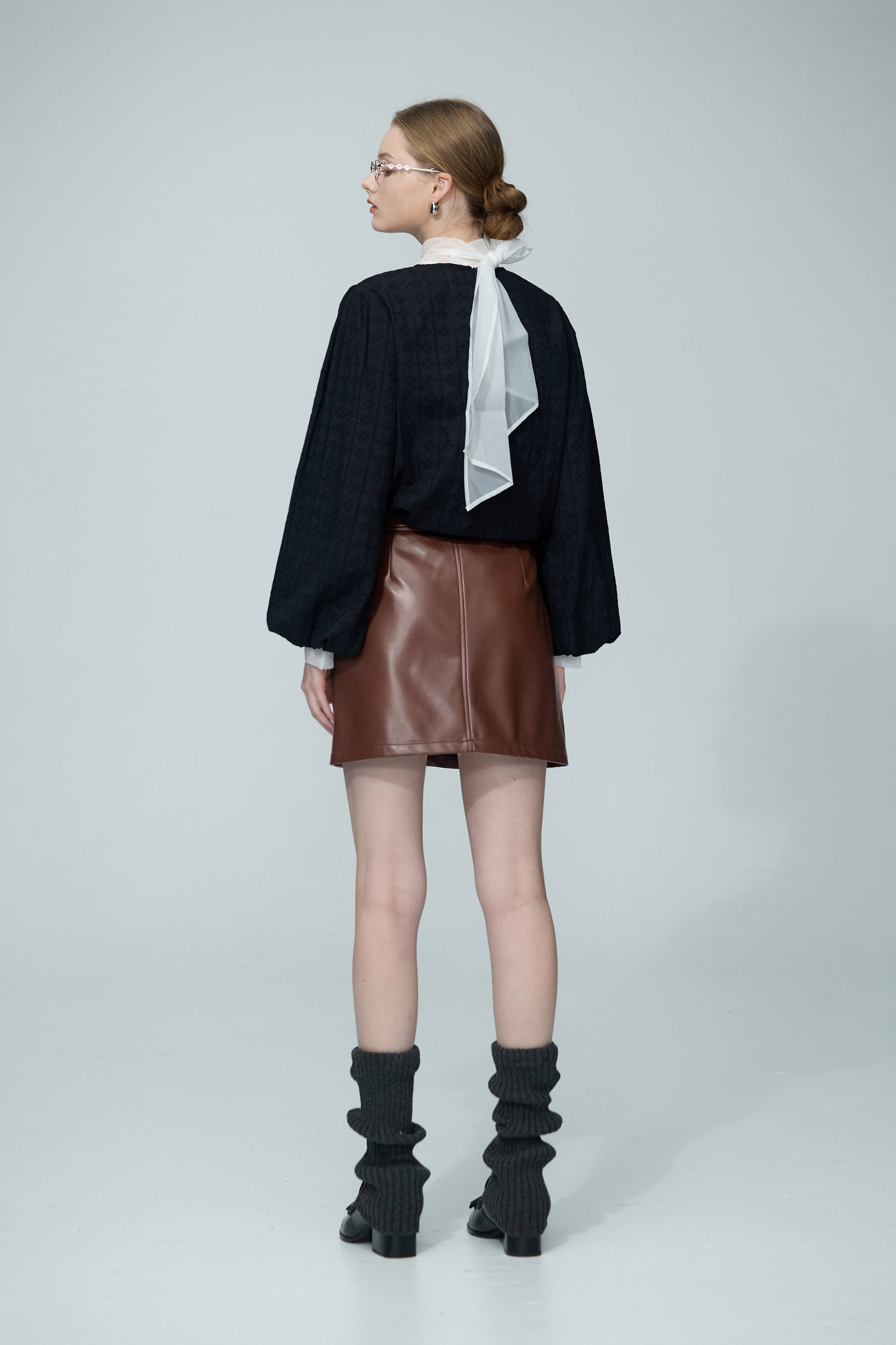 圓領條紋彈性褶皺收腰上衣(附項鍊)-黑